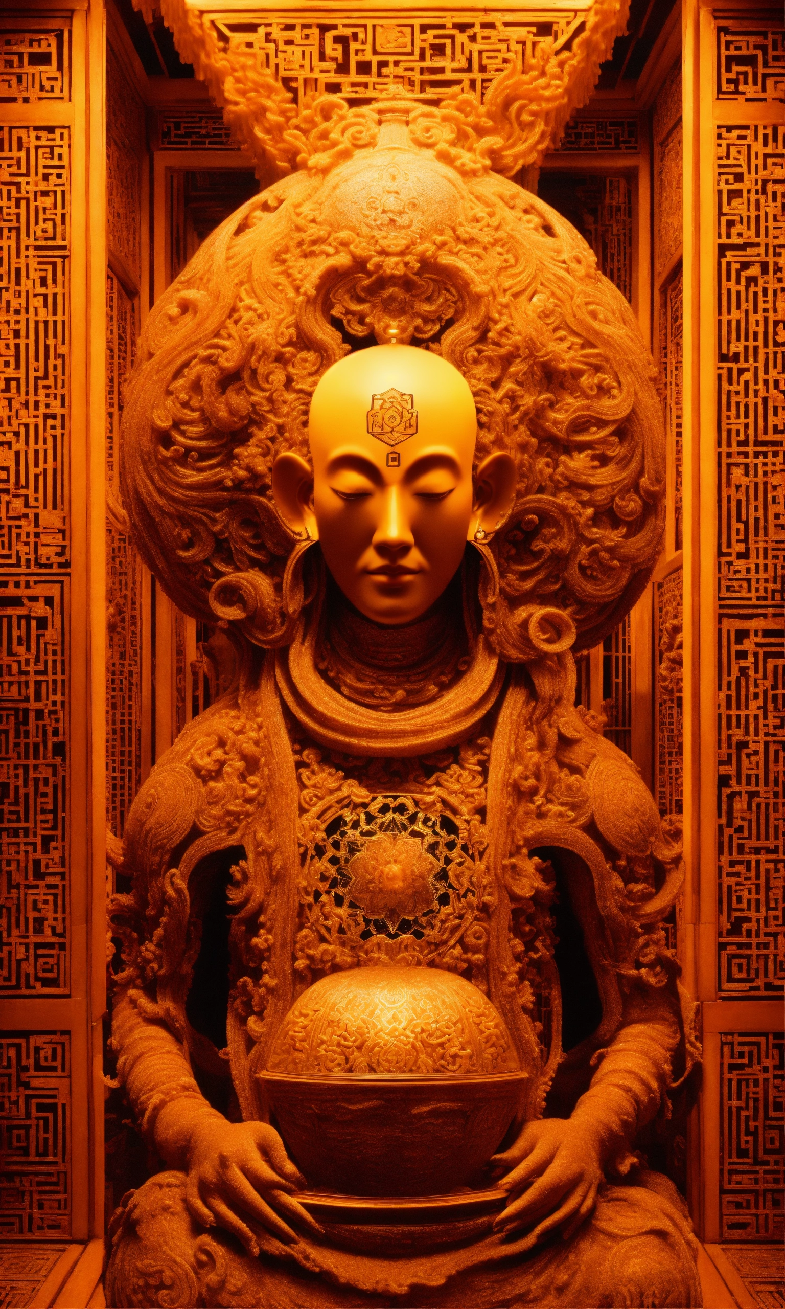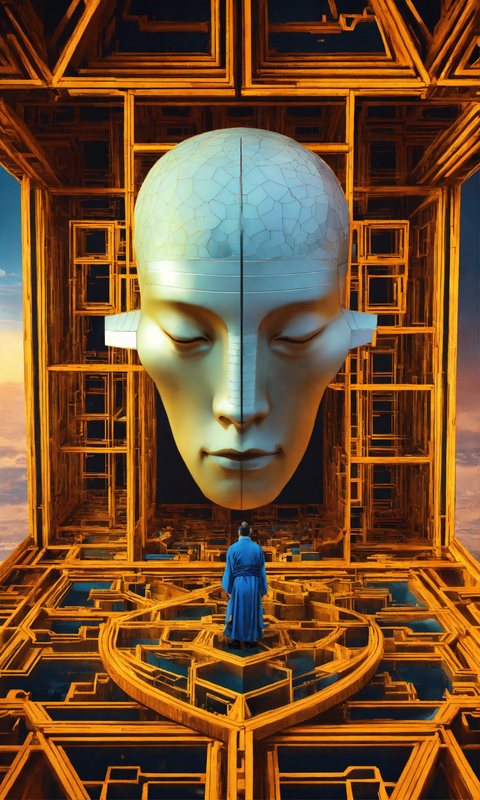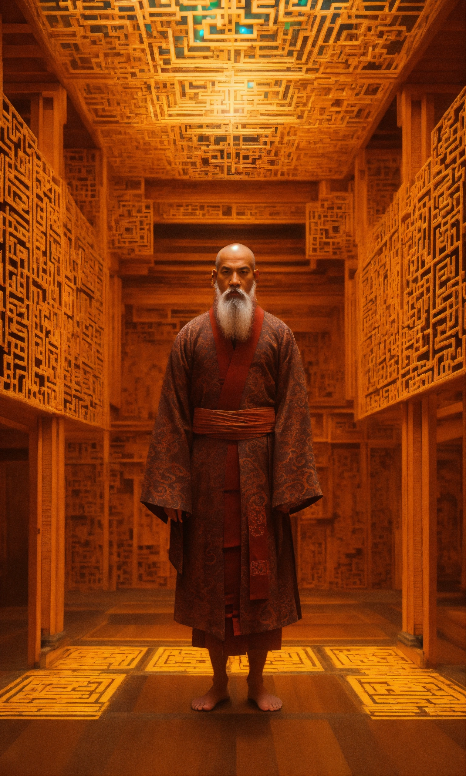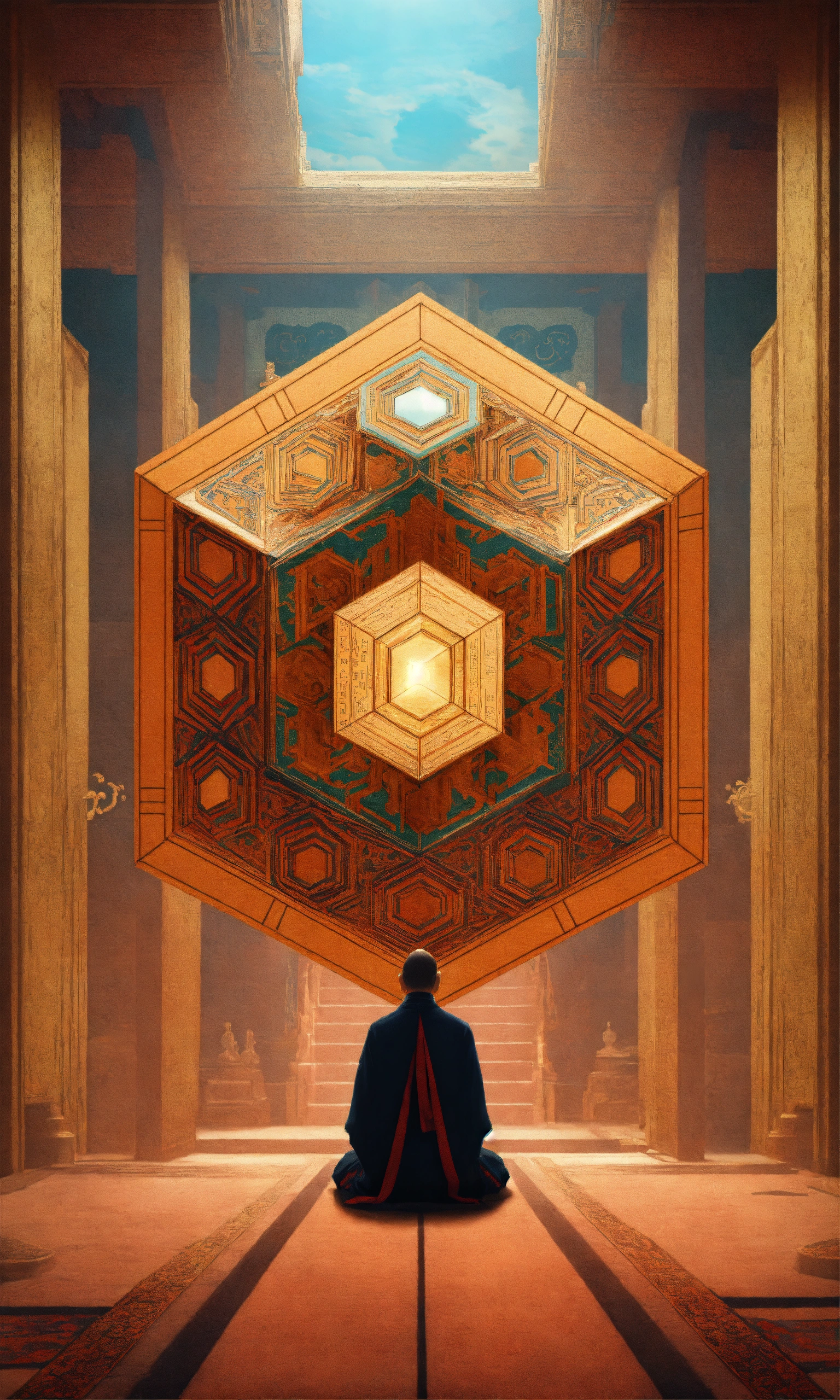 Taoist monk octopus tesseract body fractal three point perspective hypercube mirror zen face