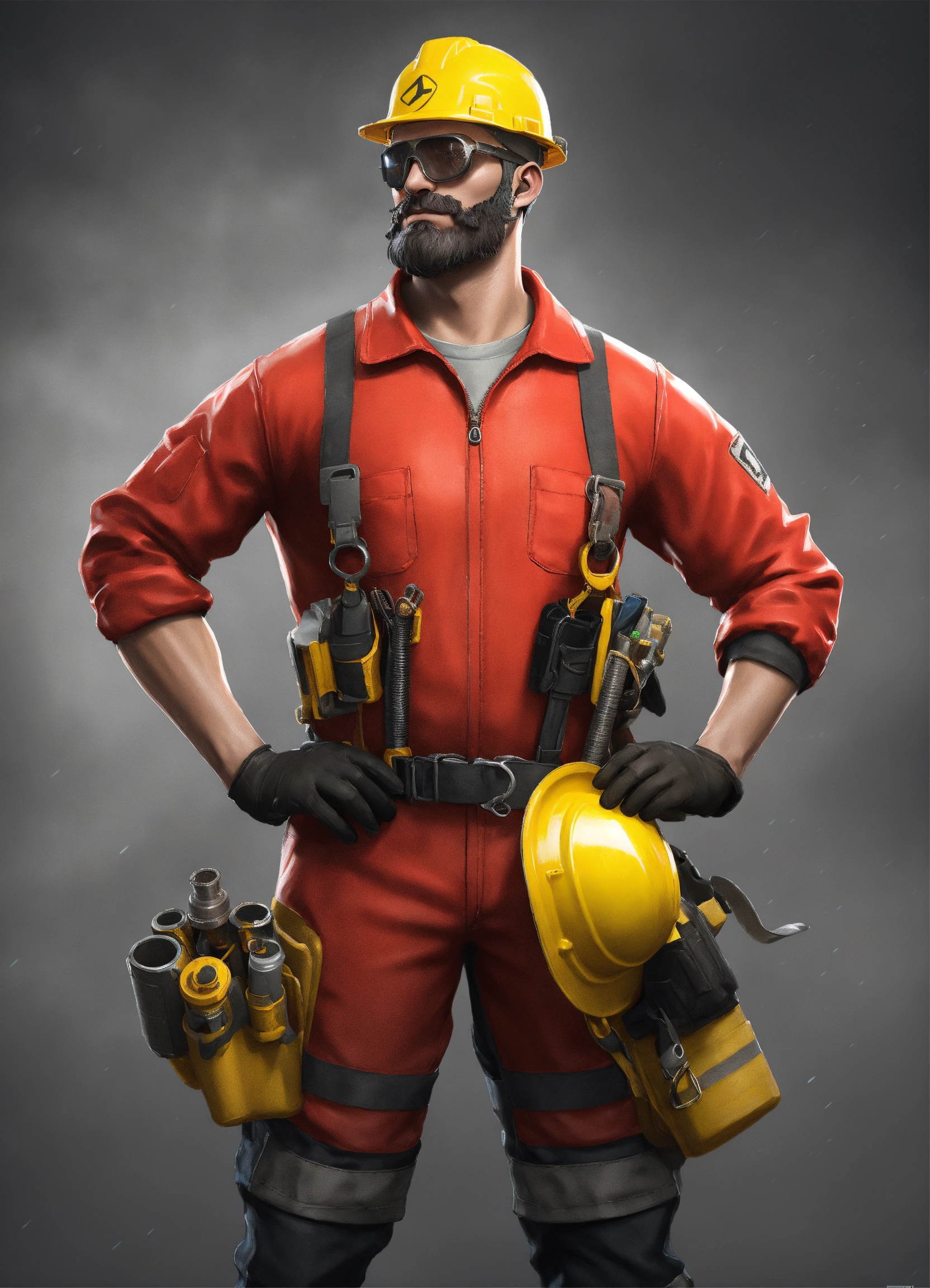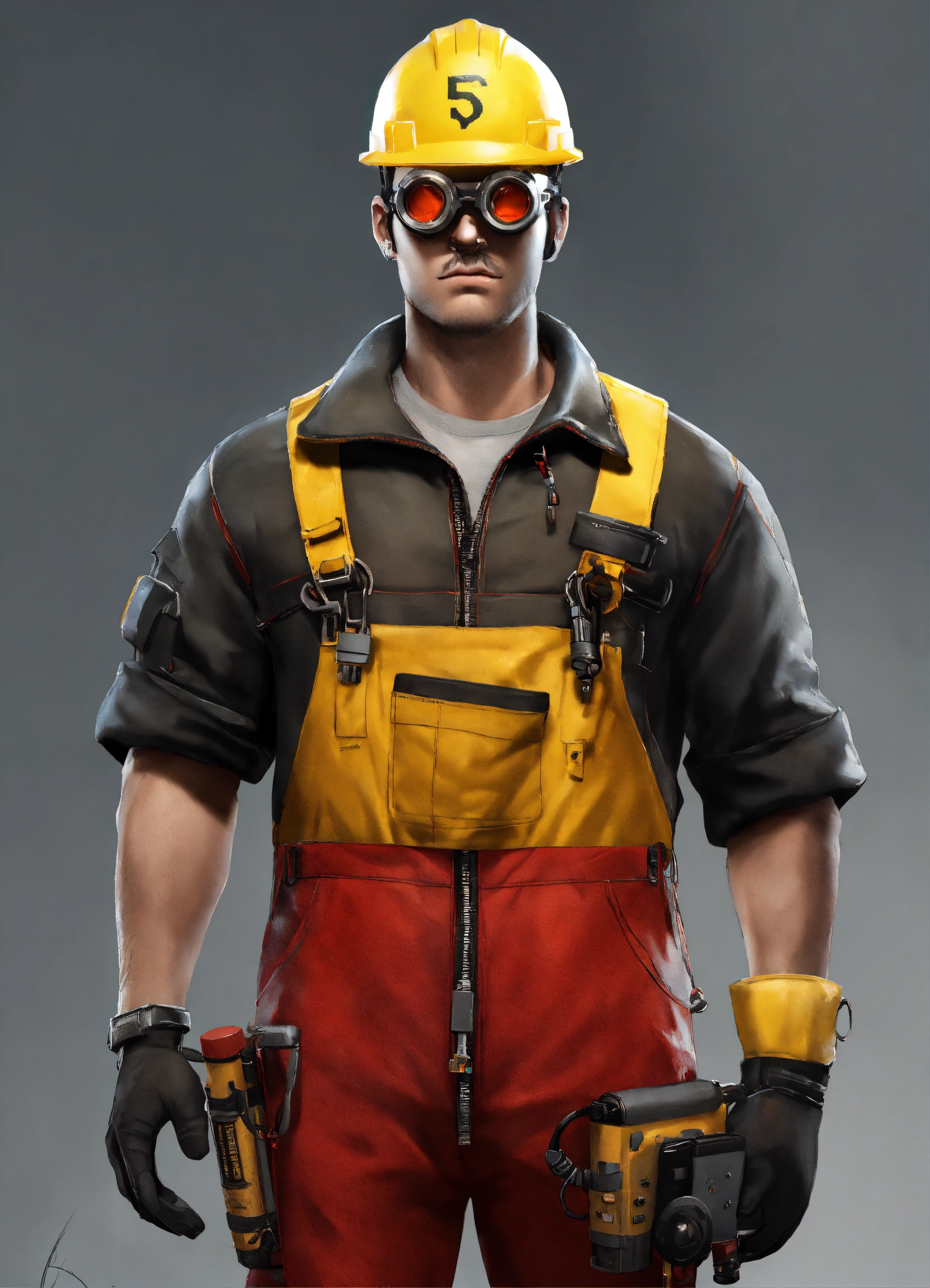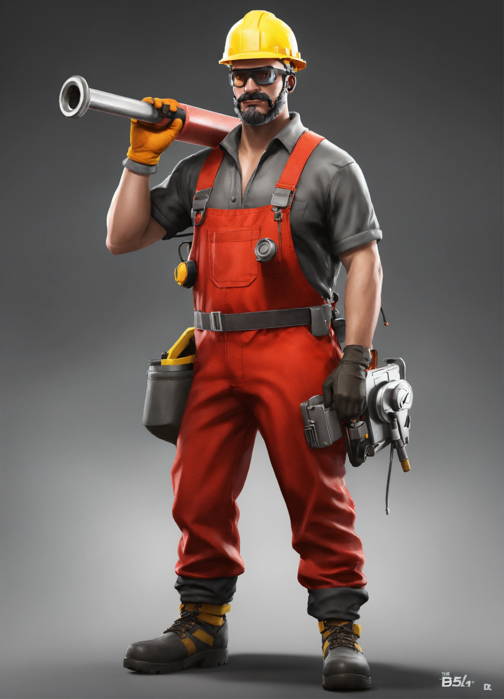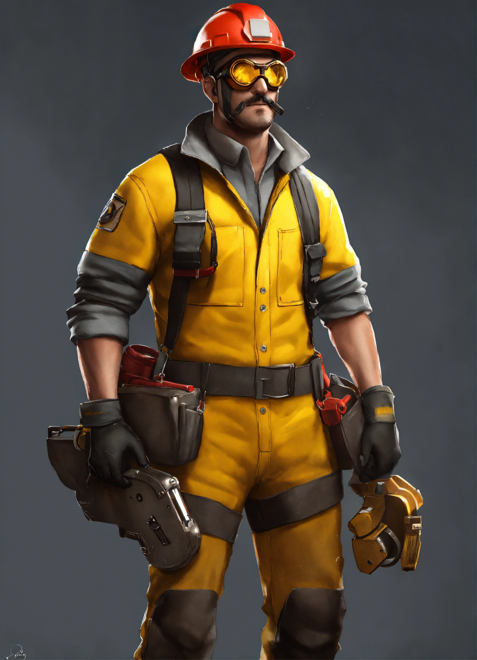 The engineer from team fortress 2 wearing a red work overall and black slack pants and yellow work gloves and black goggles and a yellow hard hat and holding a wrench on his shoulder, best quality, cloudy gray background, digital hd art, black and white, pencil sketch, ink sketch, beautiful drawing, highly detailed, concept art, ultra-realistic digital illustration, 3dart++, blender++, unreal 5++