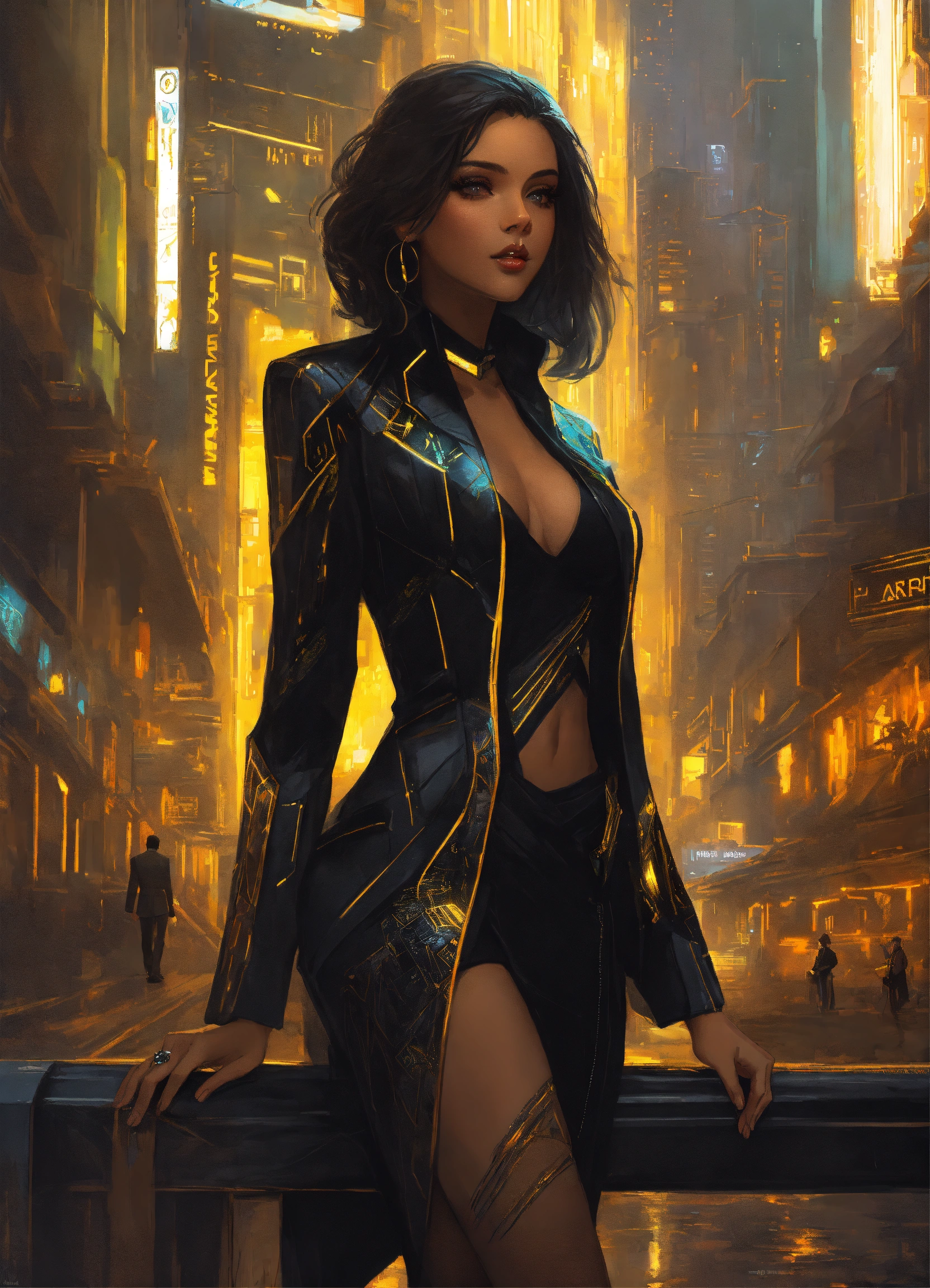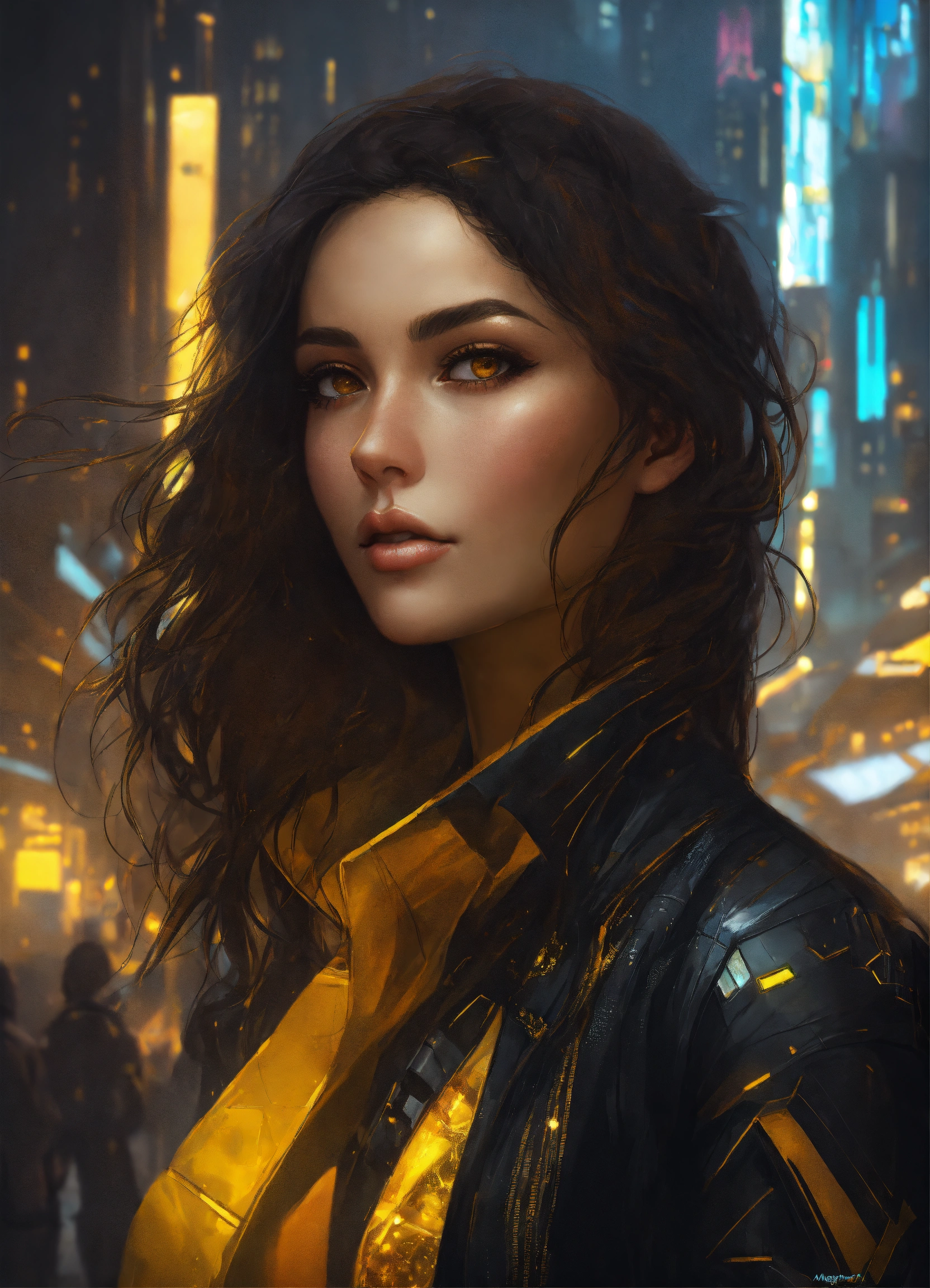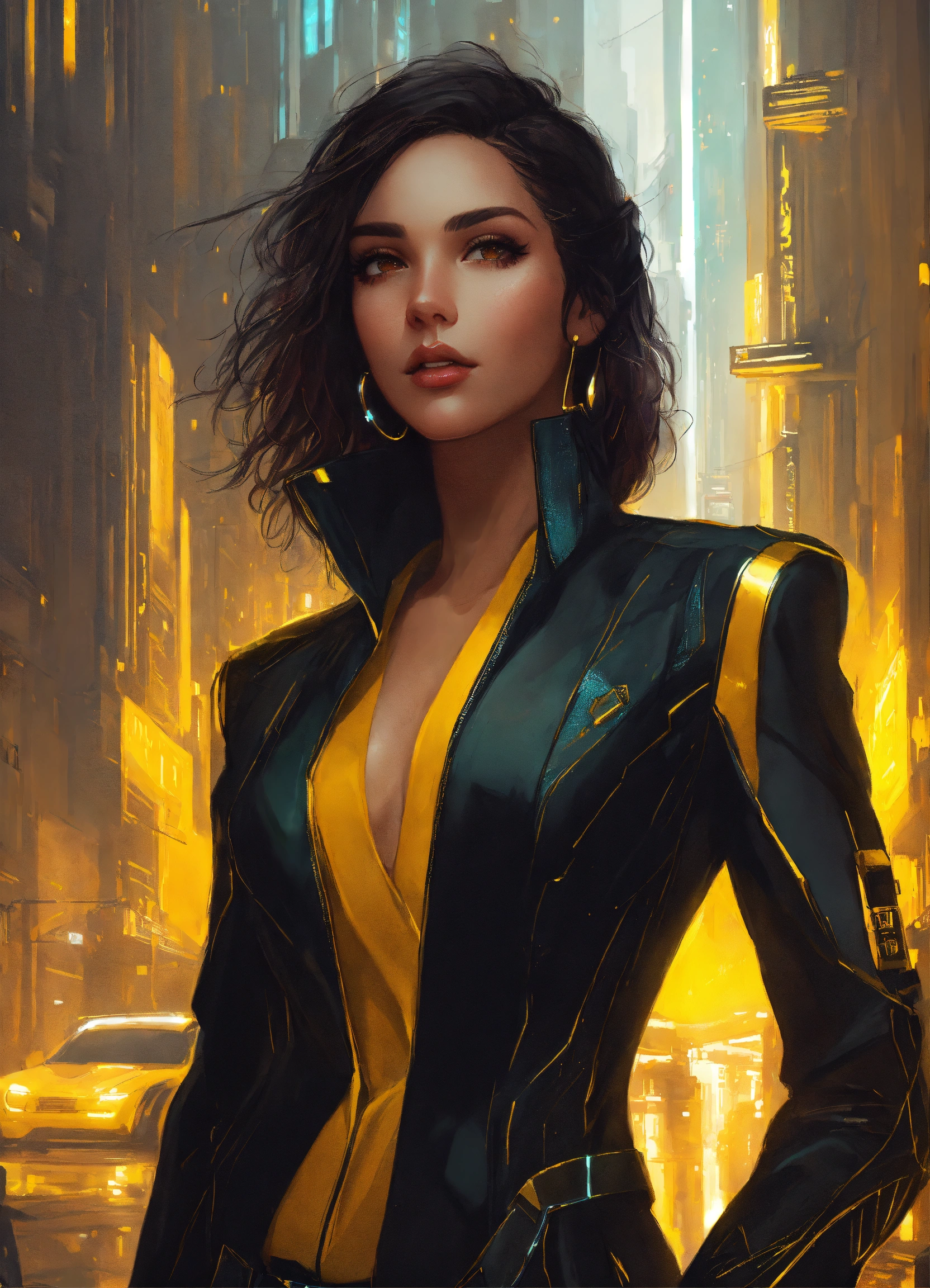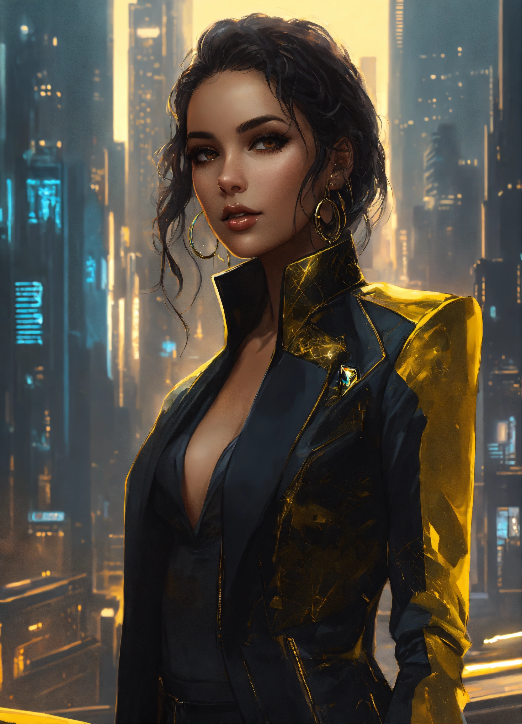 Beautiful middle eastern woman wearing a black and citrine business suit, in a futuristic cityscape, hyper detailed, cyberpunk style, wlop, charlie bowater, magali villeneuve, face view