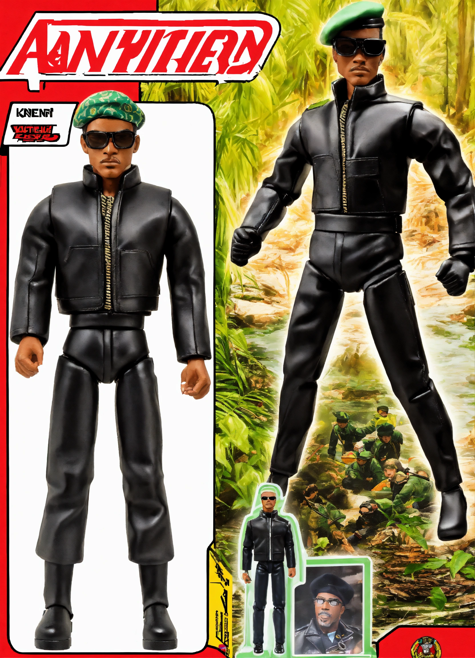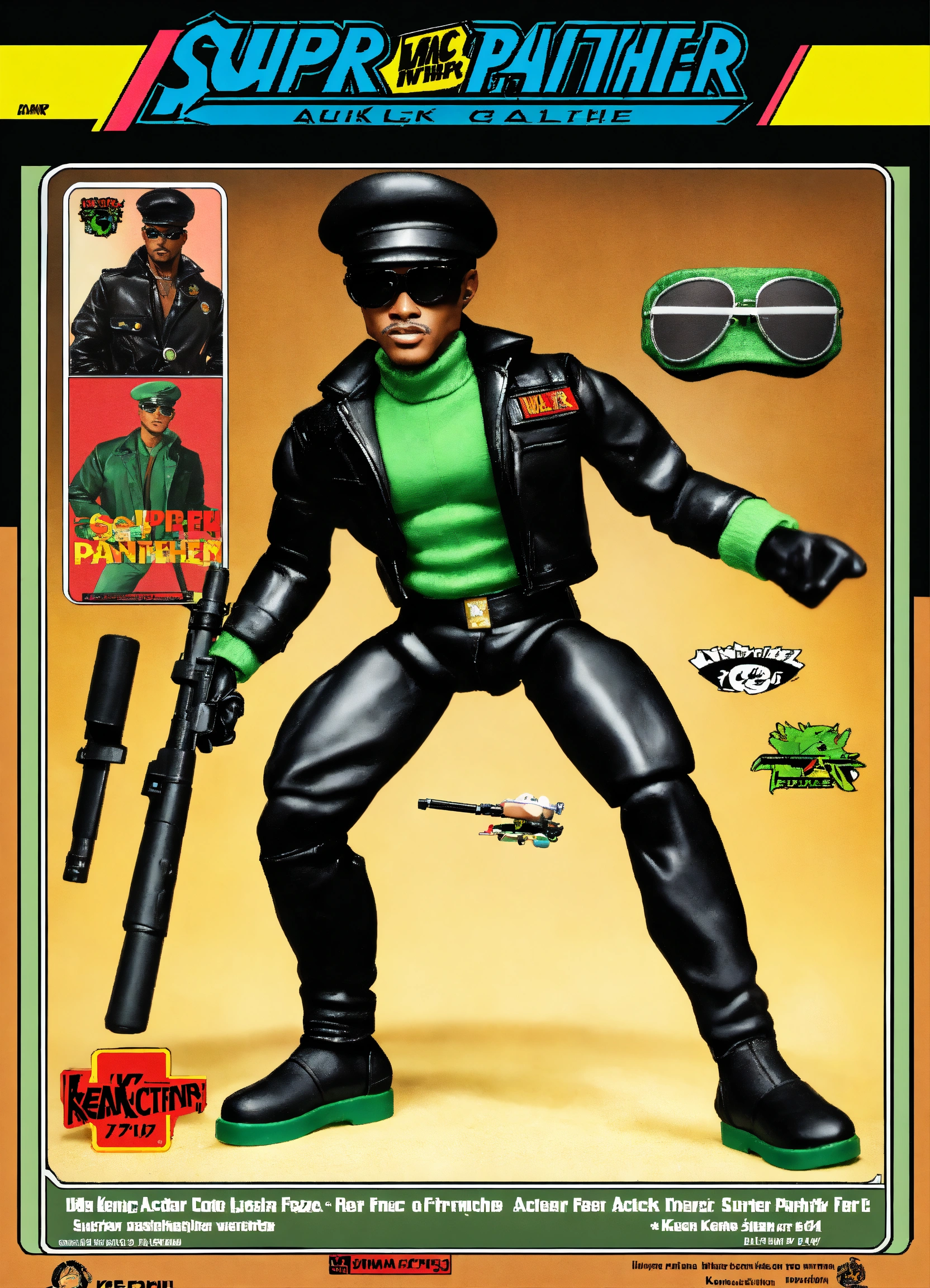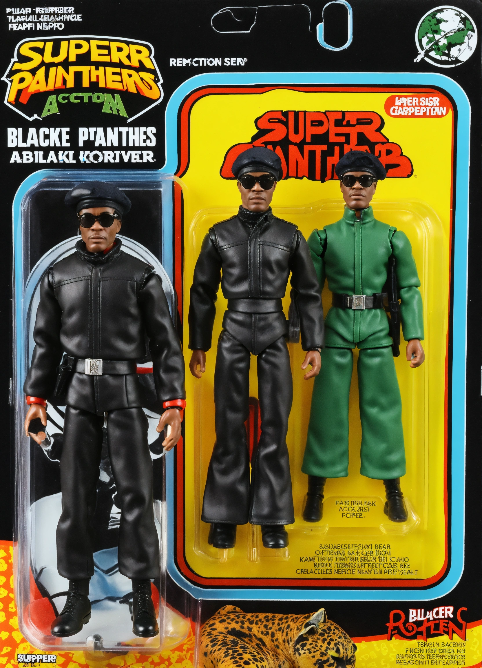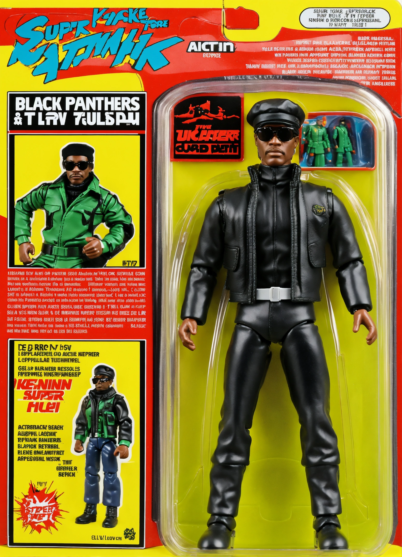 Design a kenner action figure toy or a super 7 reaction figure toy of the black panthers member, with black beret, black leather jacket, green turtle neck shirt, black glasses andvlack pants. also with a raised fist closed. also with the classic packaging made by kenner company or super 7 reaction packaging.