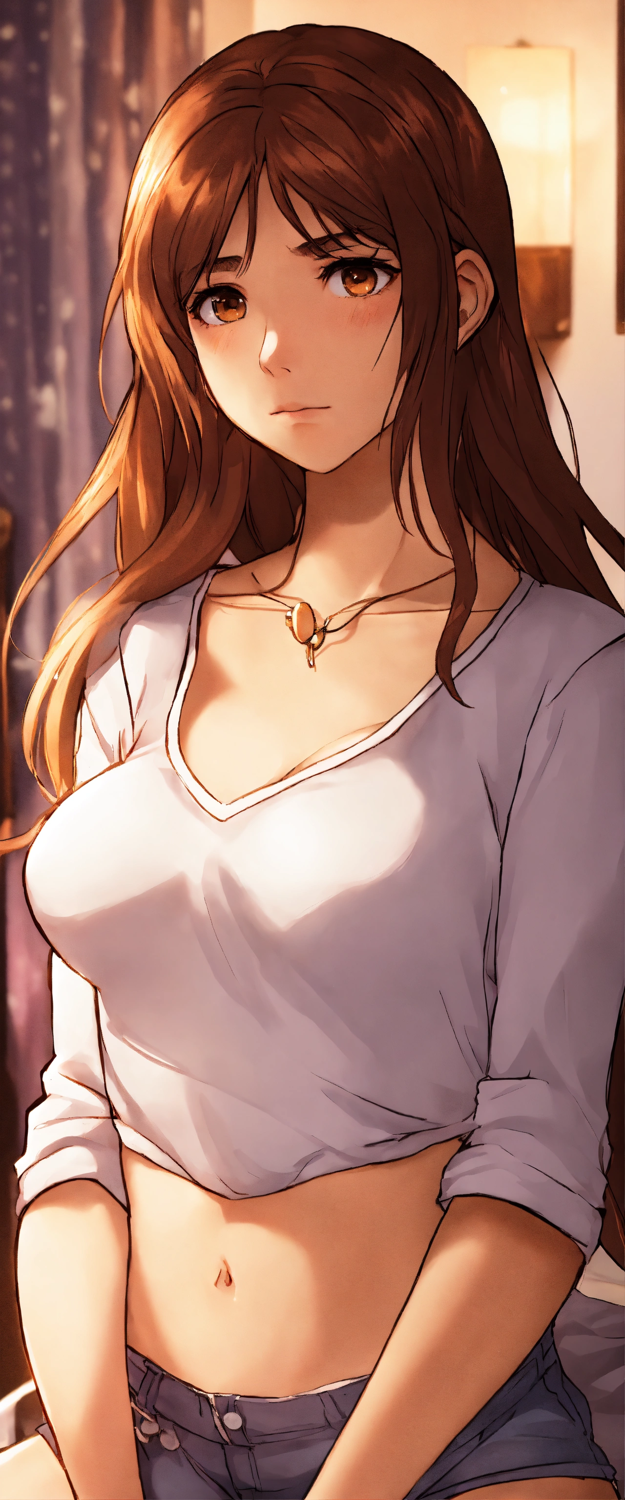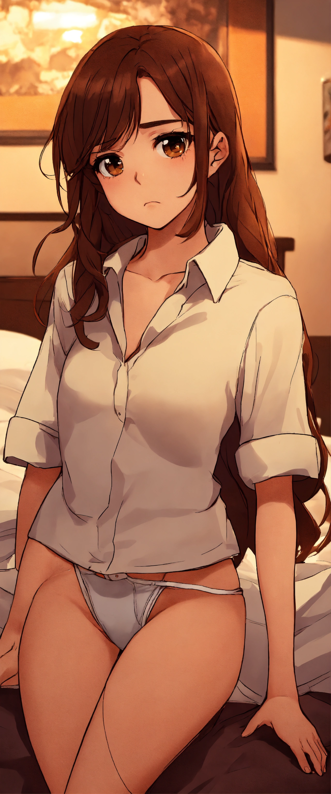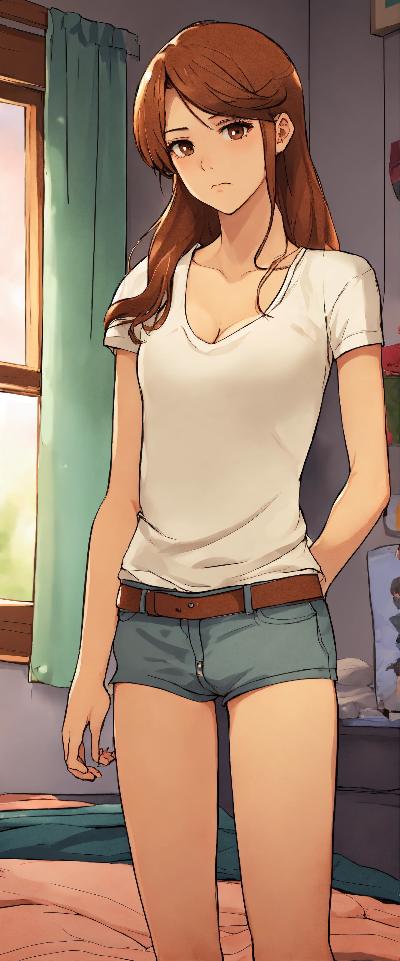 18-years old girl wearing tigh shirt, white briefs, comic character, brown hair and brown eyes, sad, standing in the bedroom