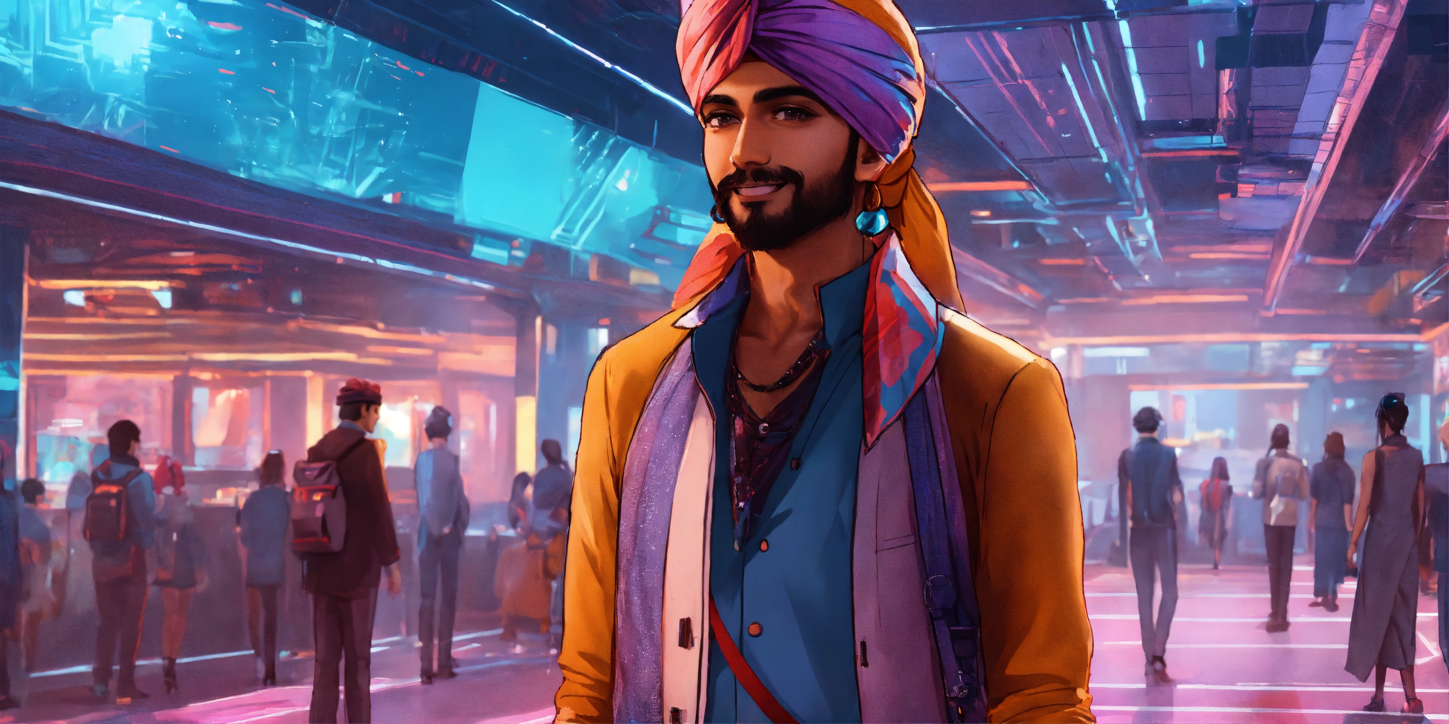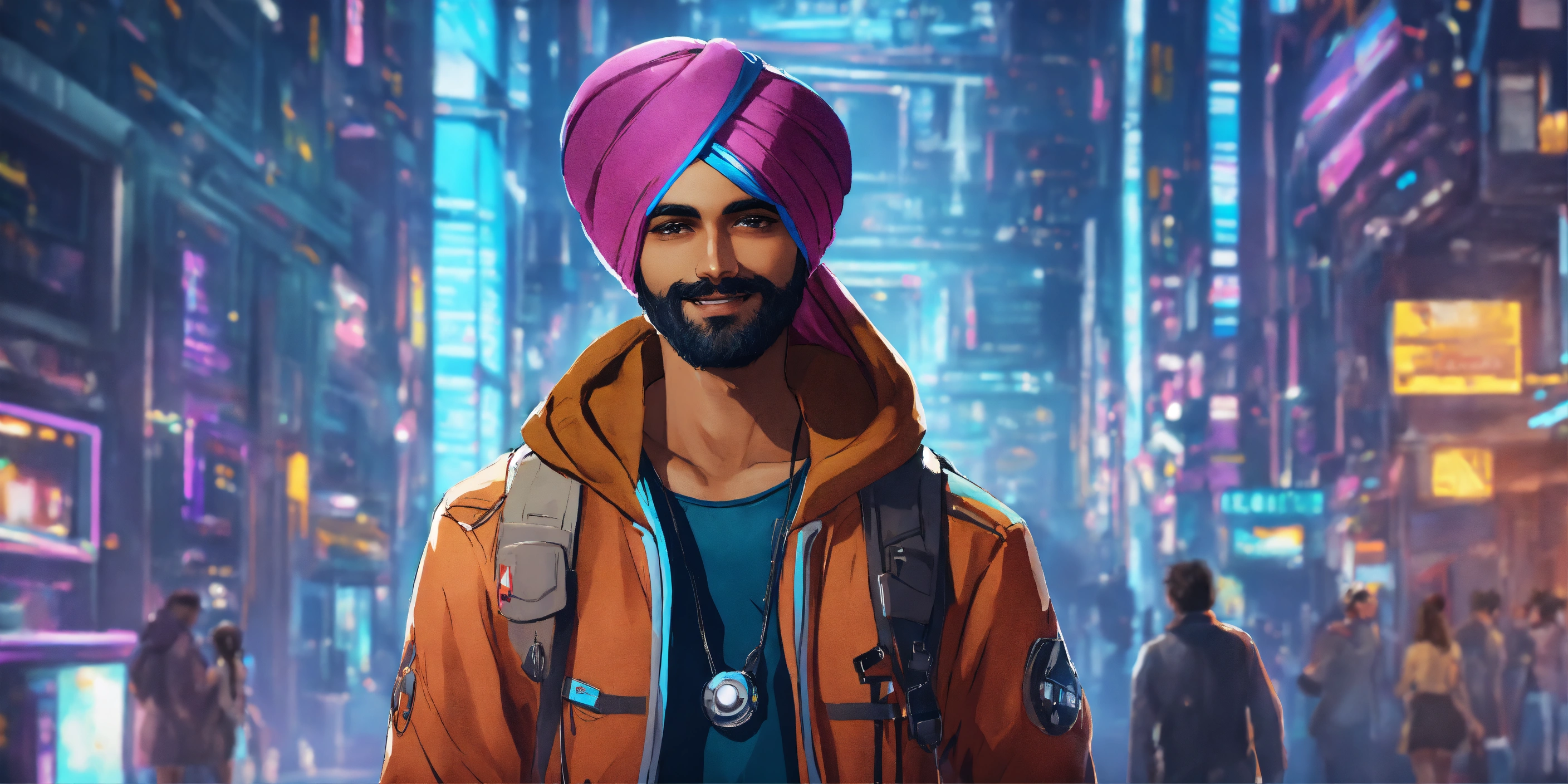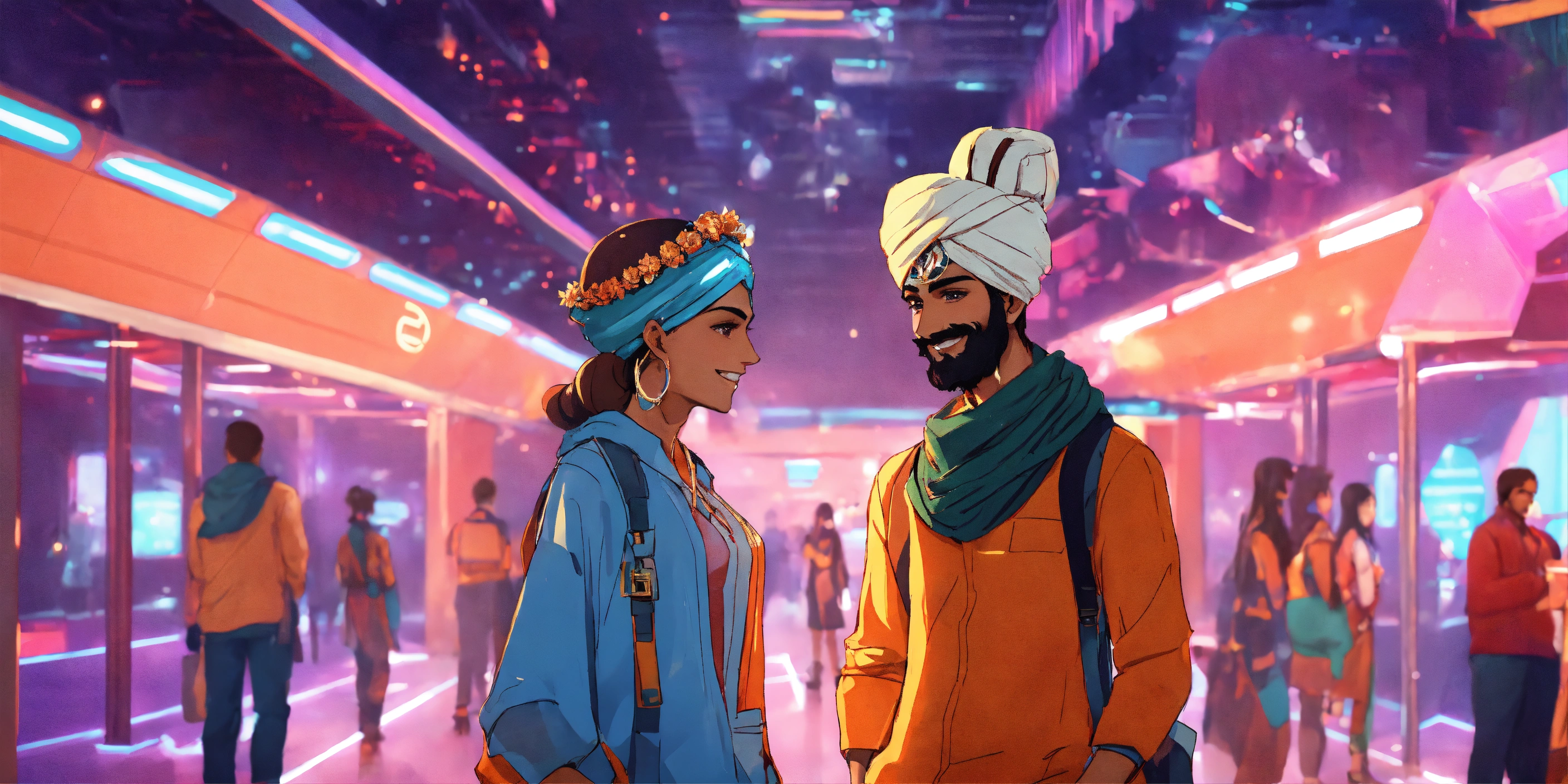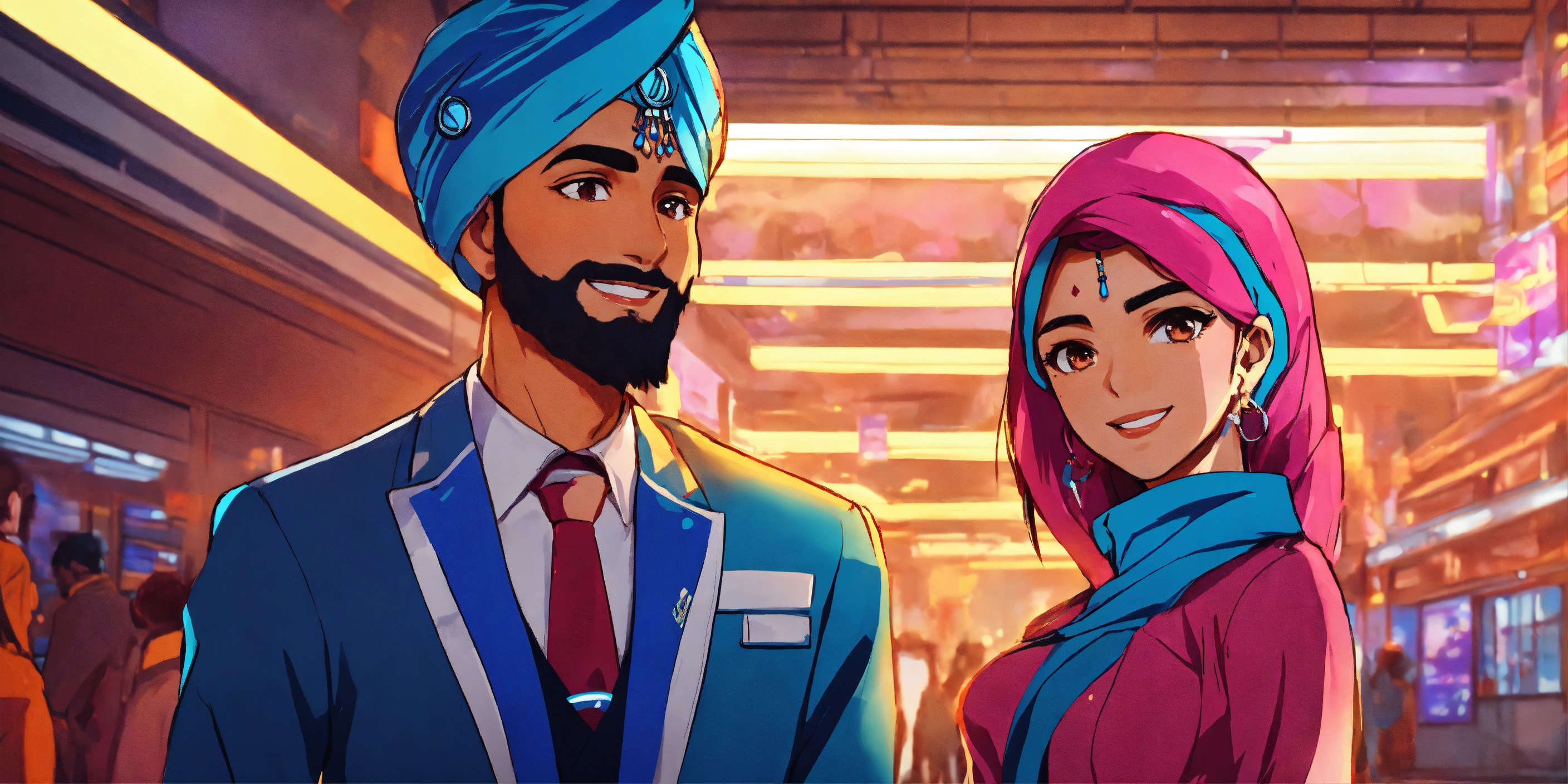 Indian turban guy with indian girl in futuristic world with modern clothes anime rylistic smiling