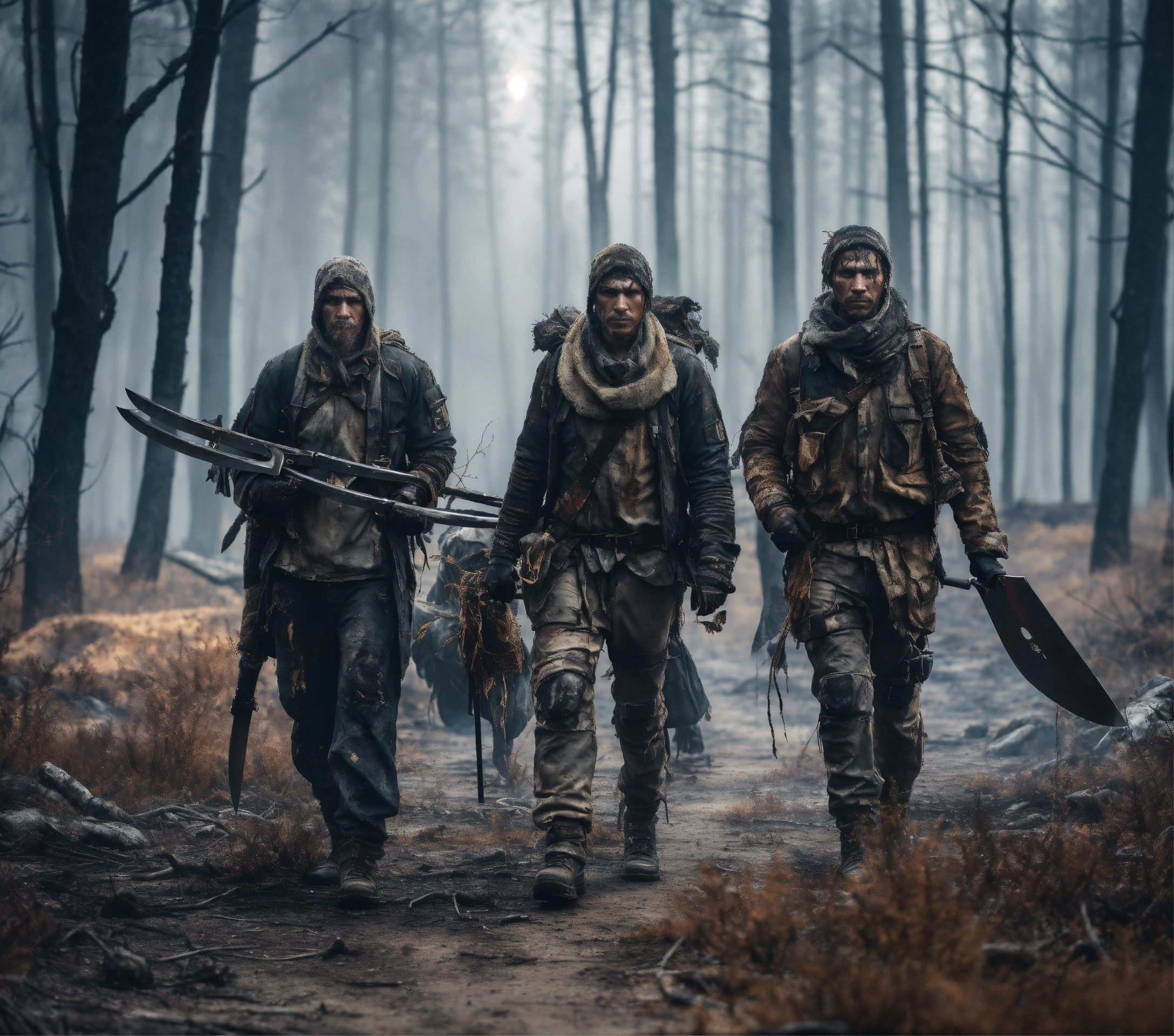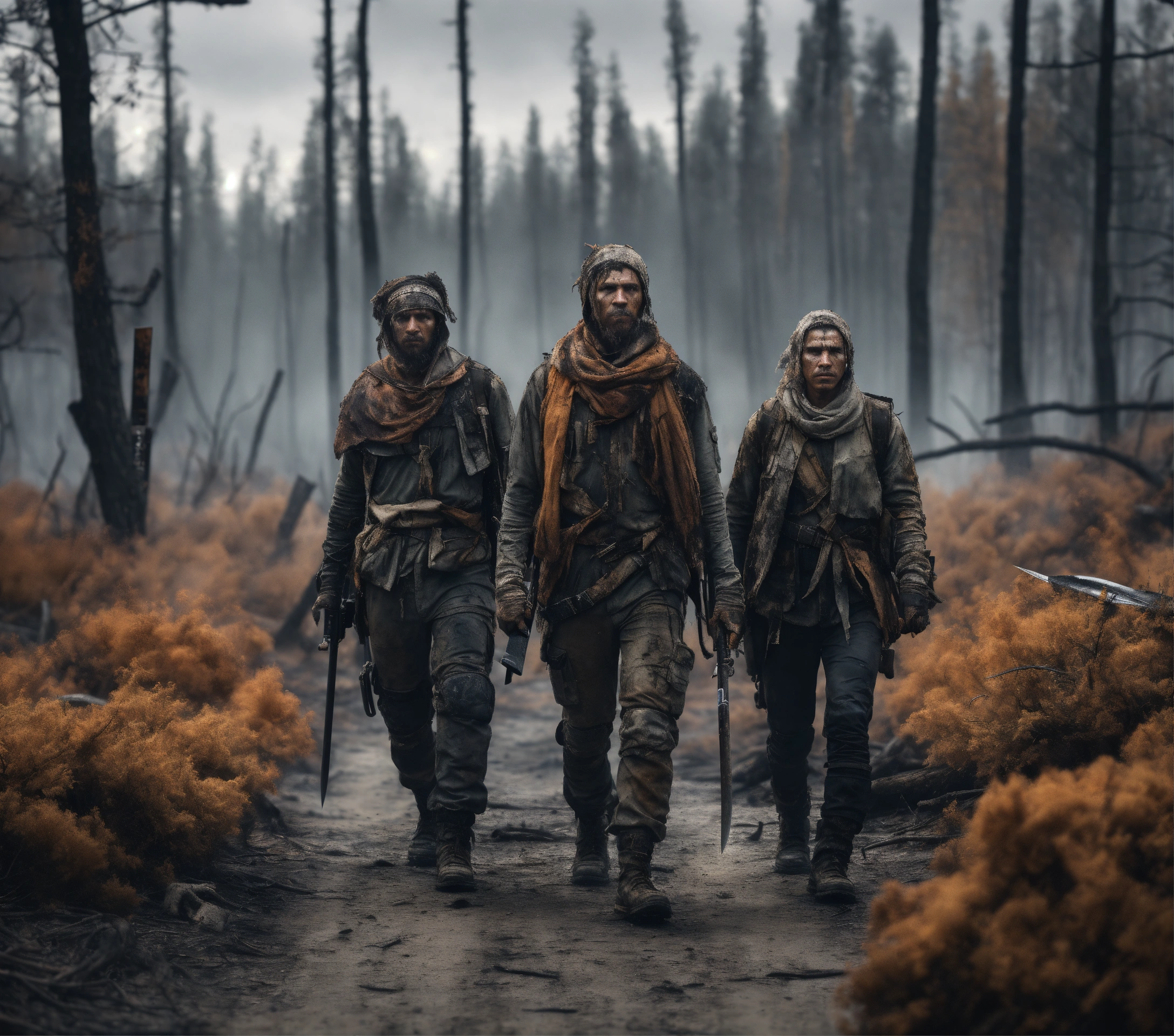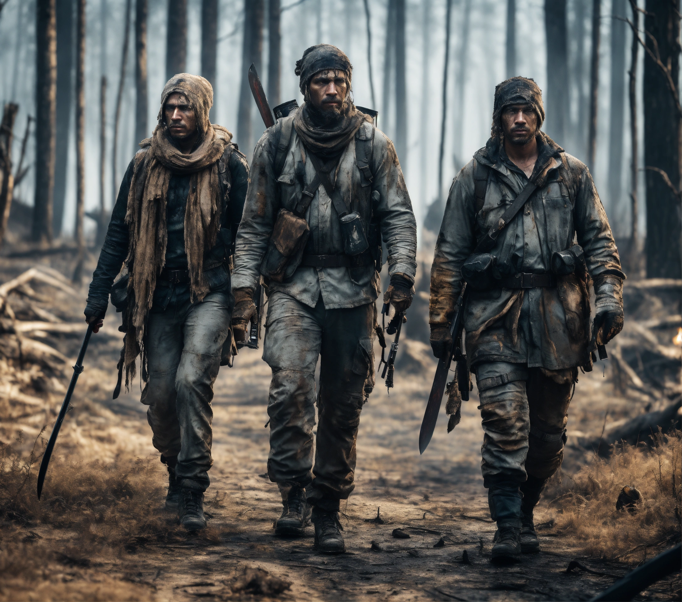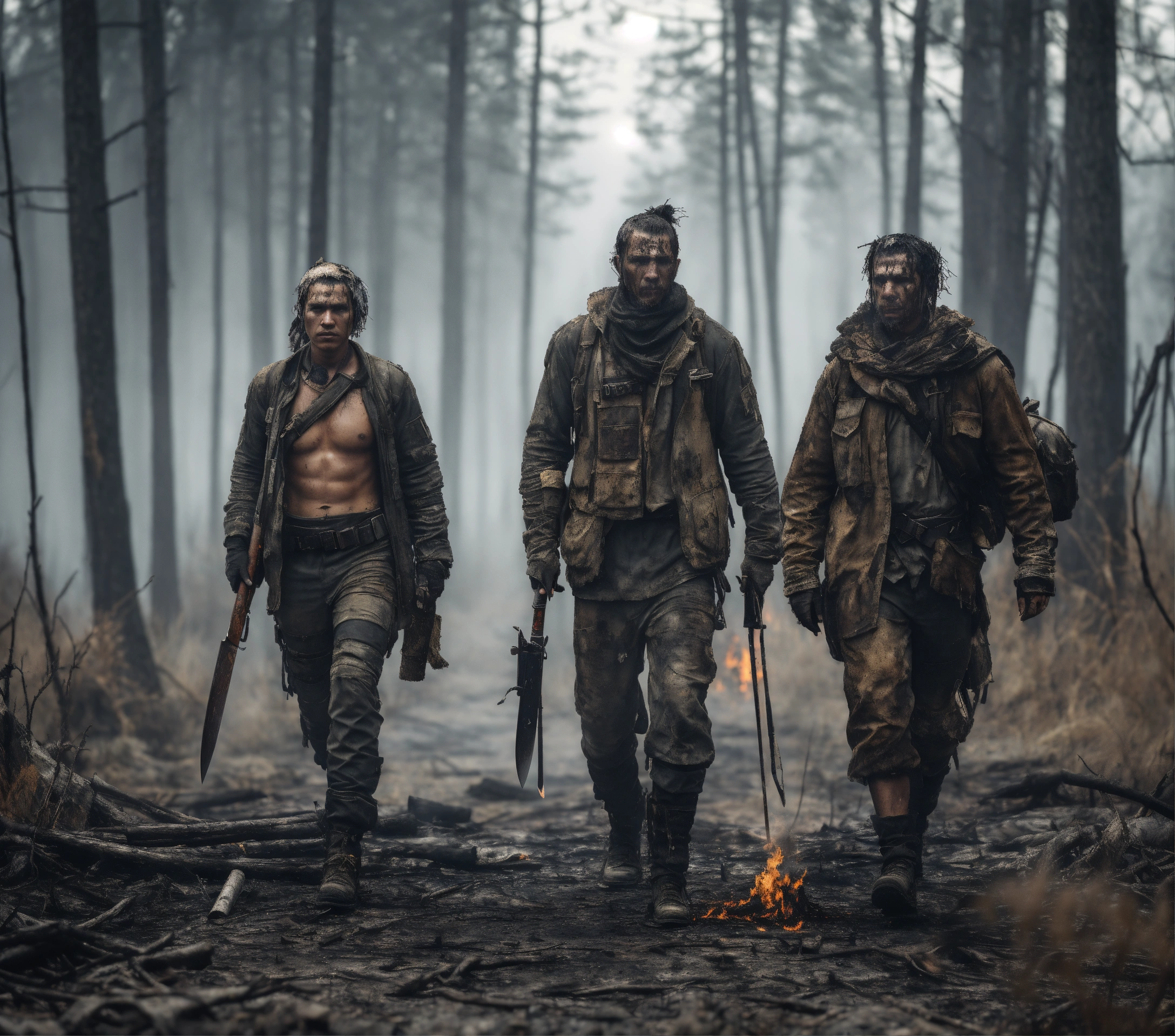 A realistic photo of three different survivors dressed in ragged post-apocalyptic clothing, carrying machetes and knives, walking in a grey burned forest, hyperdetailed, hyperrealistic, 8k