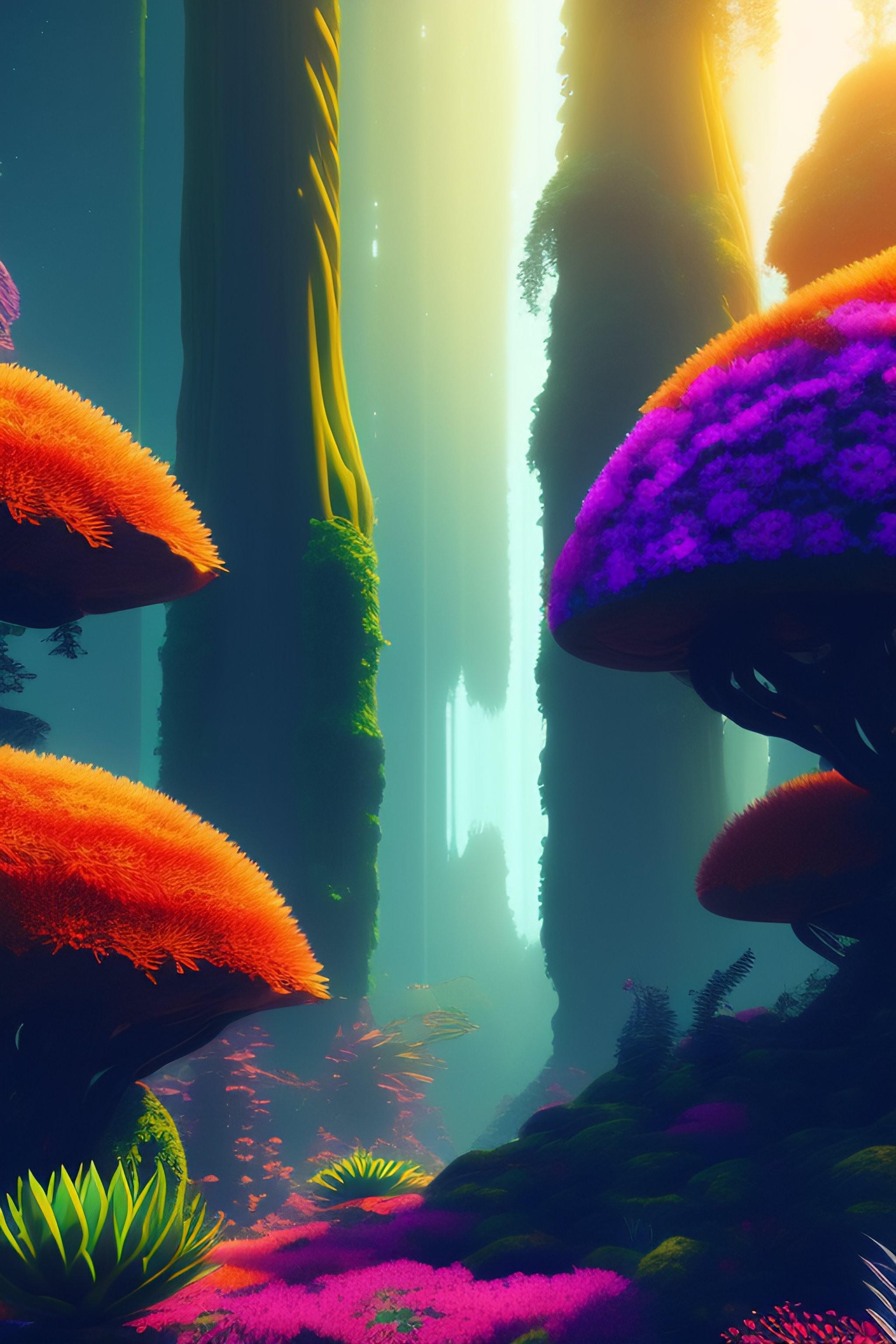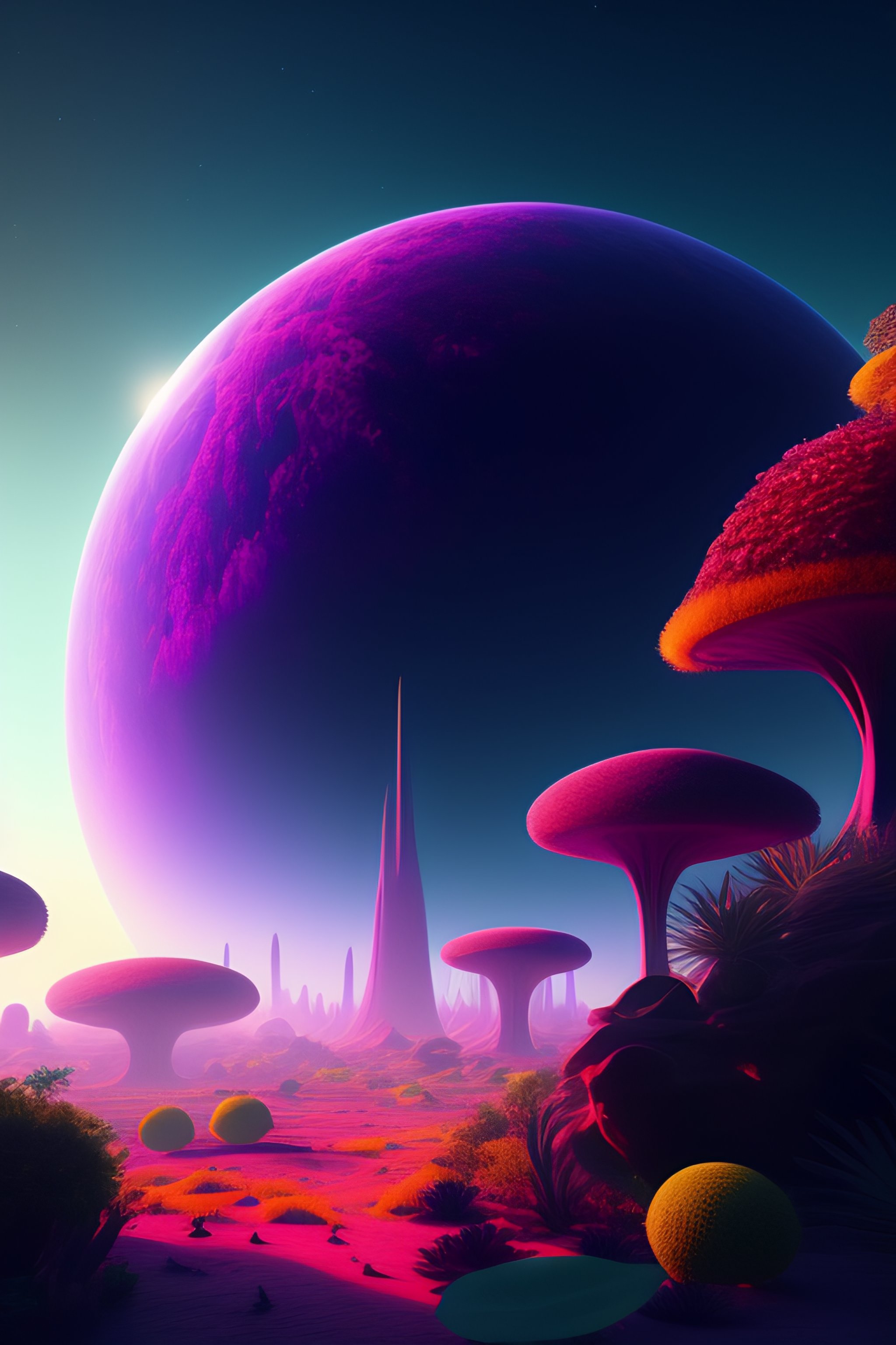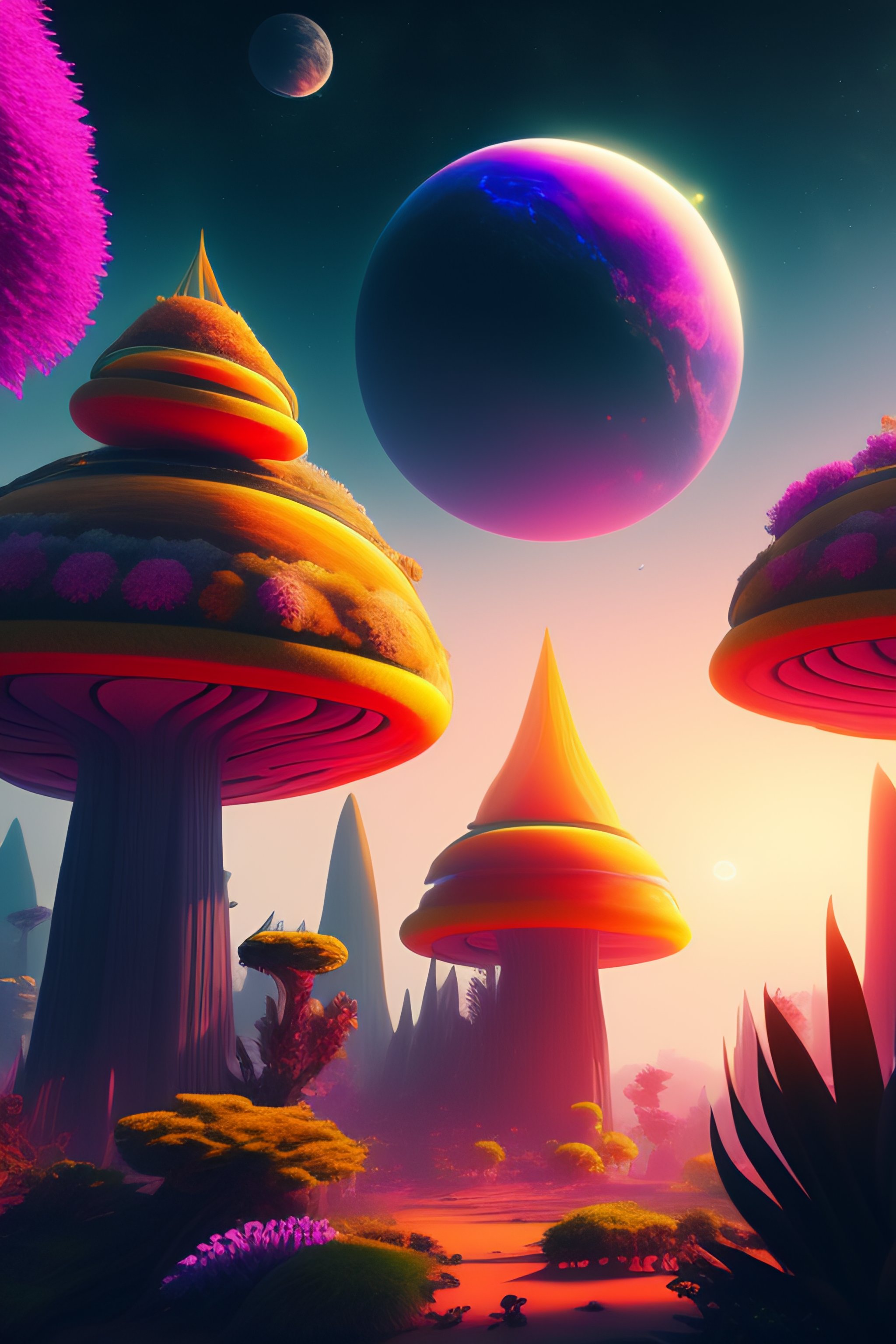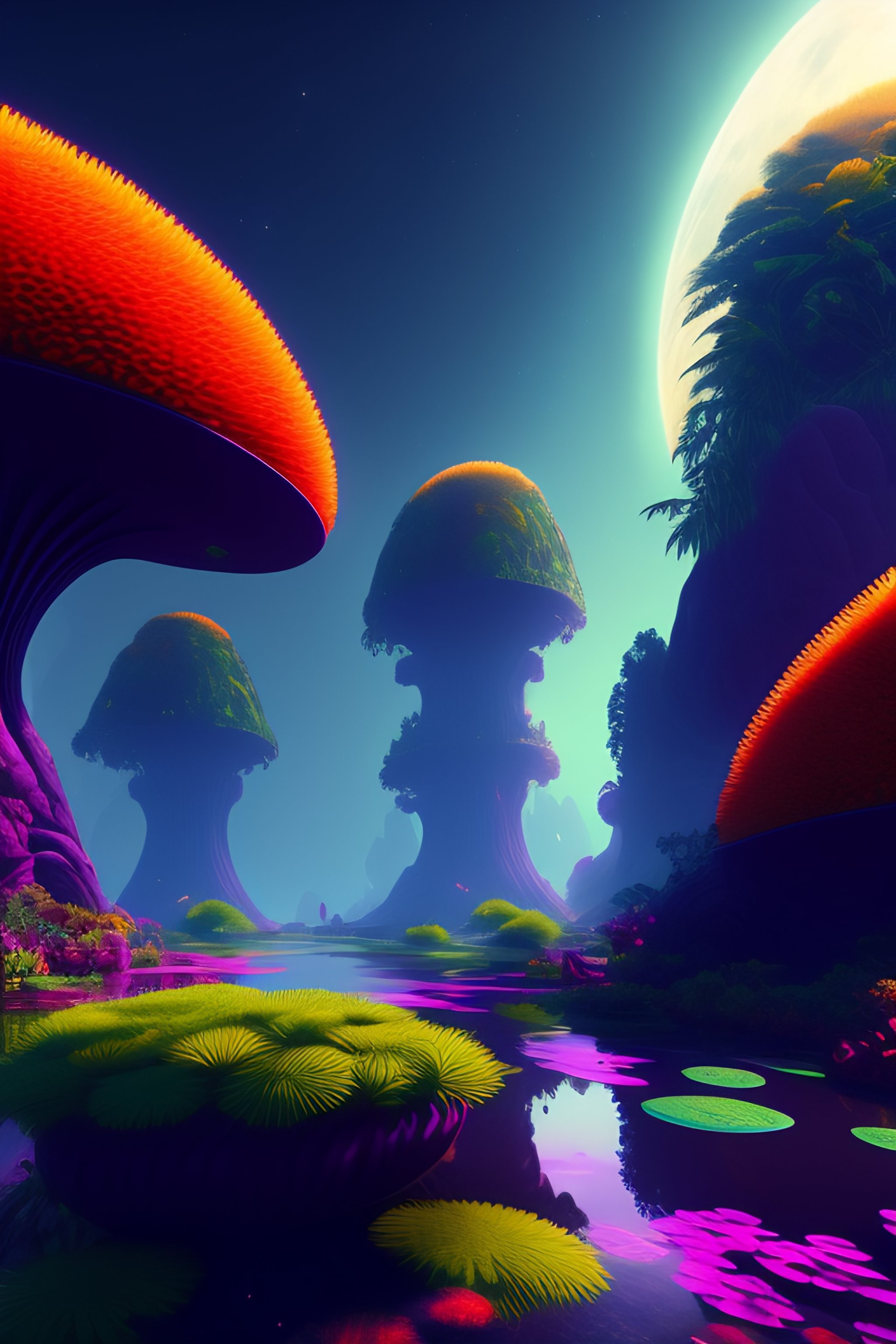 An eerie surreal alien planet, lots of alien plant life, trees, alien jungle, lots of colors, flowers and fruits, lots of details, colorful, fotorealistic, 8k, cinematic