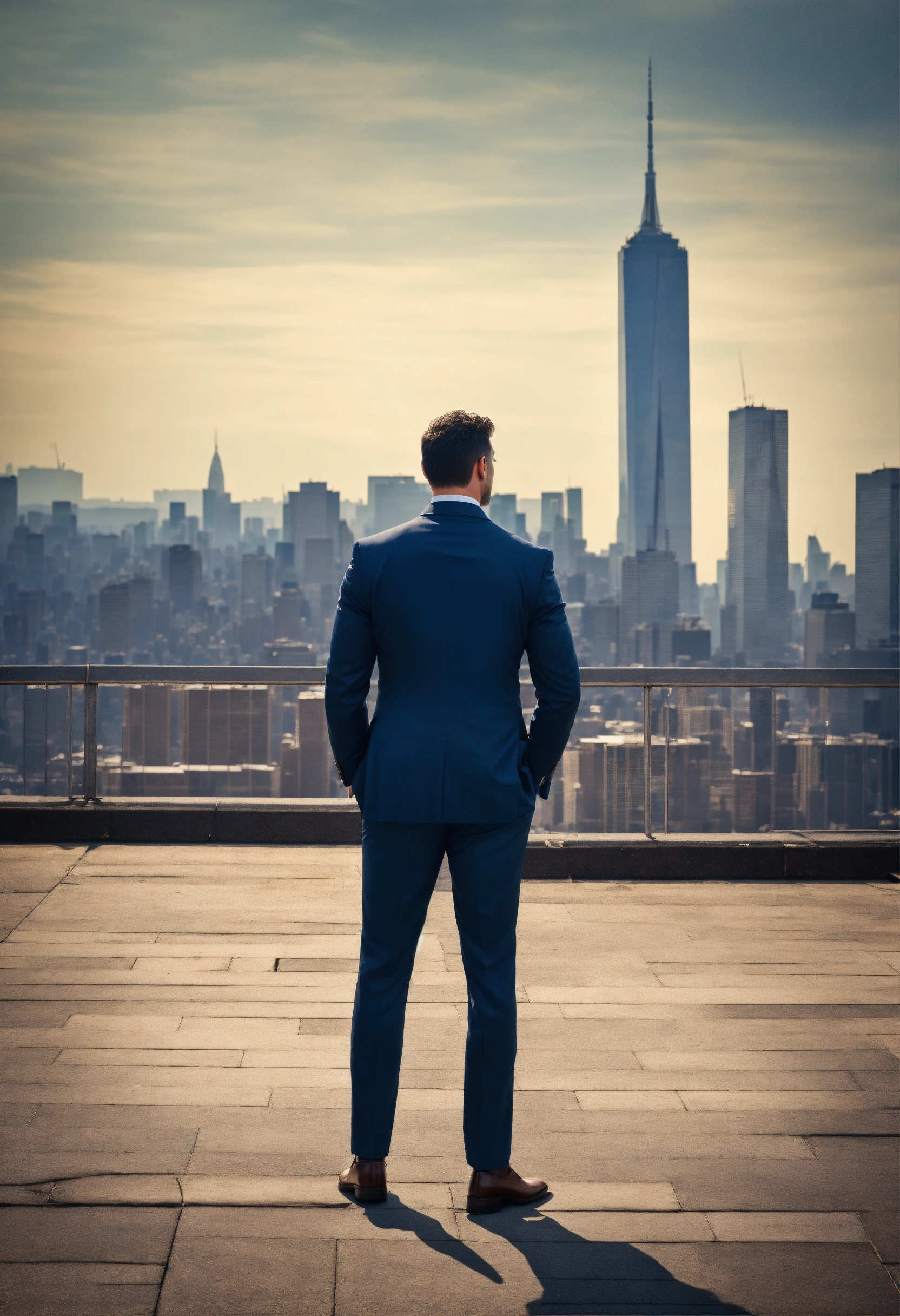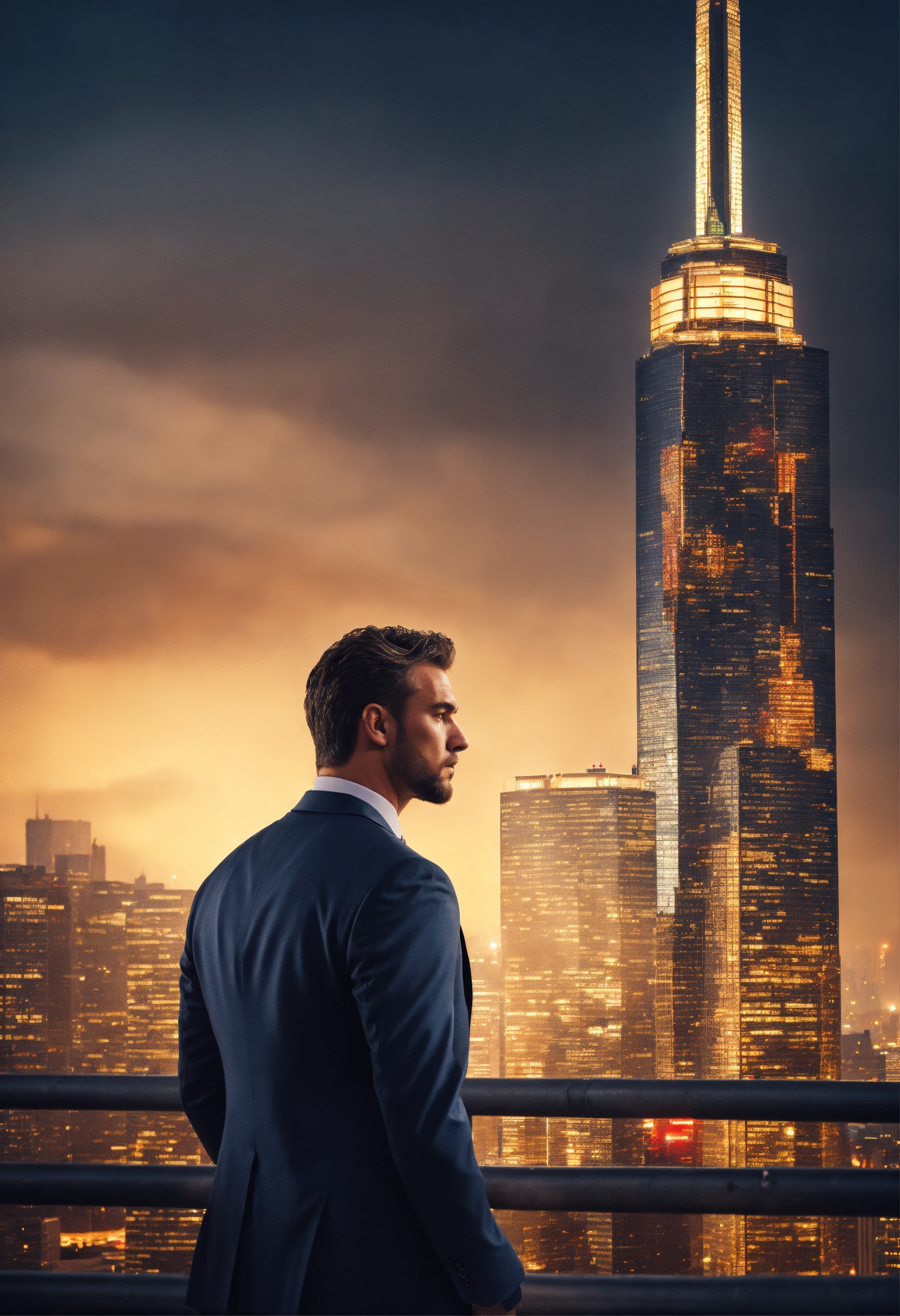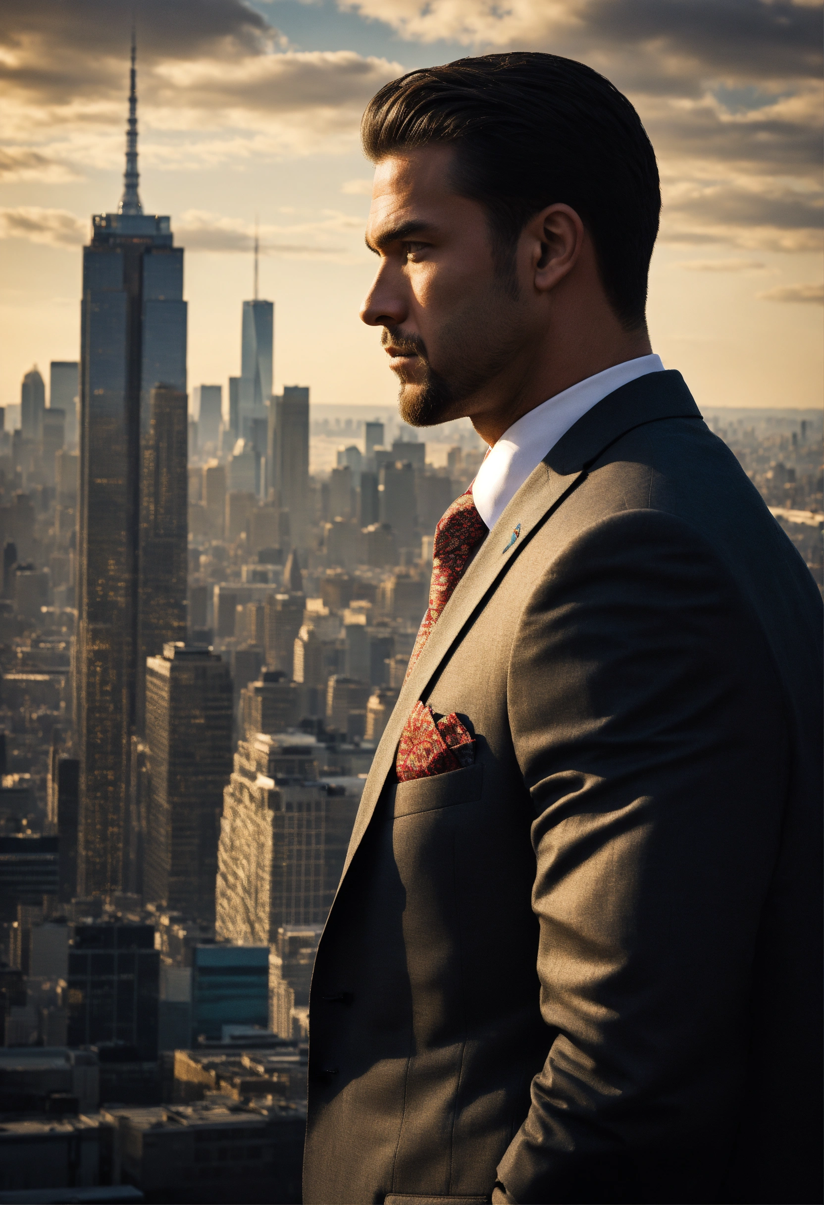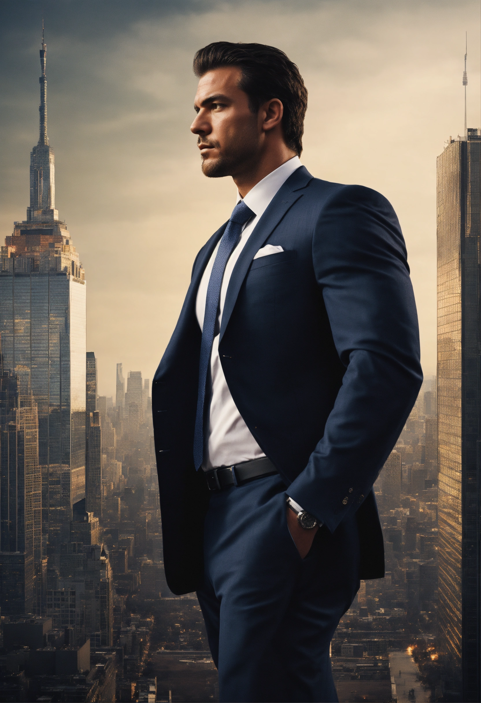 Design a compelling image, tall and strong man, side profile, dressed in a suit, metropolitan skyline, that represents strength and resilience. no text added.