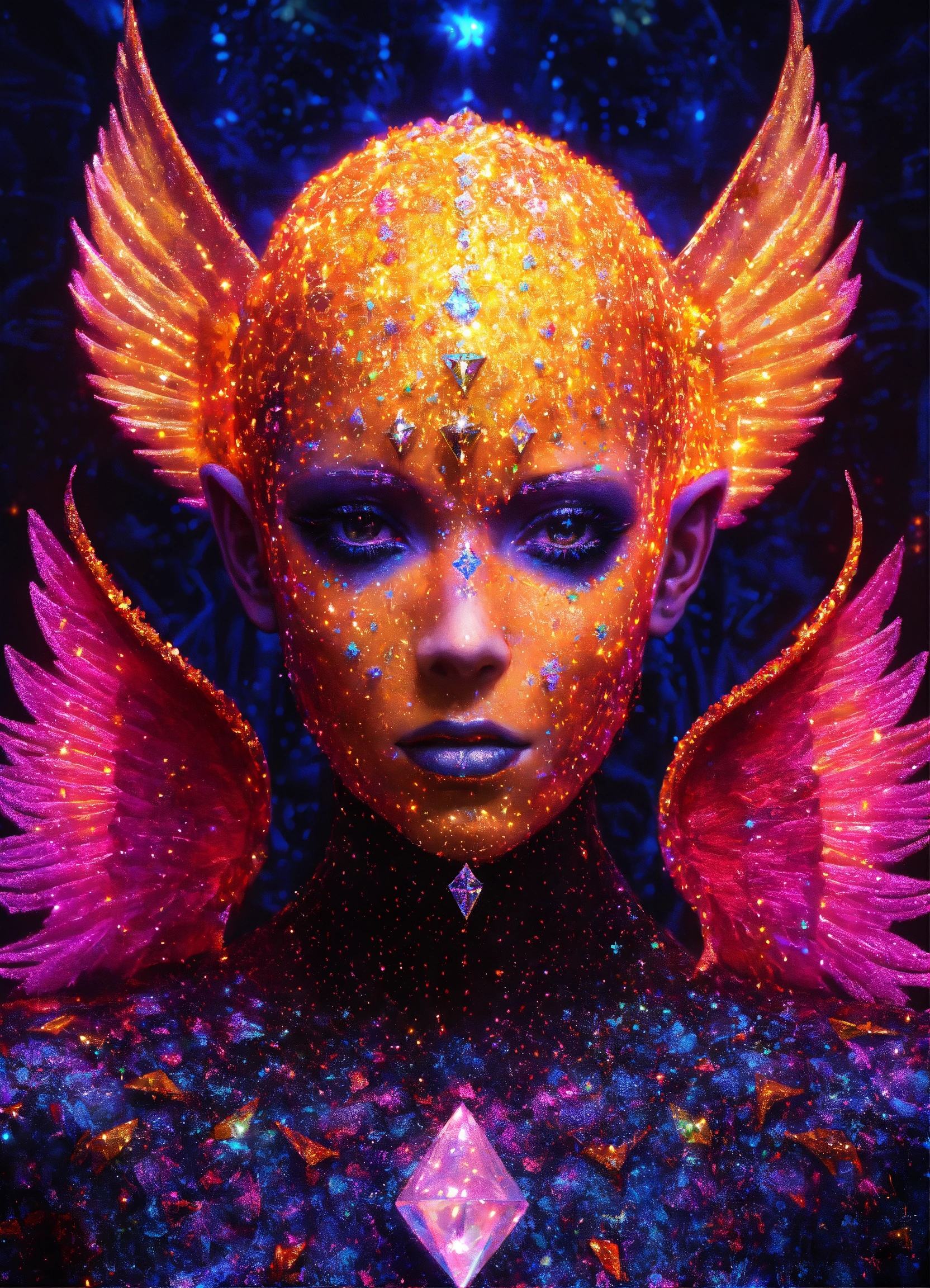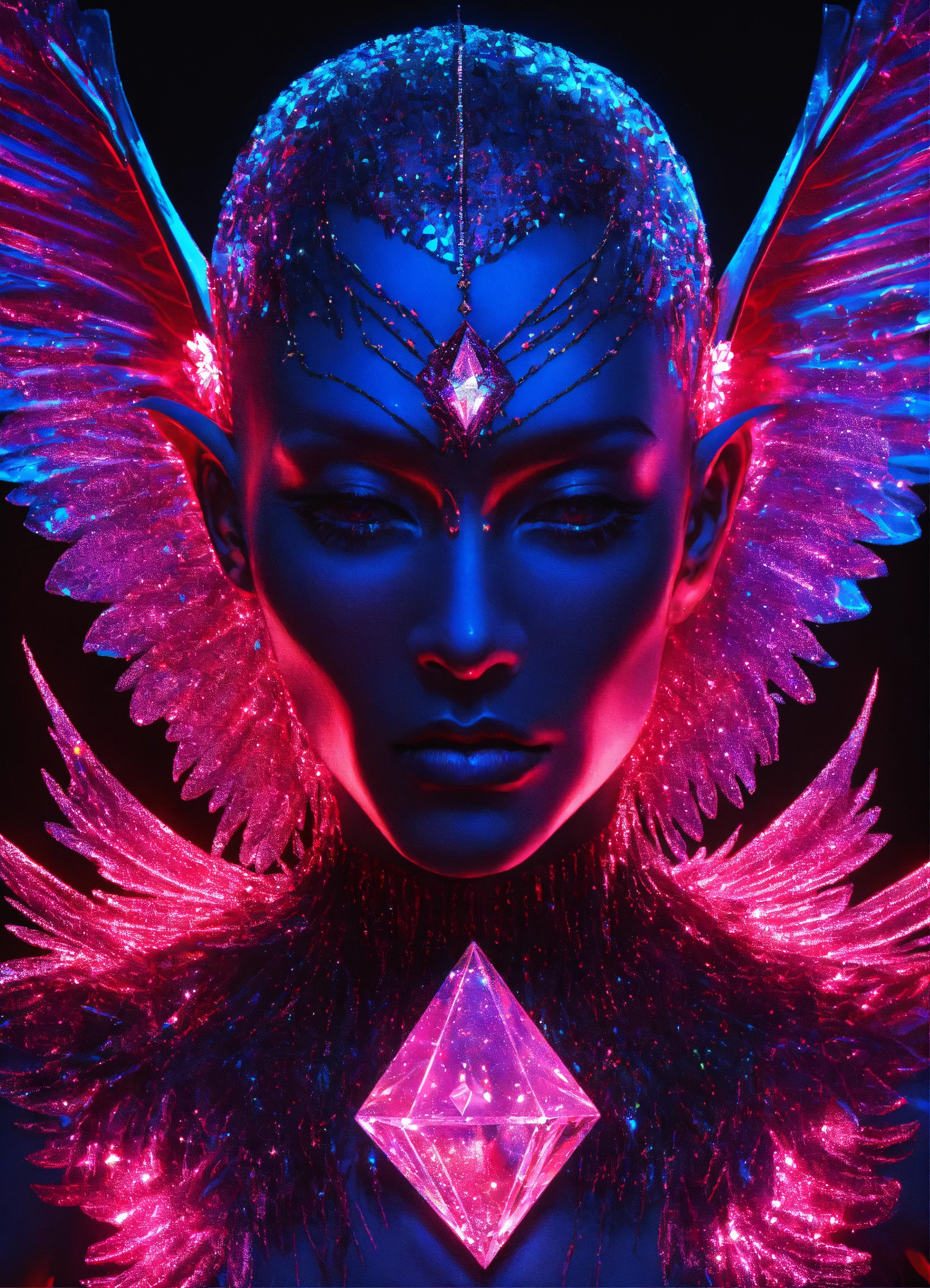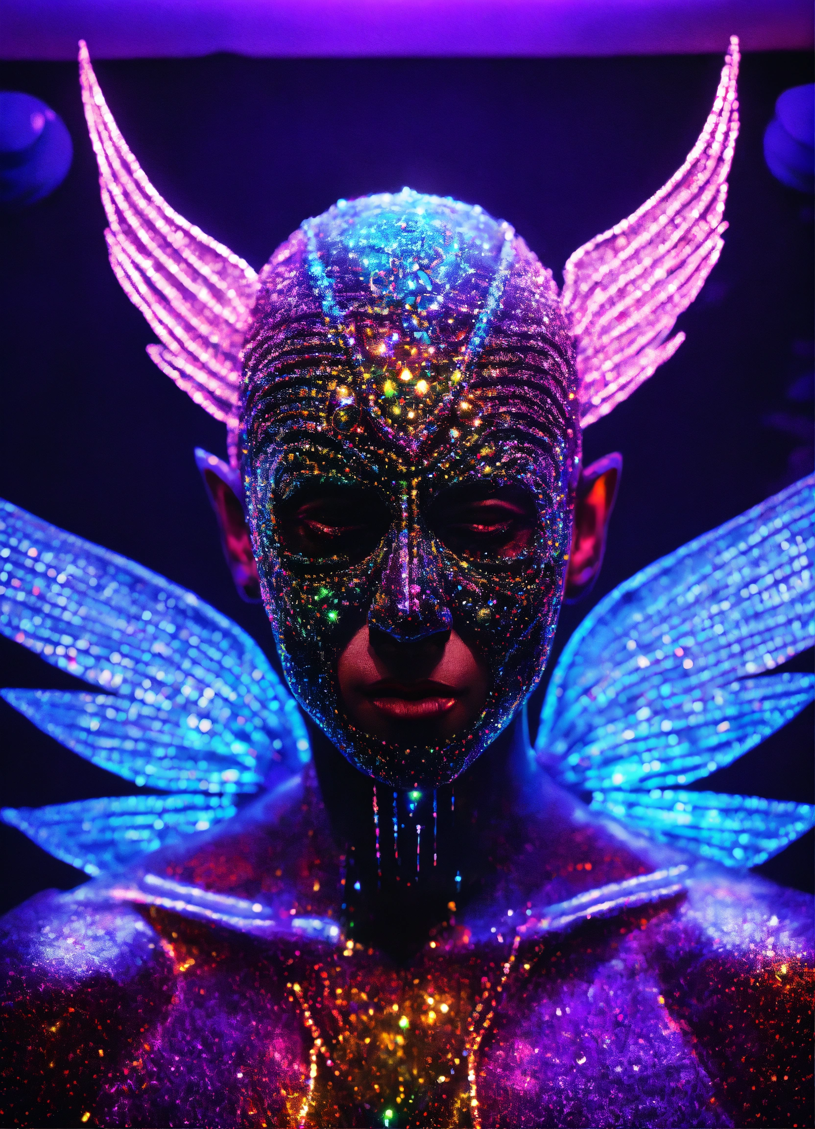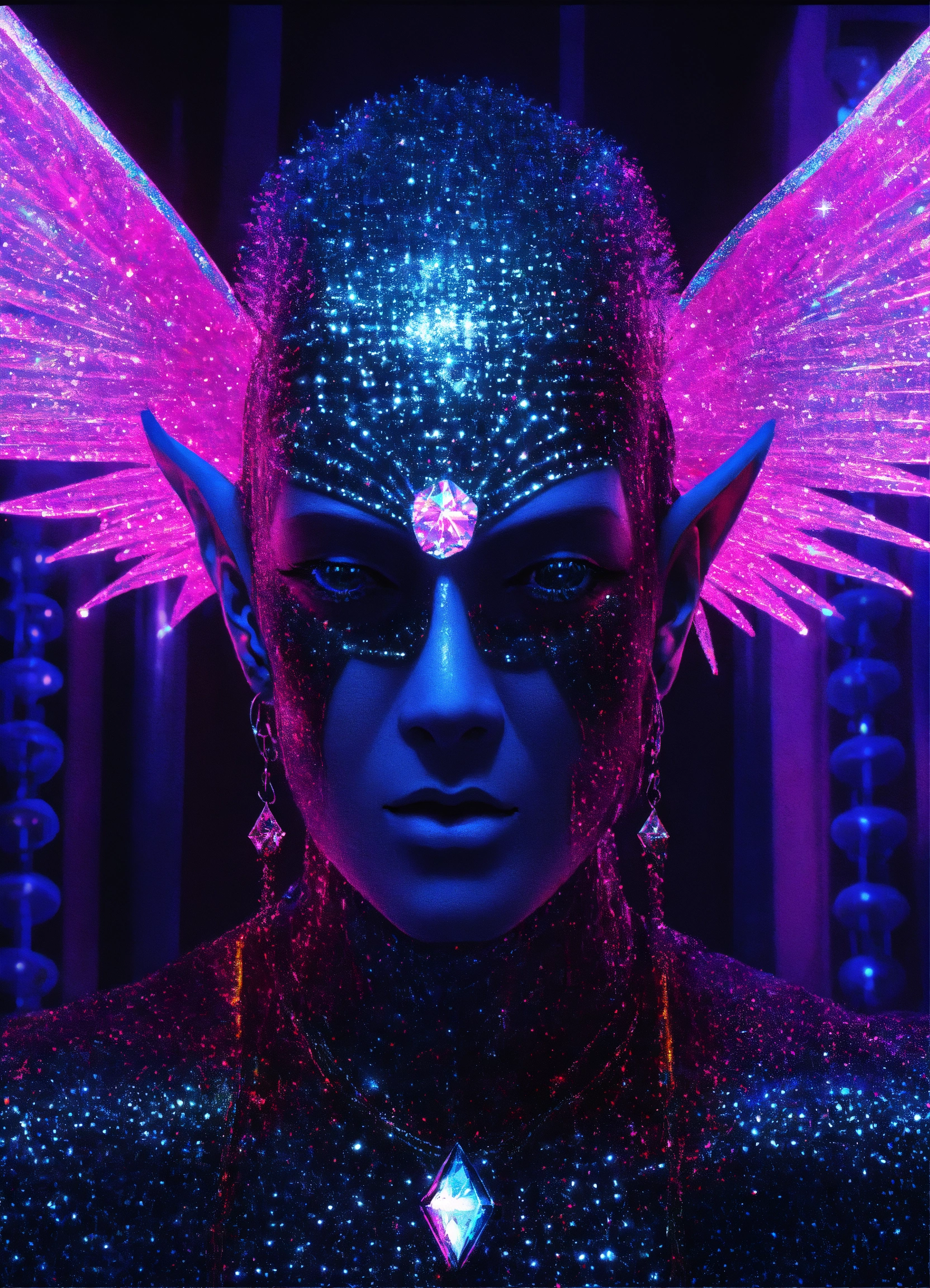 Ultra realistic pinhead with diamond angel wings in a diamond neon black light dmt demon glitter room