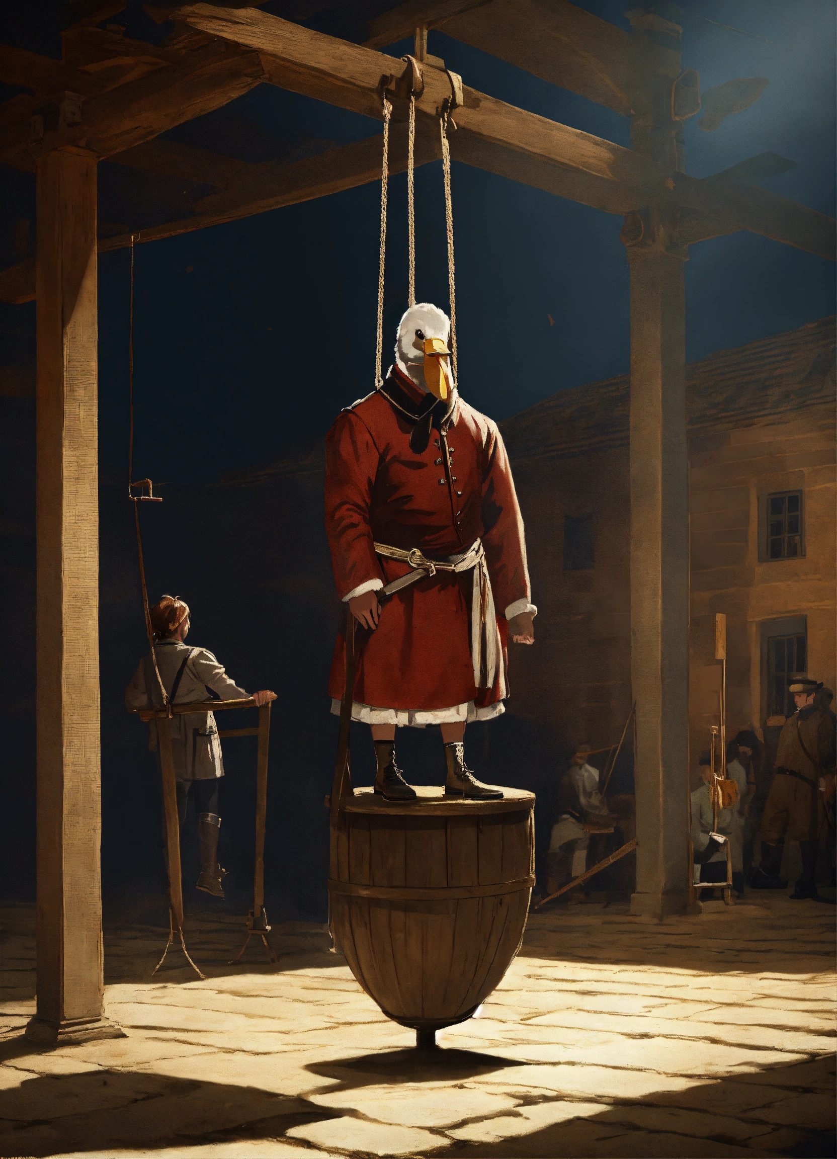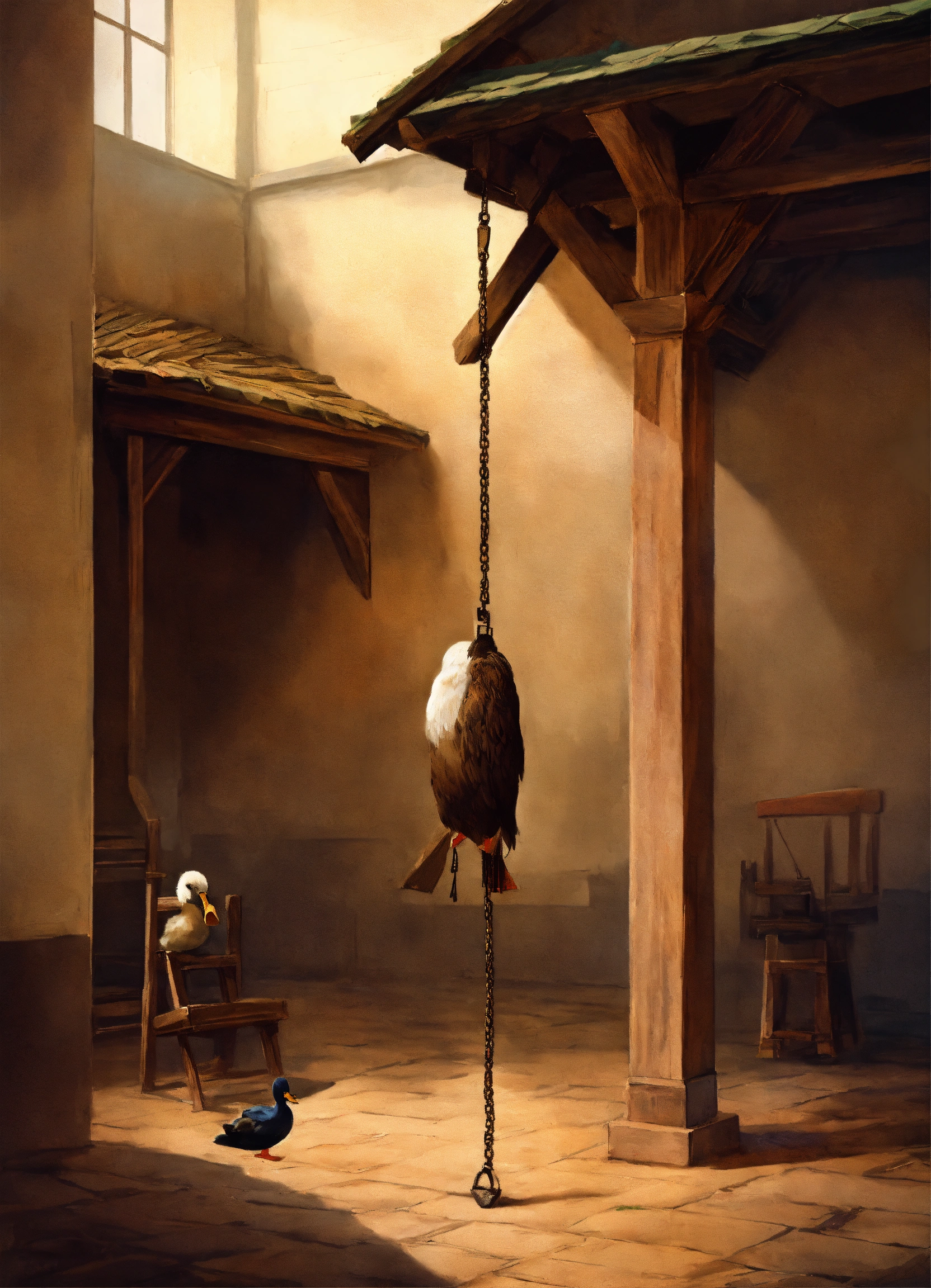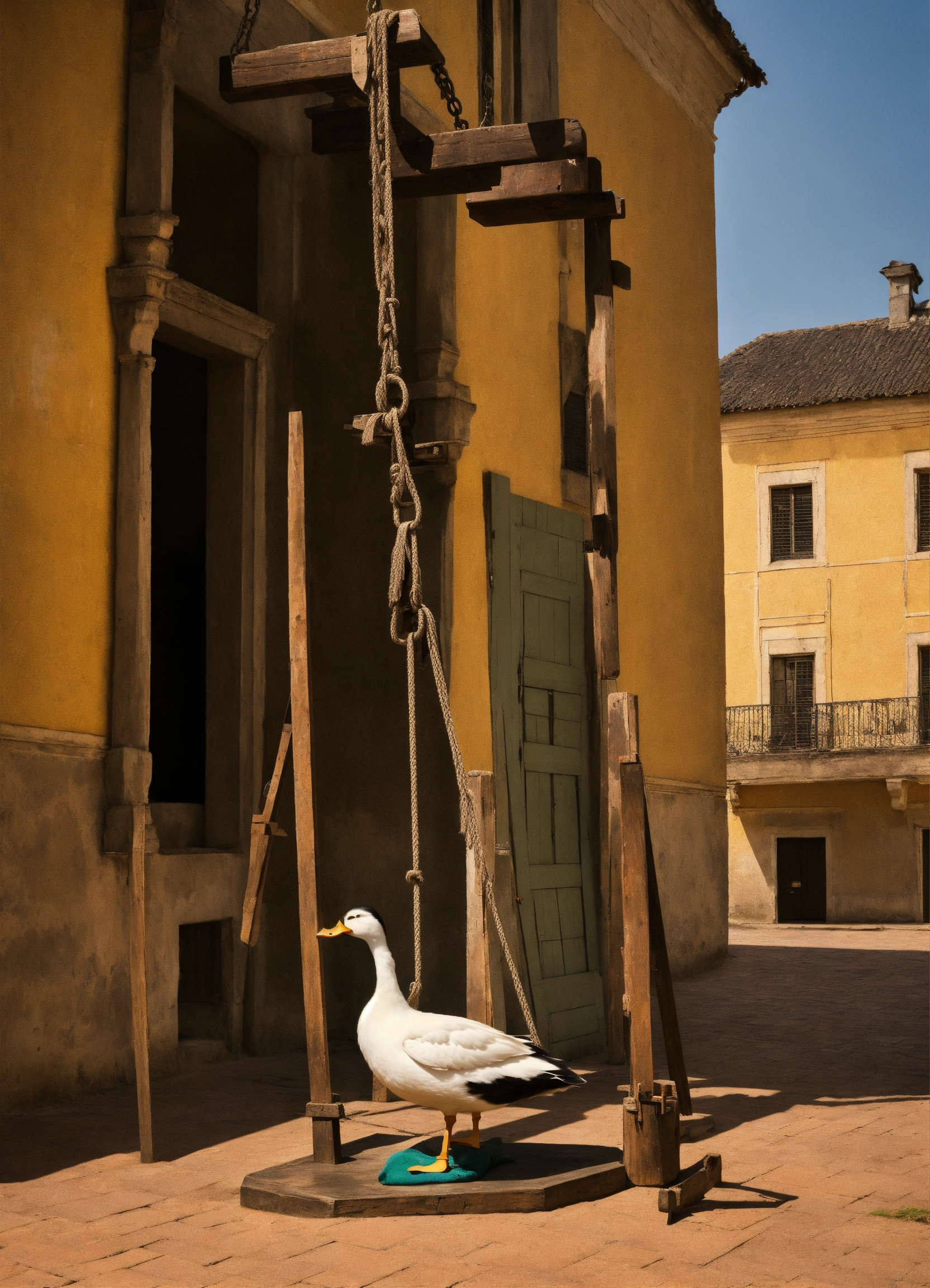 Public execution, gallows in the courtyard, executioner hanging on this gallows a very large duck by the neck, sentenced to the death penalty