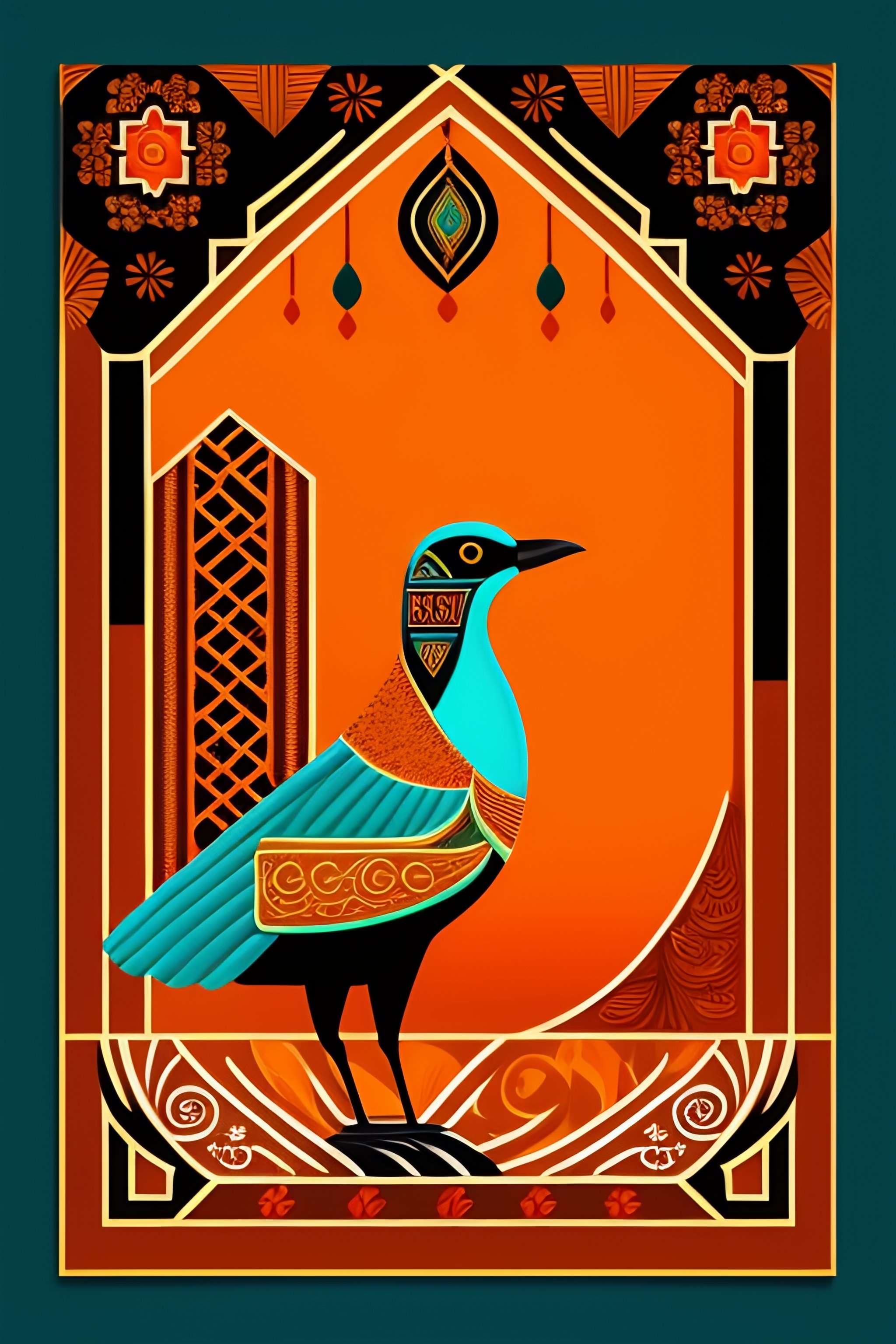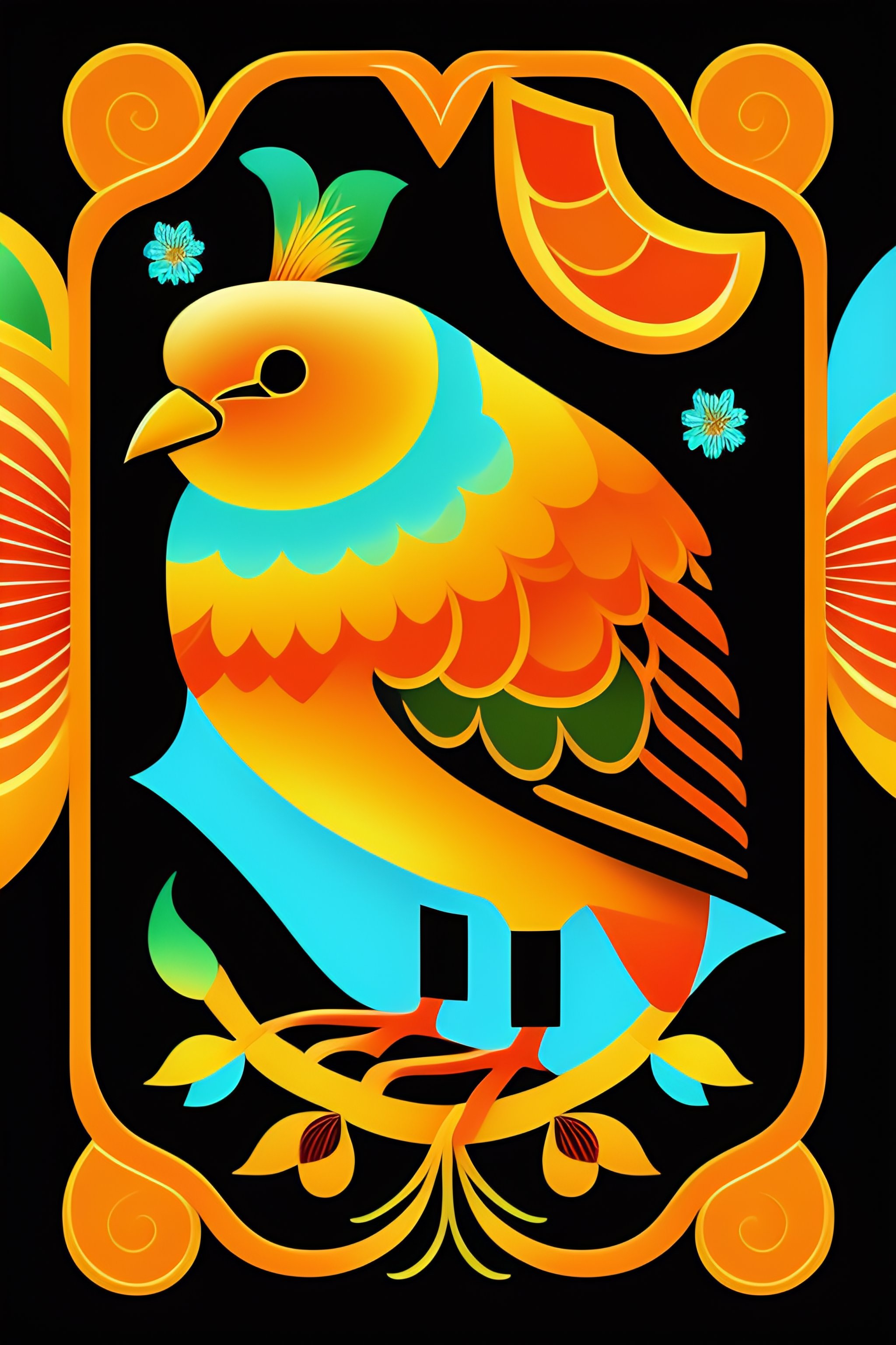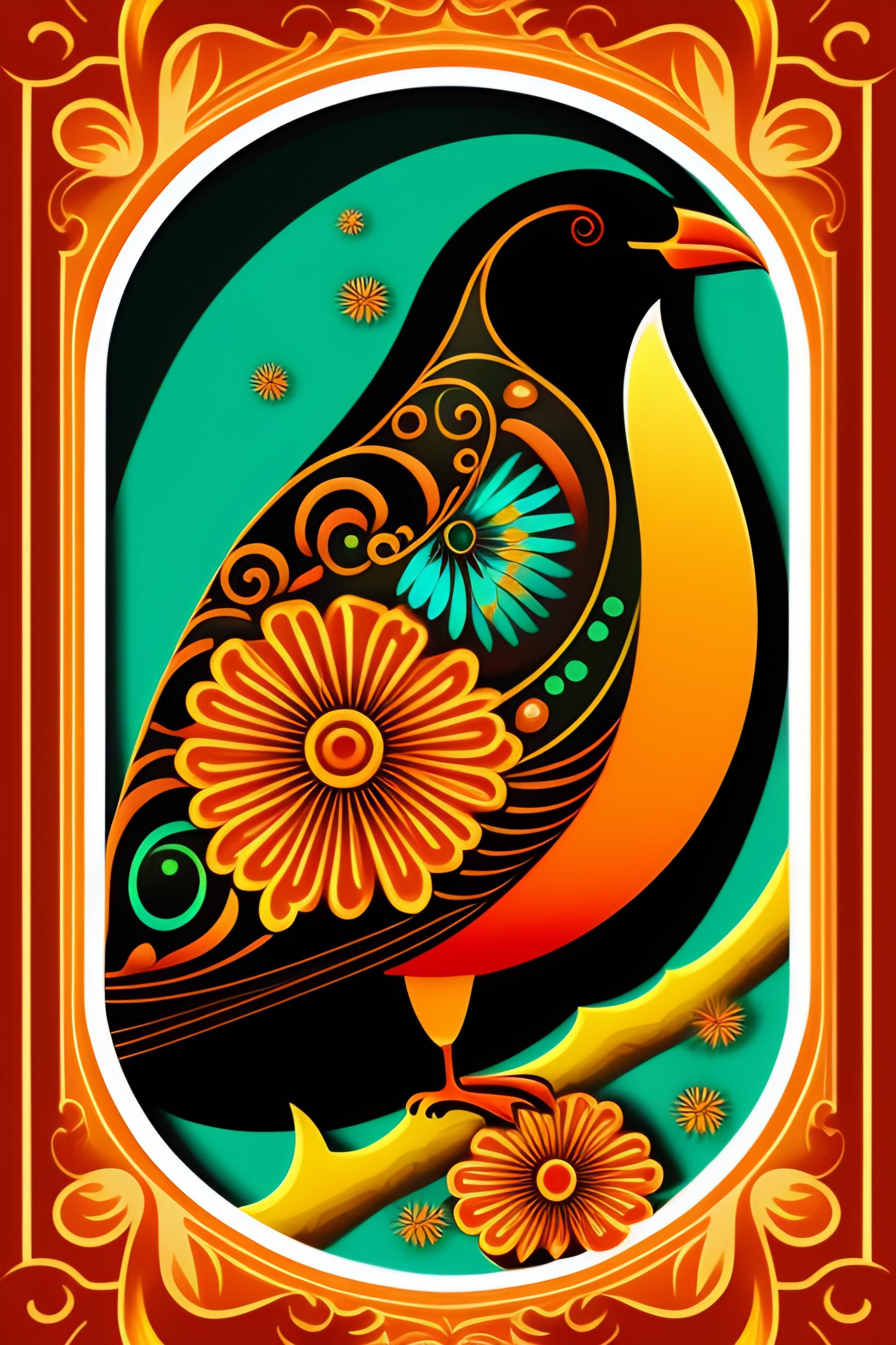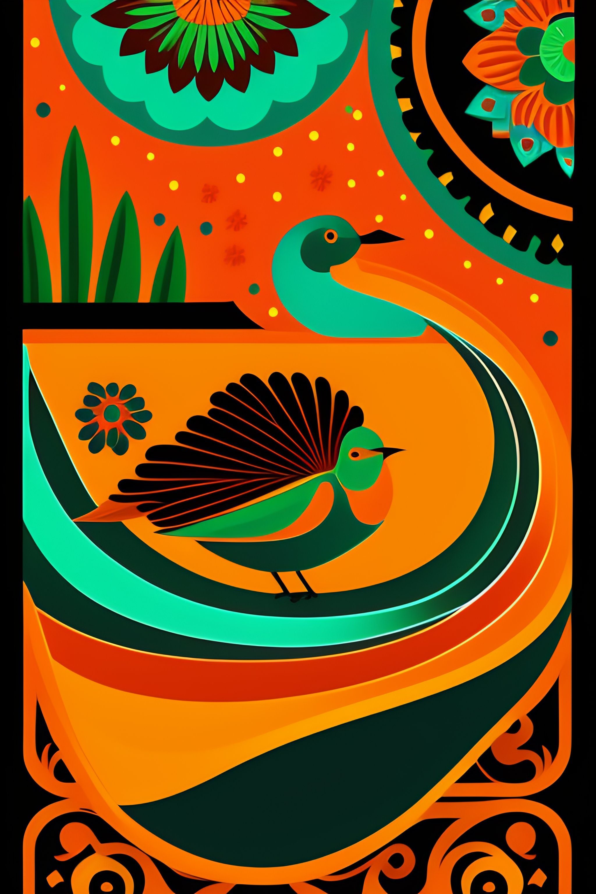 Vector flat flyer, flyer flat vector 2d image of a bird surrounded by mexican ornamental elements such as mates, flowers, garlands of lights and native plants, colors orange, turquoise and black