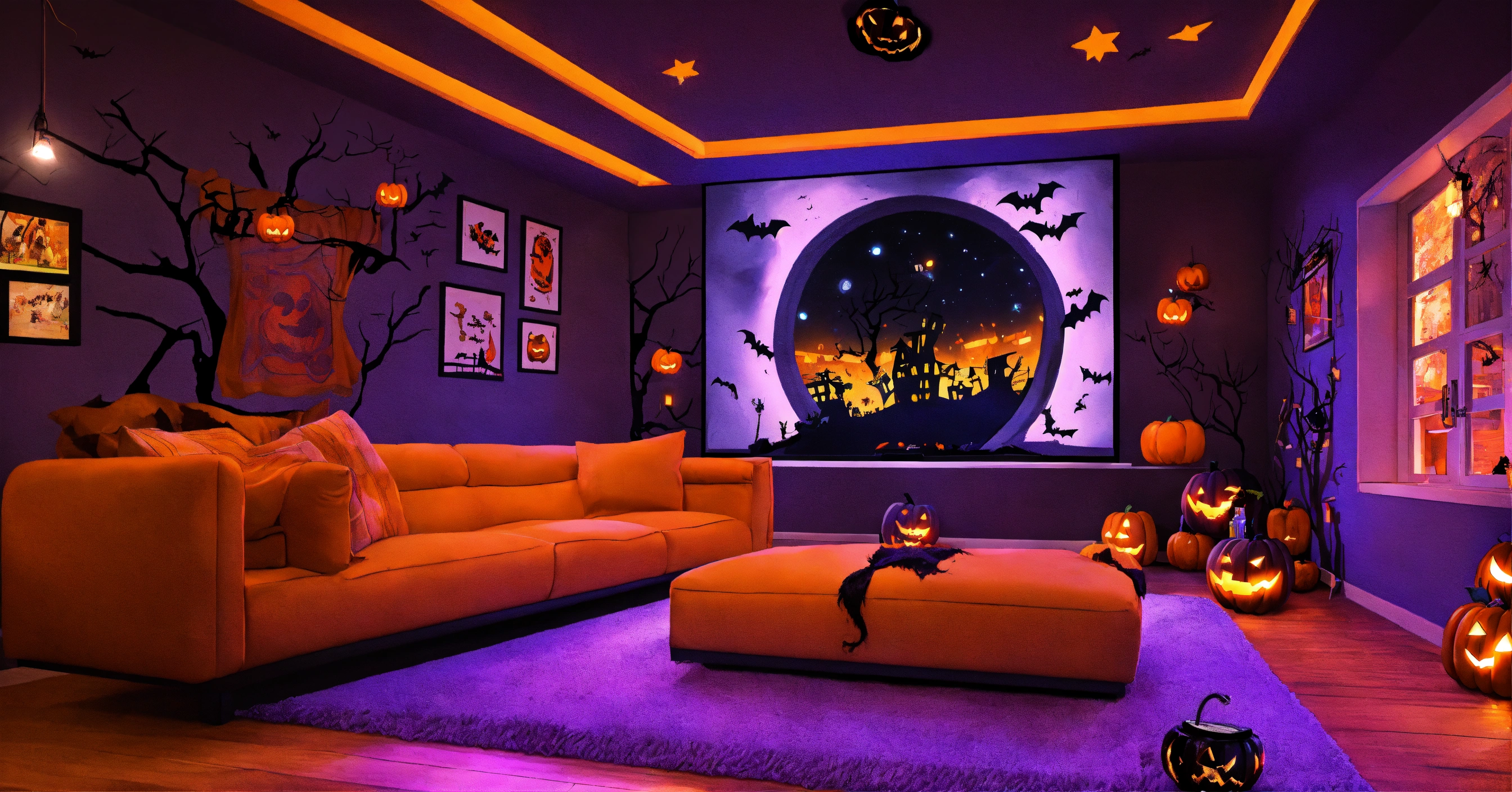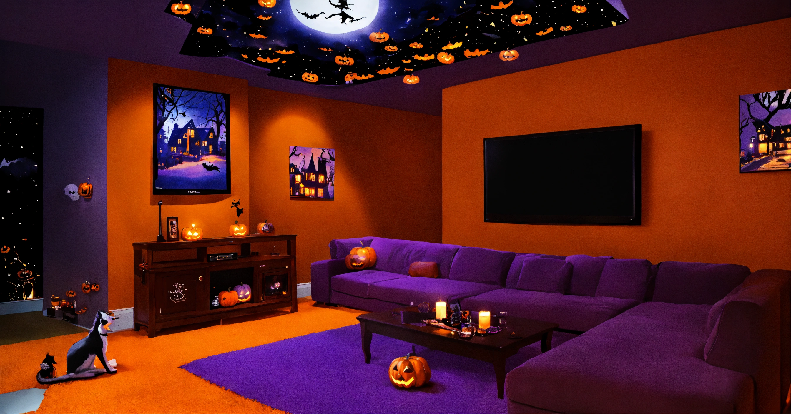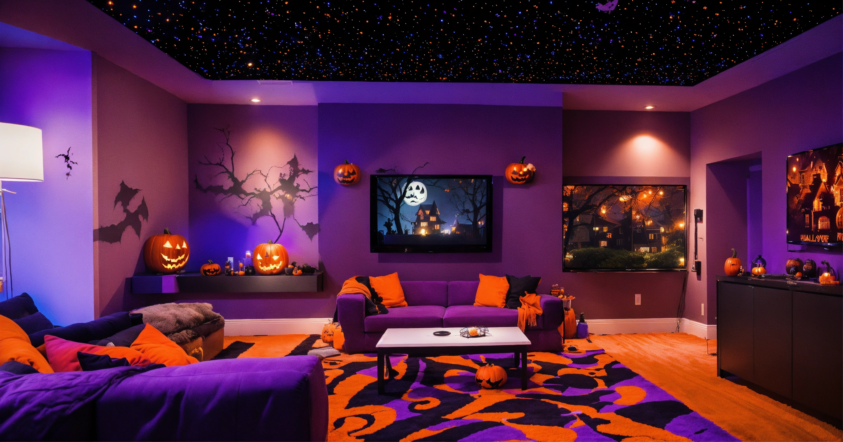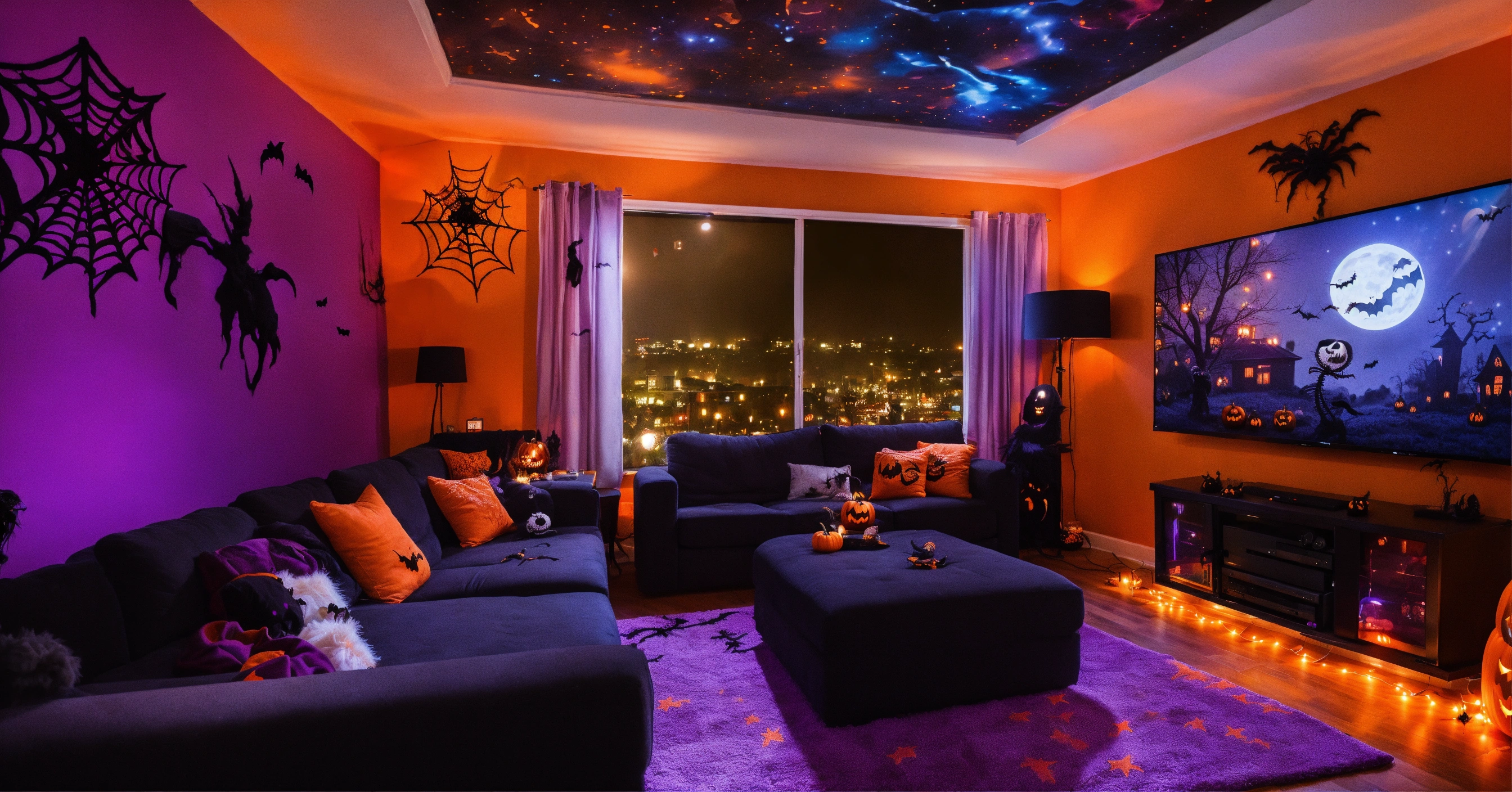 Living room, halloween theme, mounted tv, fluffy orange rug, big couches, nightmare before christmas, outside night, halloween grafitti, orange purple black, star ceiling window, led lights