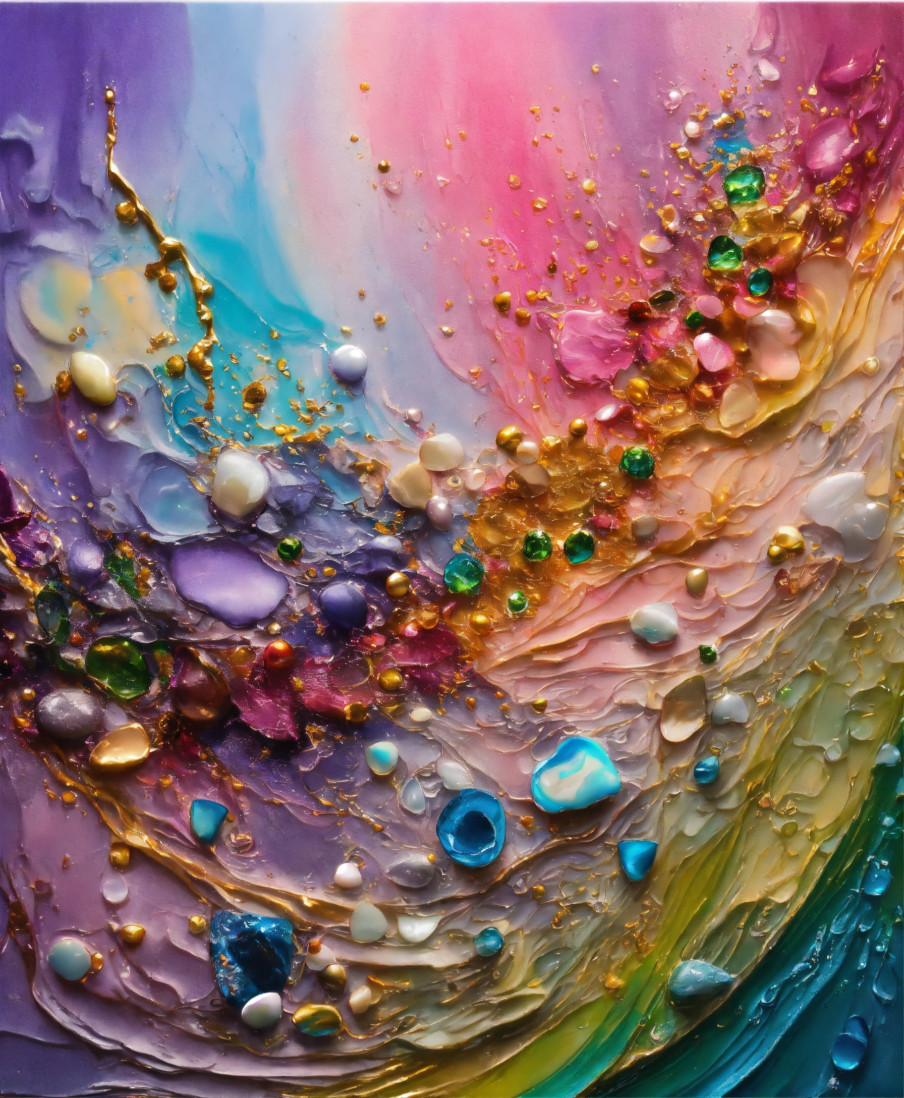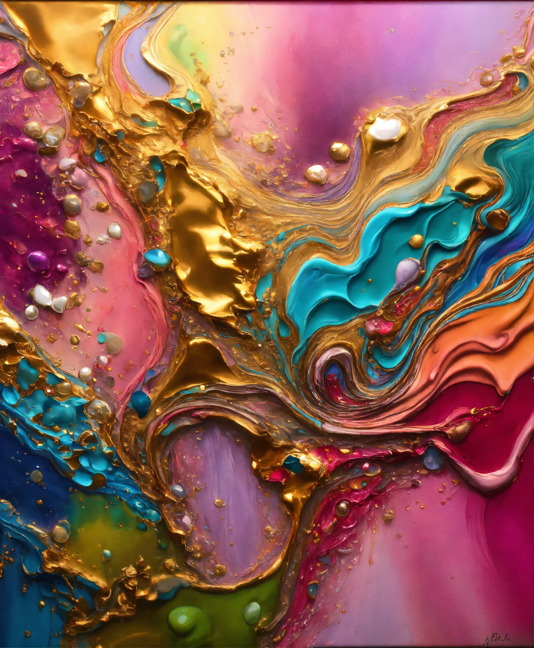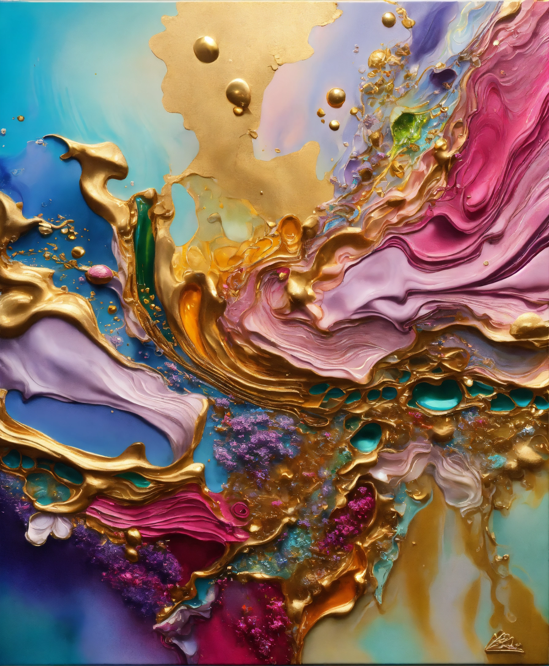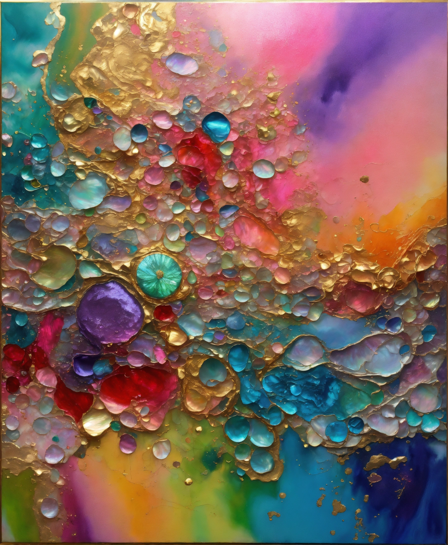 Colorful abstract painting oil and water complex complicated bright vivid colors beautiful opulent wealthy intricate all hues primary secondary and tertiary colors pink peridot sky blue lilac green magenta mother of pearl magnificent amazing sublime delicate hyperdetailed masterpiece complex extraordinary metallic sheen elaborate awesome 24k gold and silver trim 8k