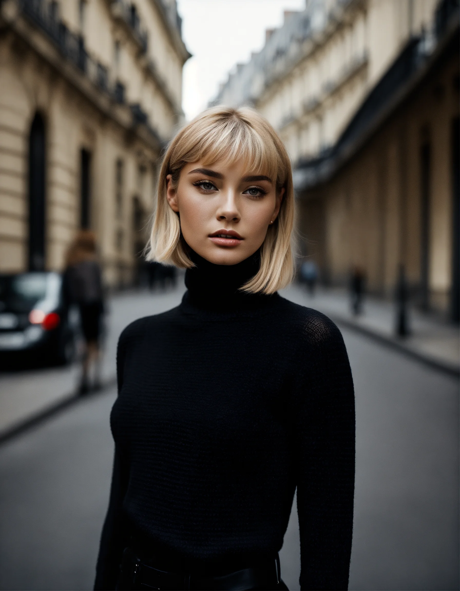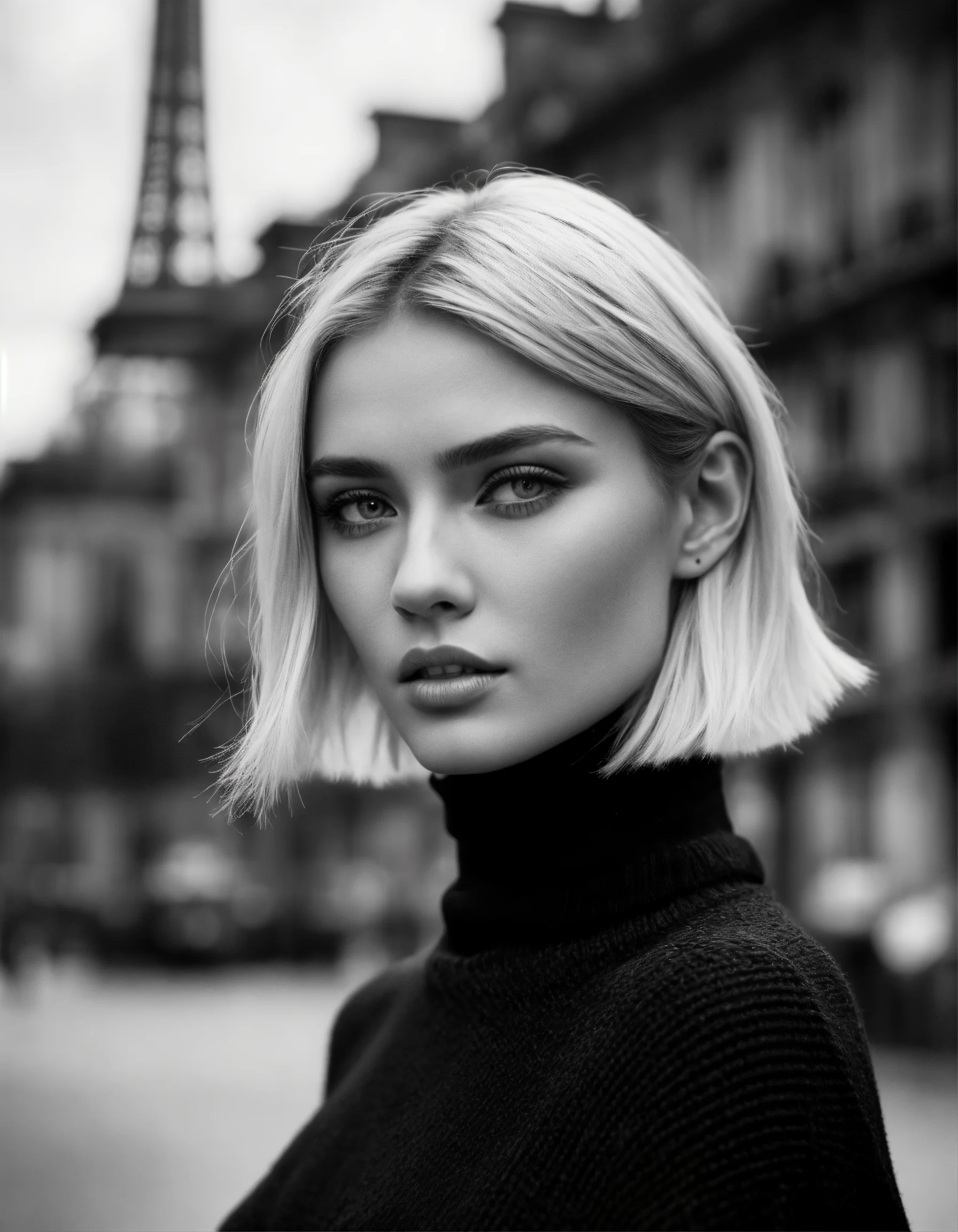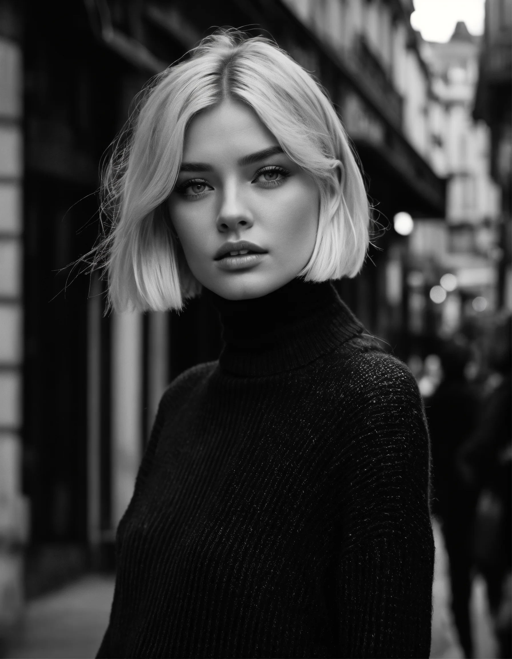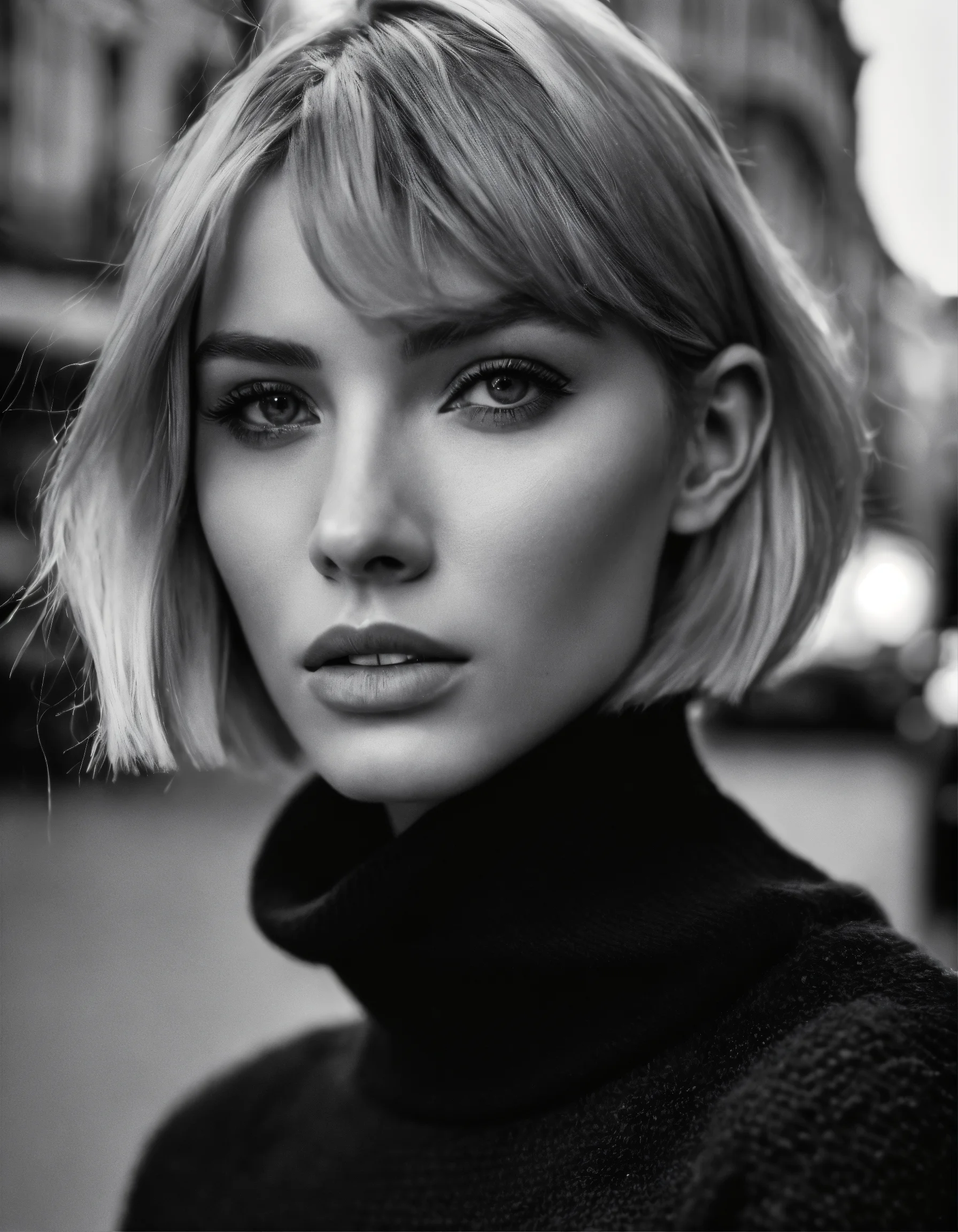 Beautiful fashion models, blonde, clear eyes, black turtleneck sweater, face view, bob haircut, portrait close up, paris street background, black and white film, photography quality, high detail, high quality.