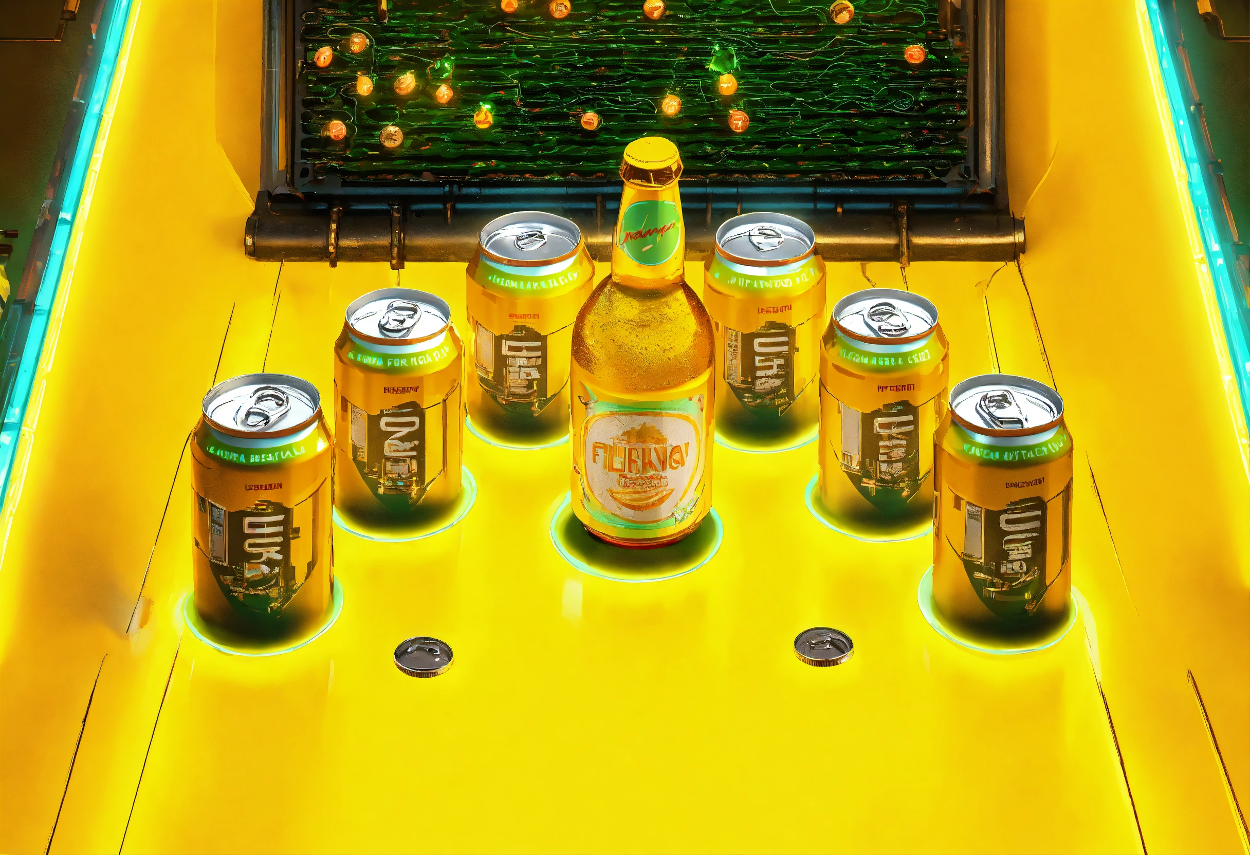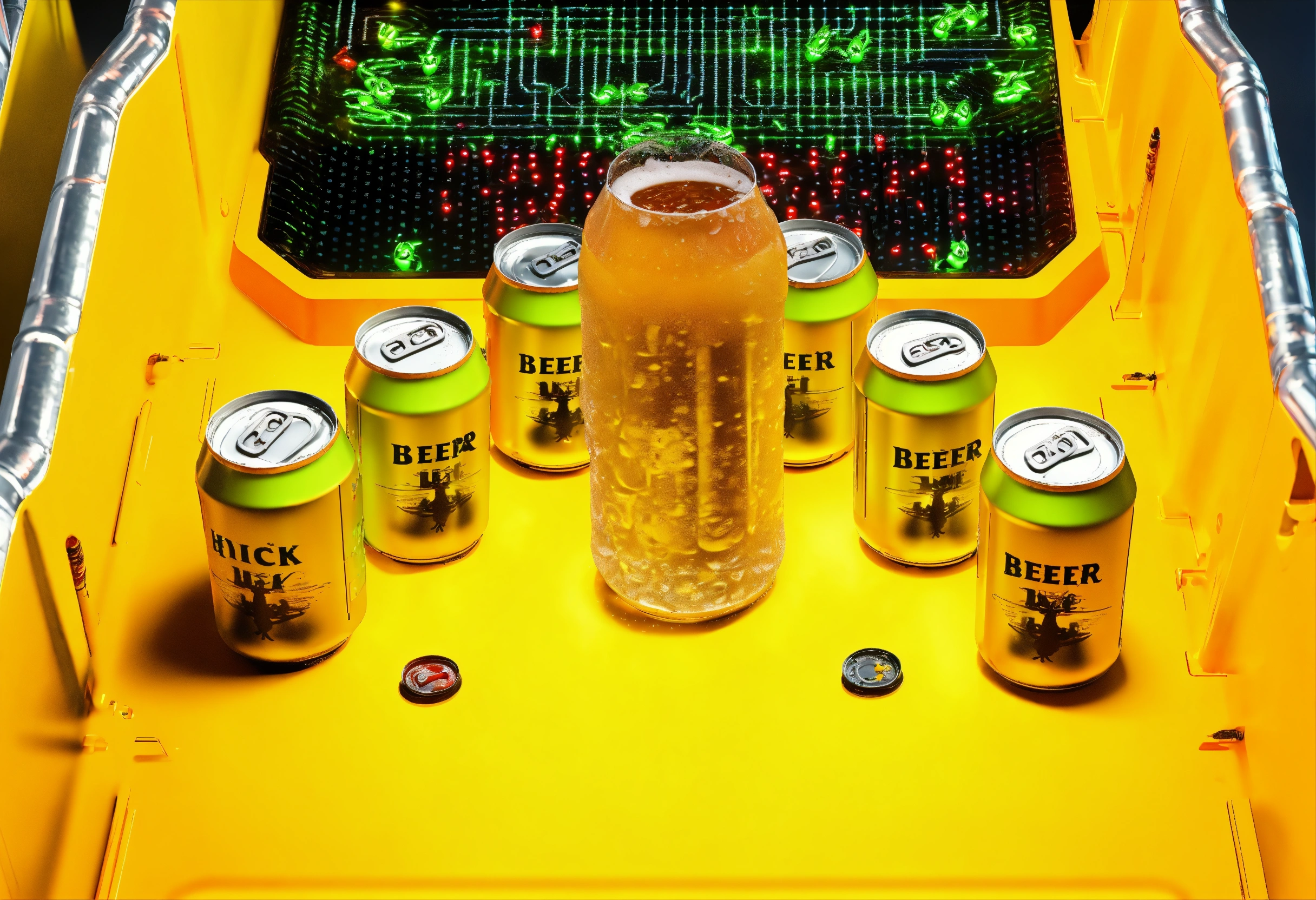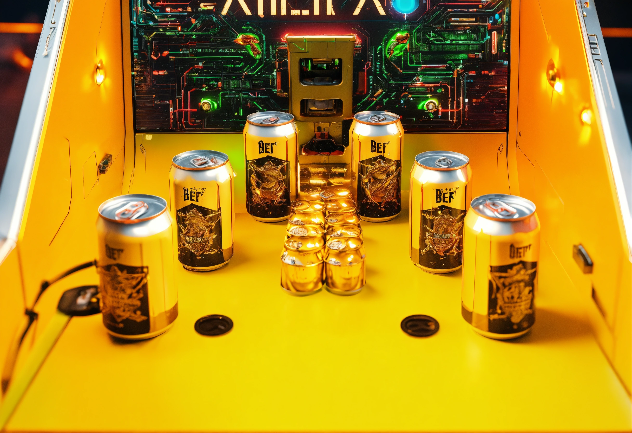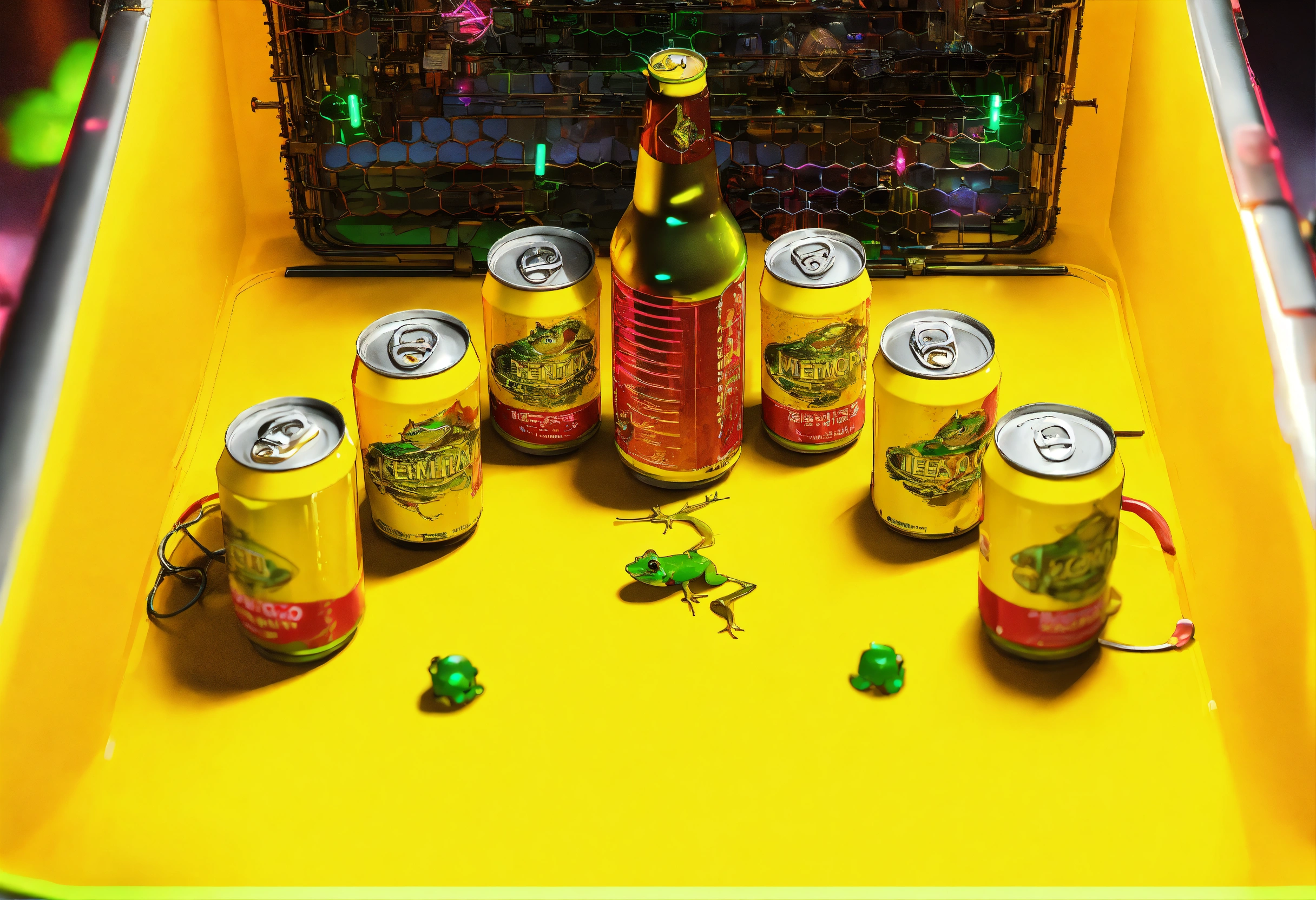 Futuristic cyberpunk game board with neon lights, metal beer cans, 2 metal frogs in the center, ultra detailed, hyper realistic, 8k rendering