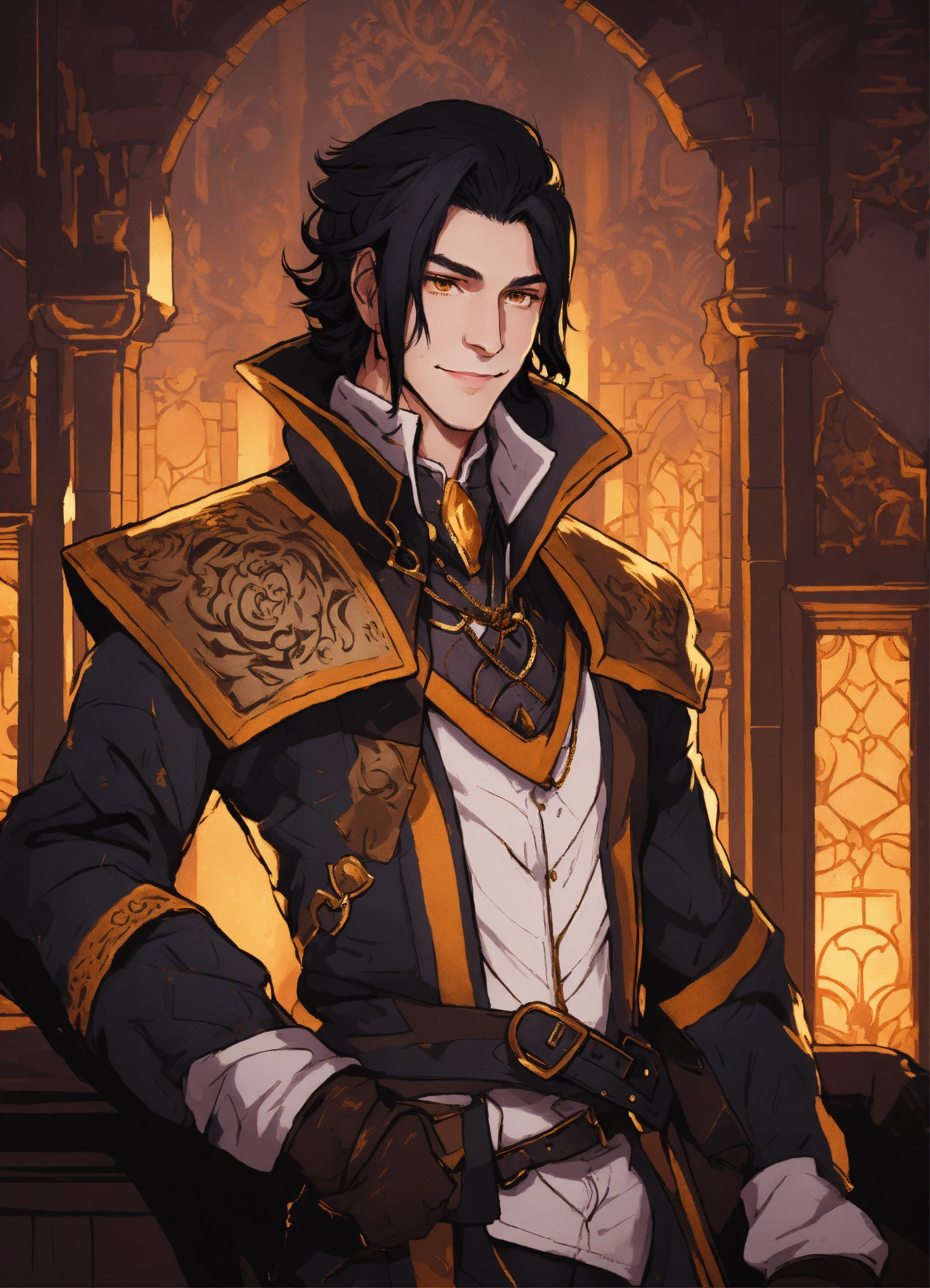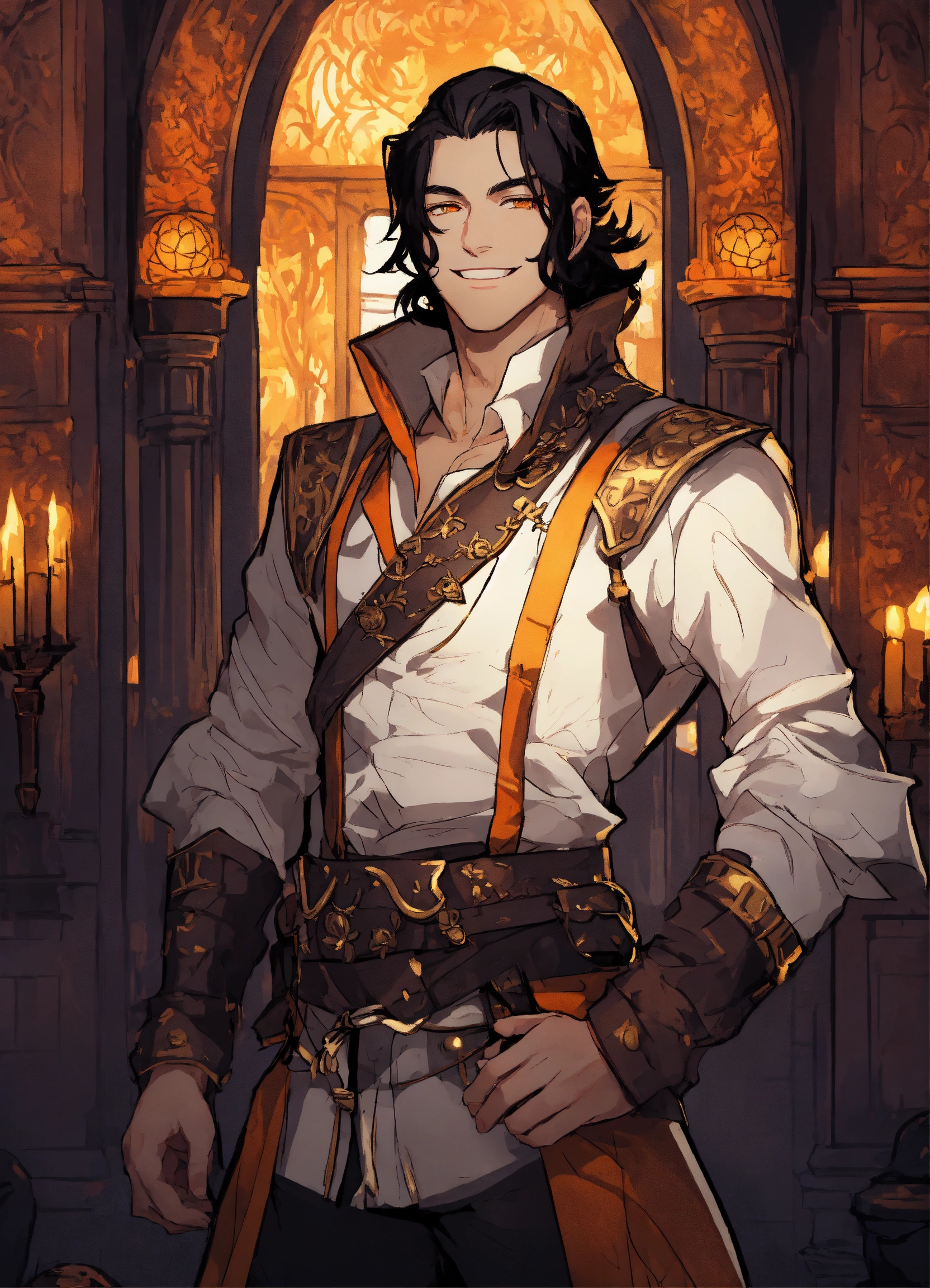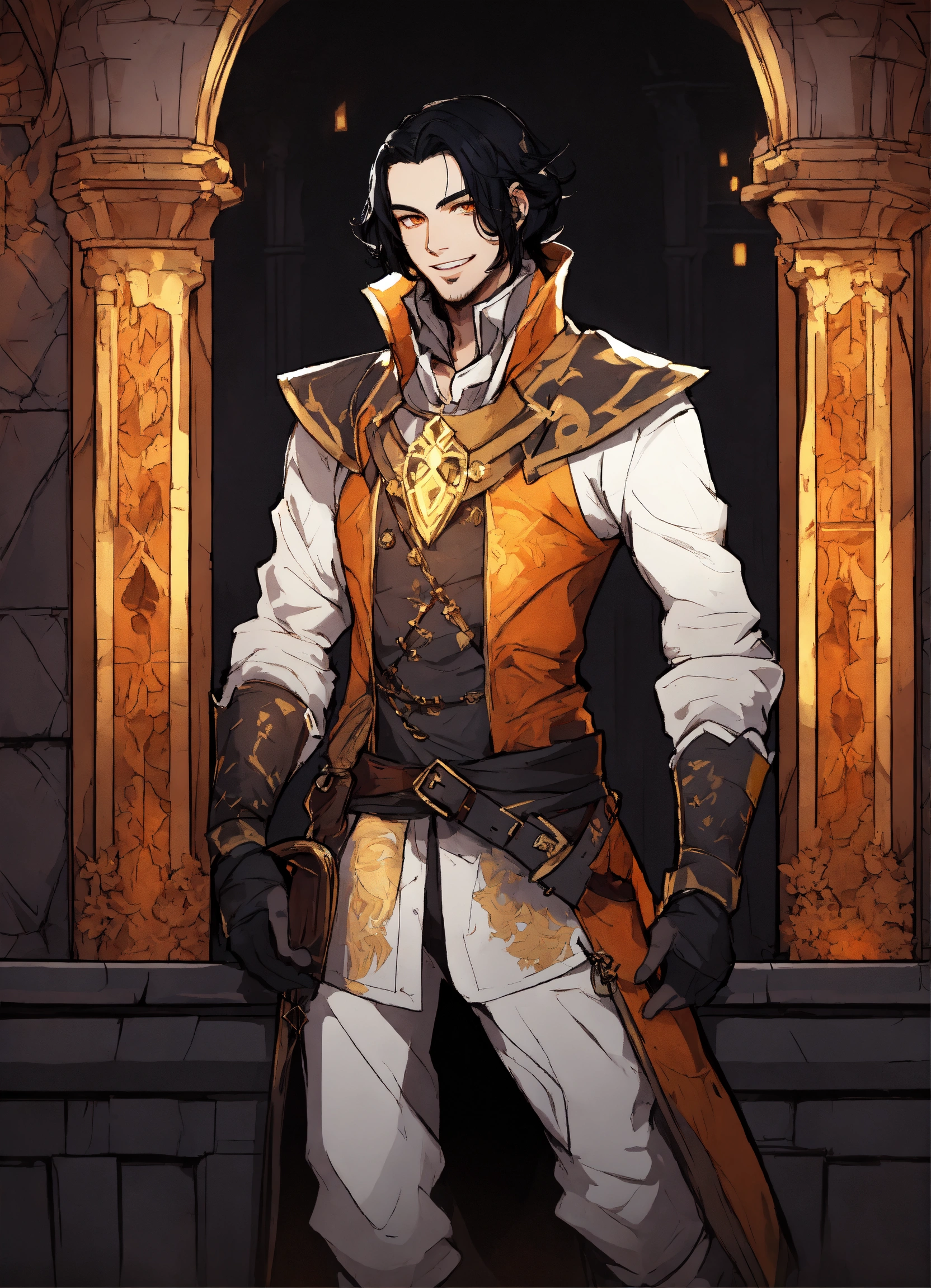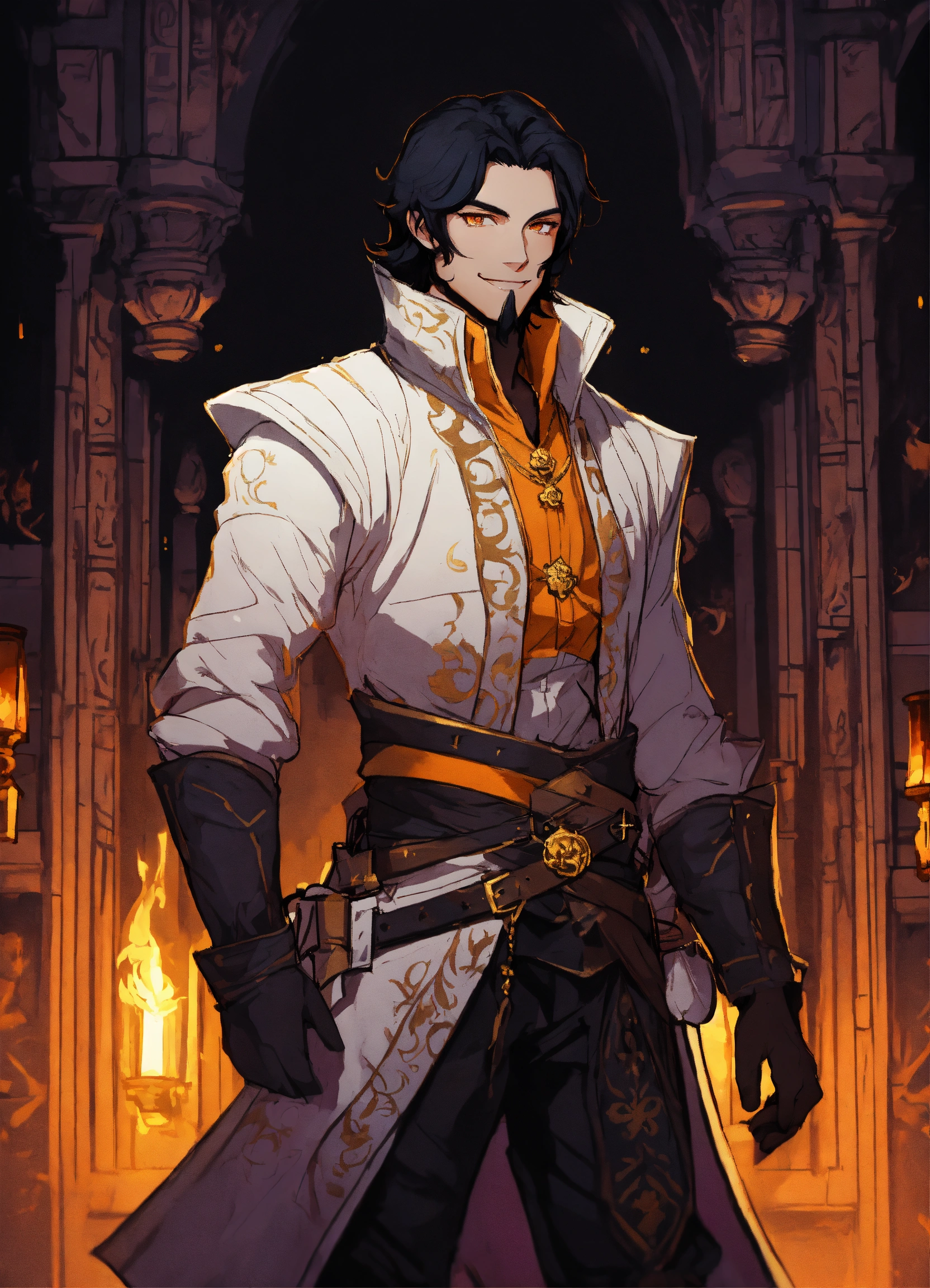Beautiful man, white, black hair with purpul reflects, orange eyes, white black and golden smith outfit, kind smile, in a palace. darkest dungeon art style
