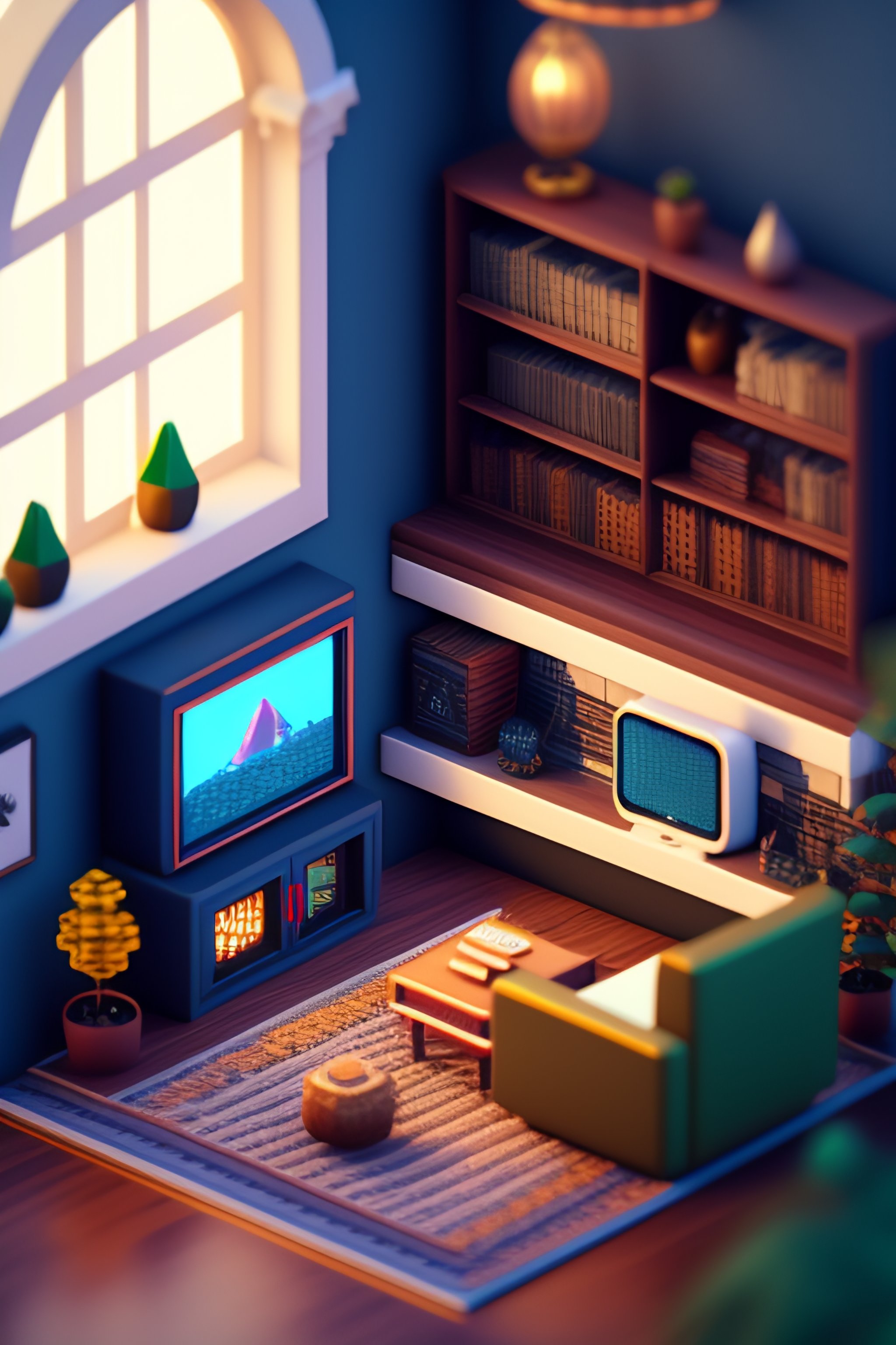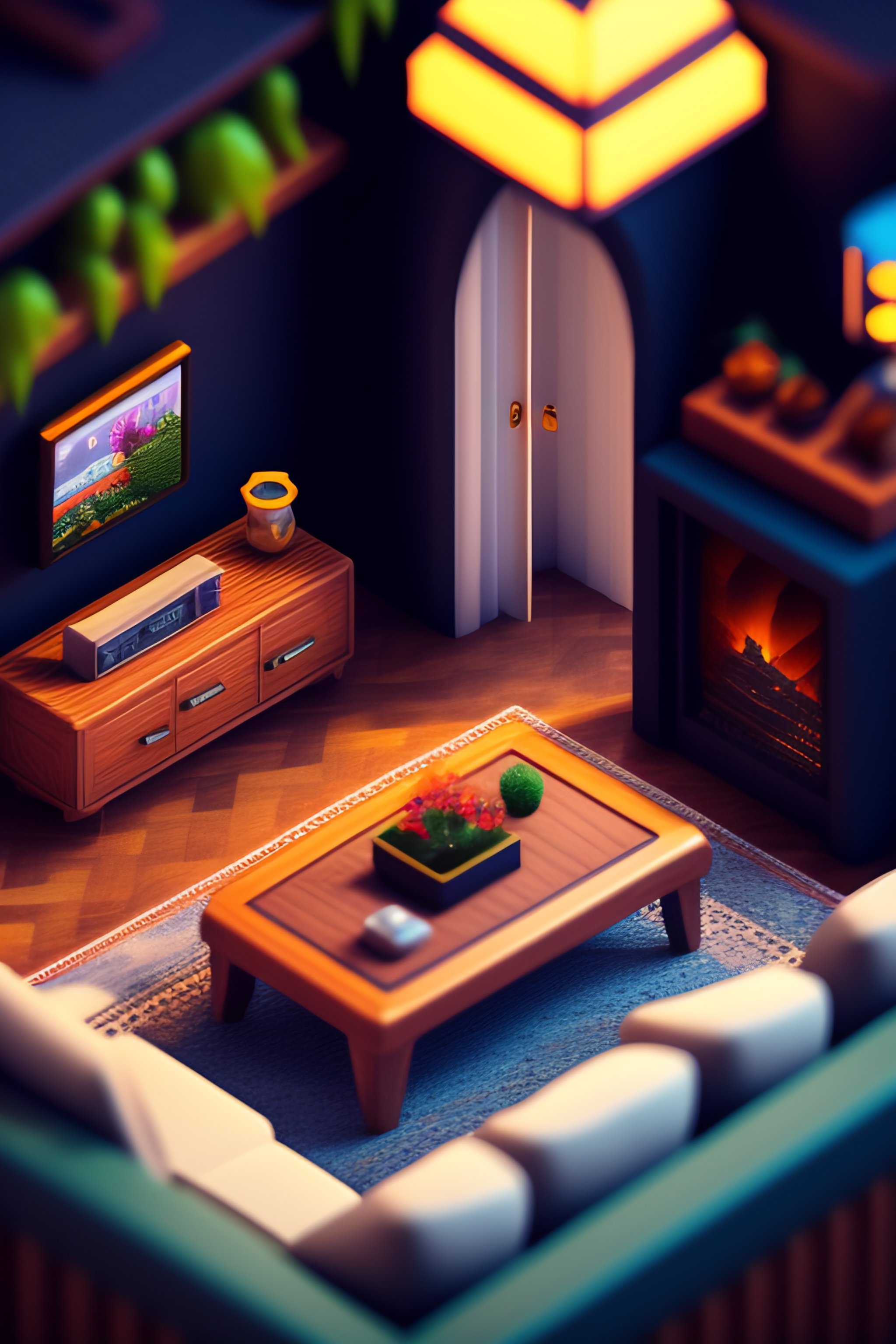 Detailed isometric living room, pixel art, unreal engine voxel render, video games, very cozy, nostalgia, boy in room in front of tv, art nouveau hyper realistic, ultra detailed, octane render, salvador dali style, ultra detailed, unreal engine voxel render