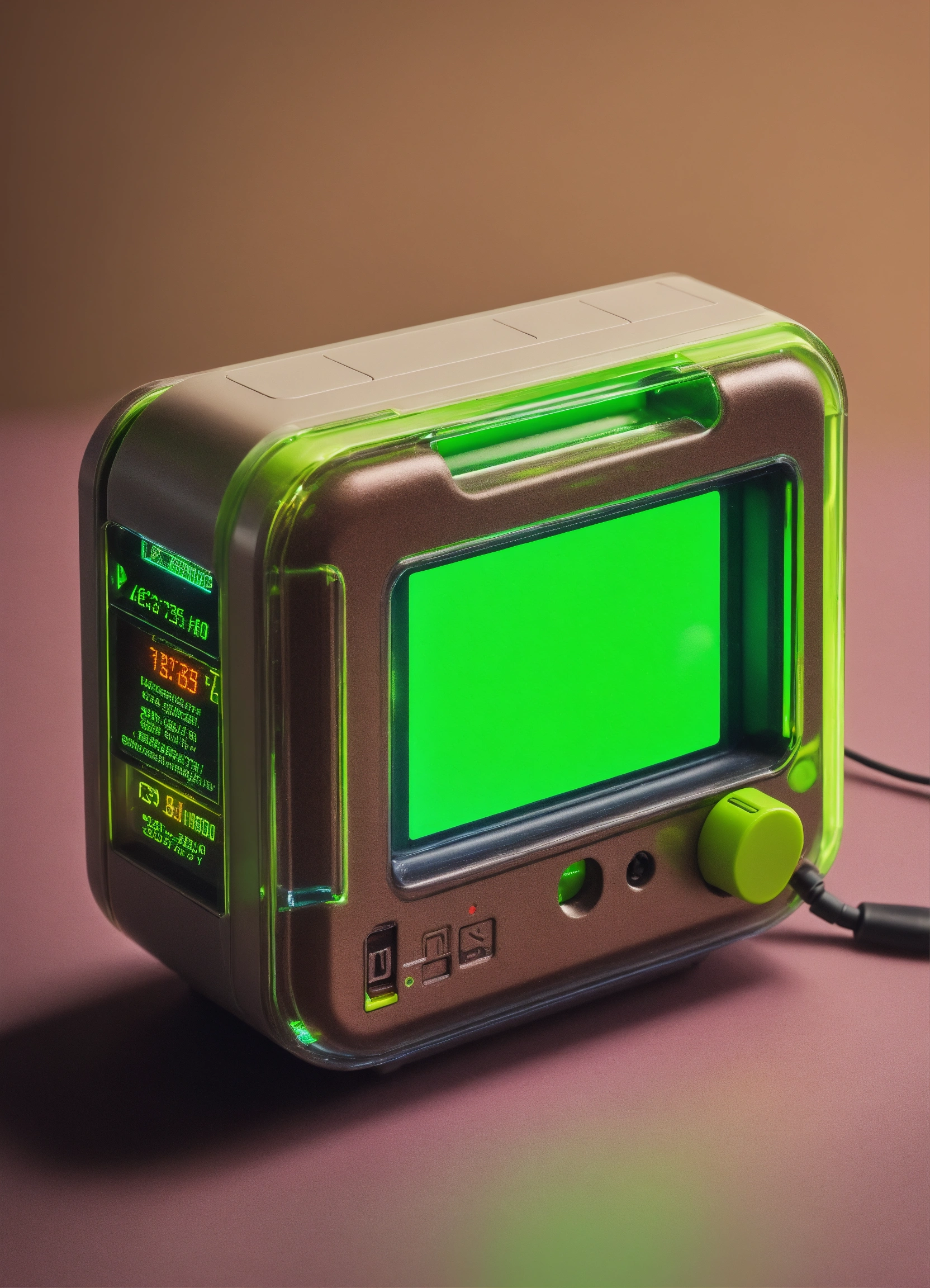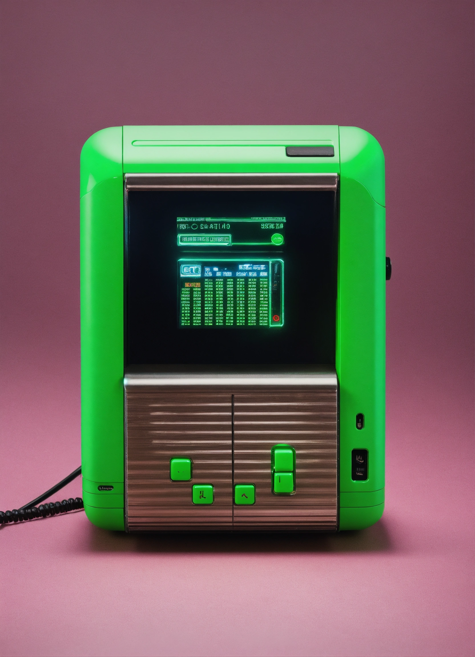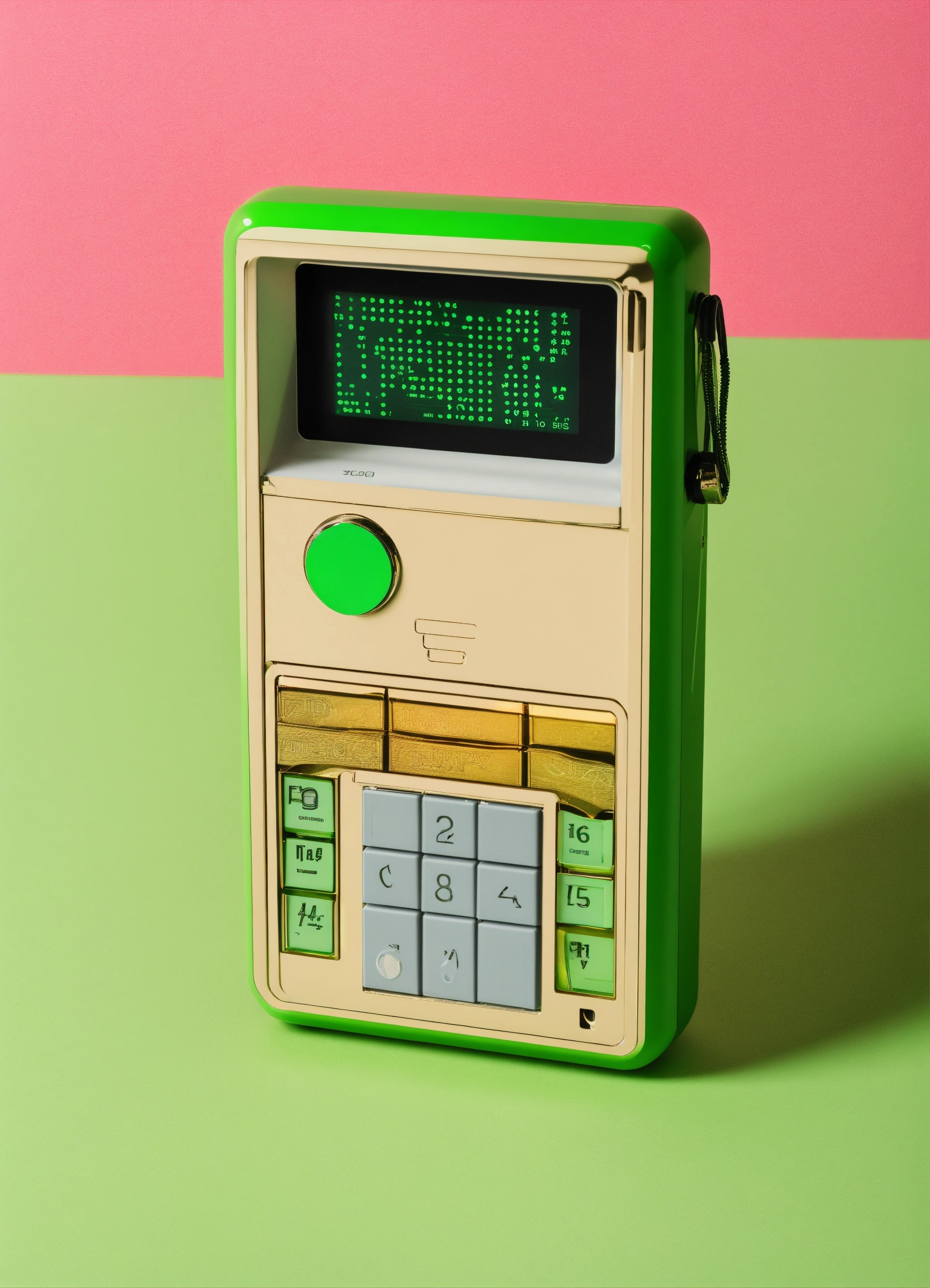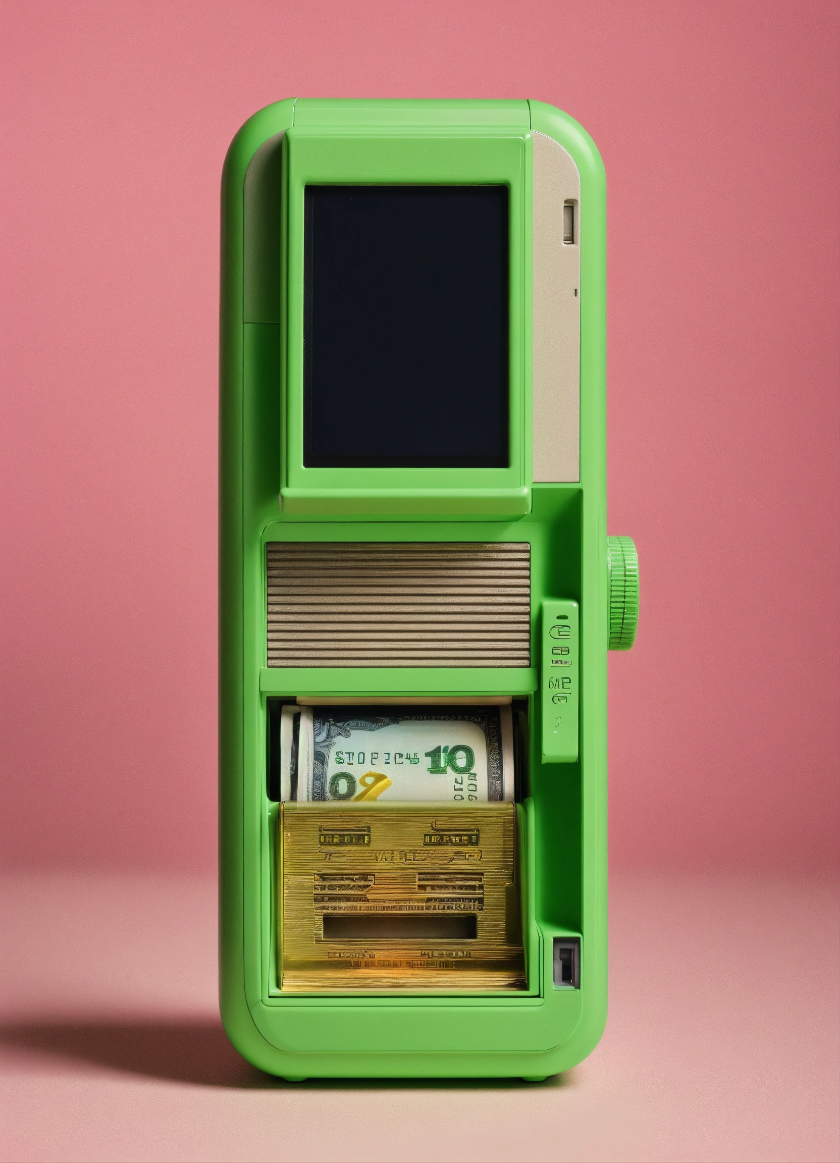 Retro futuristic very simple small compact device that accepts money and shows a digital screen that takes up the majority of the front, realistic, studio photography, neutral background, small pops of neon green