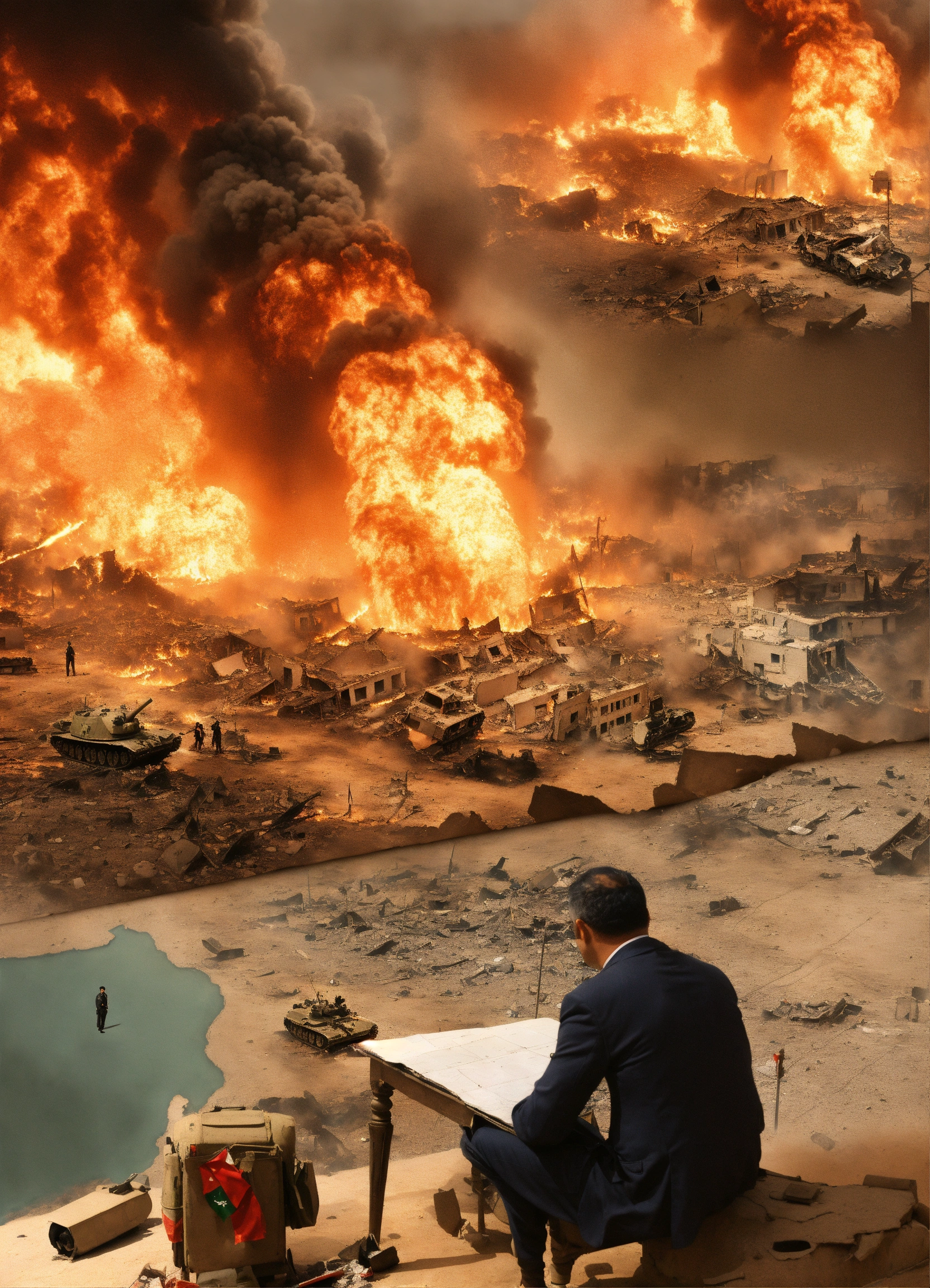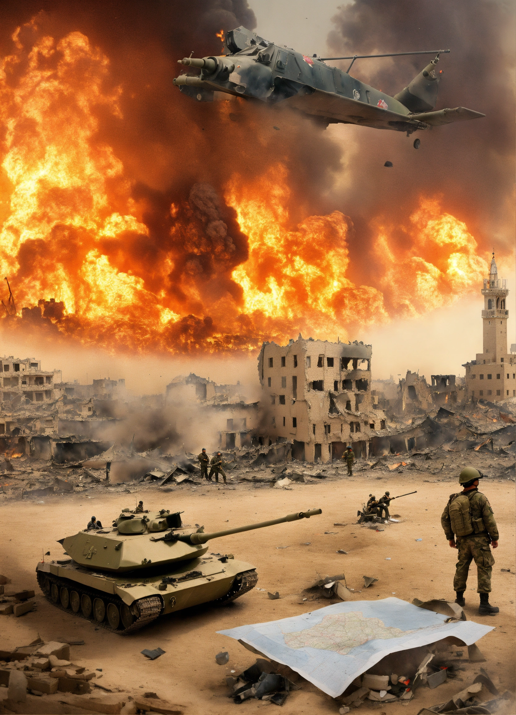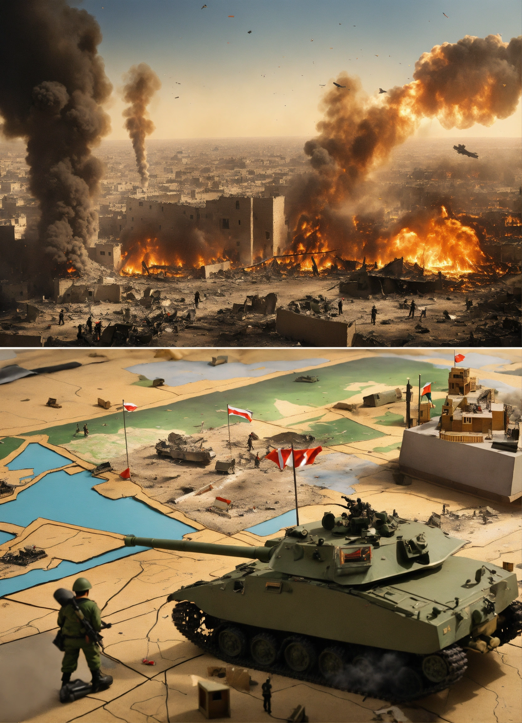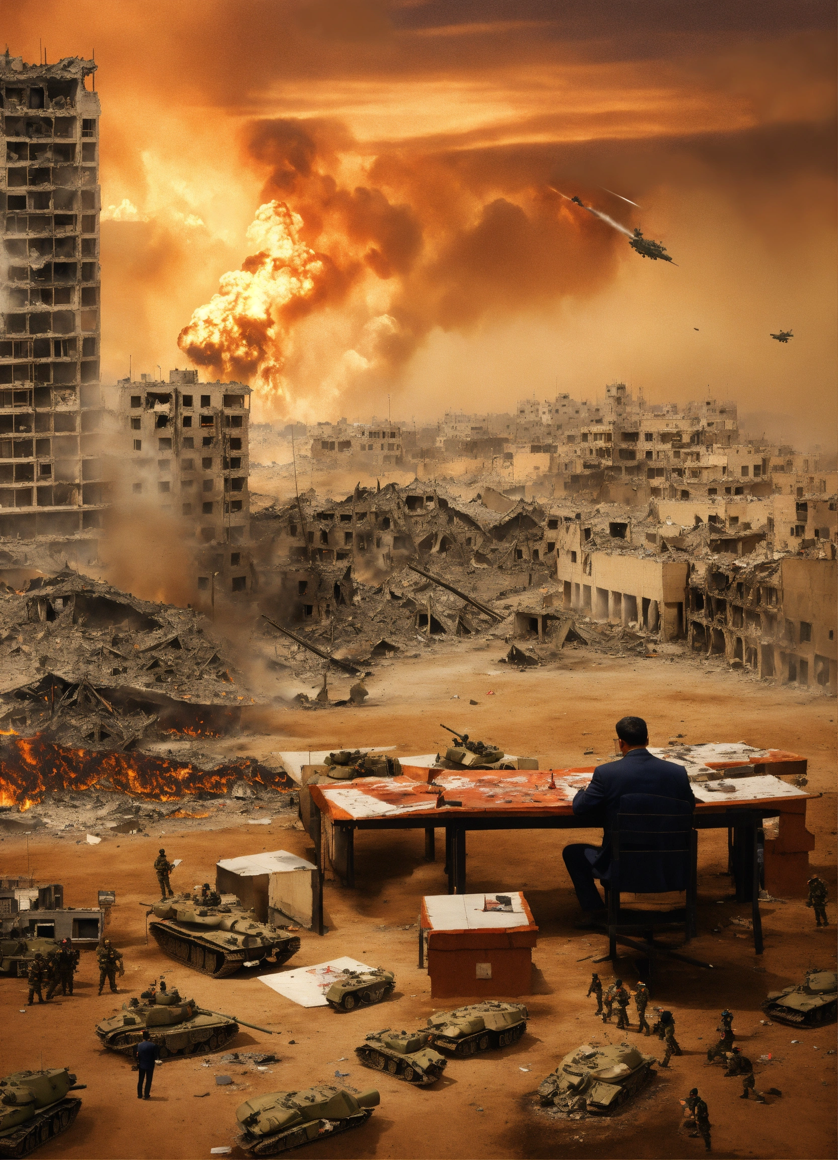 A collage artwork depicts the israeli bombardment of the palestinians in gaza does not represent any religion but is an extremism of the government. in the design, an official appears in the background sitting at a table planning. in front of a city map that shows mockups of collapsed buildings, fires, models of tanks, soldiers, and military vehicles, resembling toy pieces scattered on the map.