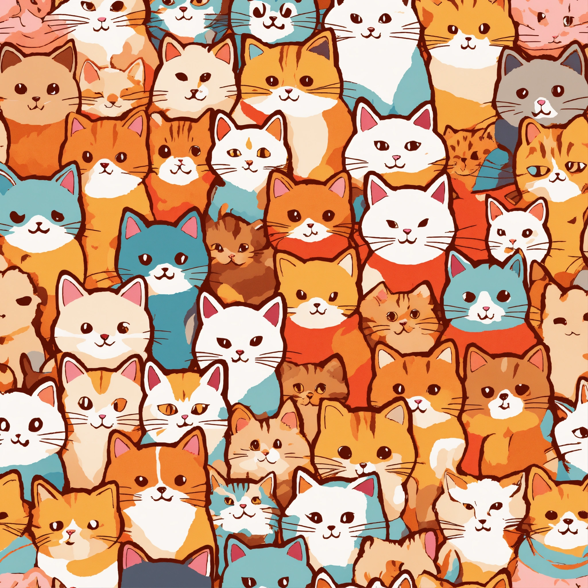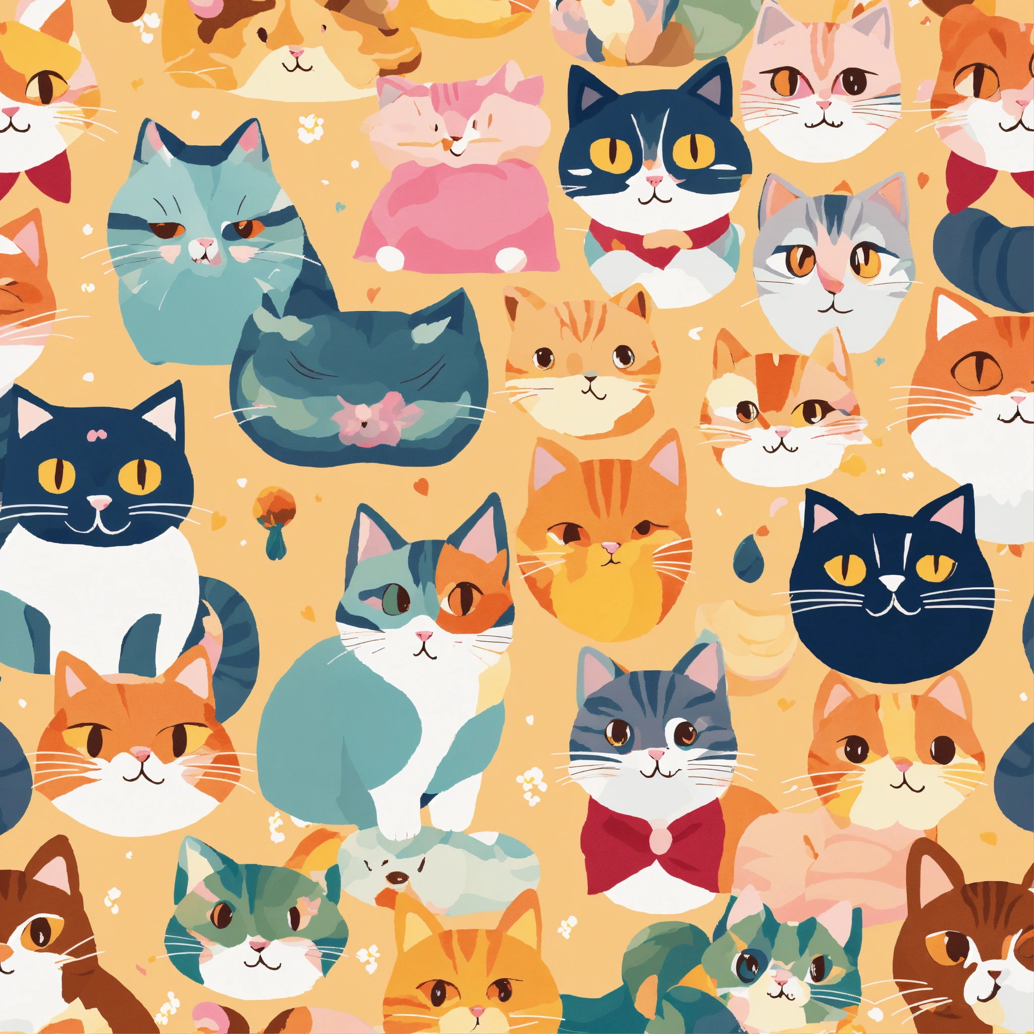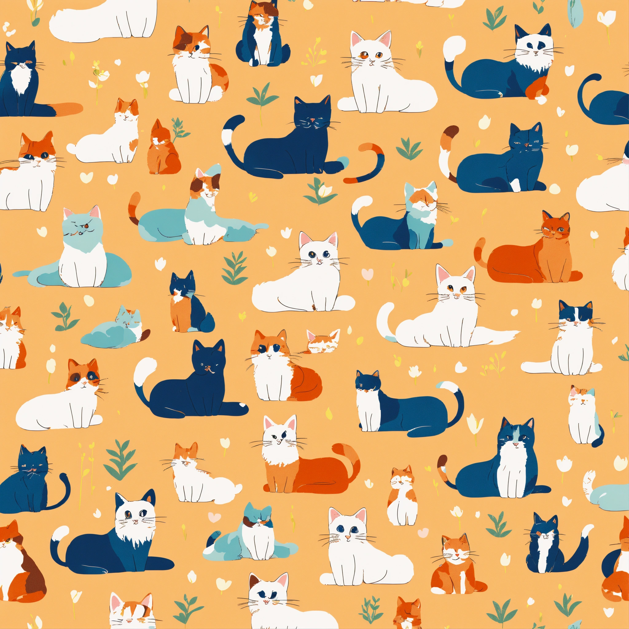 Seamless patterns of kawaii cats, repeating patterns design, fabric art, flat illustration, highly detailed clean, vector image, photorealistic masterpiece, professional photography, simple field background, isometric, bright vector