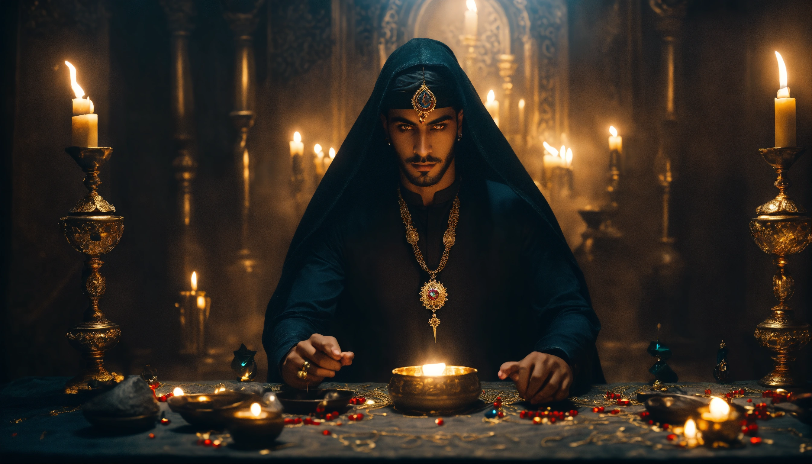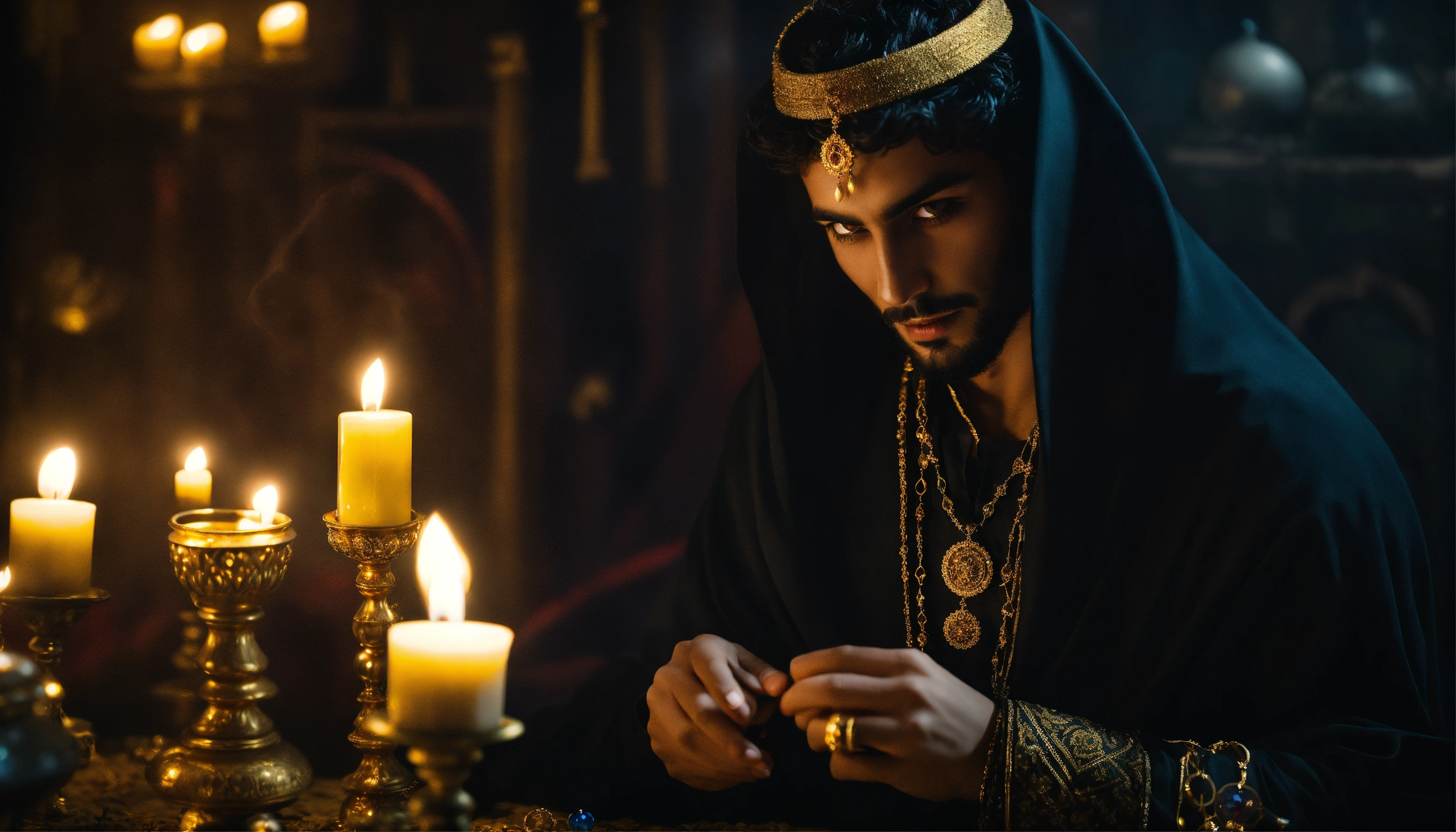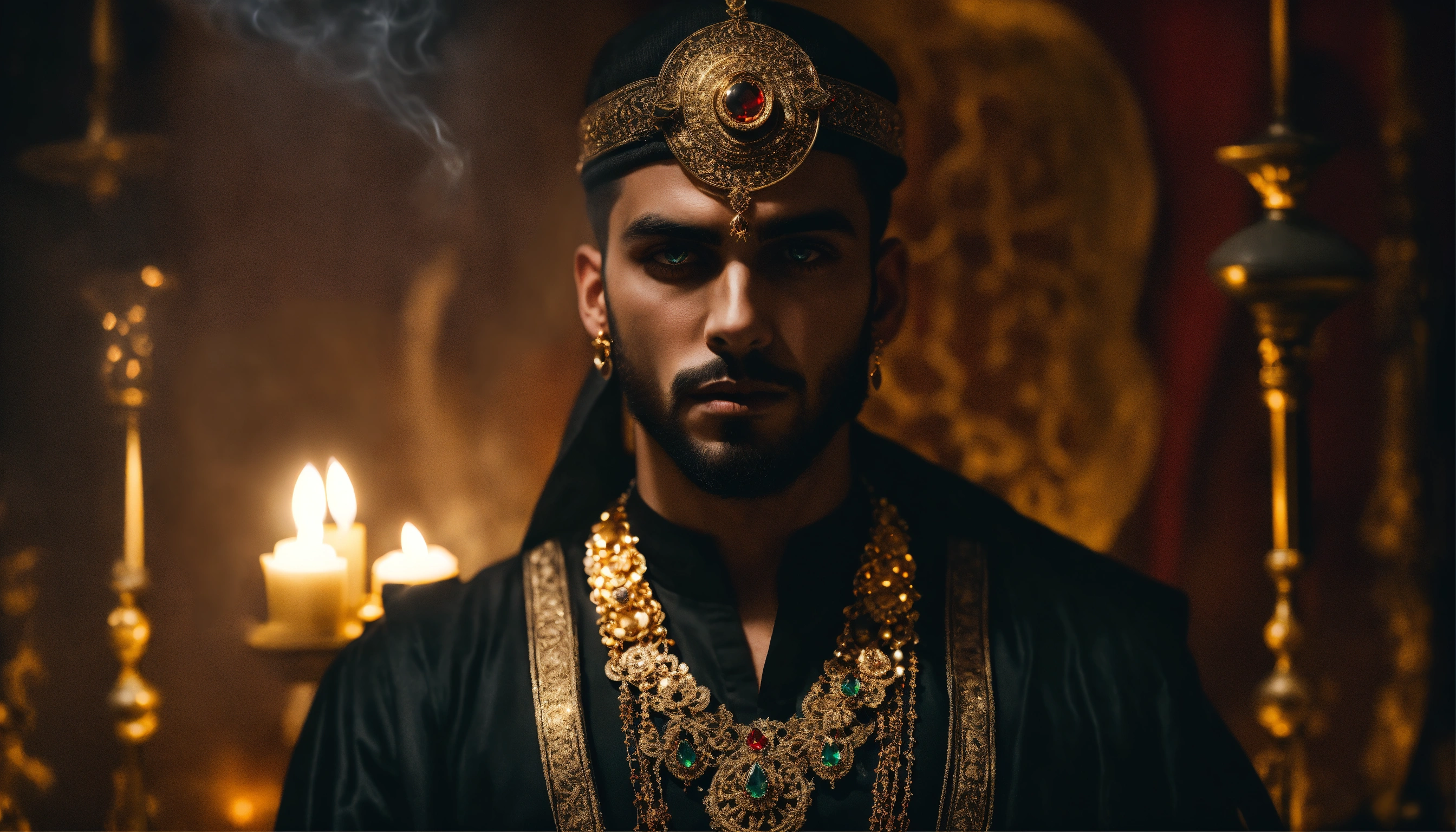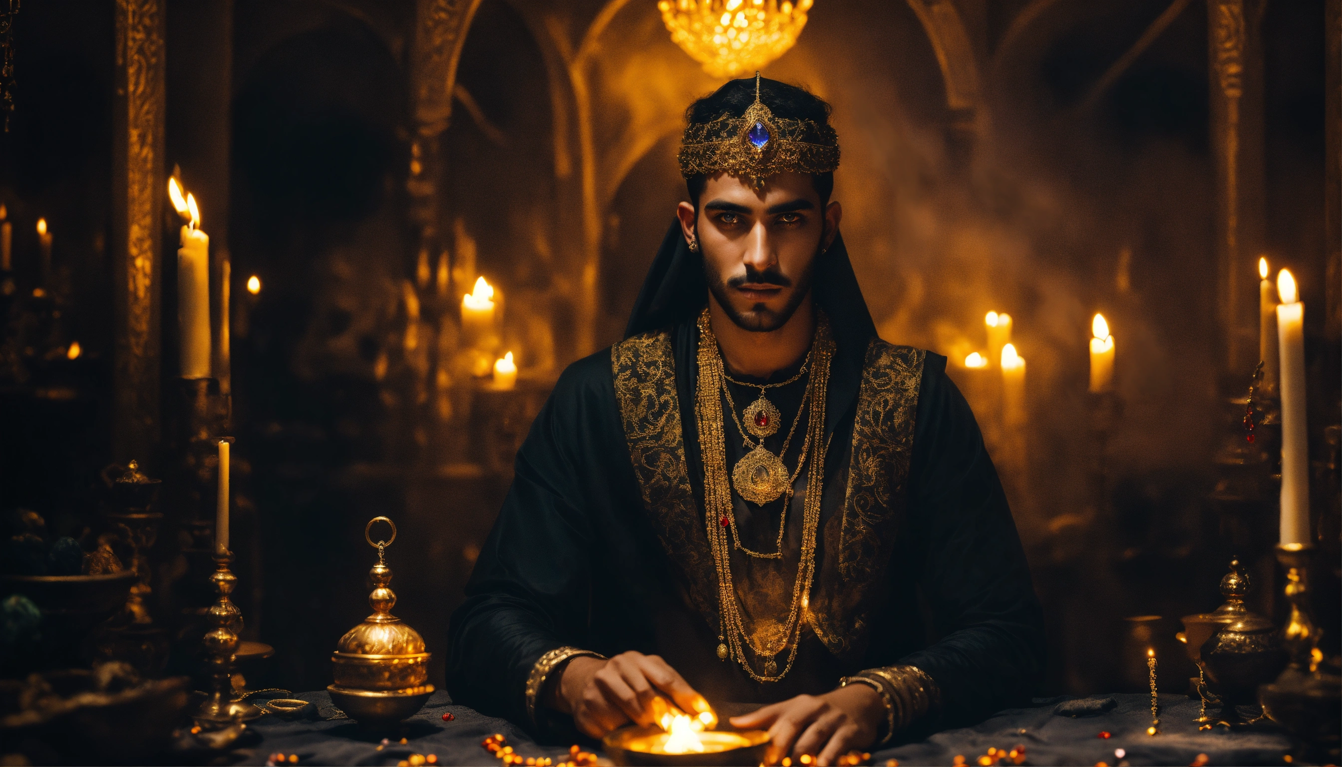 Dark, mysterious and dramatic portrait of a young handsome arabic diabolical sorcerer with hypnotic glowing eyes wearing dark mystical clothes and gold jewellery with enchanted gemstones performing a ritual in a smokey secret occult chamber