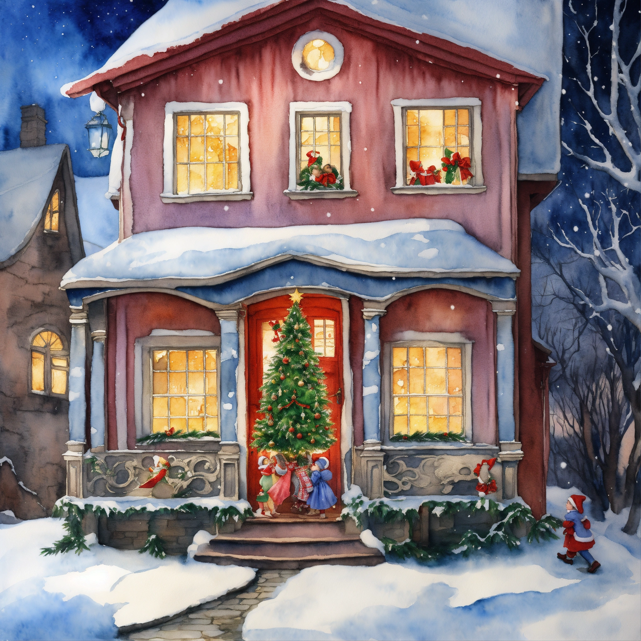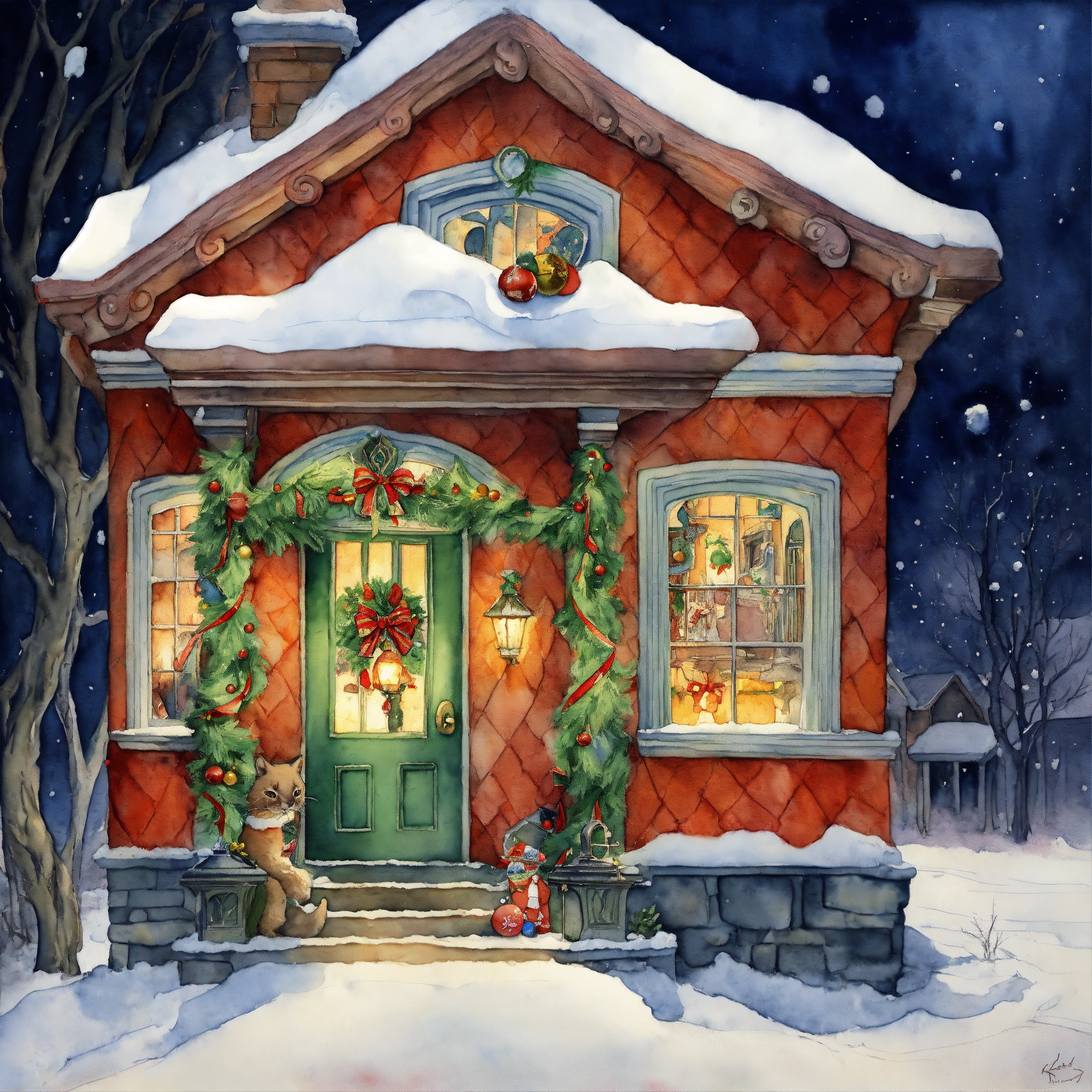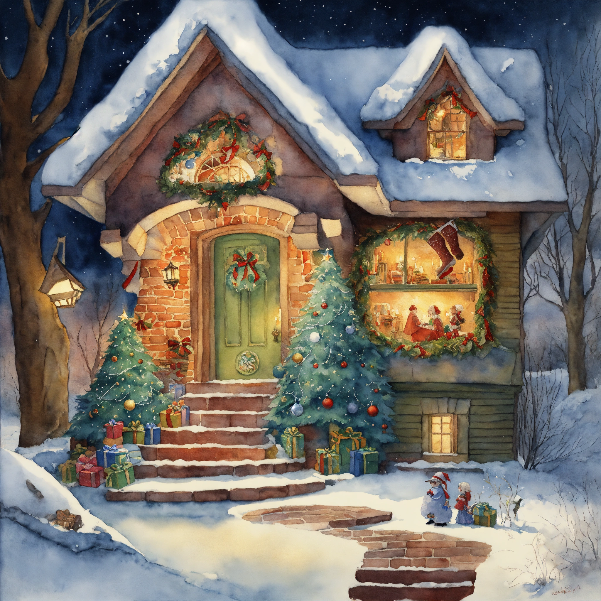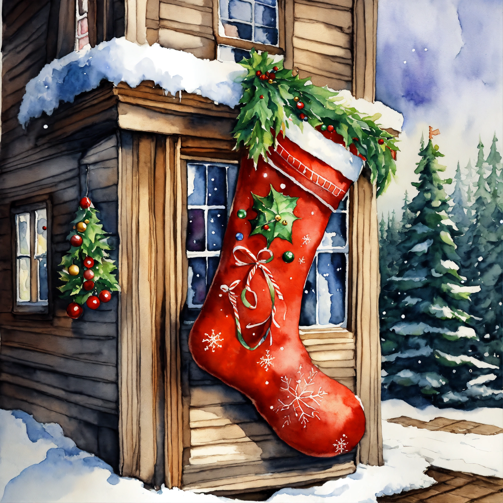A watercolor painting depicting an intricately detailed quirky christmas stocking coming out of a house, applying artistry reminiscent of such masters as cicely mary barker, h. r. giger, and beksiński. the stocking should have pointed toes with jingle bells on should tell a different aspect of an enchanting kid's story a snowy wonderland