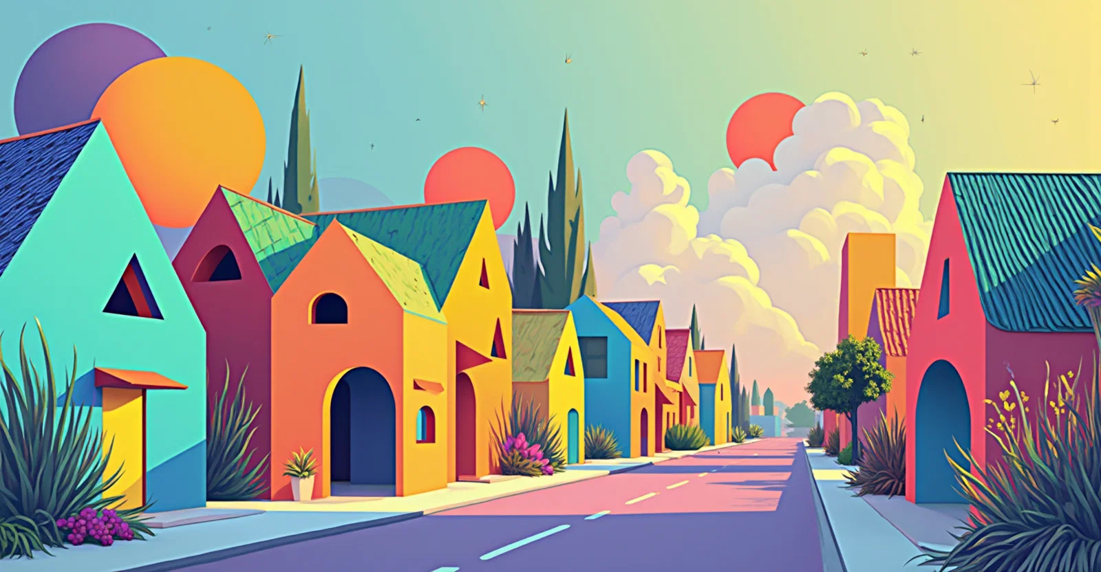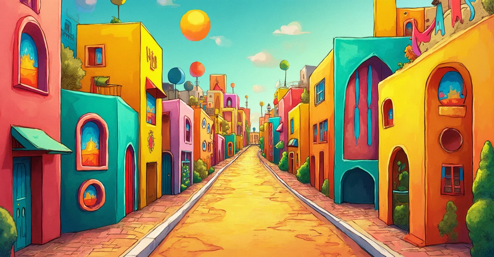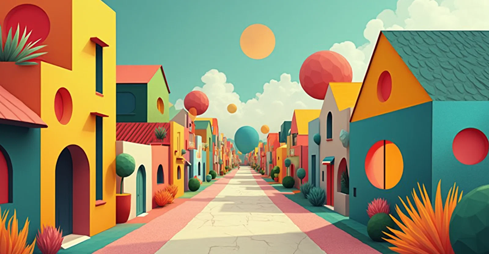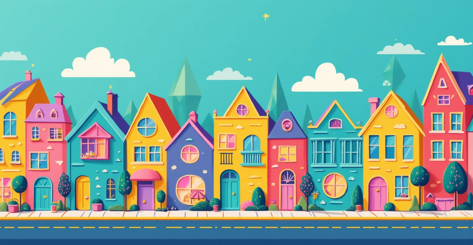 Front view of a street with buildings and houses whose fronts are triangles, quadrilaterals and circles. all flat, no 3d. very colorful.
