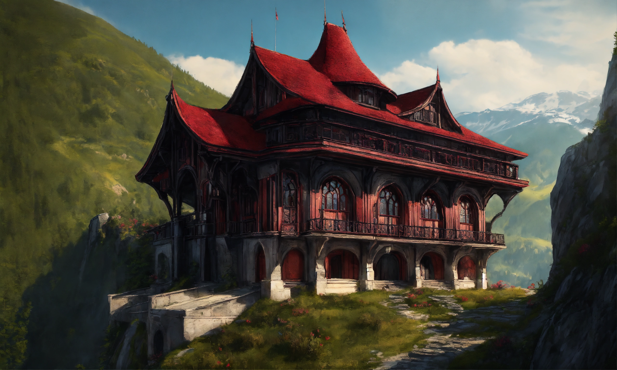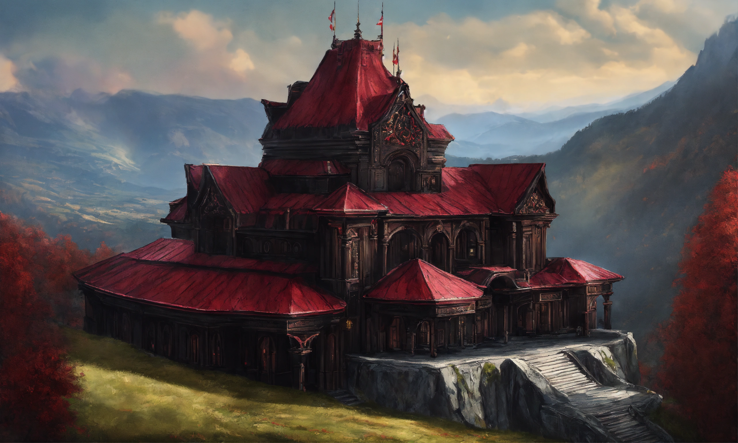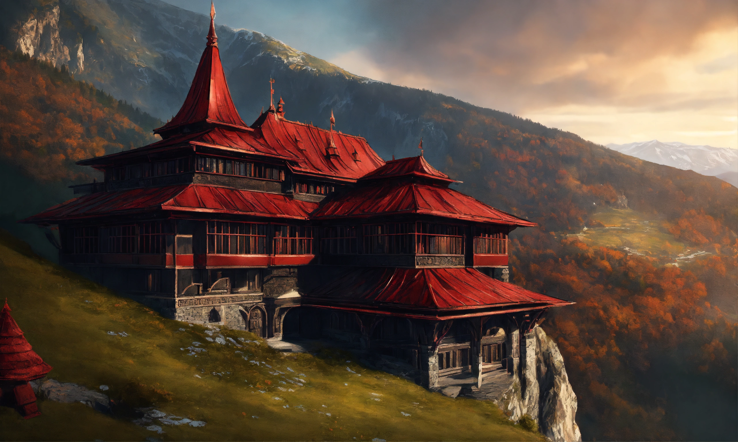 Drawing of an elegant high elf sci fi black palace with a crimson roof built into a mountainside in romania, elf architecture, beautiful day, immensely detailed, high definition