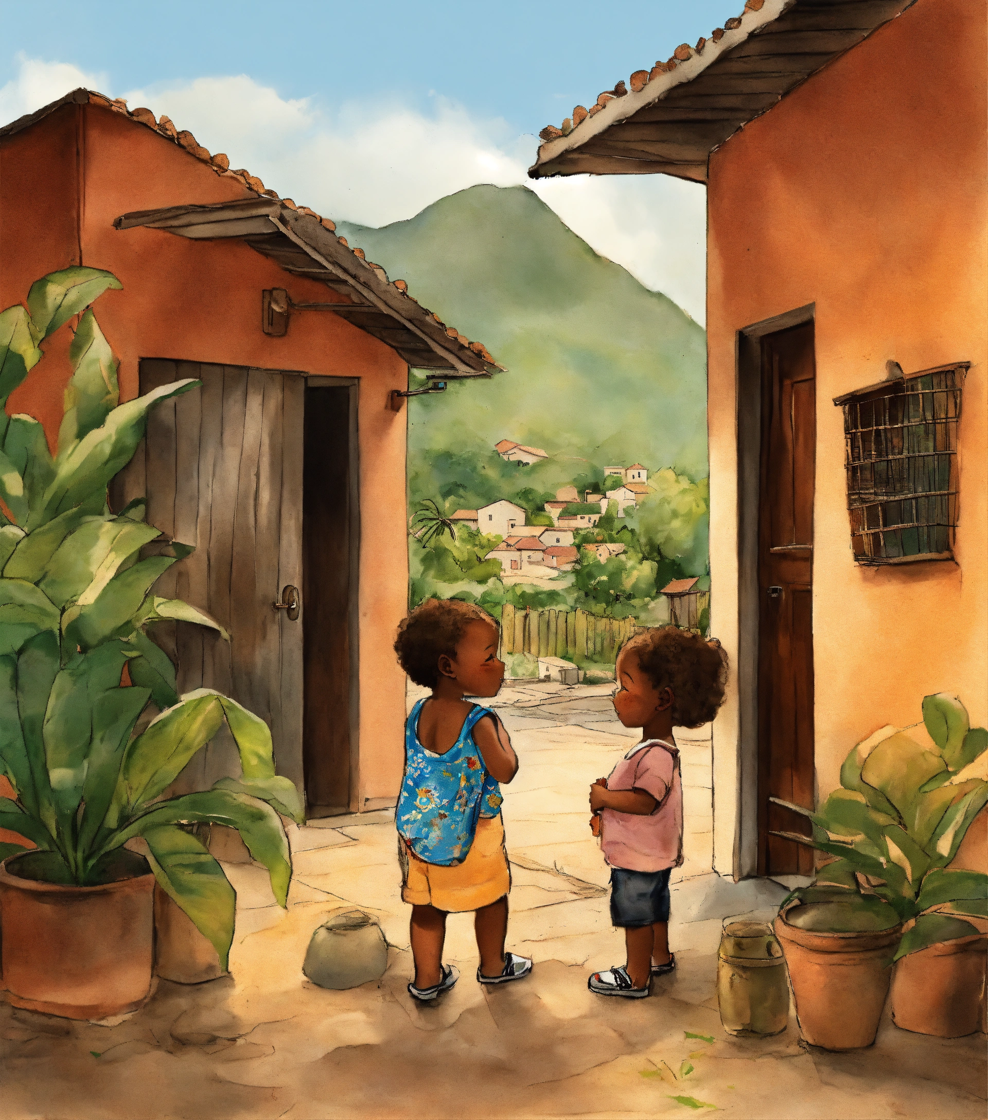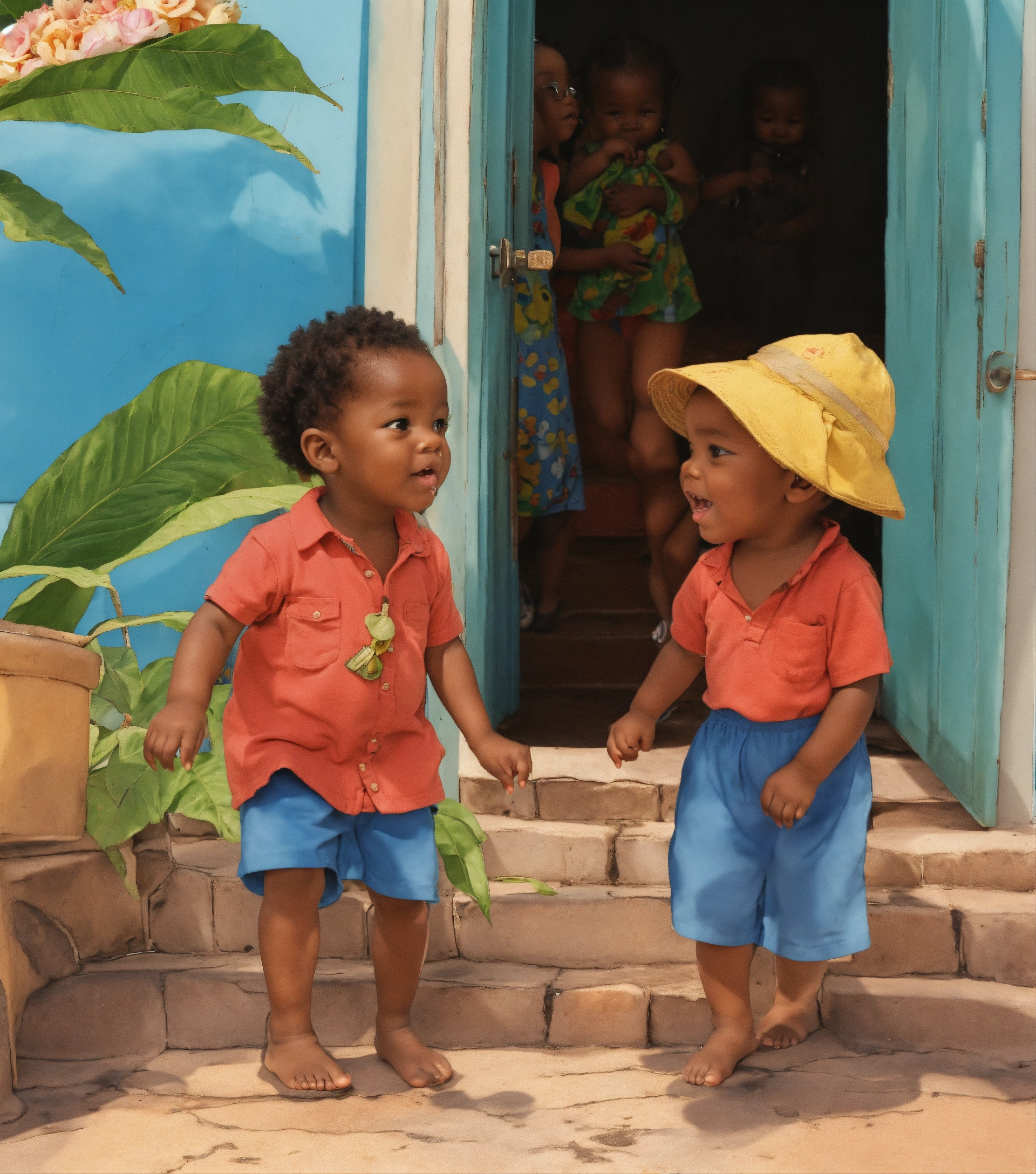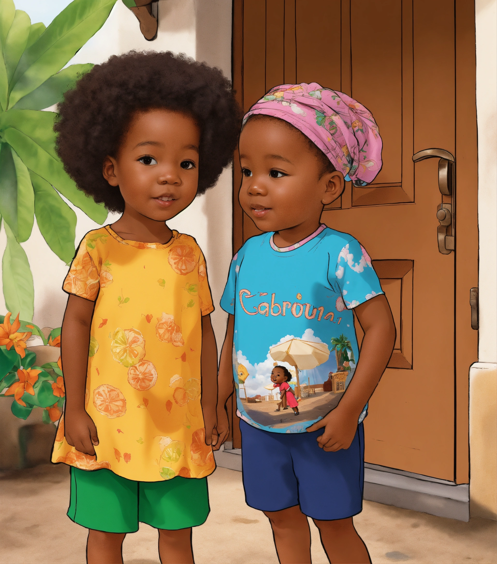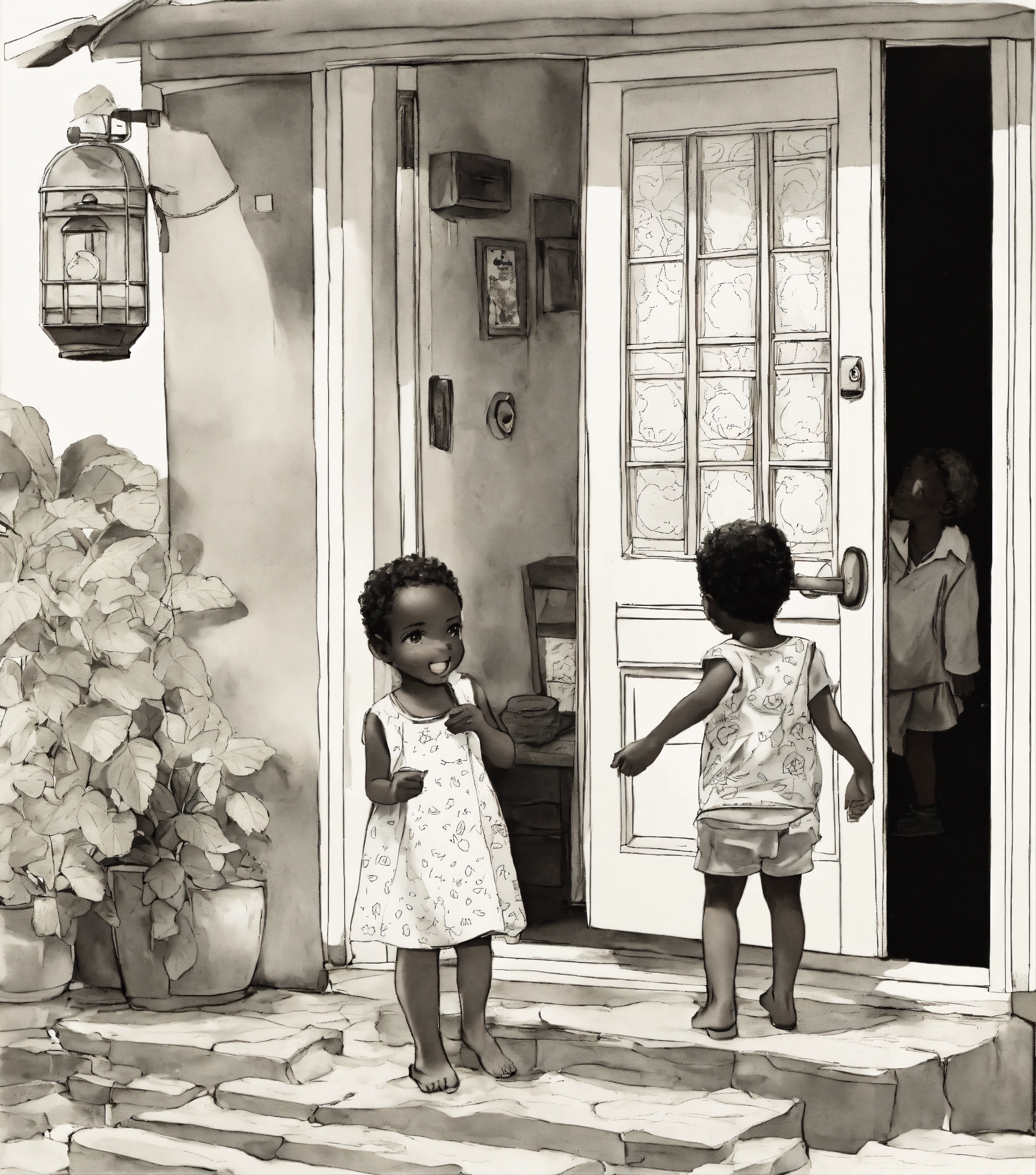A cartoon of two 3-year-old caribbean cousins in montserrat who decide to visit grandma. they knocked on grandma's door because they knew that they had a little cousin, three, a 3-year-old cousin, visiting from england for the very first time. they could smell the aroma of grandma's fried dumplings.