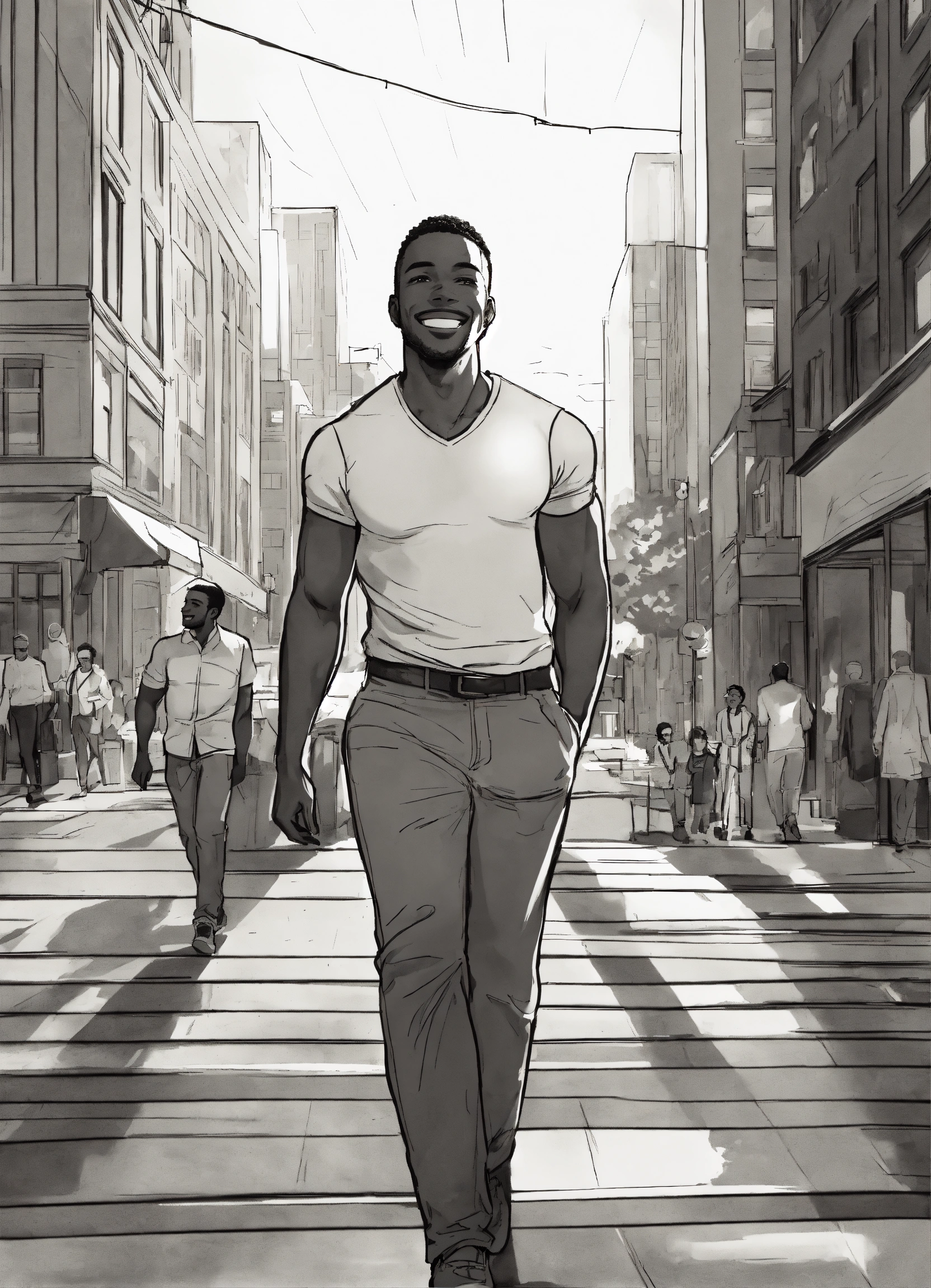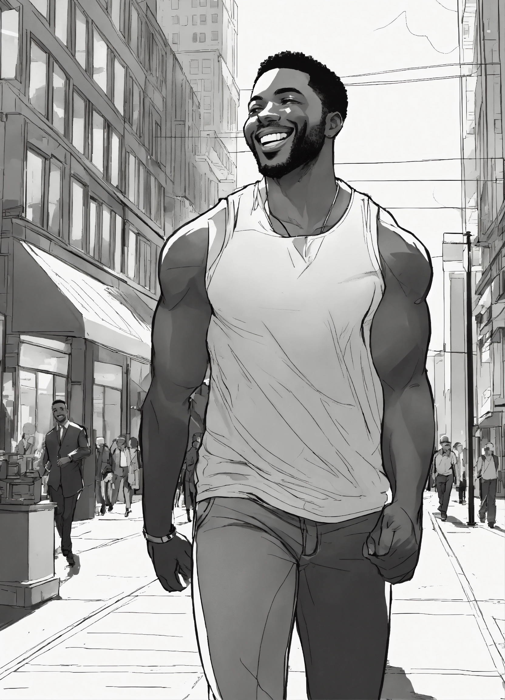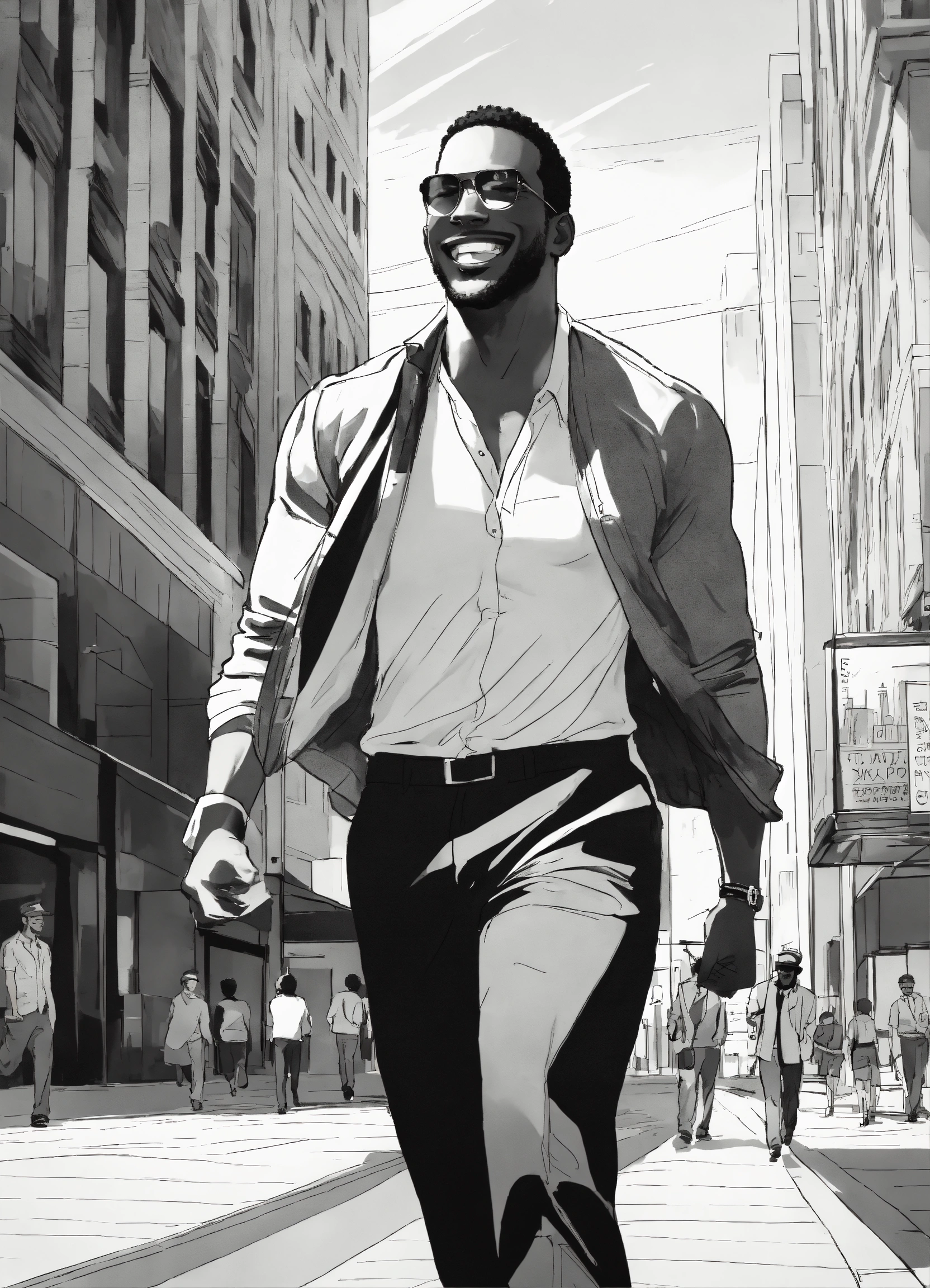 A black and white illustration of black man walking downtown, smiling masculine, happy, with short hair and small muscles, sun shining in background
