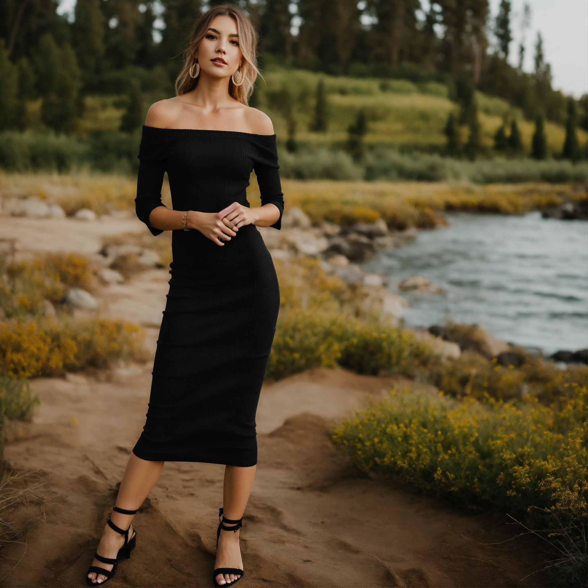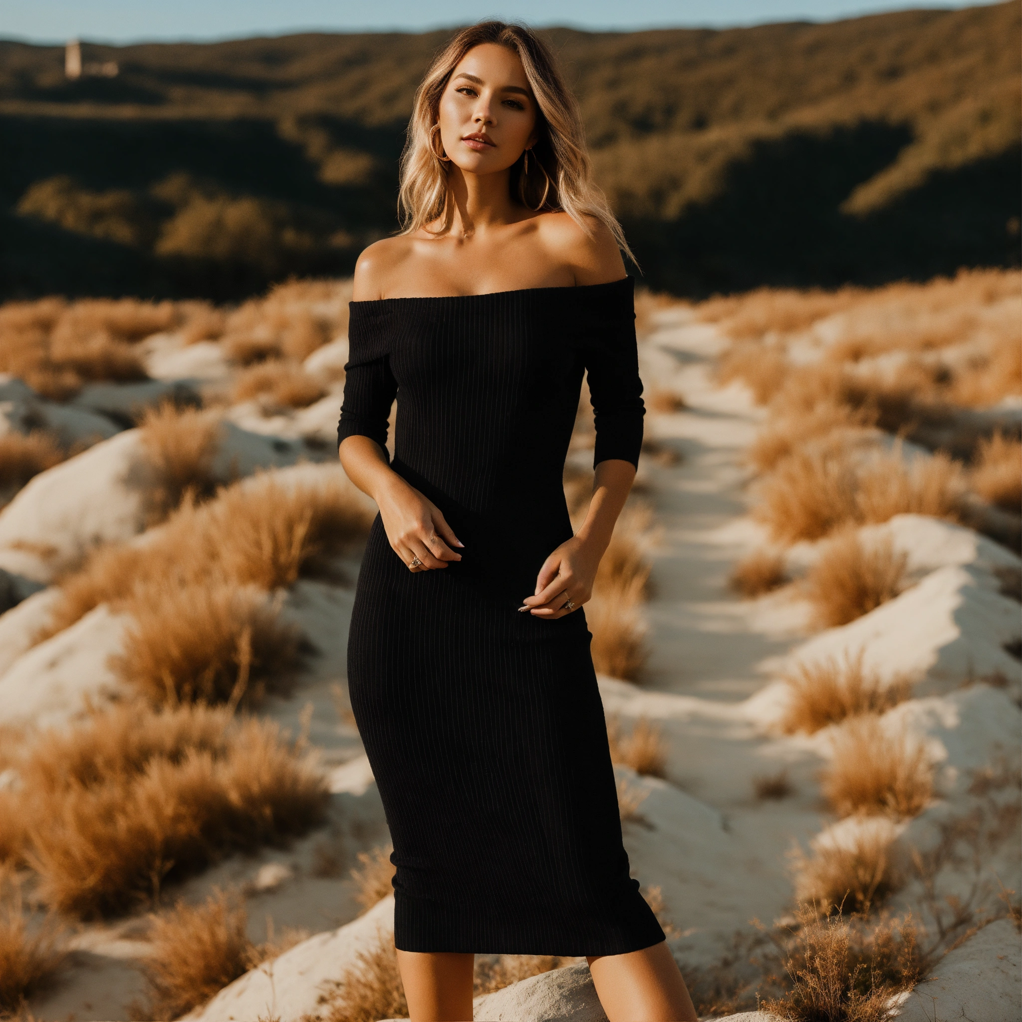 Caucasian woman wearing fitted ribbed black off the shoulder midi dress with elbow-length sleeves for a free people photoshoot