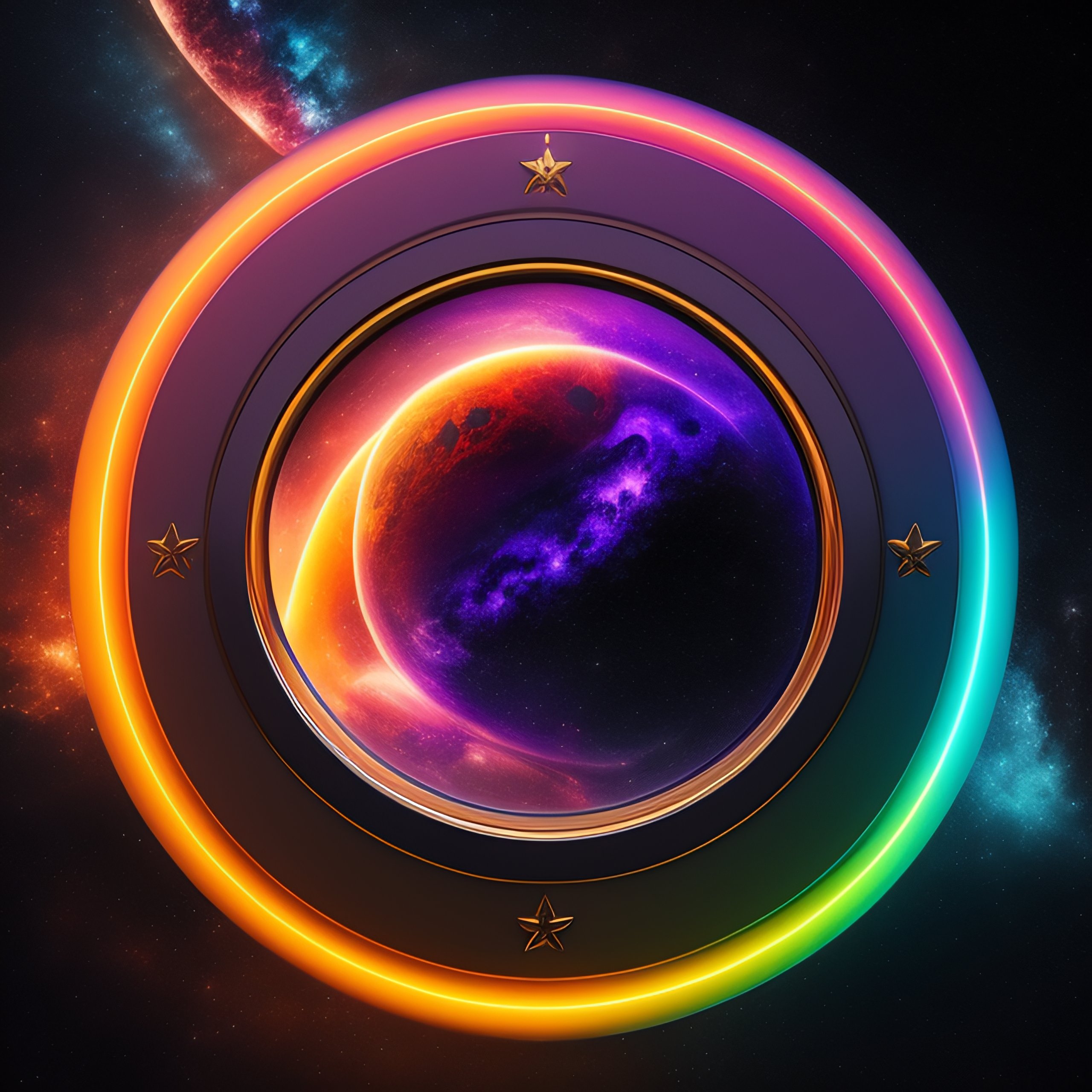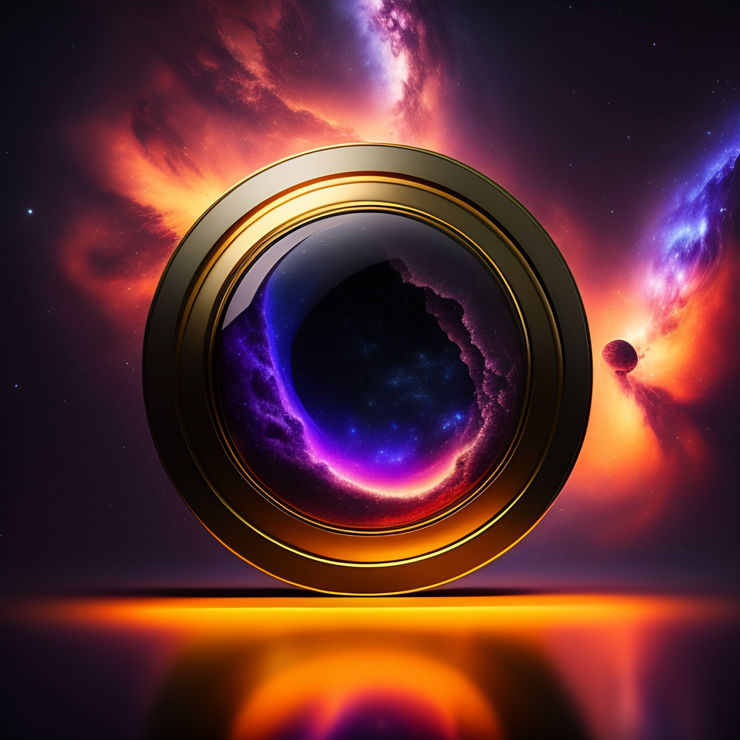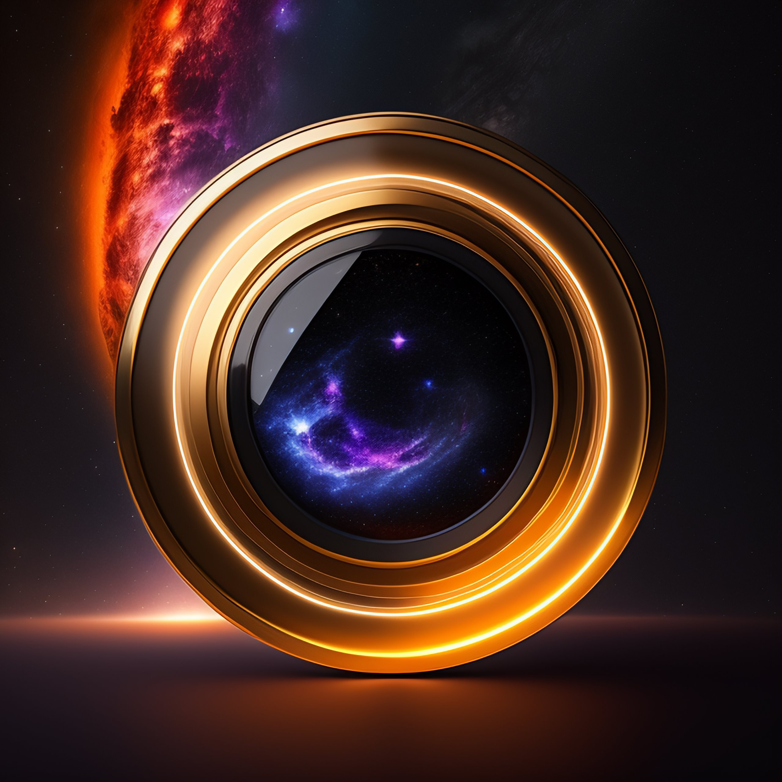 A coin which have functions like lighting on it and inside is universe, premium product, 8k, redshift, abstract neon galaxy background, clear photo background