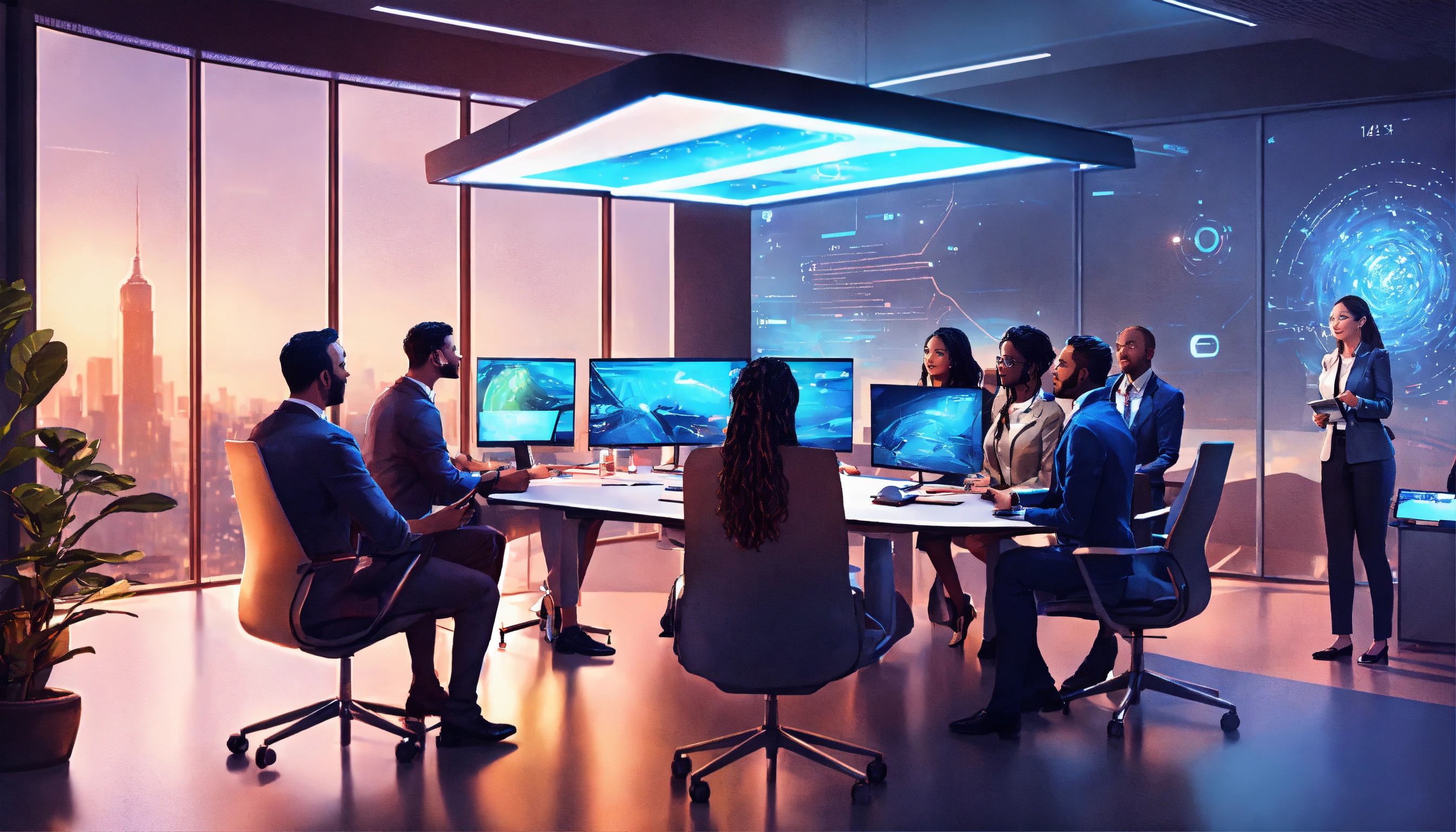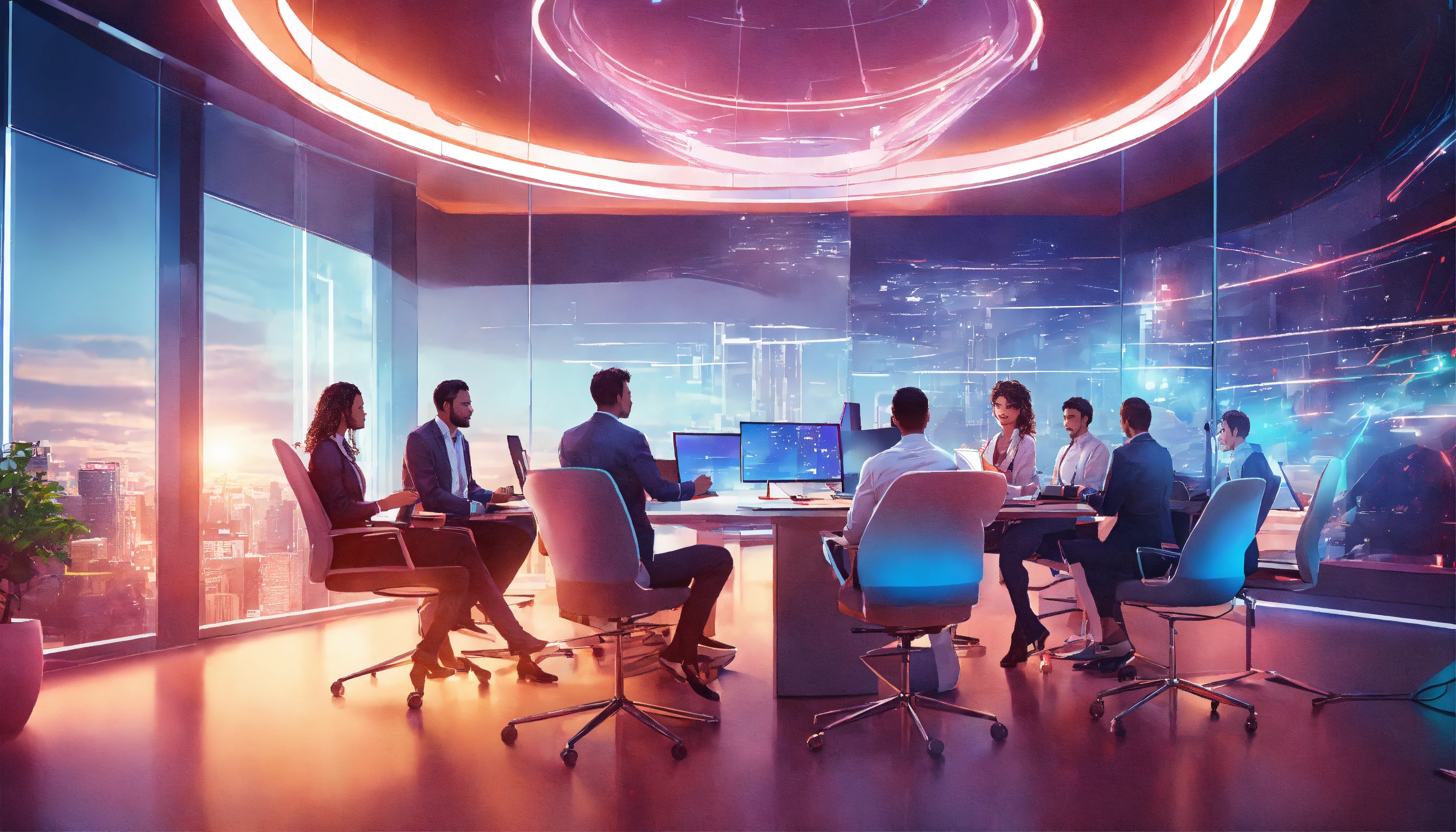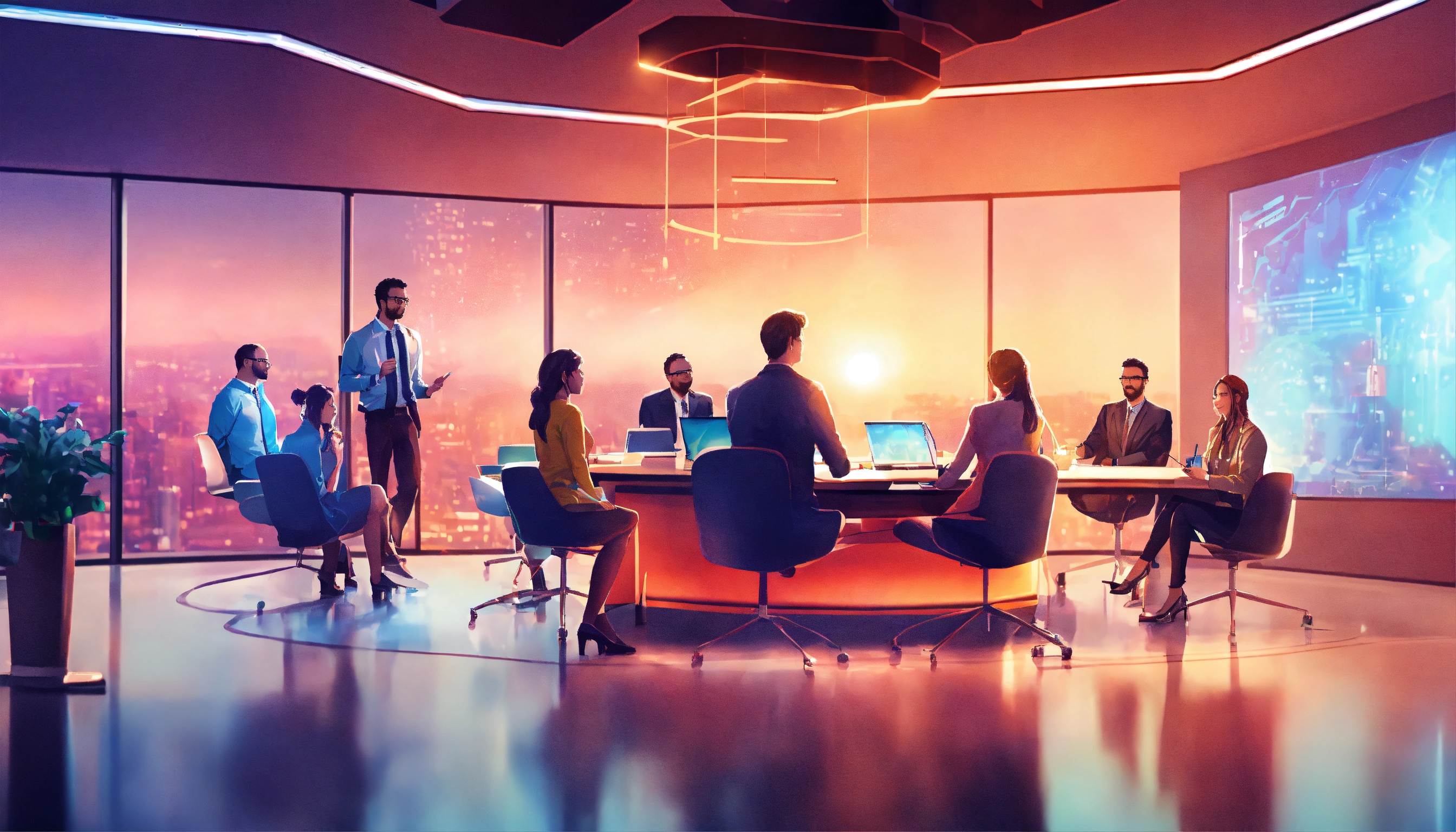 A team of professionals engaged in a lively discussion in a futuristic, well-lit office conference room, style realistic digital illustrations, modern office.