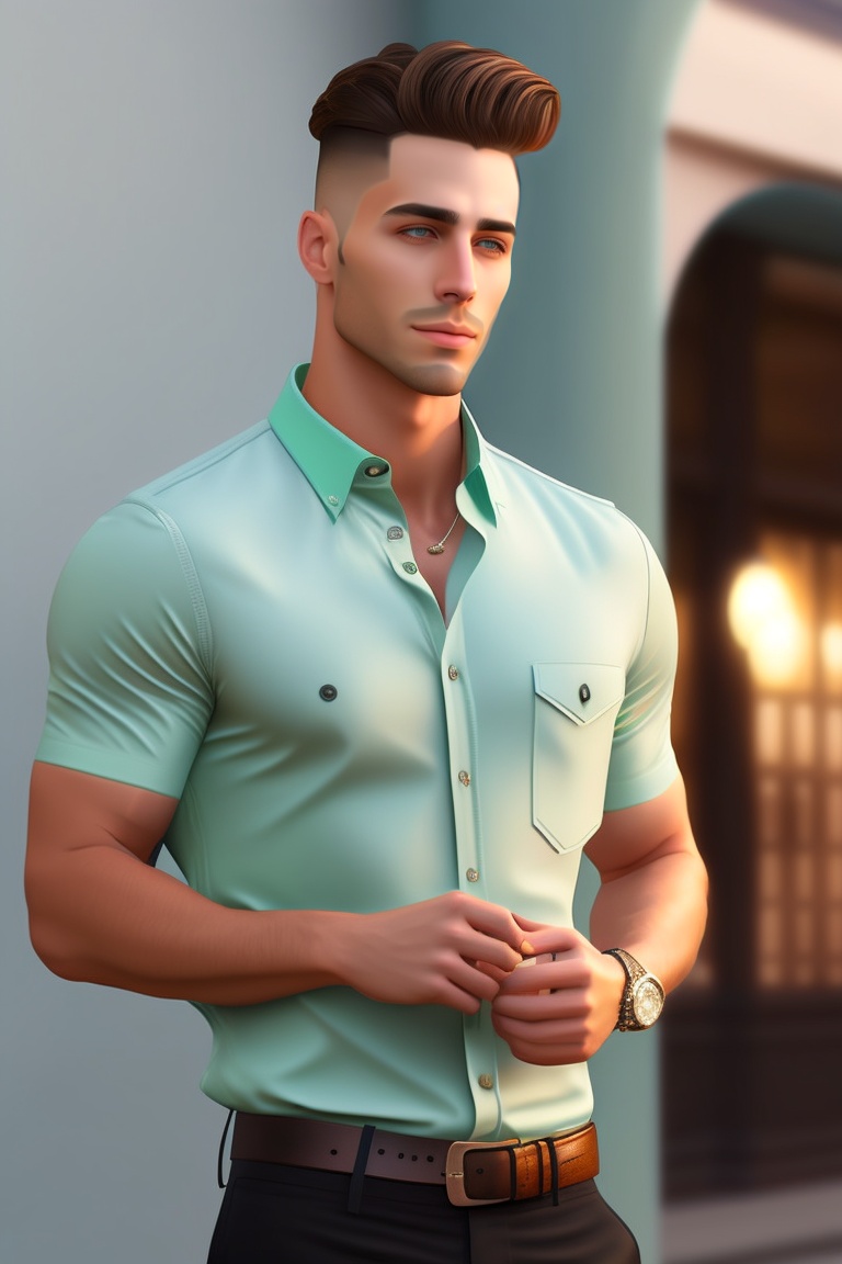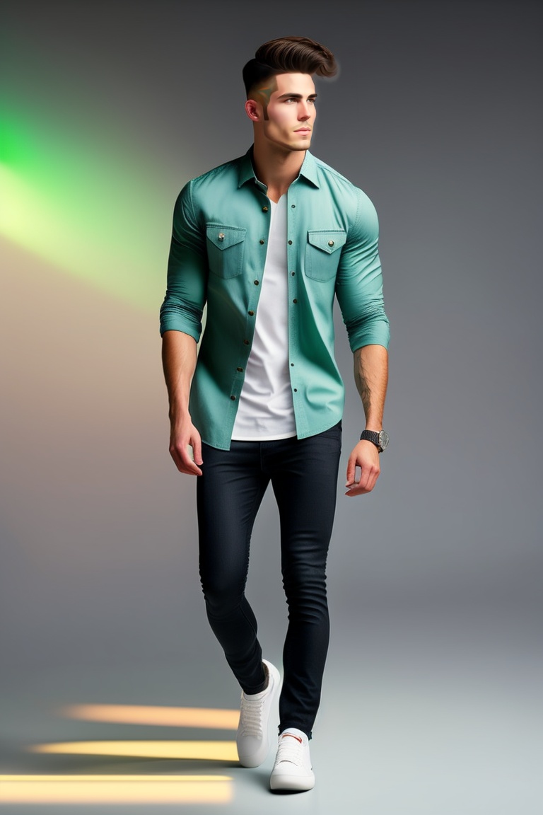 A handsome jewish guy wearing a mint green button up shirt. and black jeans, and sneakers with white soles