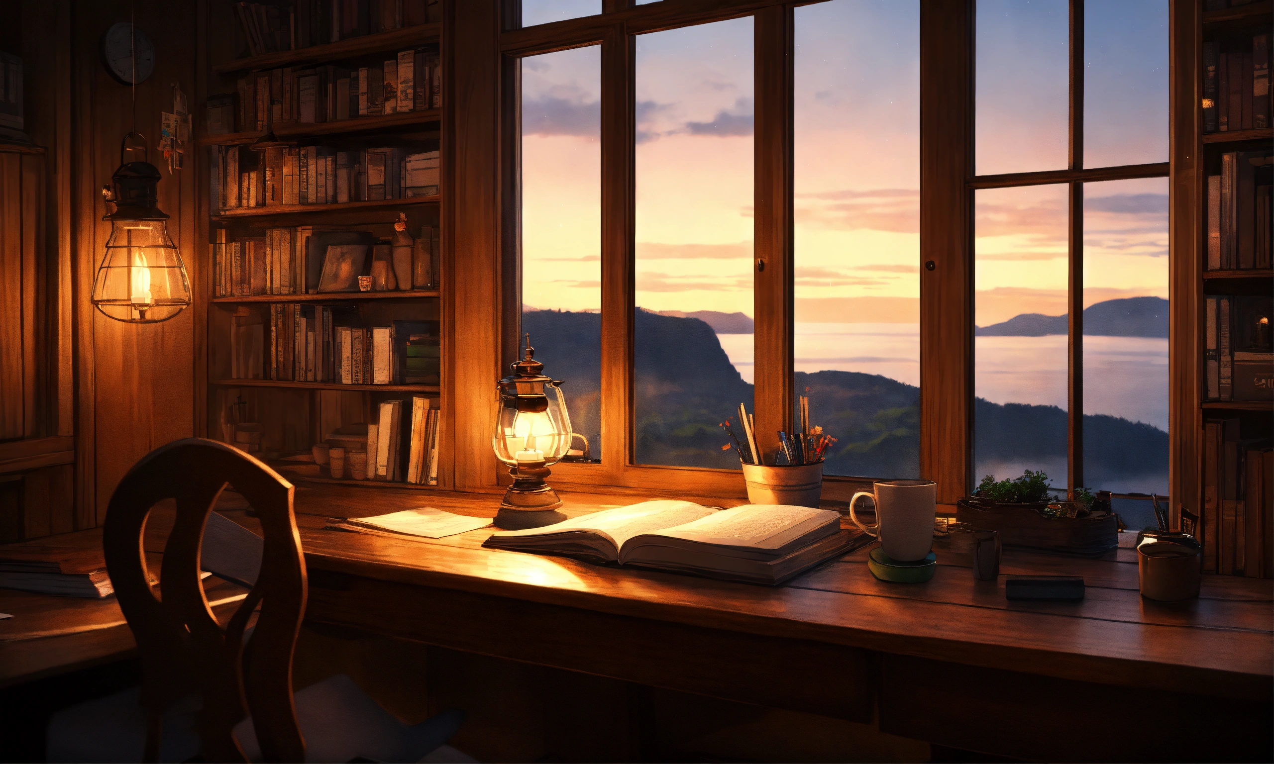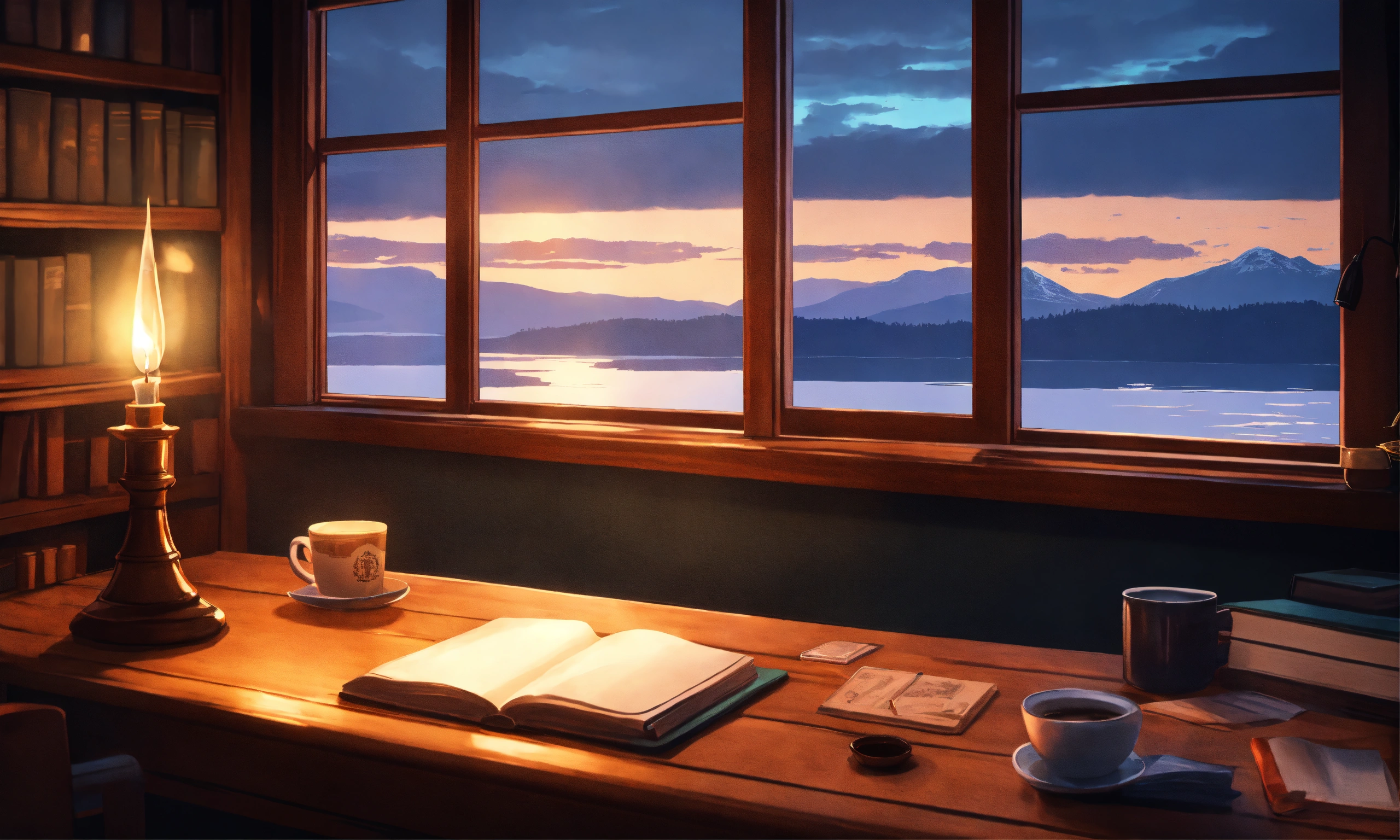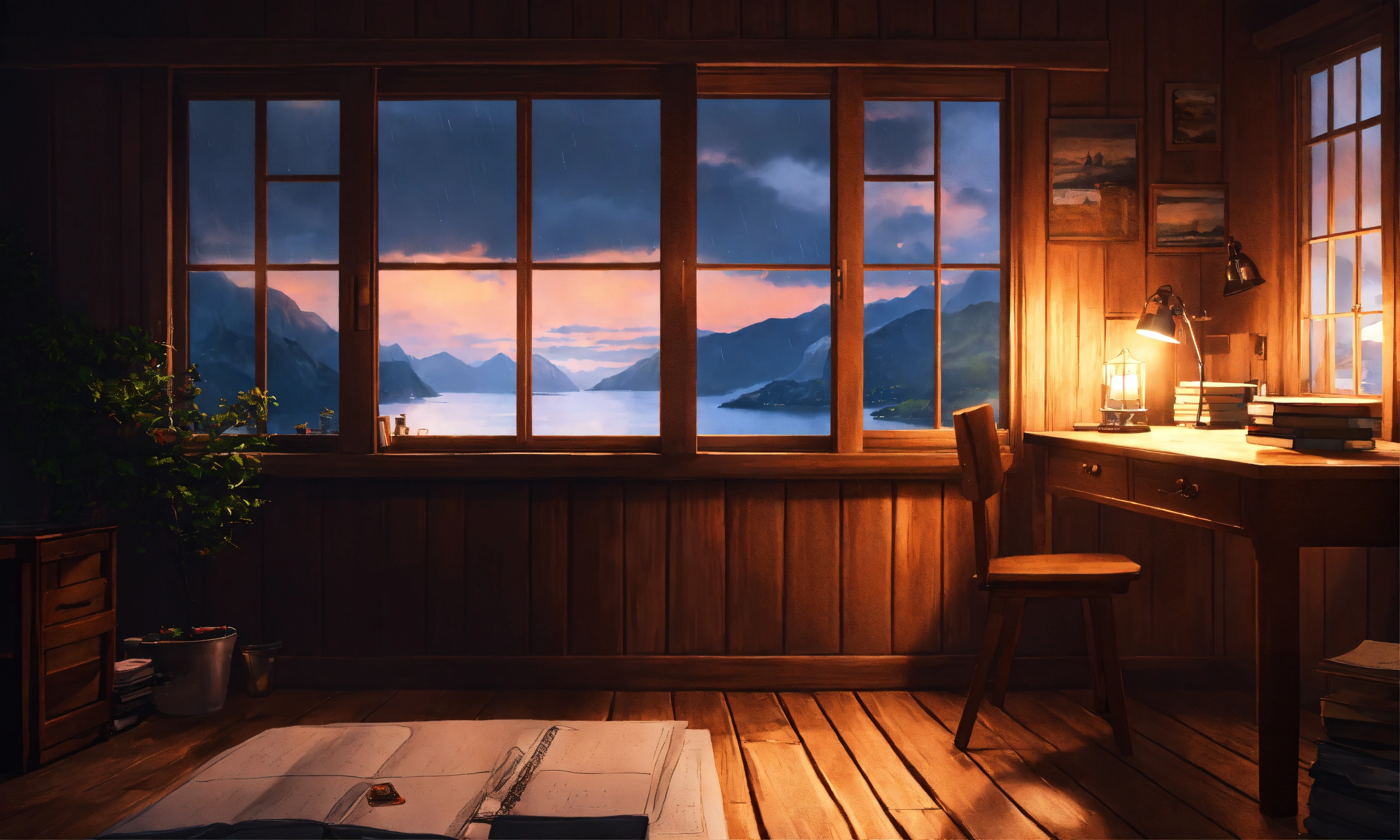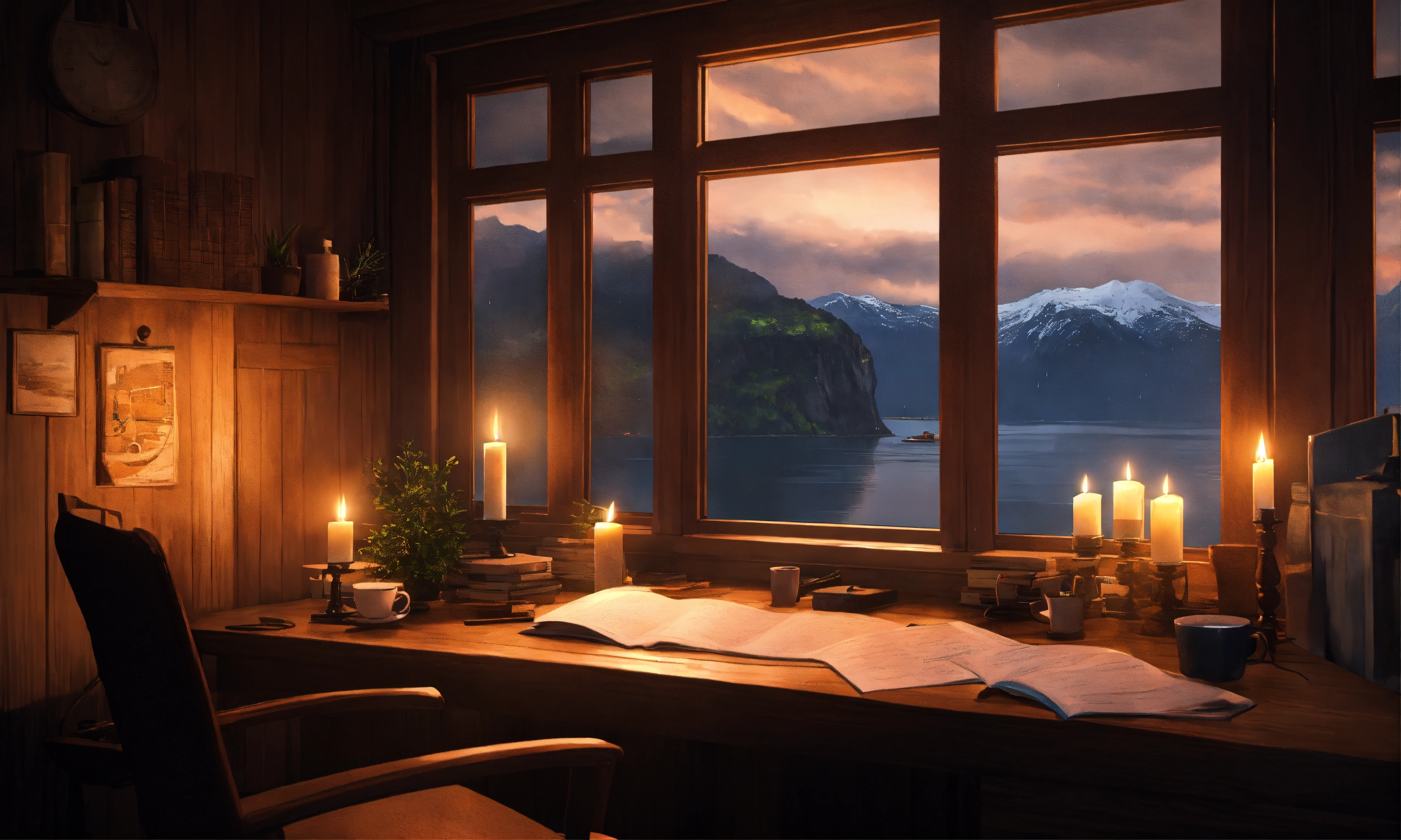 Anime study room in finland against fjord, big centered window, dark brown wooden tints in the room, focused on wooden desk and window, view of fjords, rainy night, candle on desk, coffee mug, studio ghibli, photo like, hd