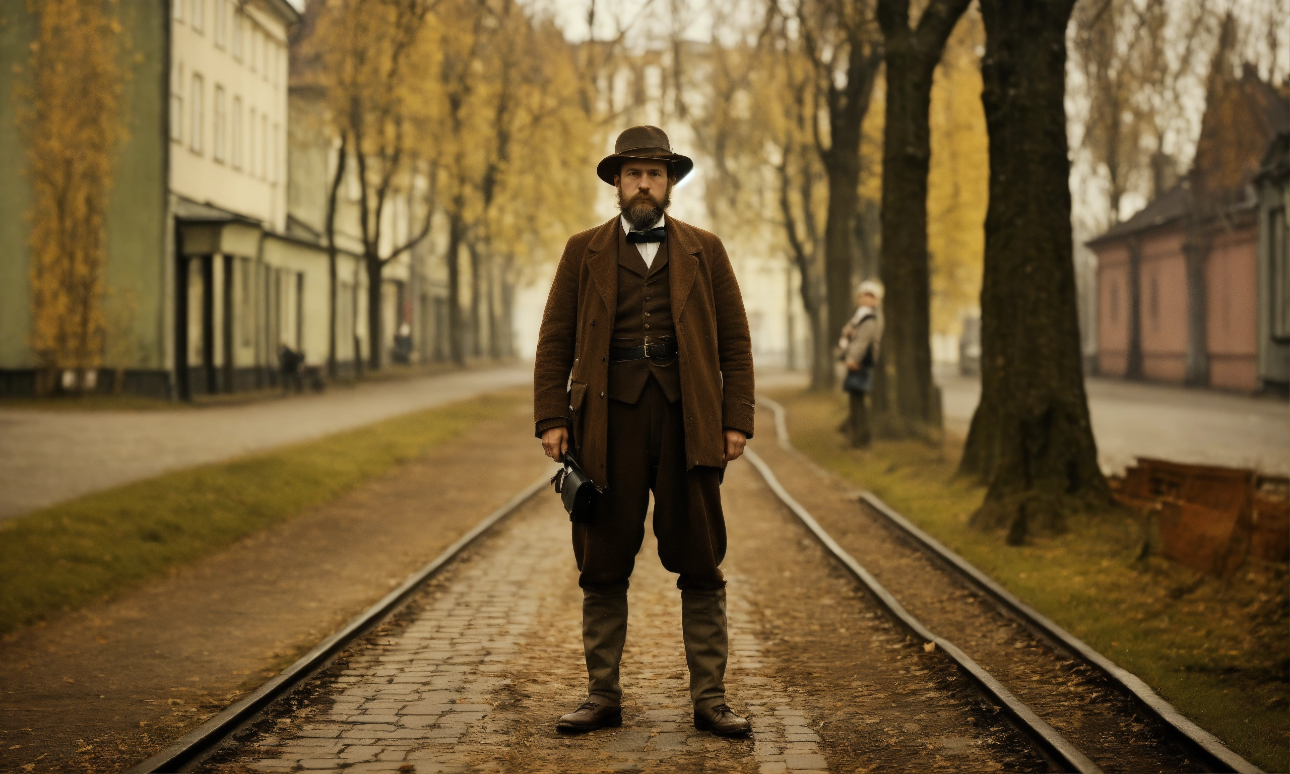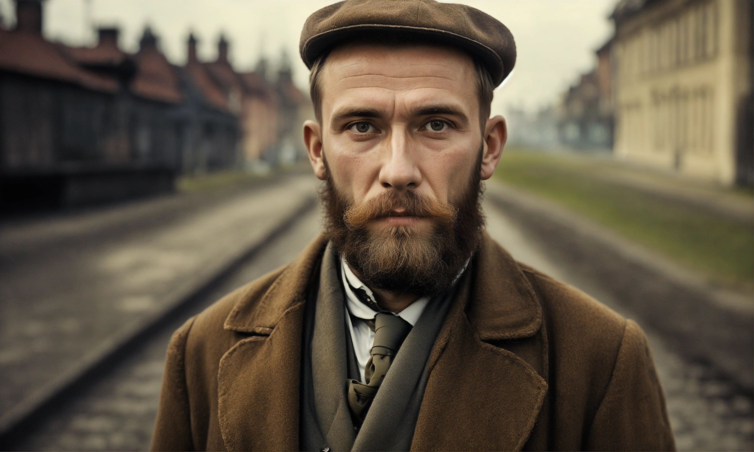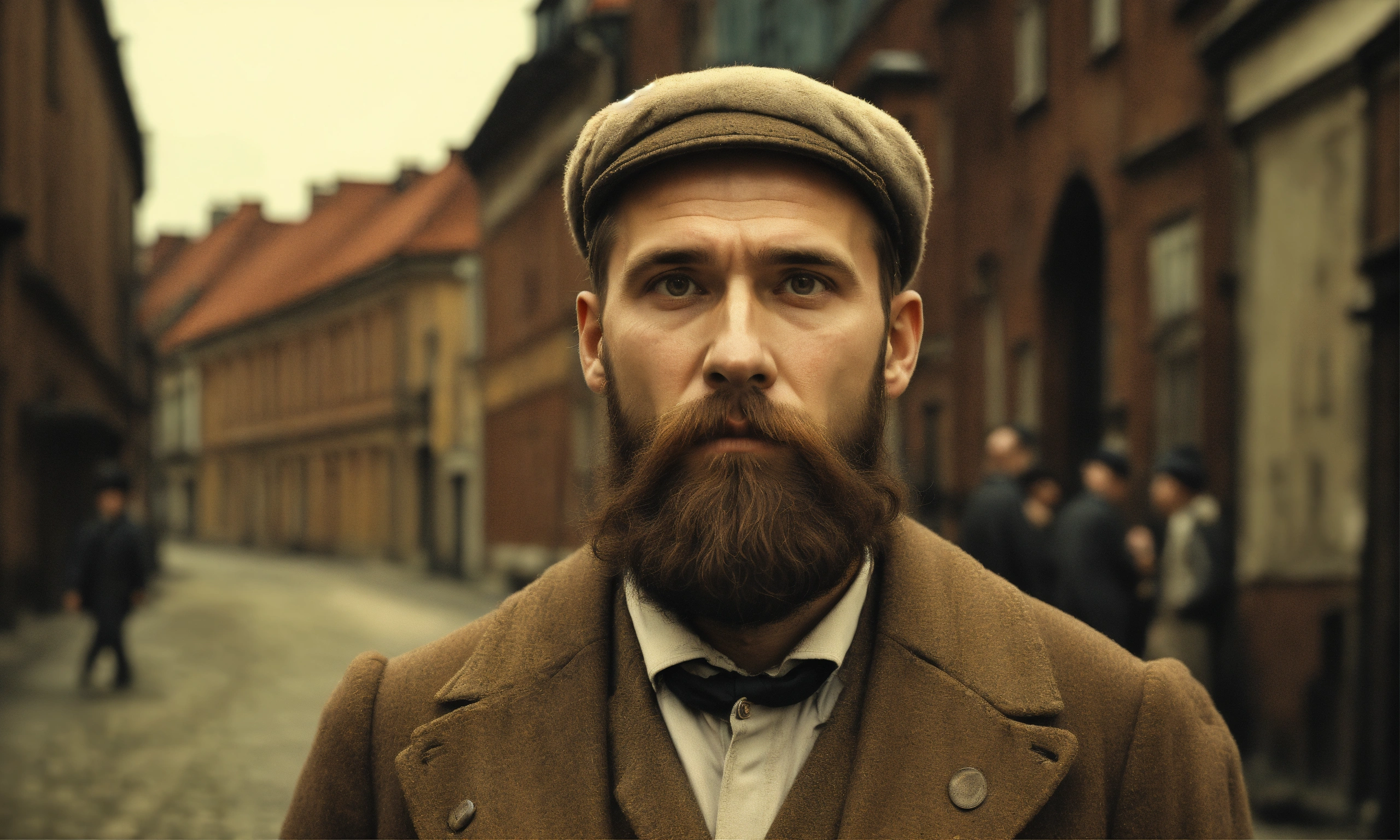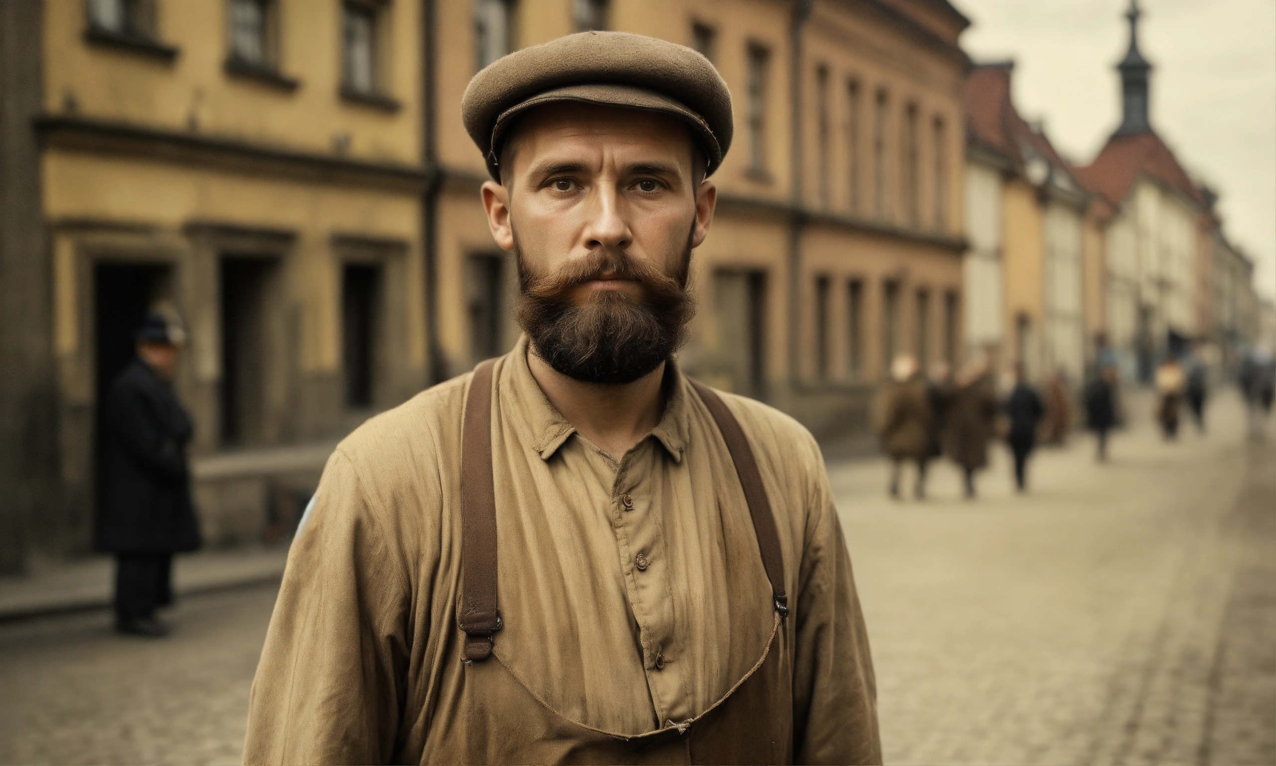 Poland poor man age 30 half height with beard, 1920-1930 on streen in warshaw. retro style photo. without people. focus camera on face man. on main streen in warshaw