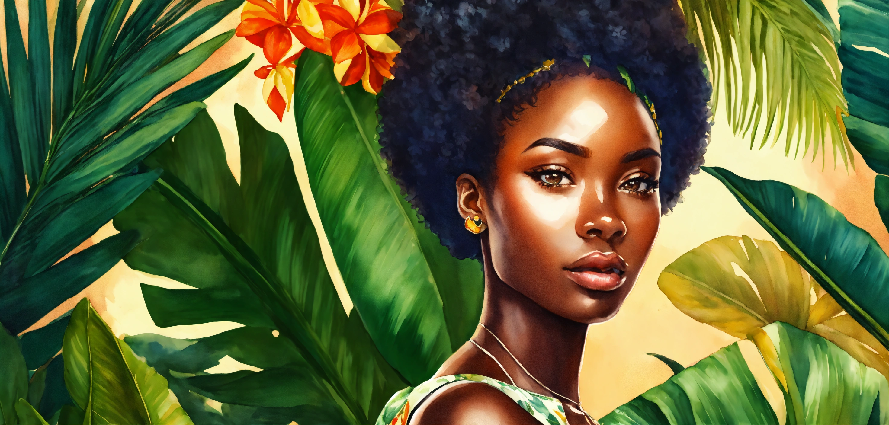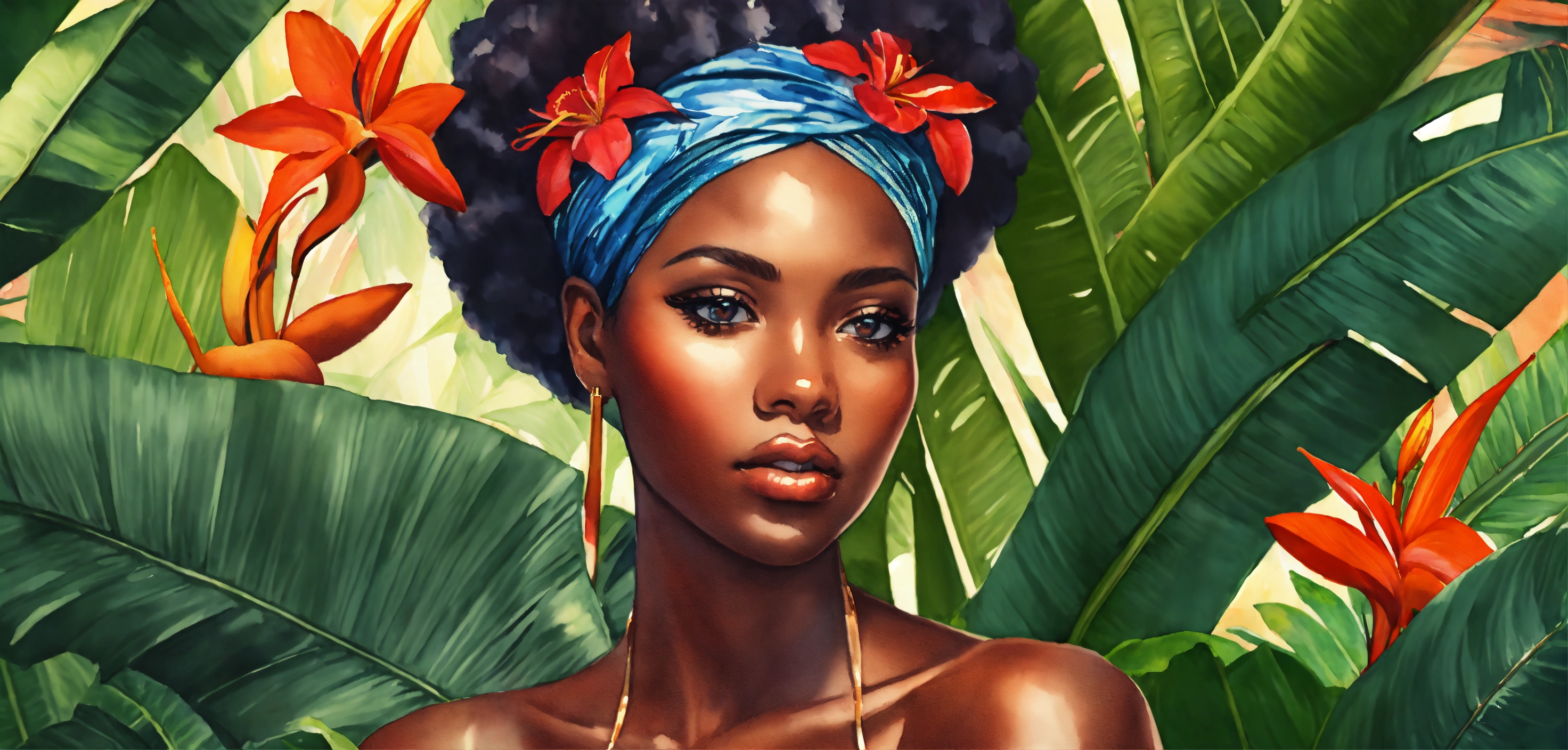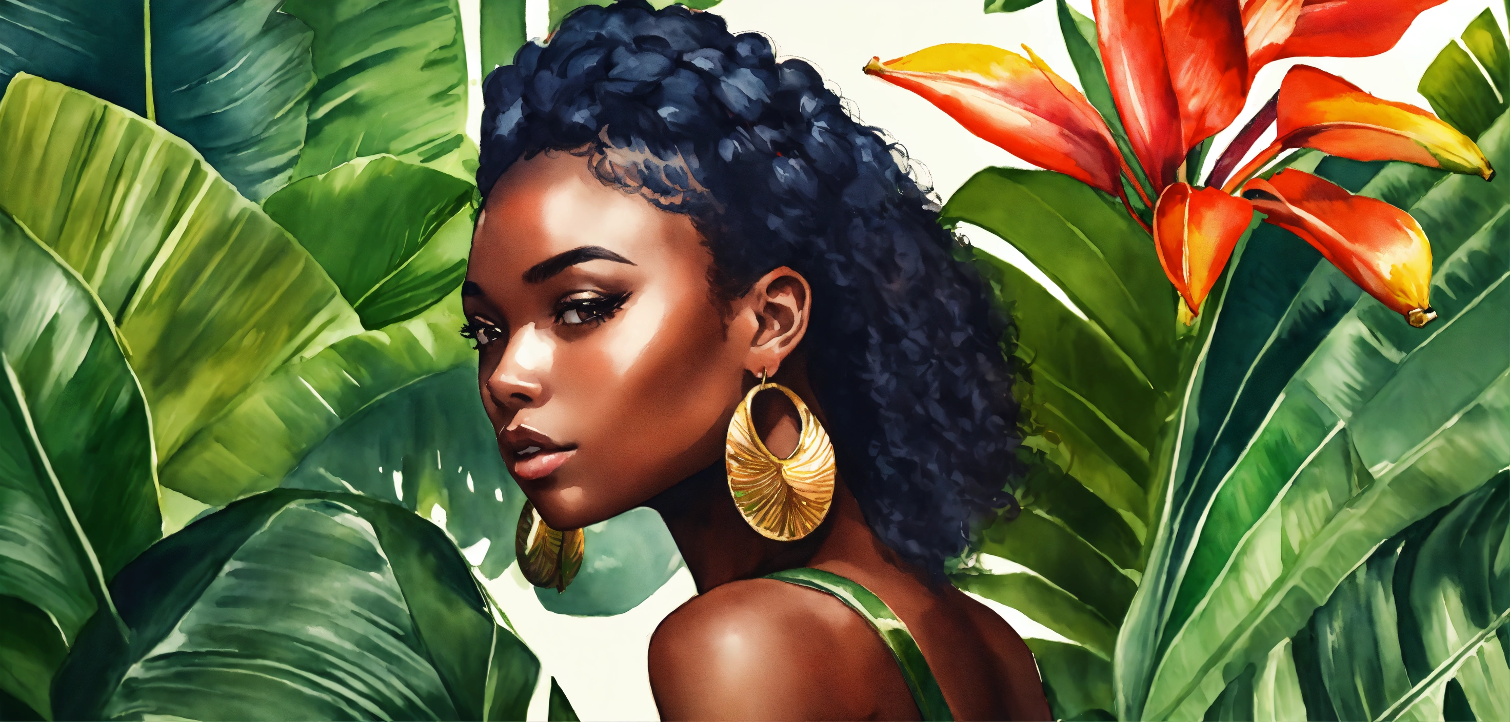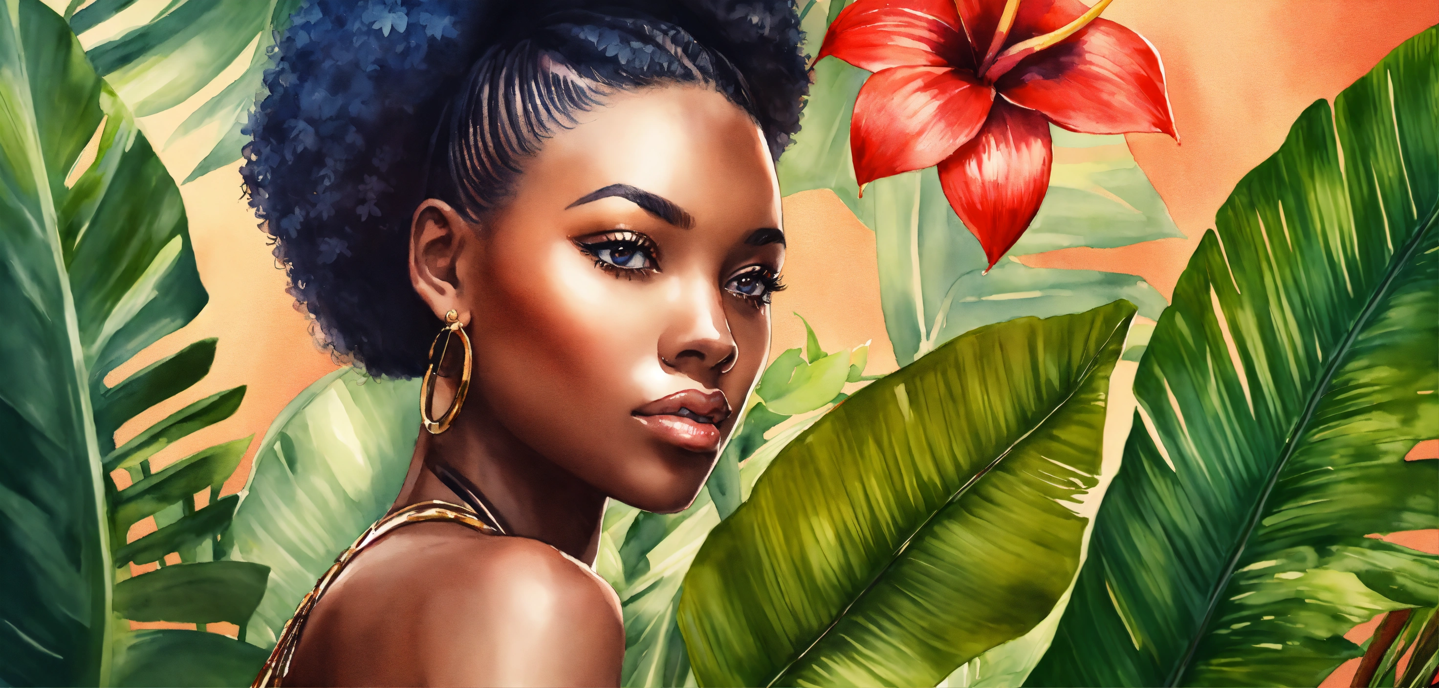 Beautiful young african woman with queen hairstyle in front of large subtropical leaves and tropical plants and flowers heliconia metallica and banana leaves watercolor illustration, photorealistic with warm and intense tones, high resolution 8k