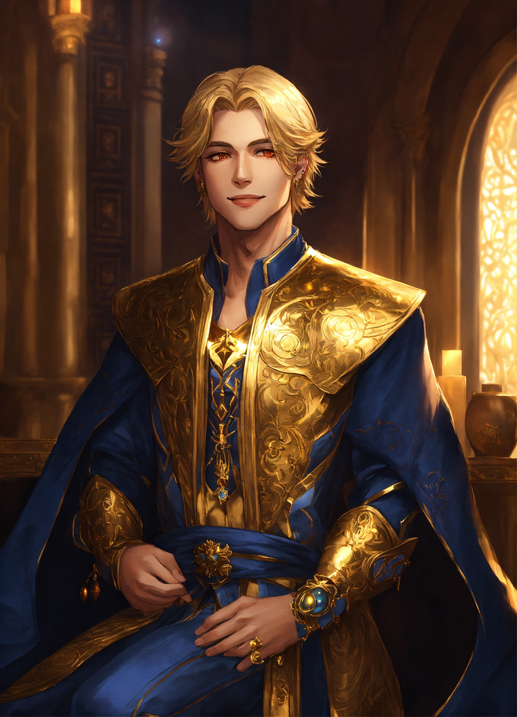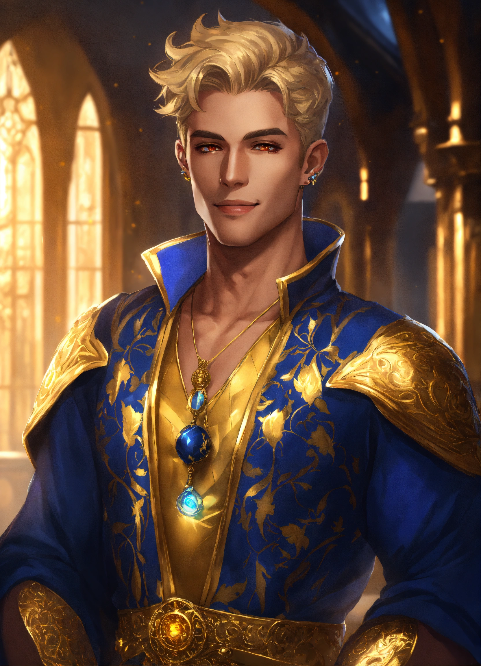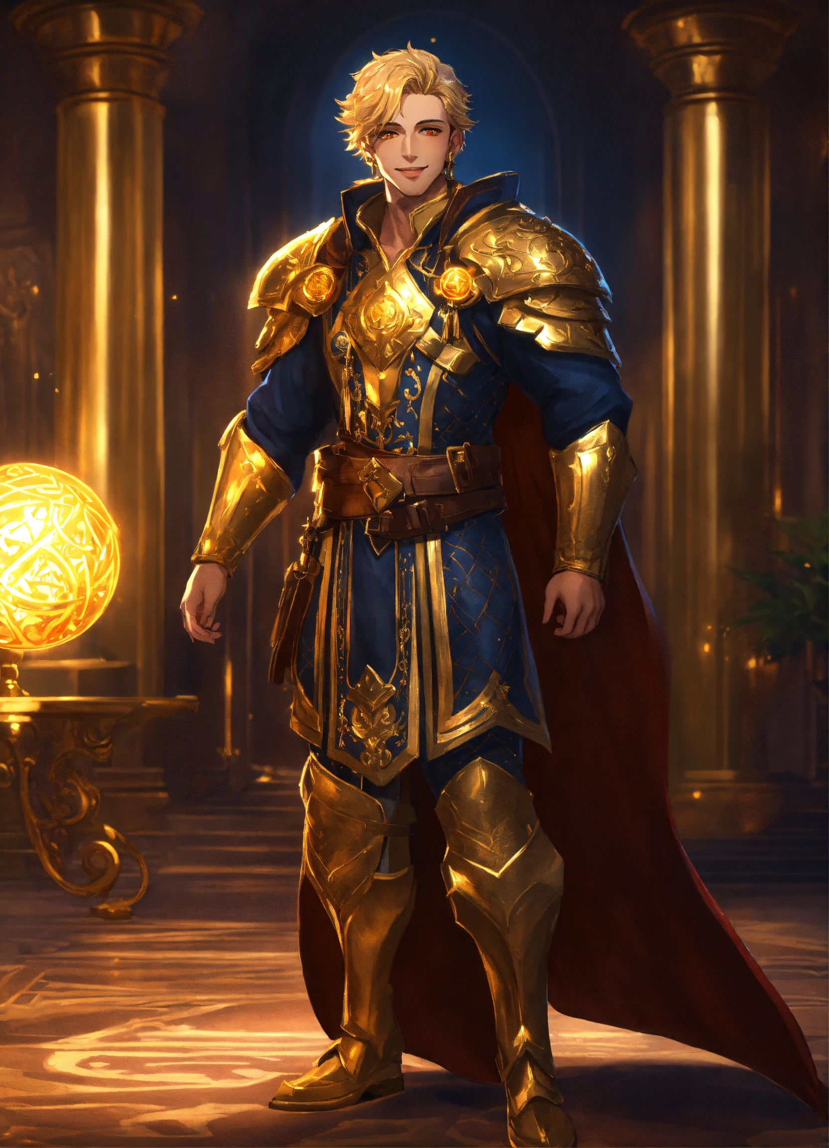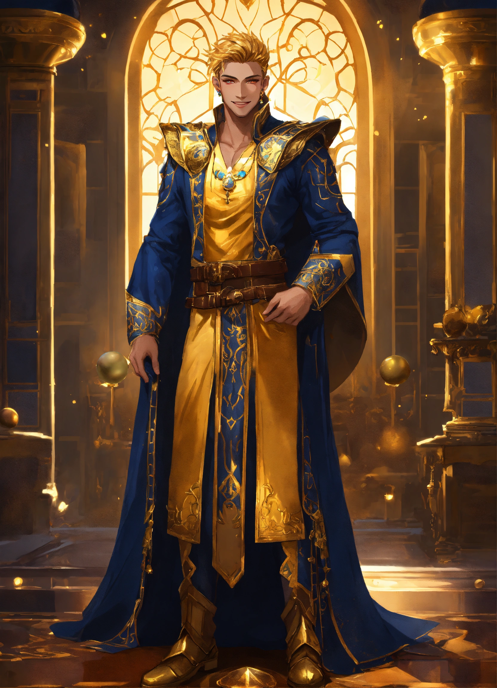 Male aisimar full body portrait, pathfinder style, class oracle. athetic body, sassy feminine look, sassy smile, short golden hair, glowing gold eyes. gold earings, main colors gold and dark blue, fancy armored robe, casting golden magic orbs mansion interior background