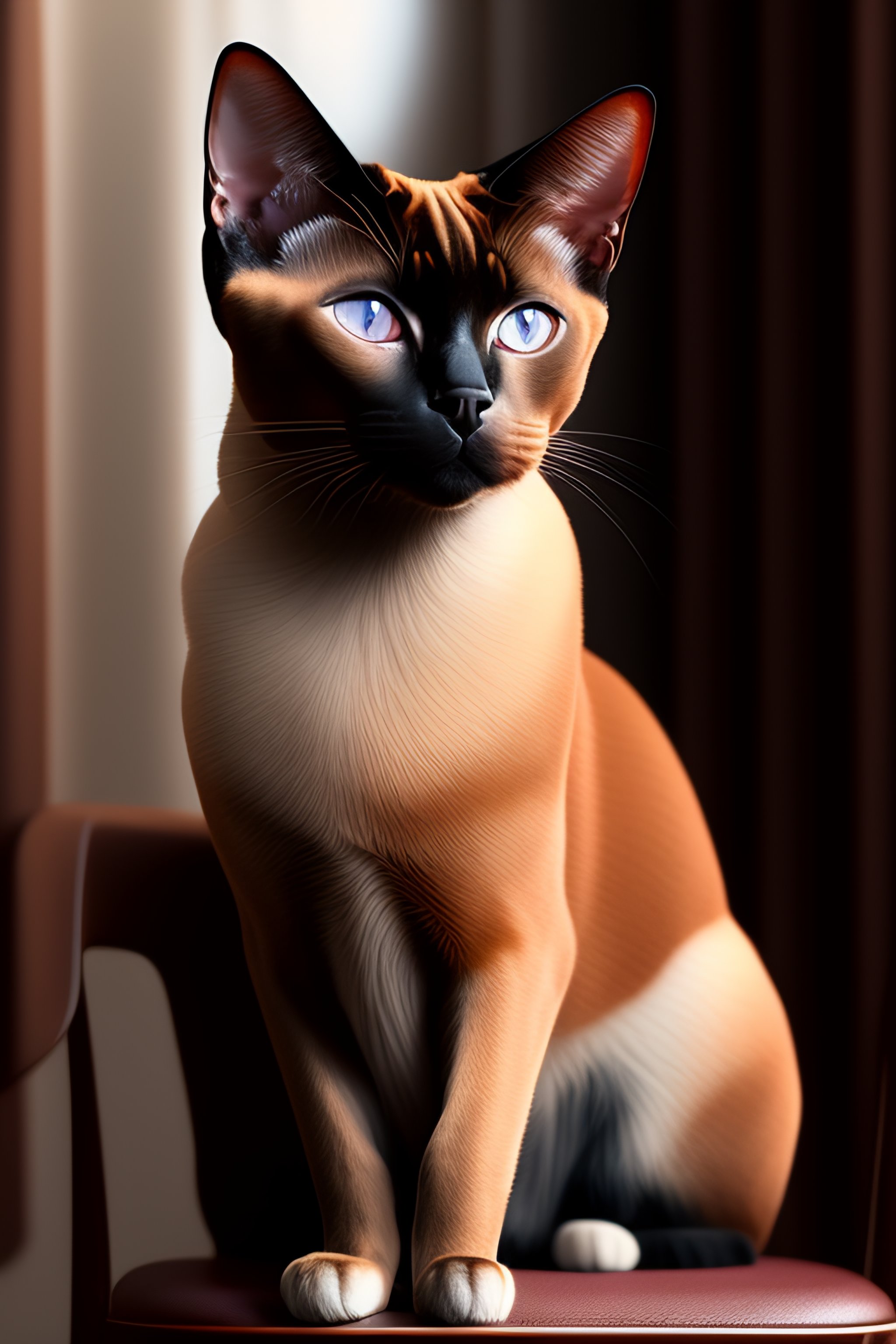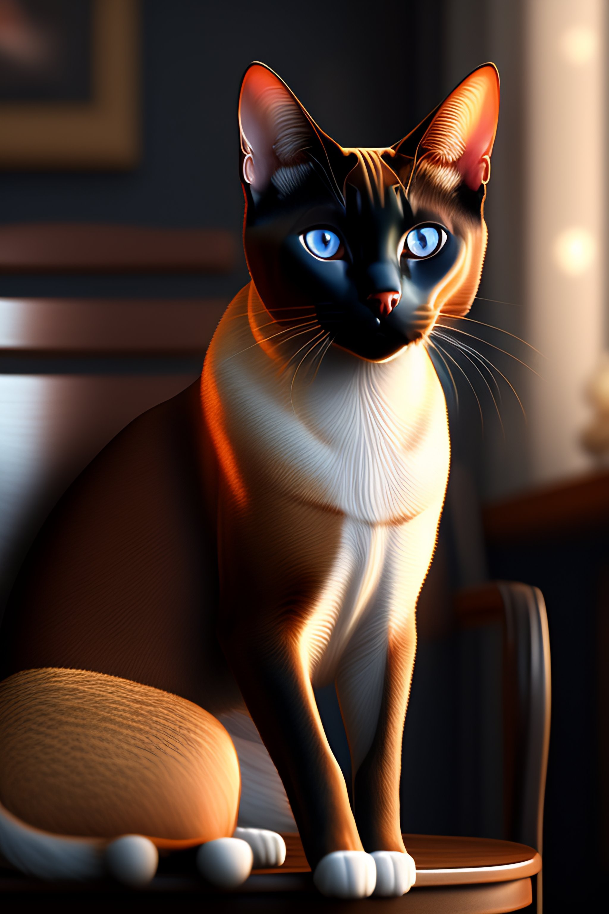 Full body portrait of a siamese cat [color, chocolate point] sitting on a chair, in the middle of the room, photorealistic, unreal engine, intricate complexity, cinematic
