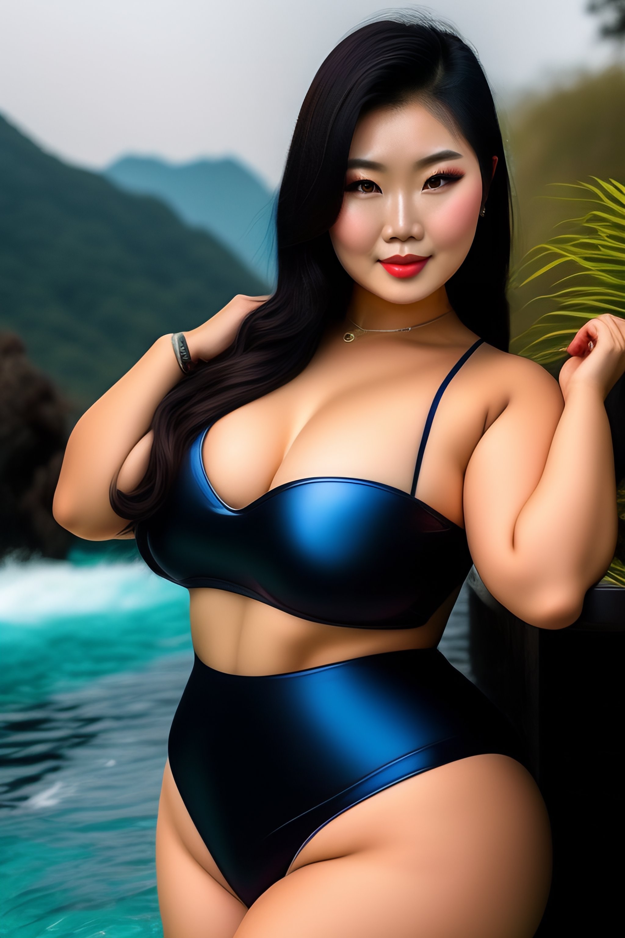 Thick beautiful asian woman wearing swimsuit