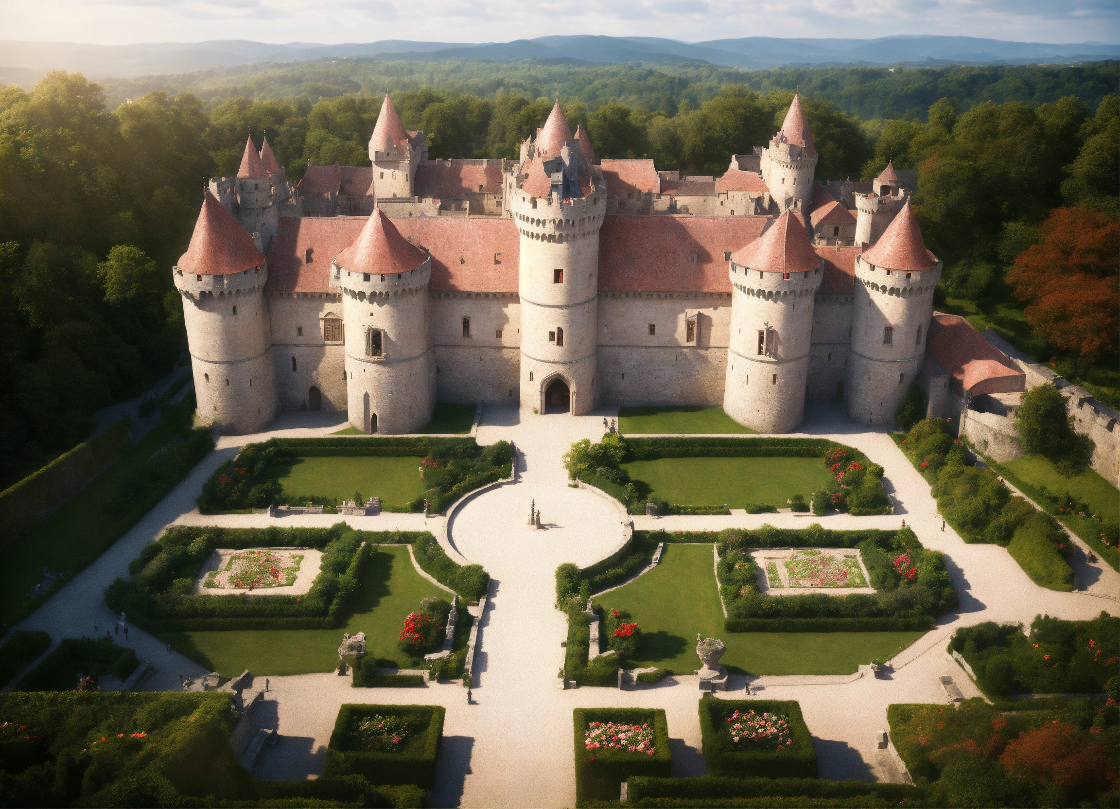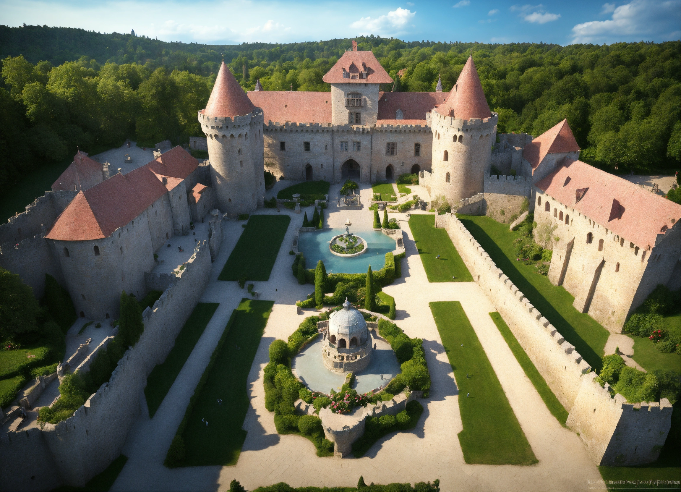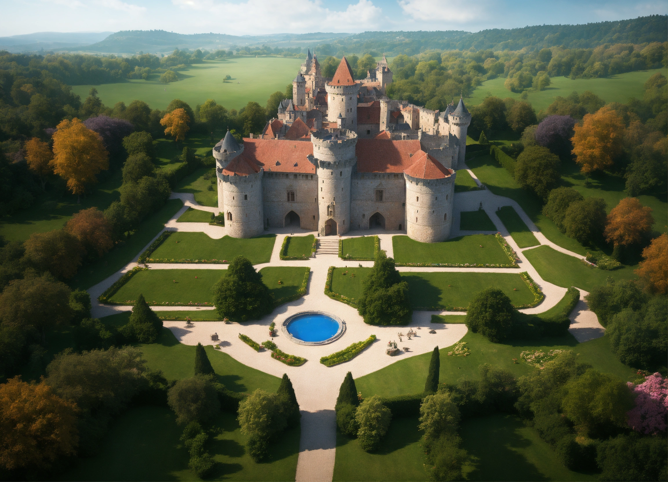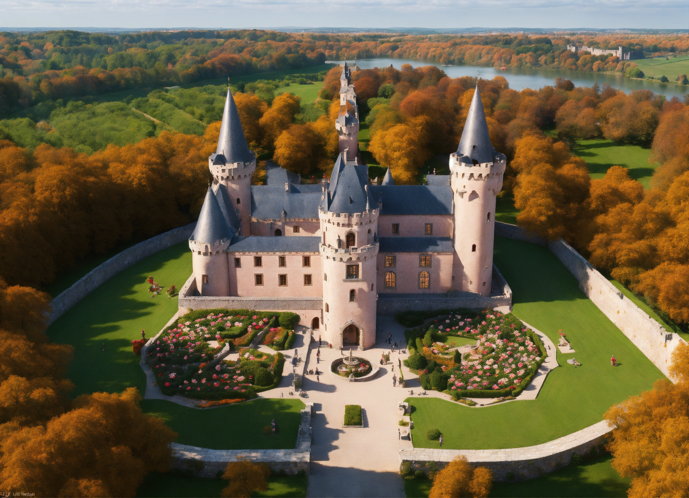 Ultra realistic, photorealistic, bird's eye view of a medieval castle, palace of roses, rose bowers, magnificent rose garden and arcades, magnificent fountain, marble figures in the gardens, massive crenellated stone wall with a central wall gate and watchtowers surrounds the castle area, with a large inner courtyard and several servants quarters, extensive rose fields on hilly landscapes in the area around the castle, ultra detailled, focus on castle, sharp focus, sharp, ambient lighting, in the style of ksiąz castle in poland