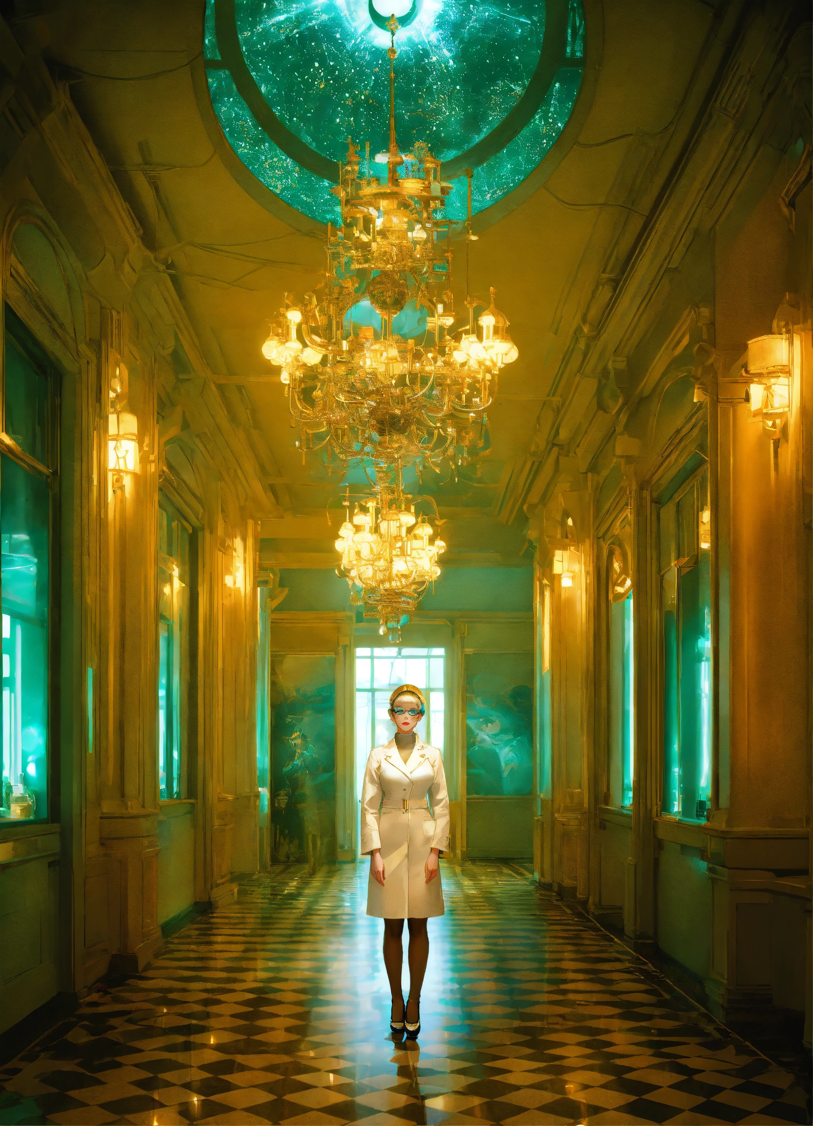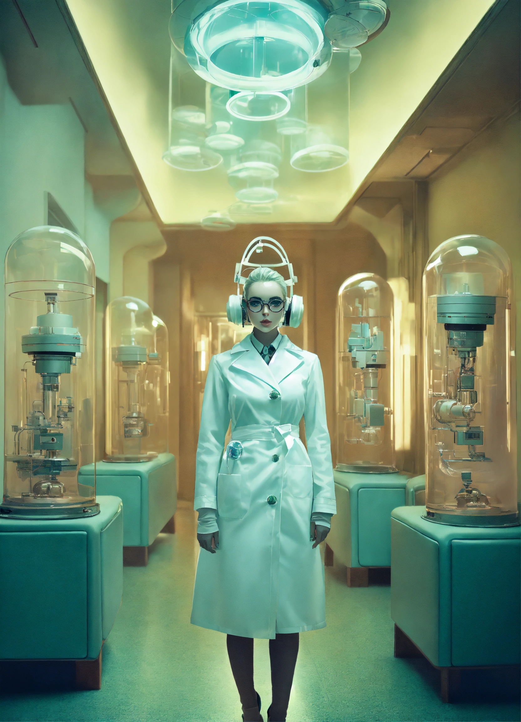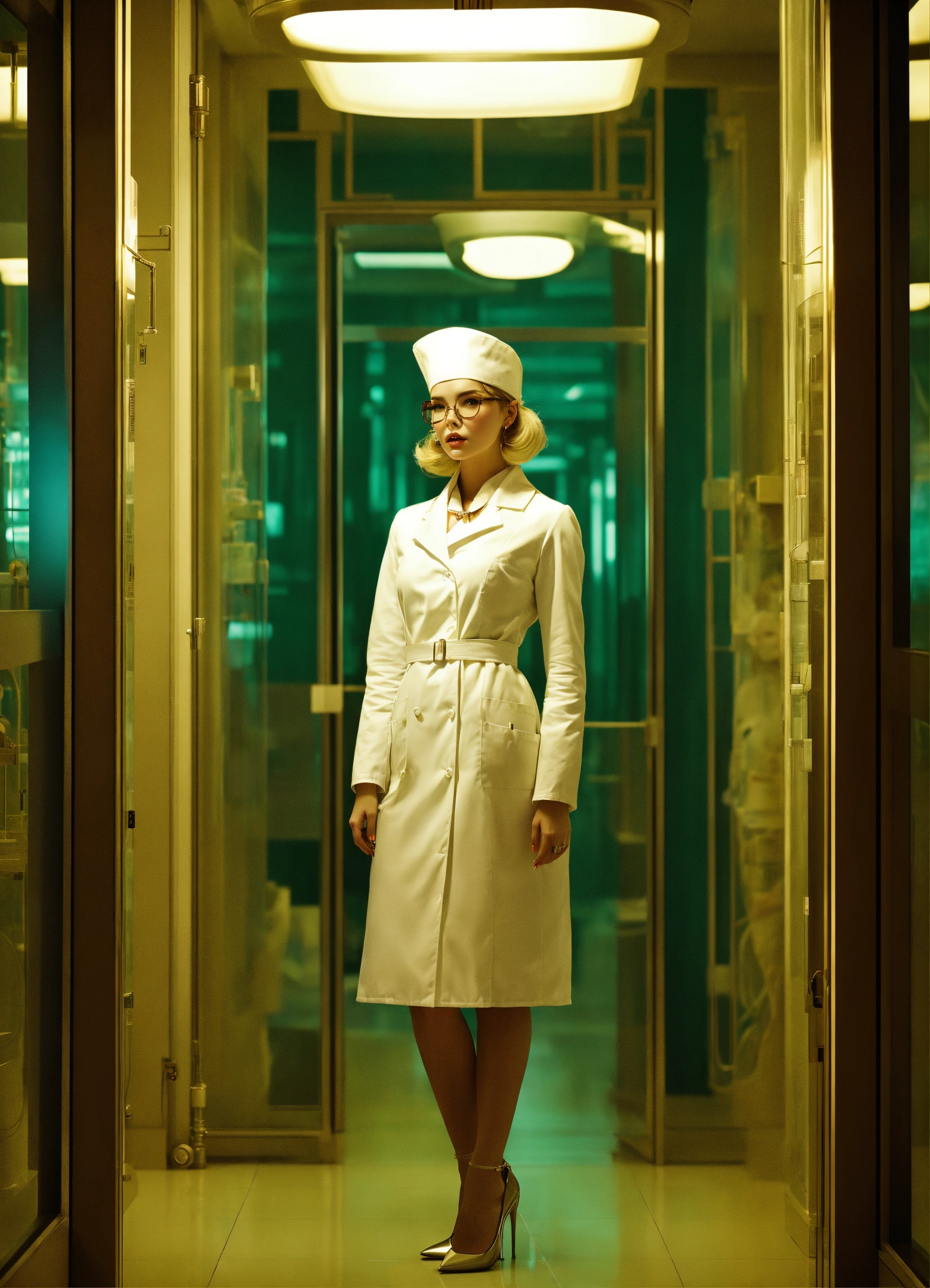 Photography in a futuristic sci fi laboratory, meeting of 60's gorgeous night chirurgical nurses woman in short white coat, in an luxury hotel corridor, wearing large transparent glasses, with a highly concentrated air, 80 degree view, art by sergio lopez, natalie shau, james jean and salvador dali