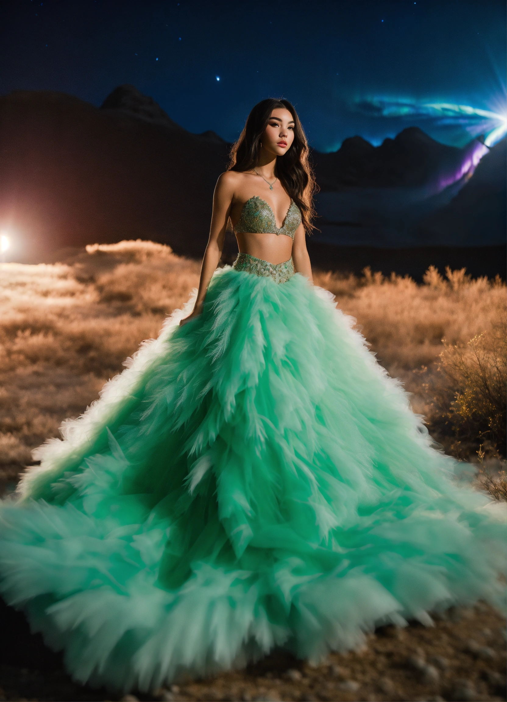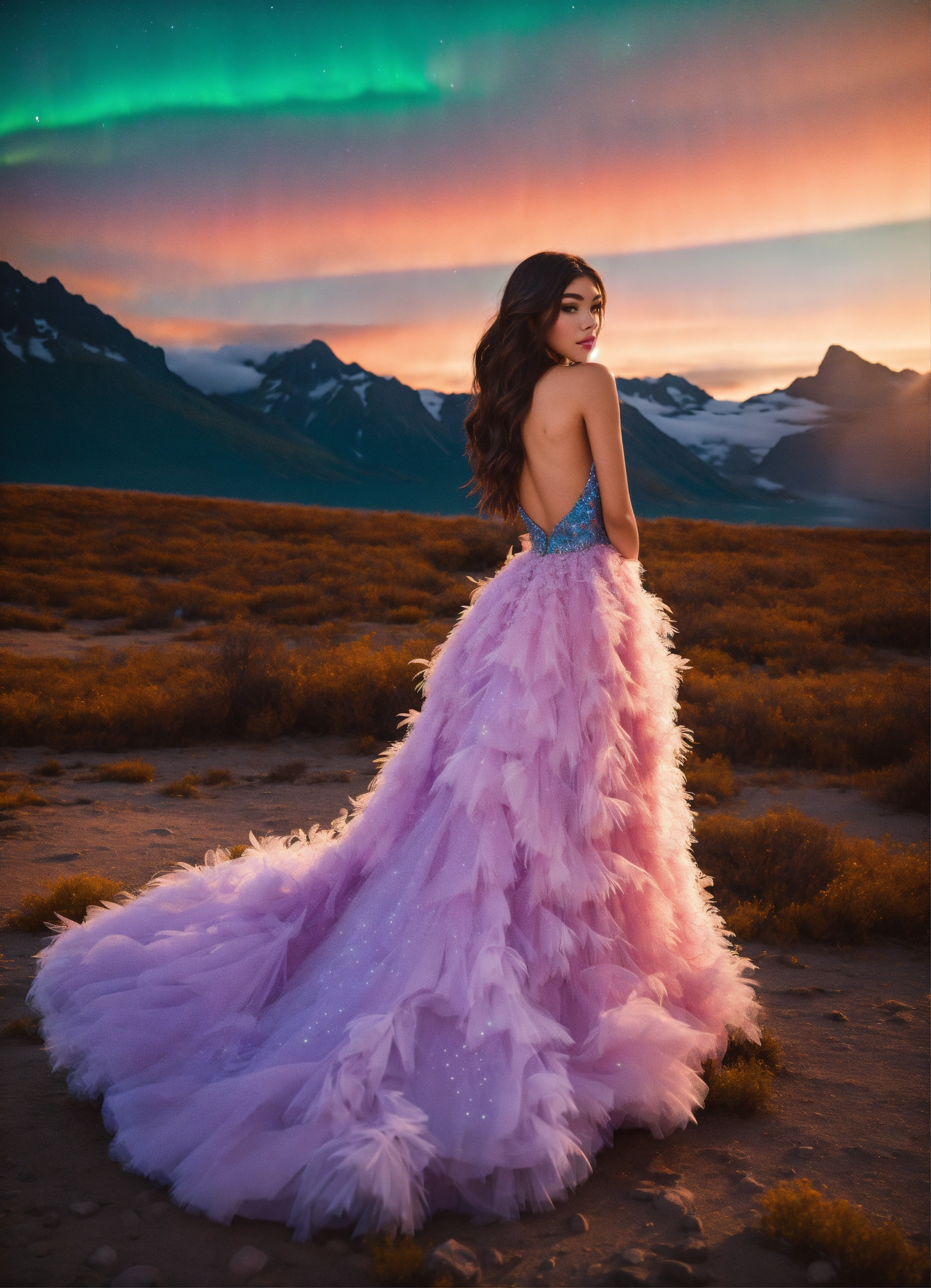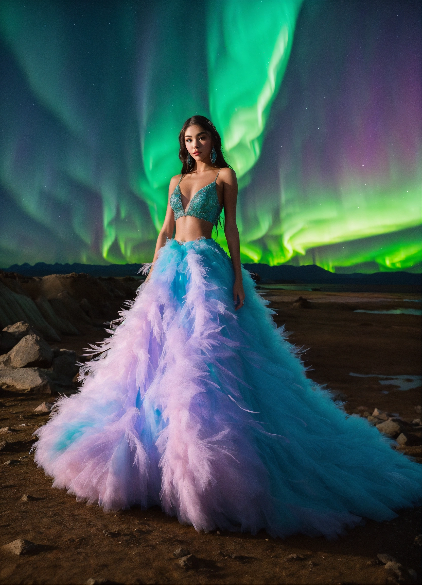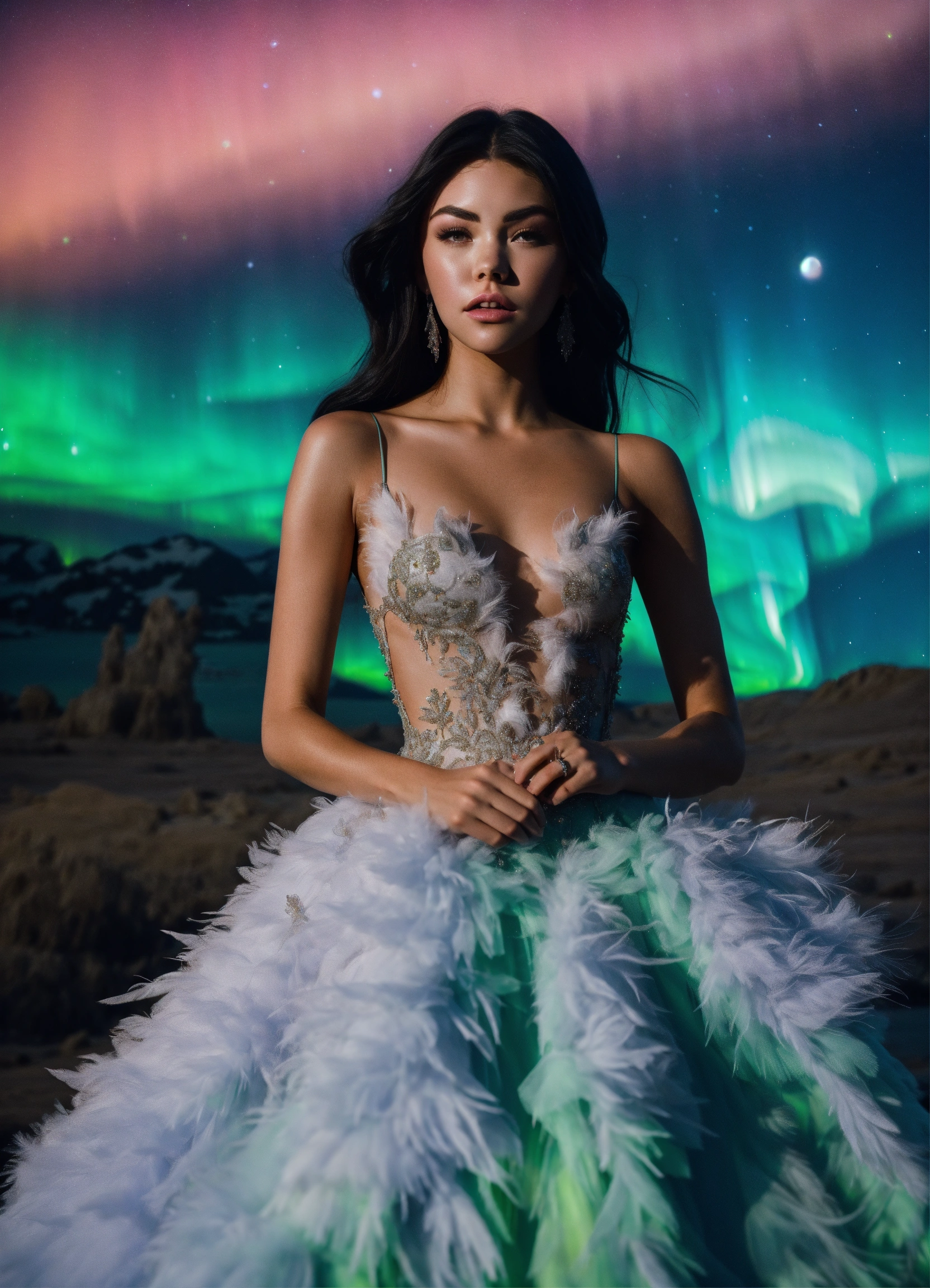 Madison beer in a feathered ballgown, on an isolated planet, aurora borealis. wide angle. 4k real photoshoot.
