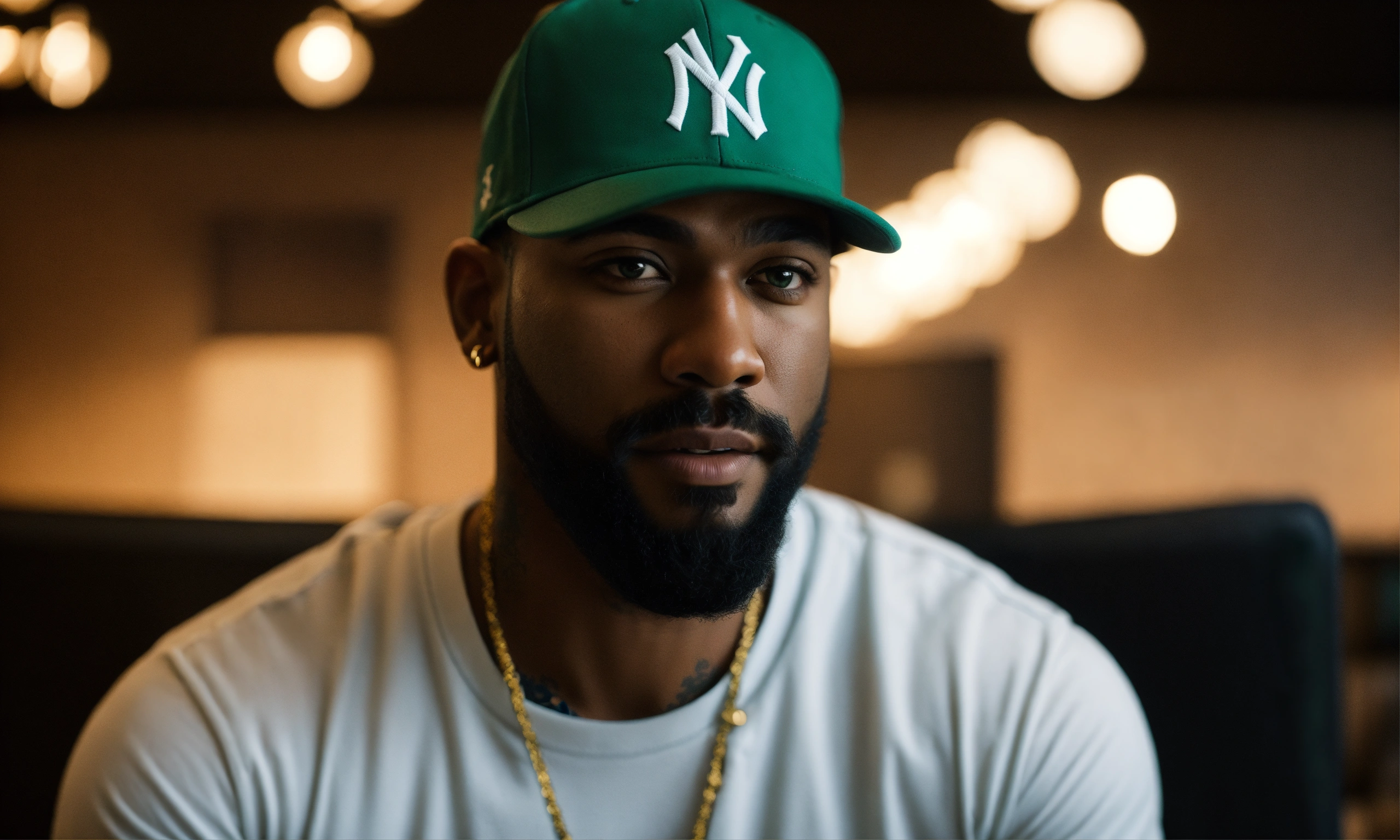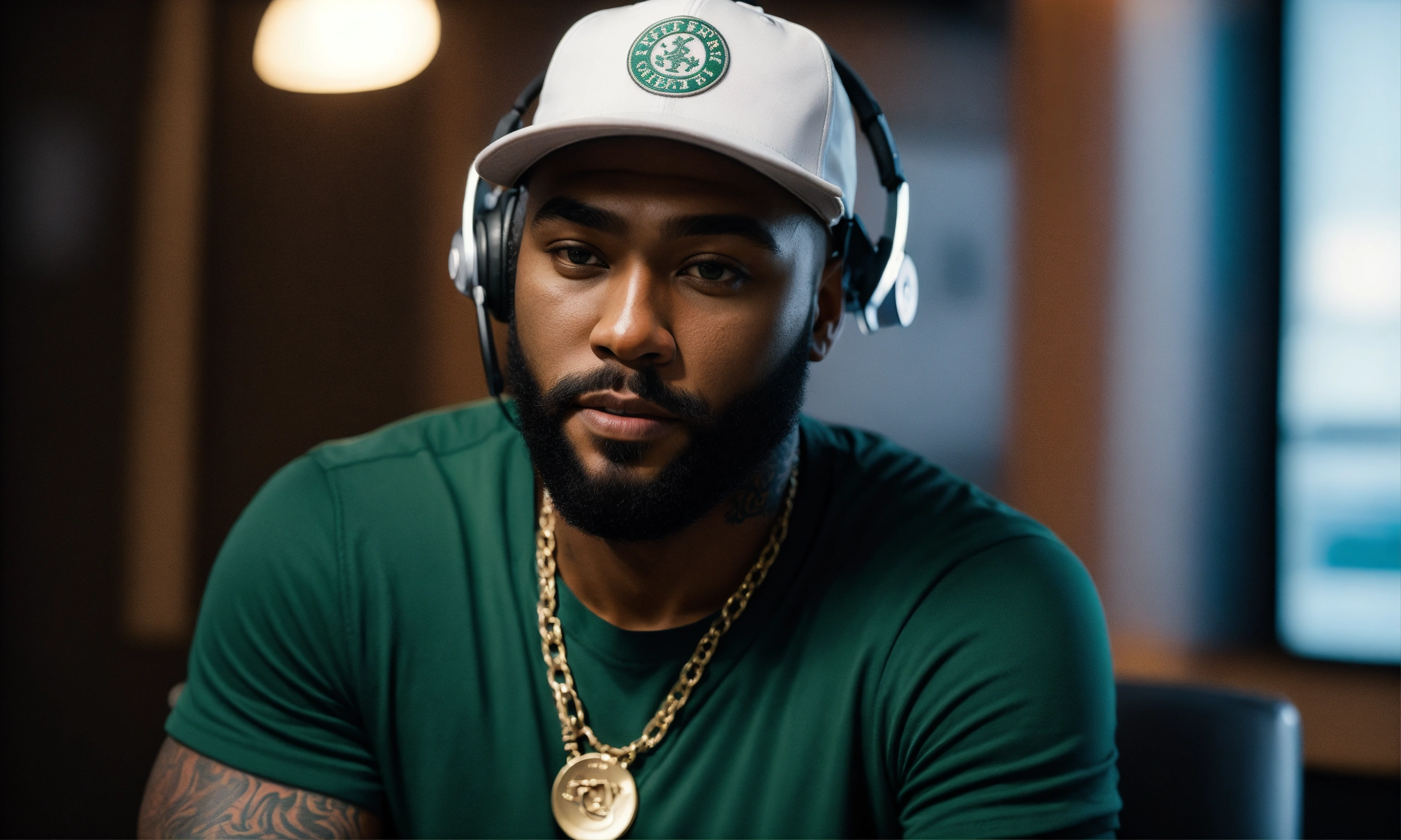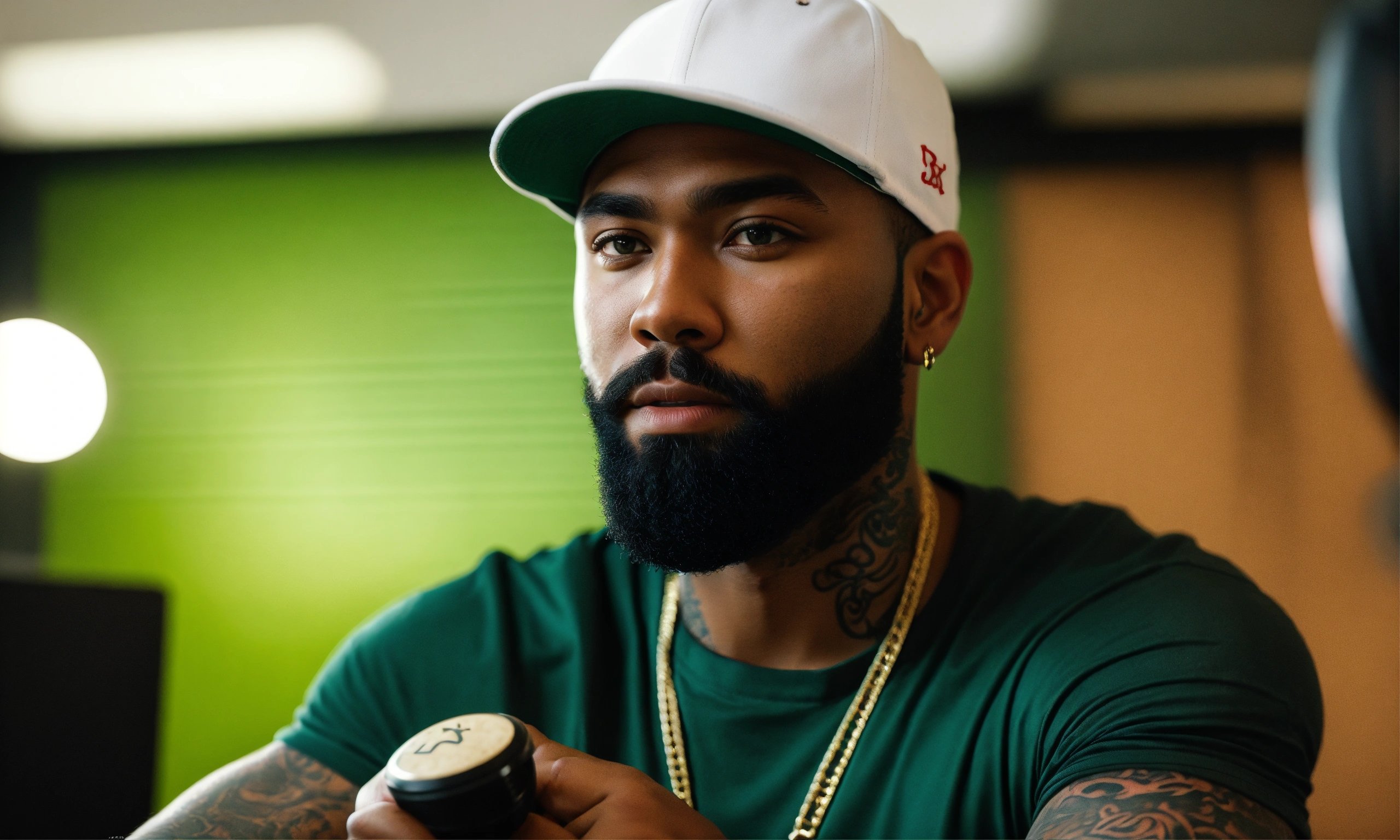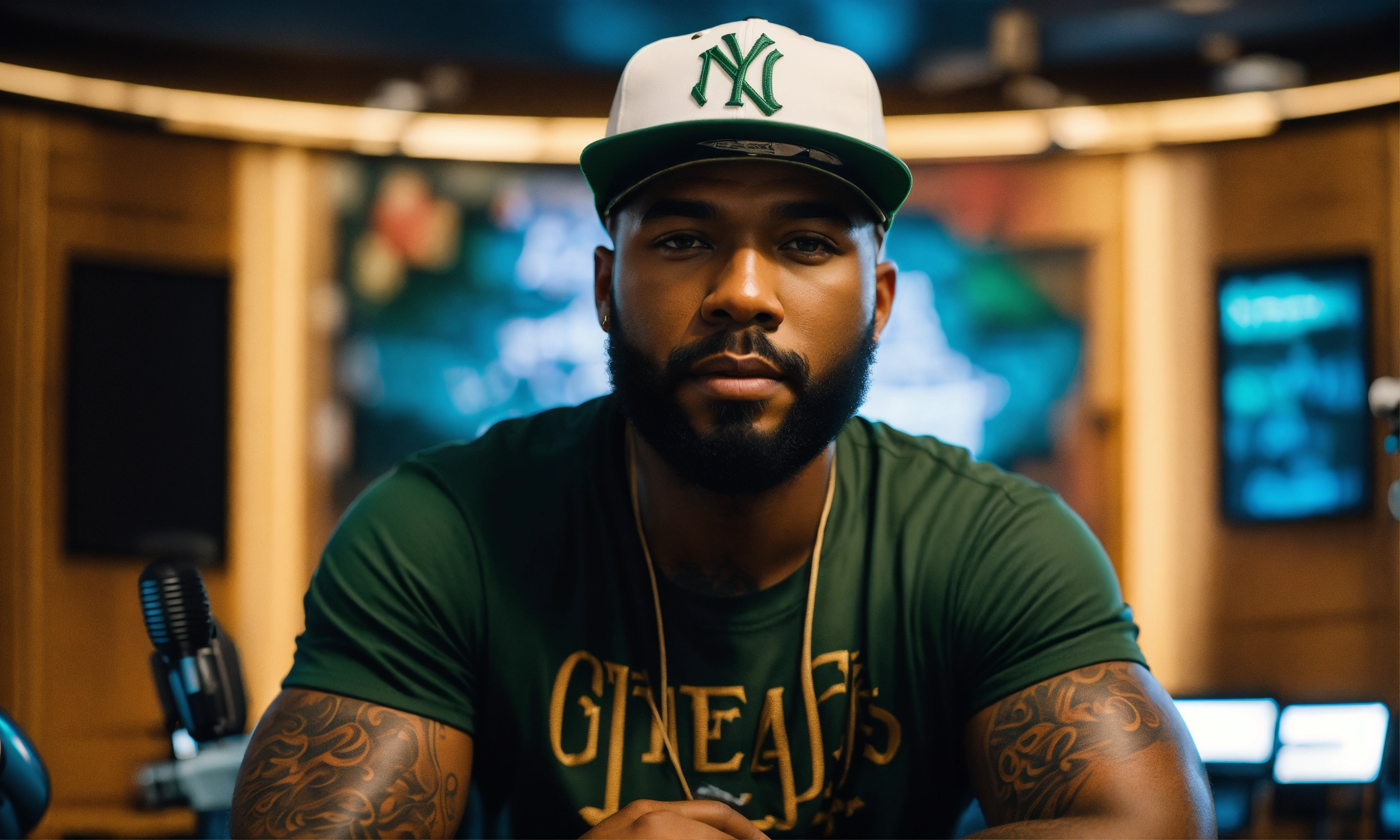 Full body shot, wide angle shot, handsome black man with well broomed short beard, bald, white baseball cap, white dark green shirt, tattoo on both arms, sitting in a fancy podcast studio talking into the mic, face profile, brown eyes looking at camera, he's looking into the camera, very real, 8k, extreme detailed, real photo, looking straight at camera.