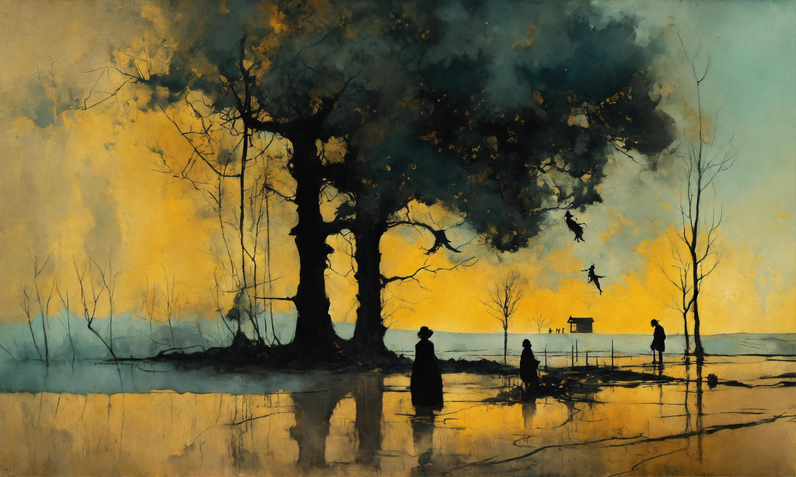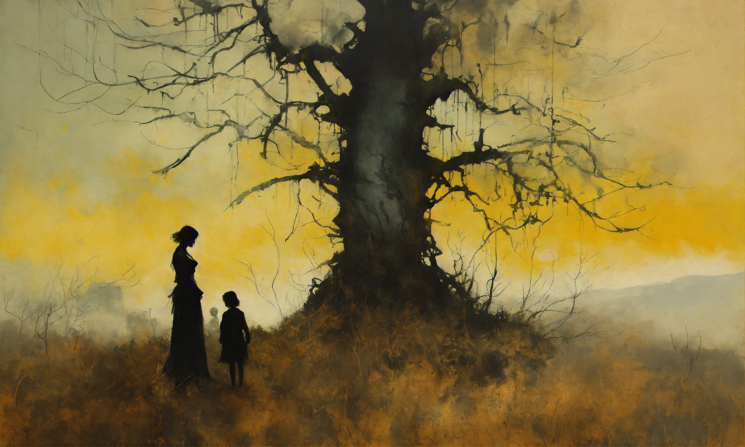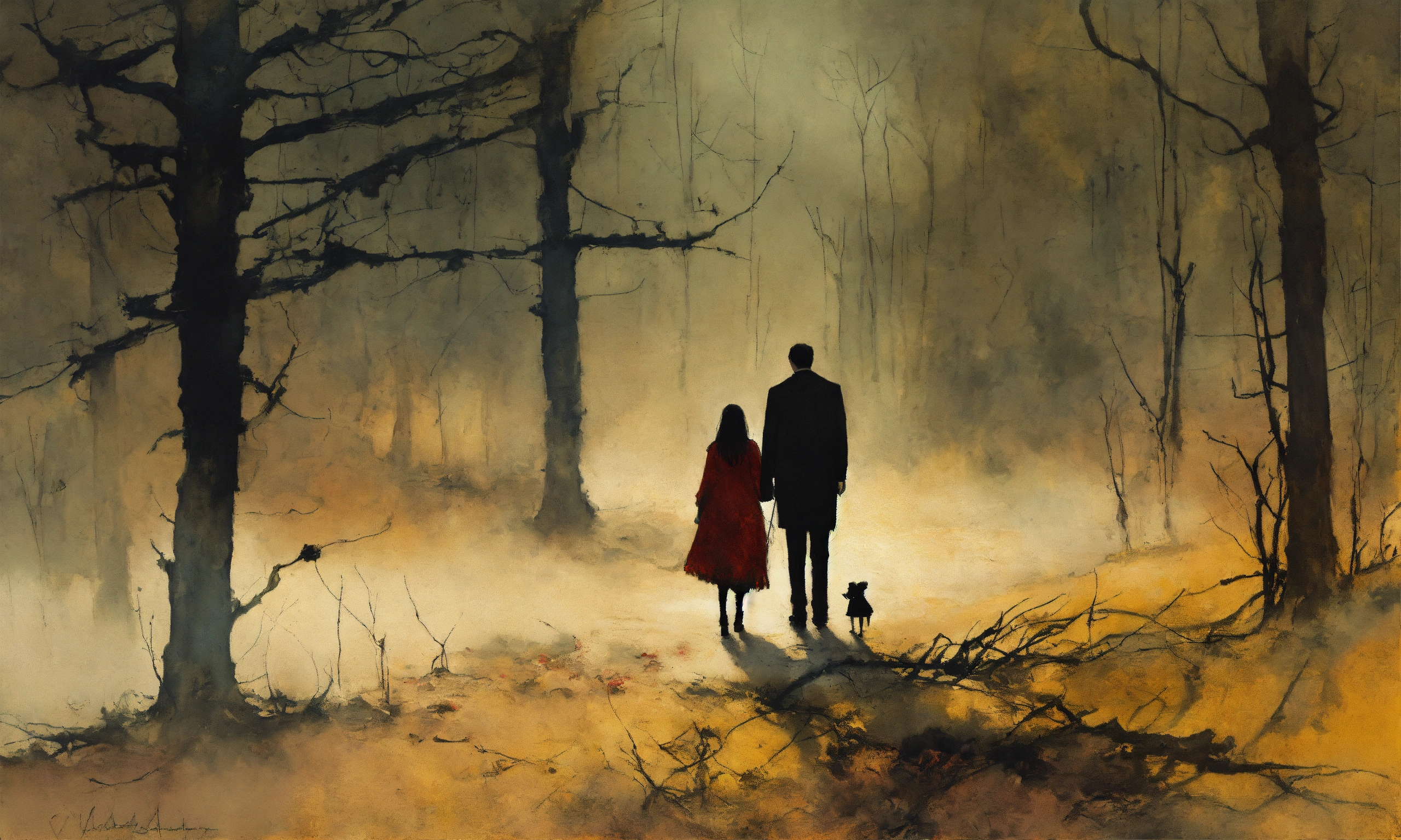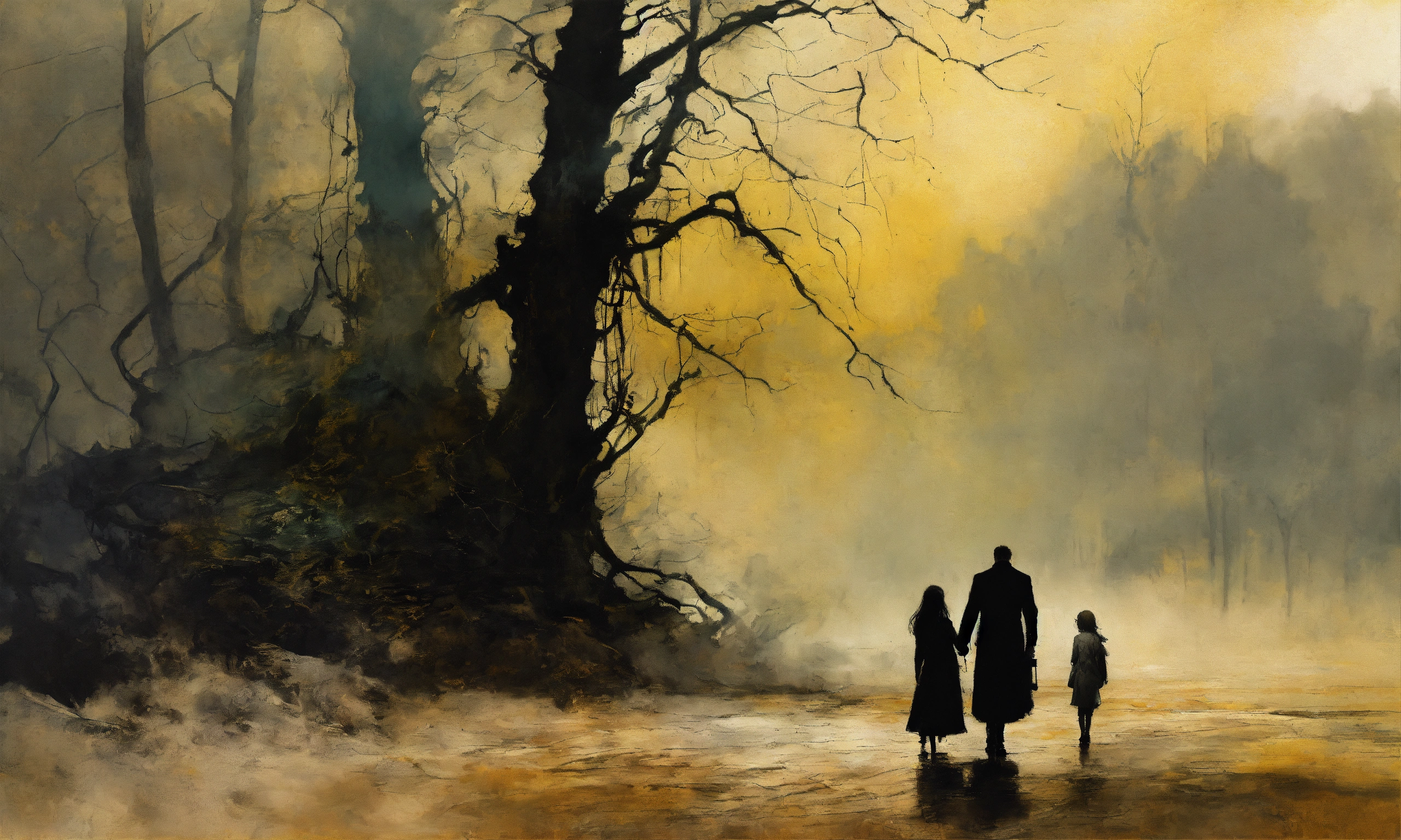 Two lonely lovers with their daughter, separation, high detailed intricate creepy mixed-media textured photography by andreas lie, richard anderson, gris grimly, stephen gammell, a masterpiece, oil on canvas, fine art, rough texture and brush strokes, creepy, sinister