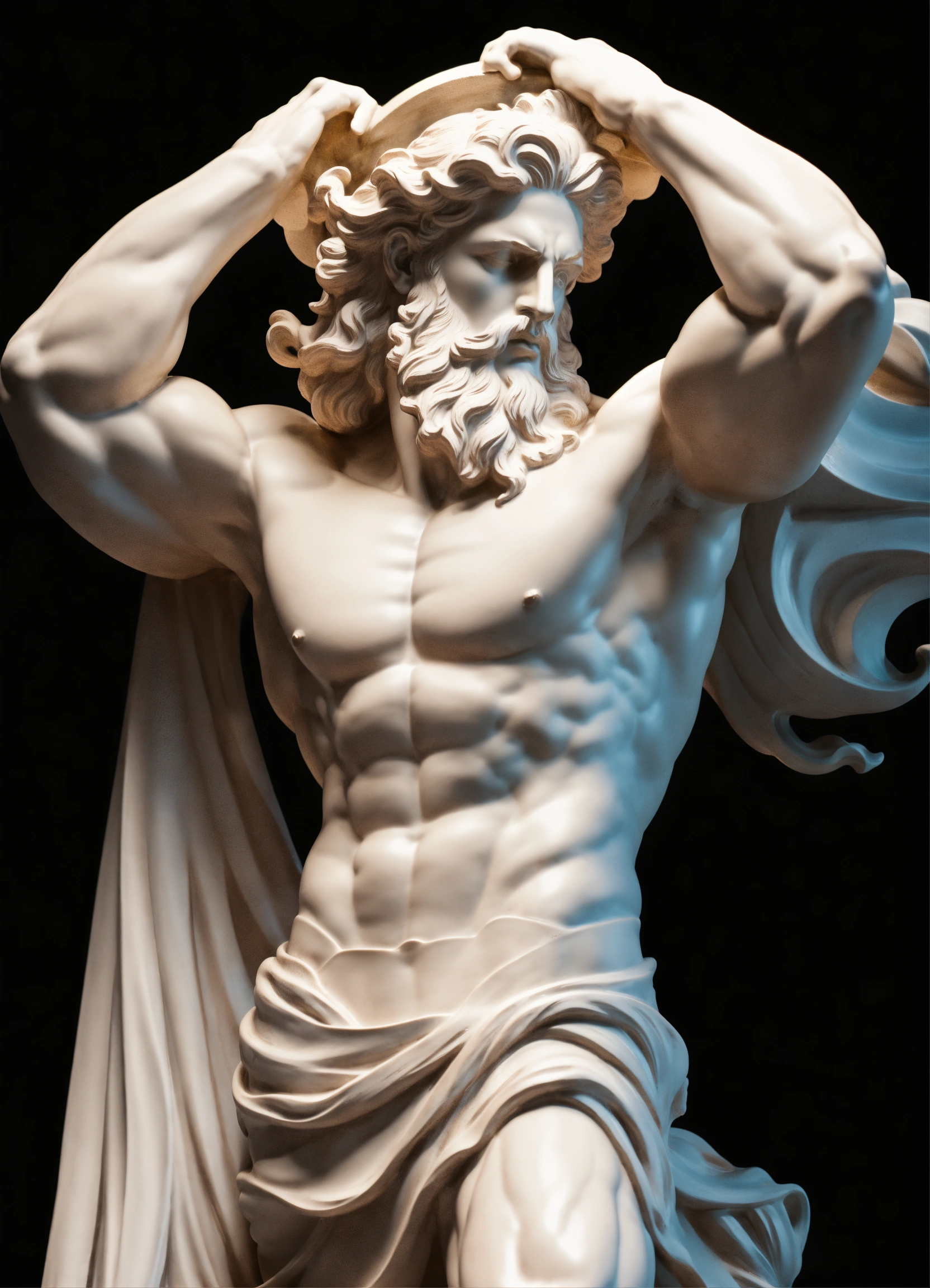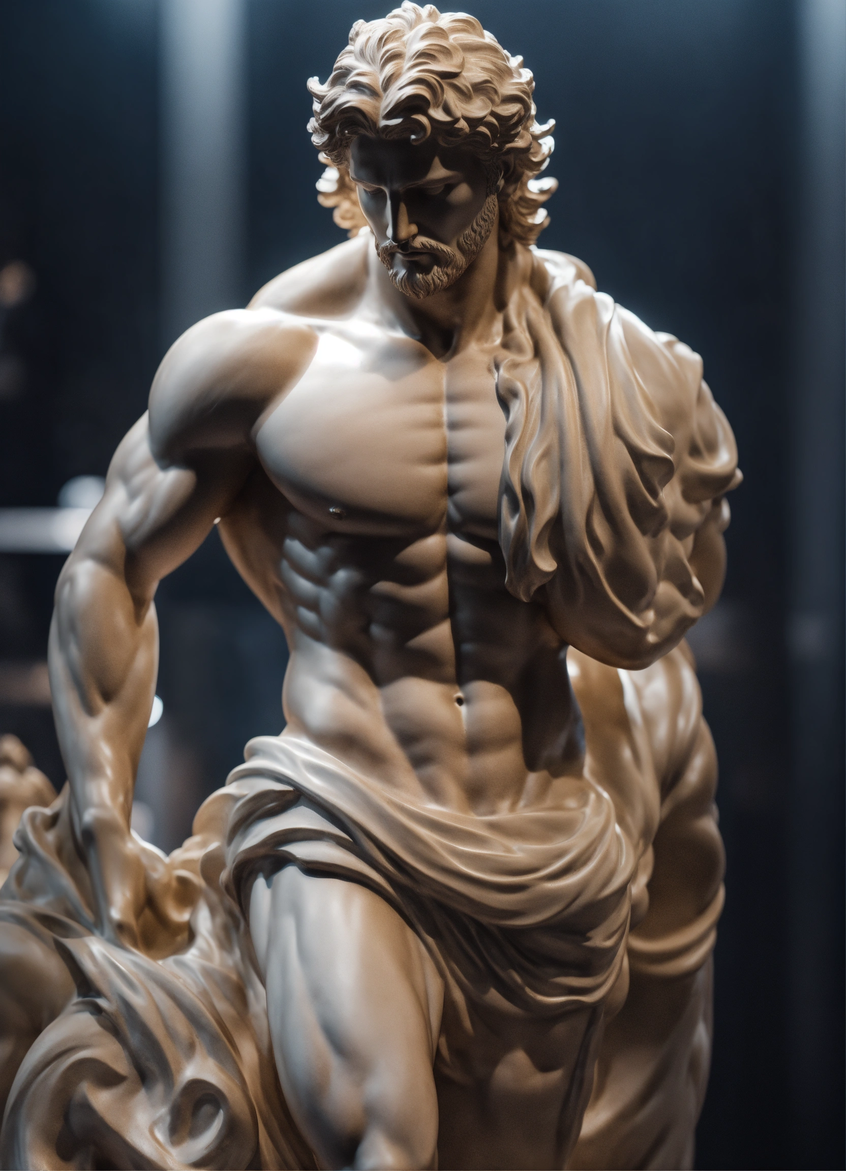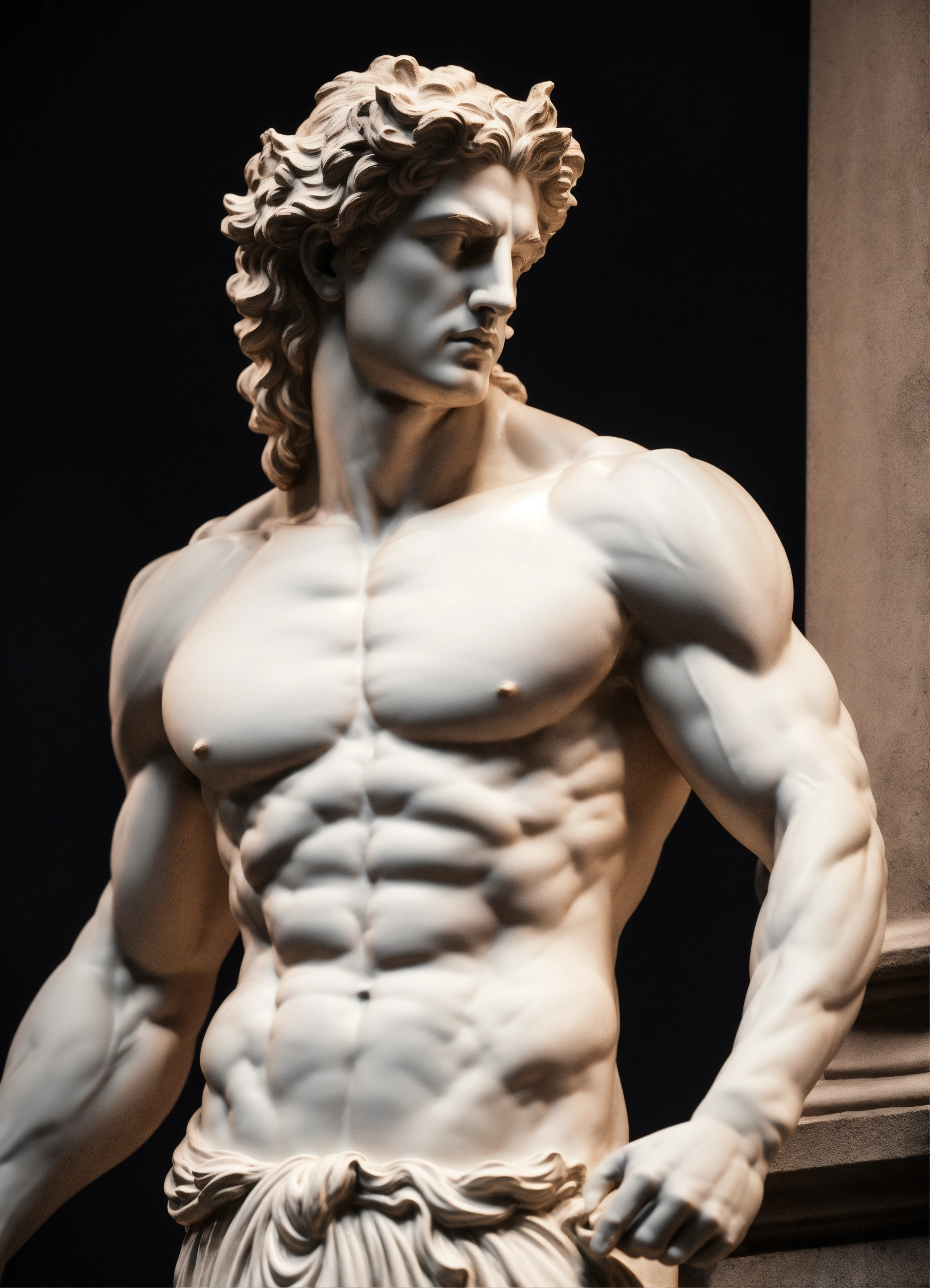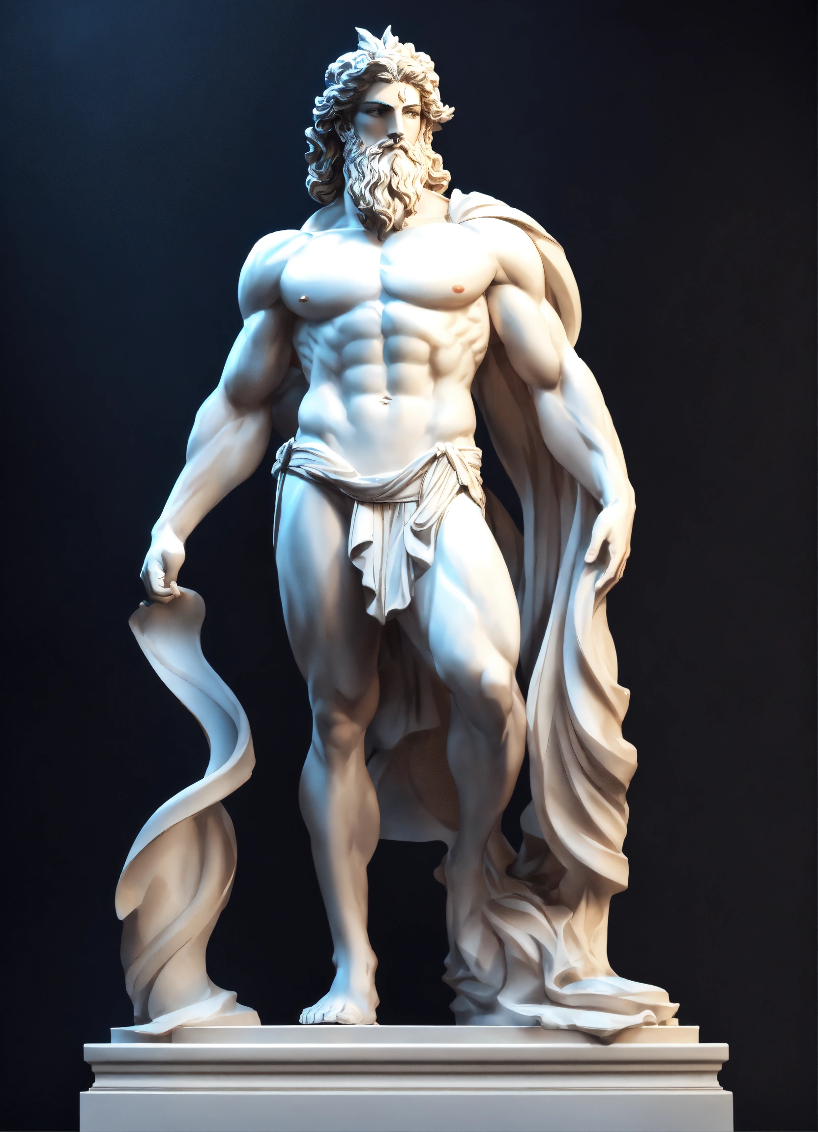 A statue from a muscular greek god statue with a wavey middel parting hair with white color on his body with a black backround standing on a podest animeted style 8k