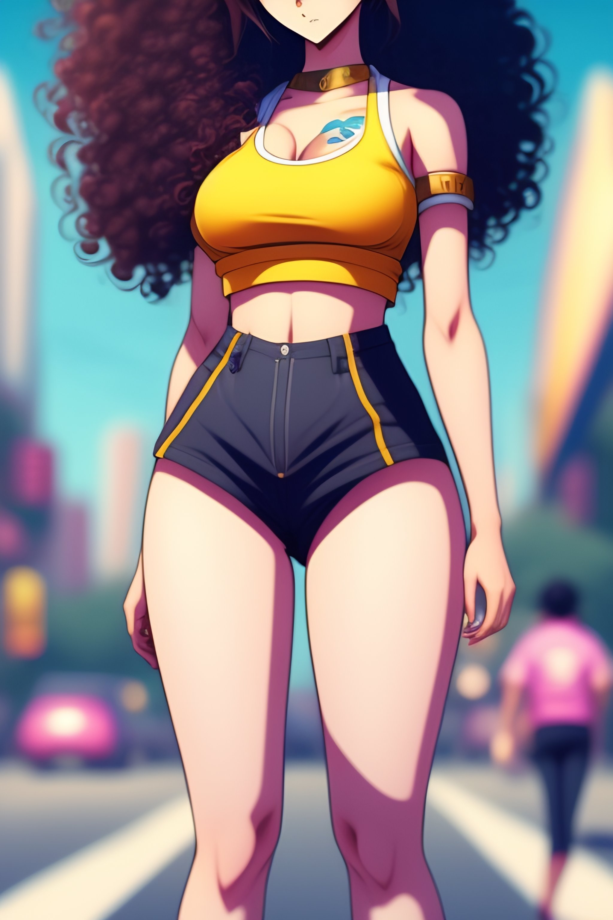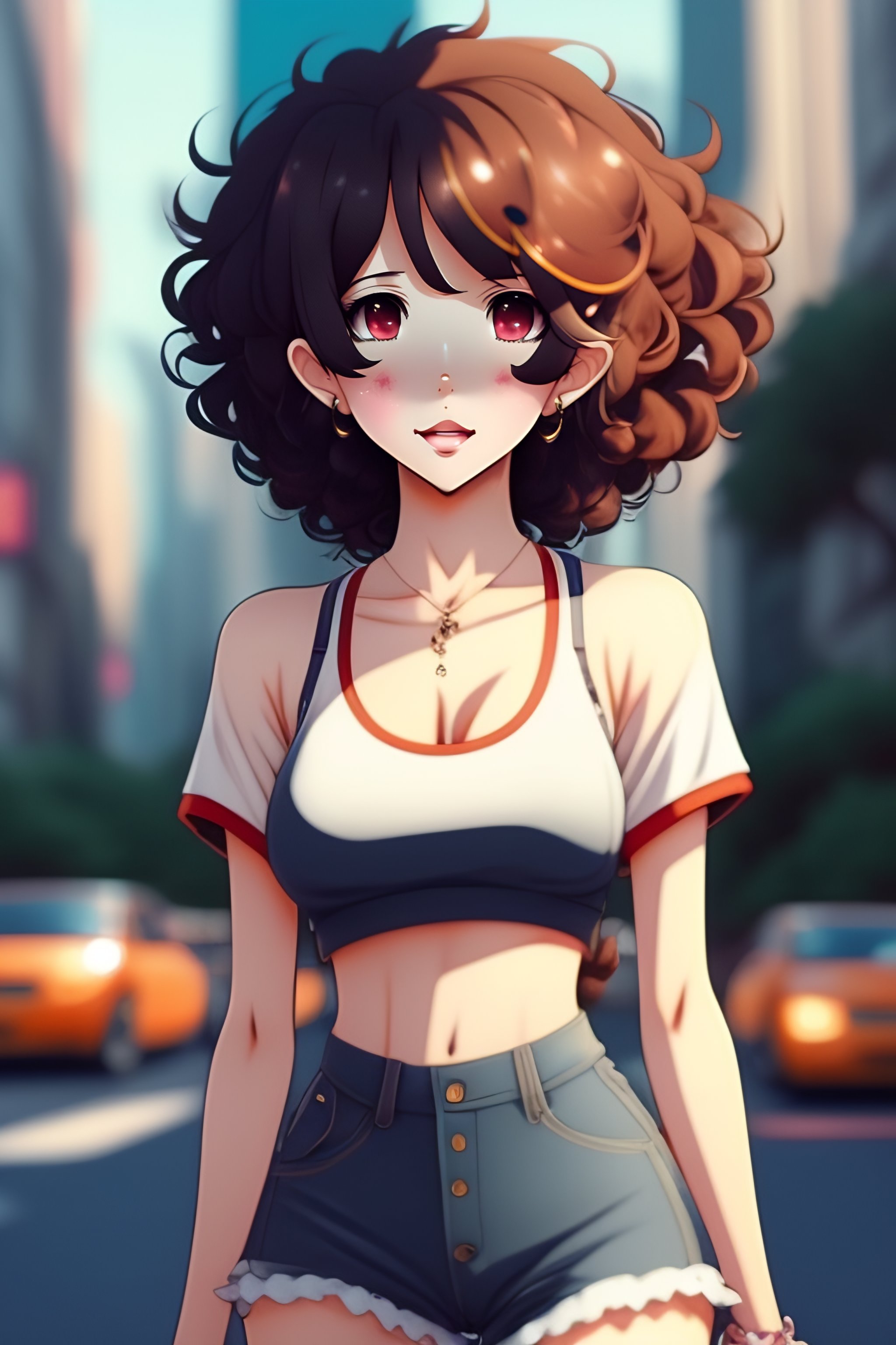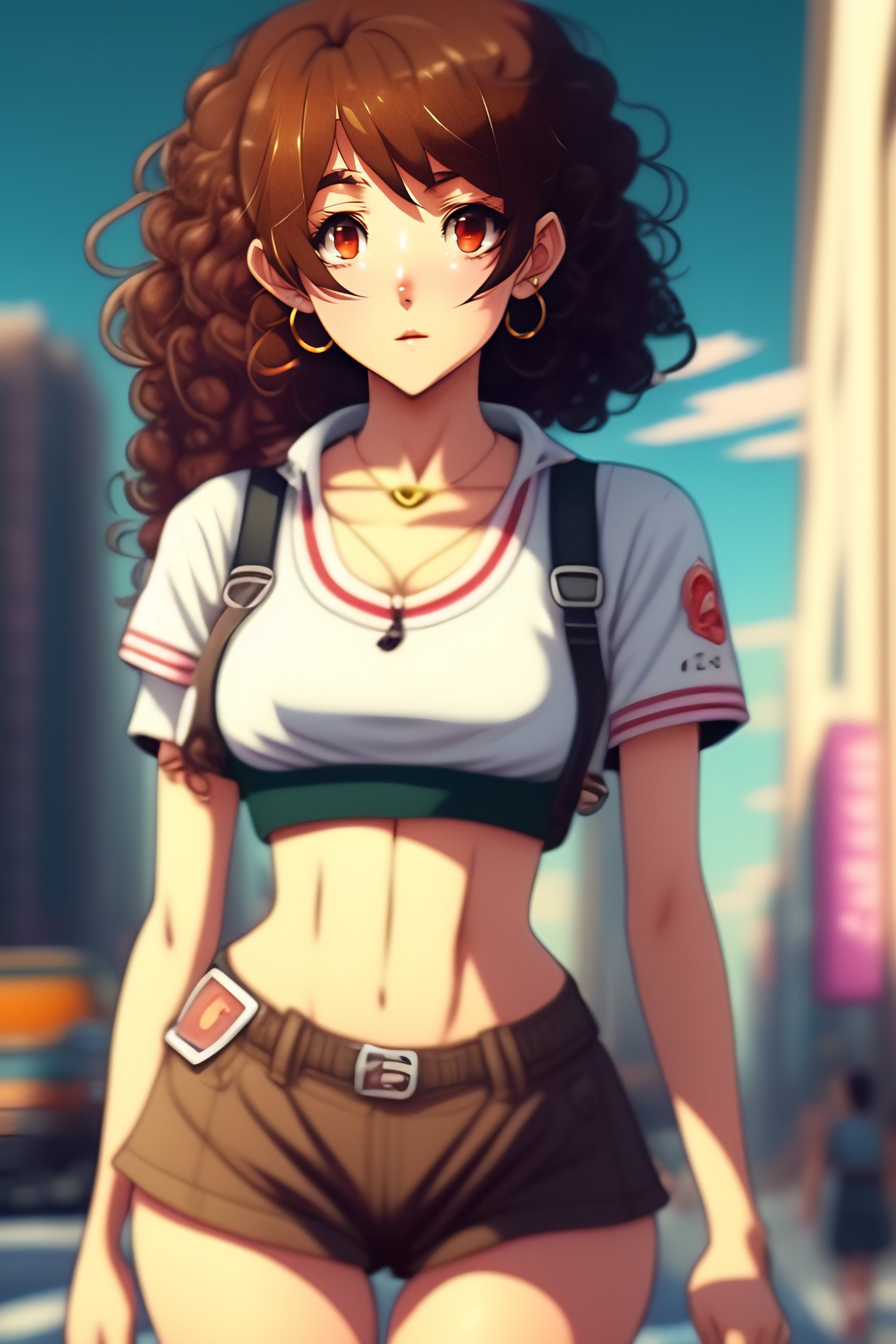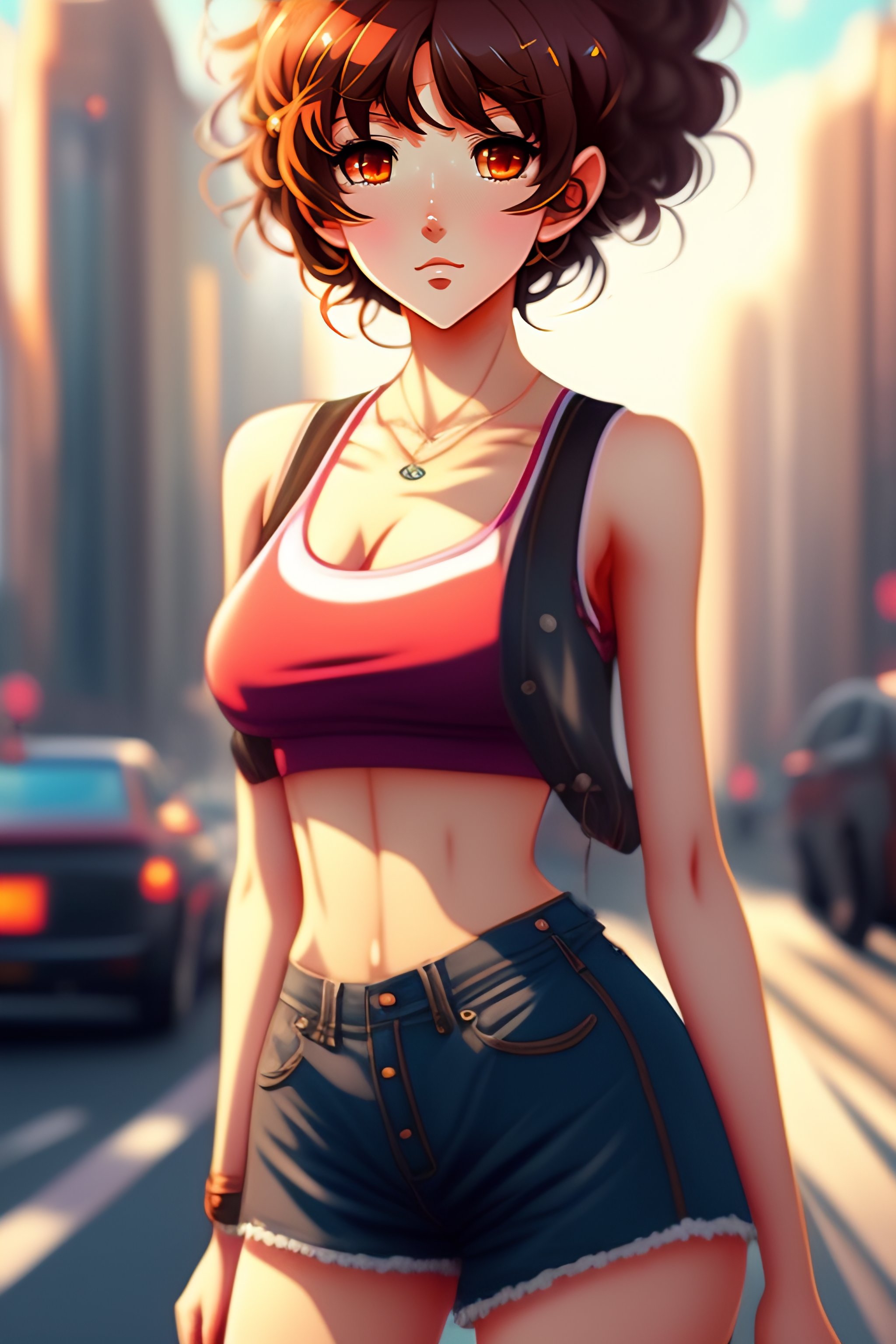 Anime style, cute girl, 19 years old, medium curly brown hair, skinny, flat belly visible, slim waist, thick, medium bust, crop top, short shorts, on streets in big city