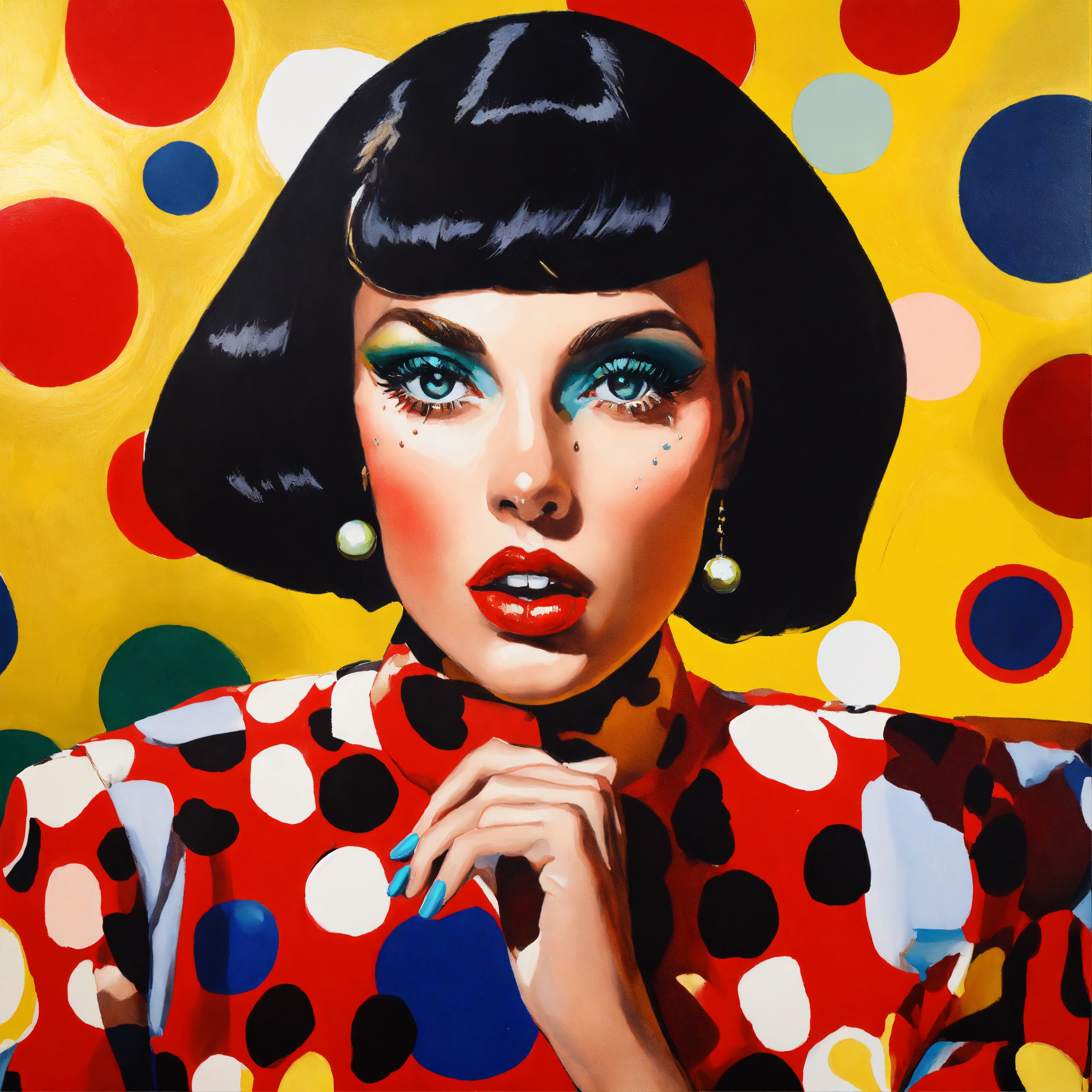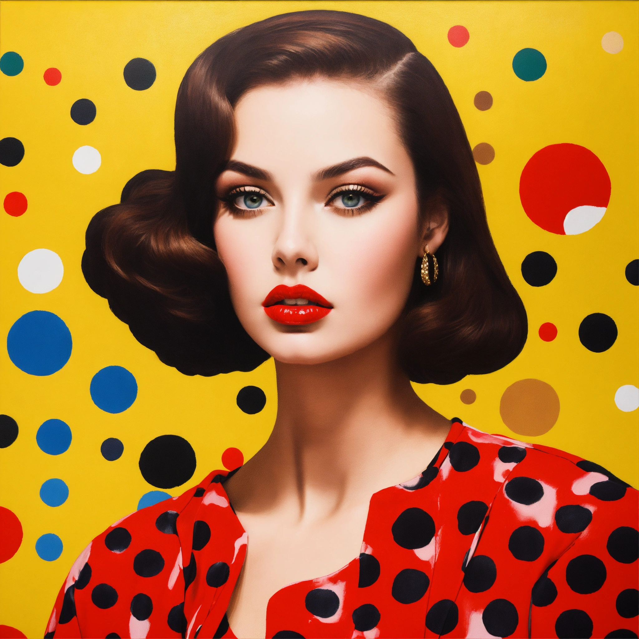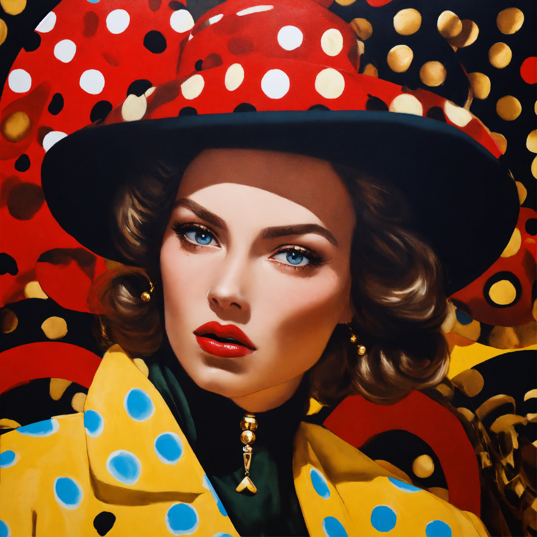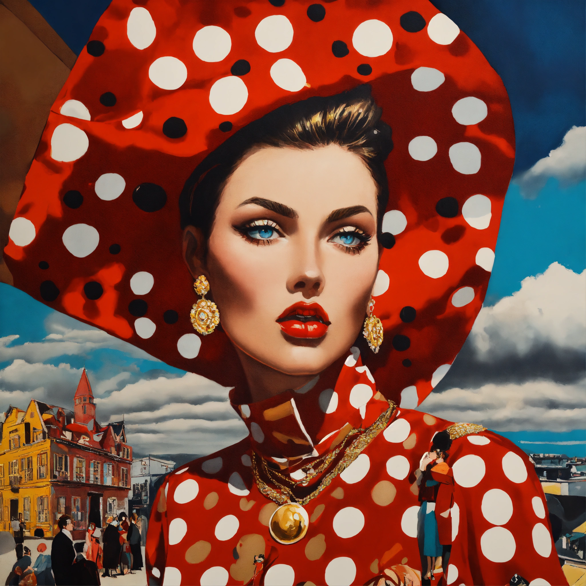 Close up of a female fashion designer in william klein coloured oil painting, woman eating dark chocolate, with women's eyes looking straight at you complex background, perspective, wide angle. very surreal. pop art style loads of colour and dada surrealism. more bizarre and perfect painting. bizarre shaped clouds of polka dot golden and cardinal red skys.loads of polkadot red gold and black every were.
