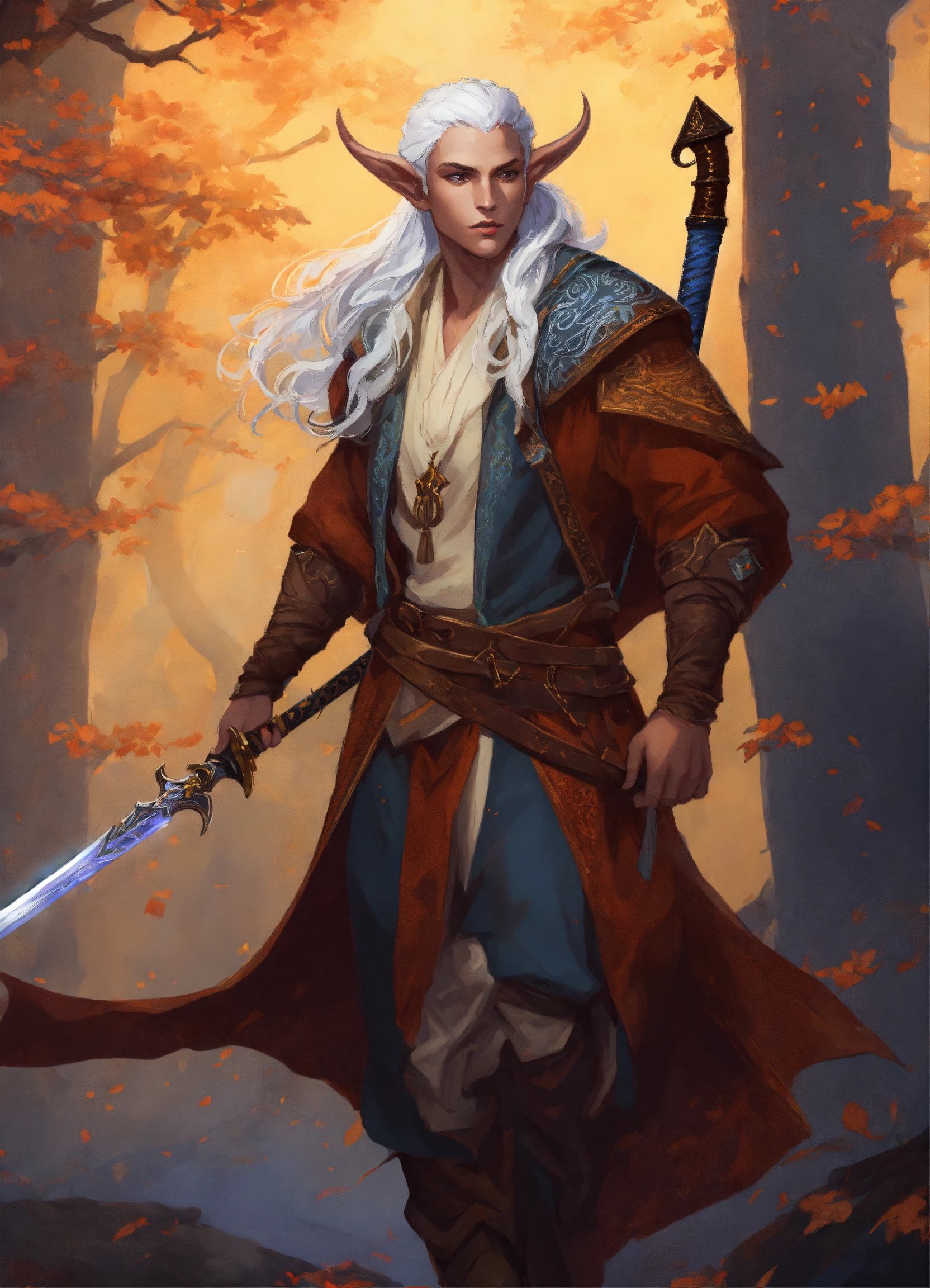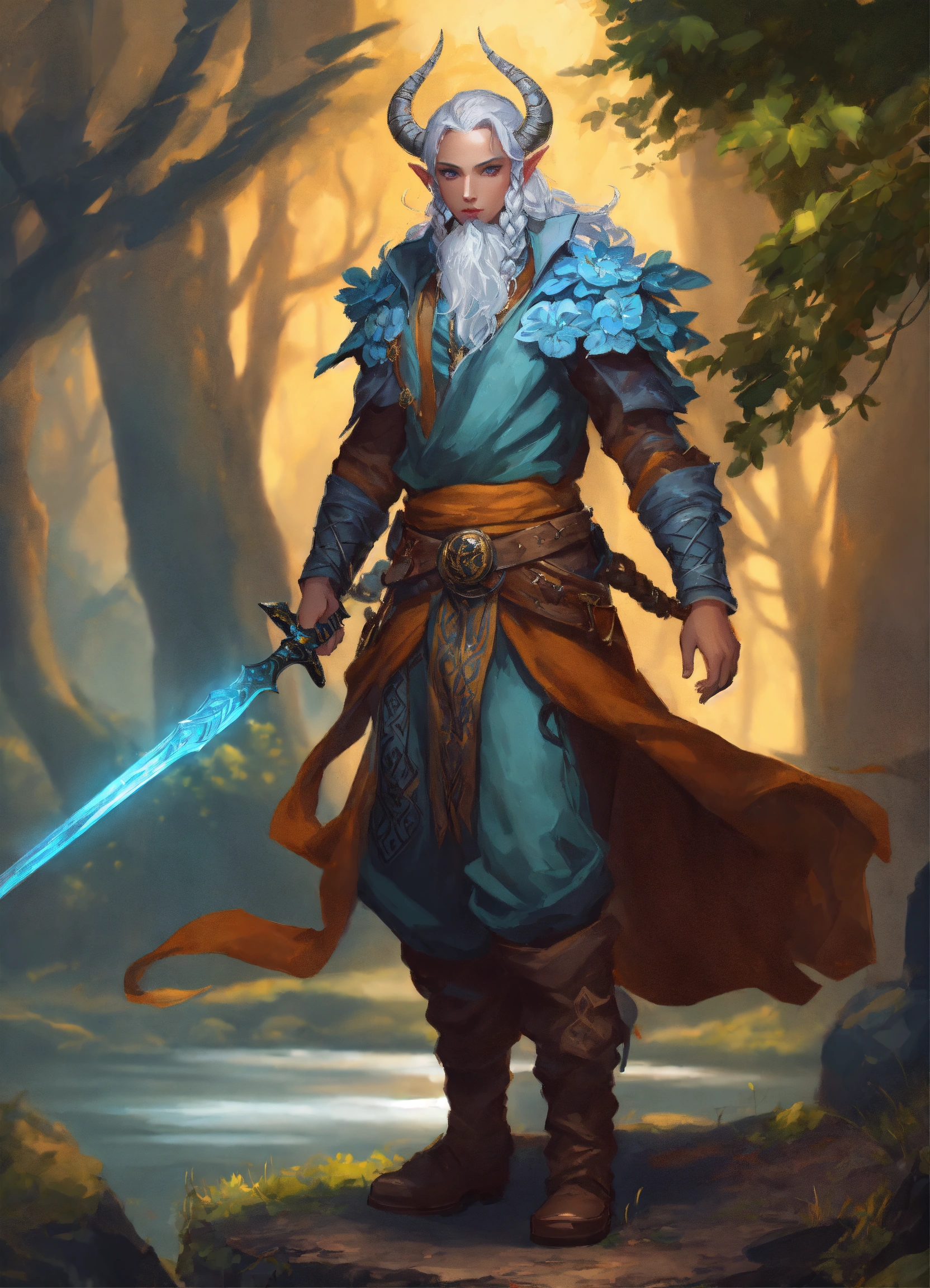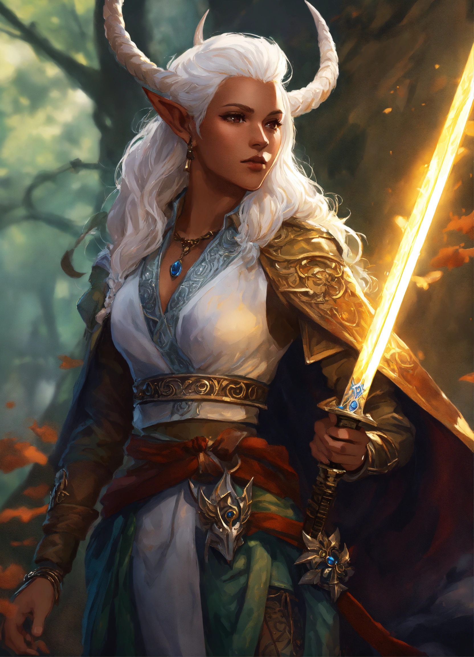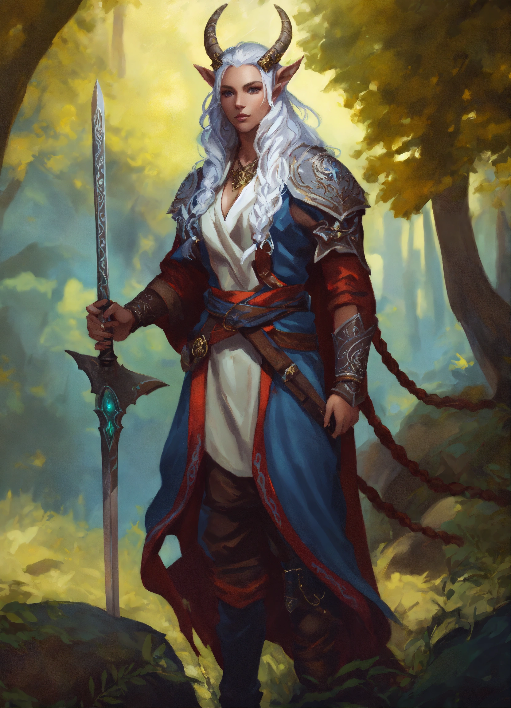 Mysterious tiefling druid in center, dnd, fantasy, braided white hair, holding sword, day, intricate, elegant, sharp focus, illustration, highly detailed, full body, digital painting