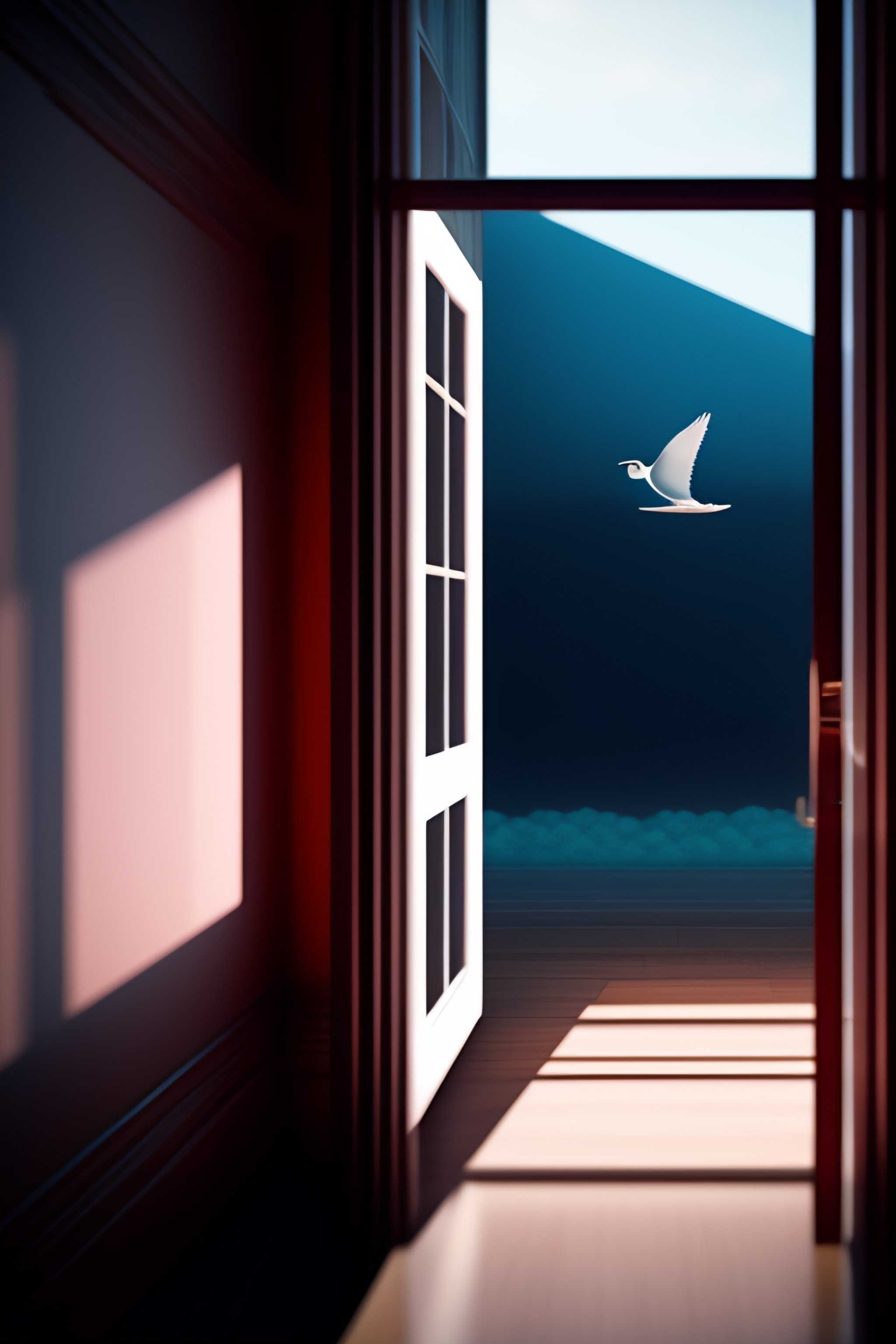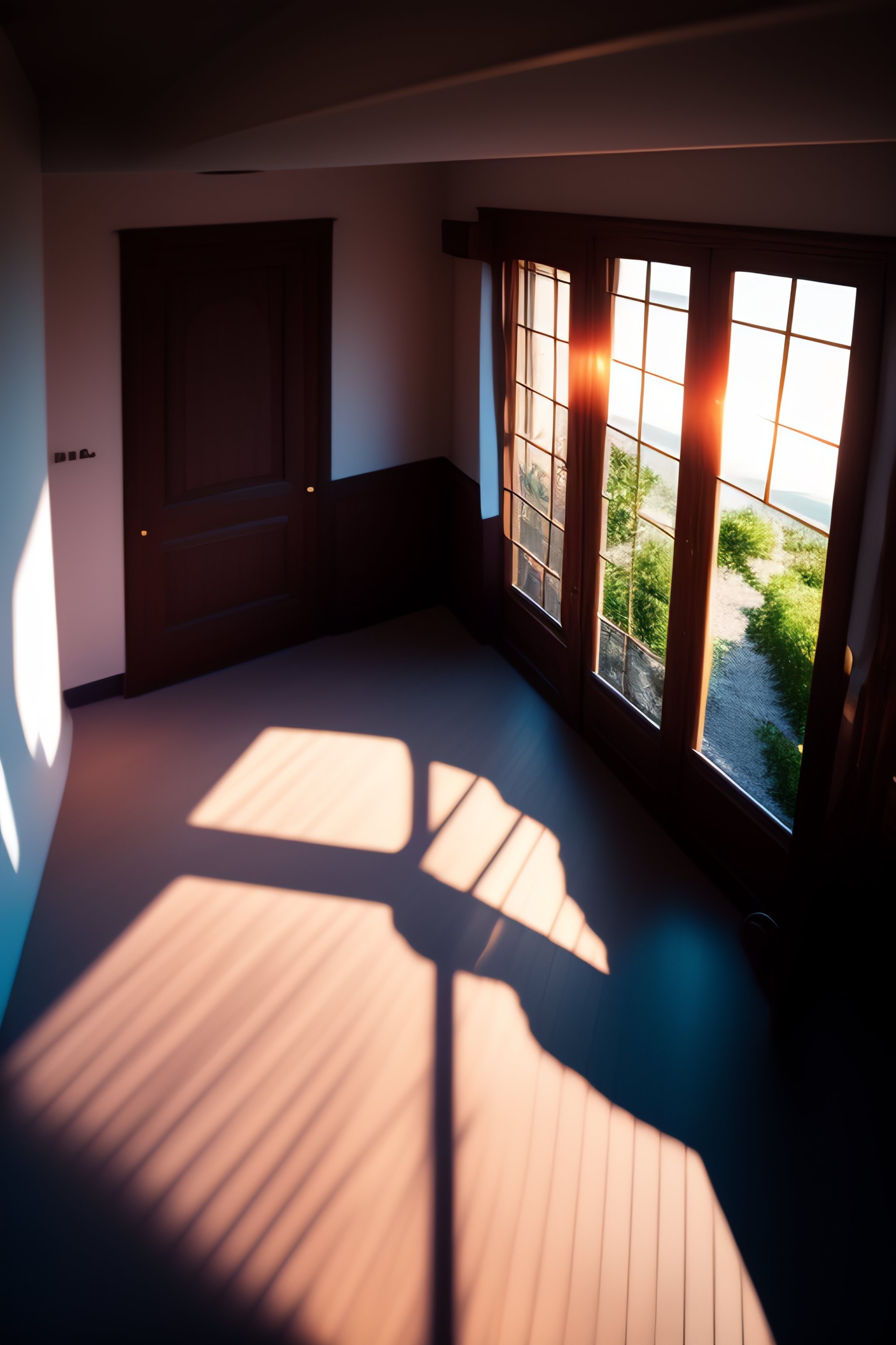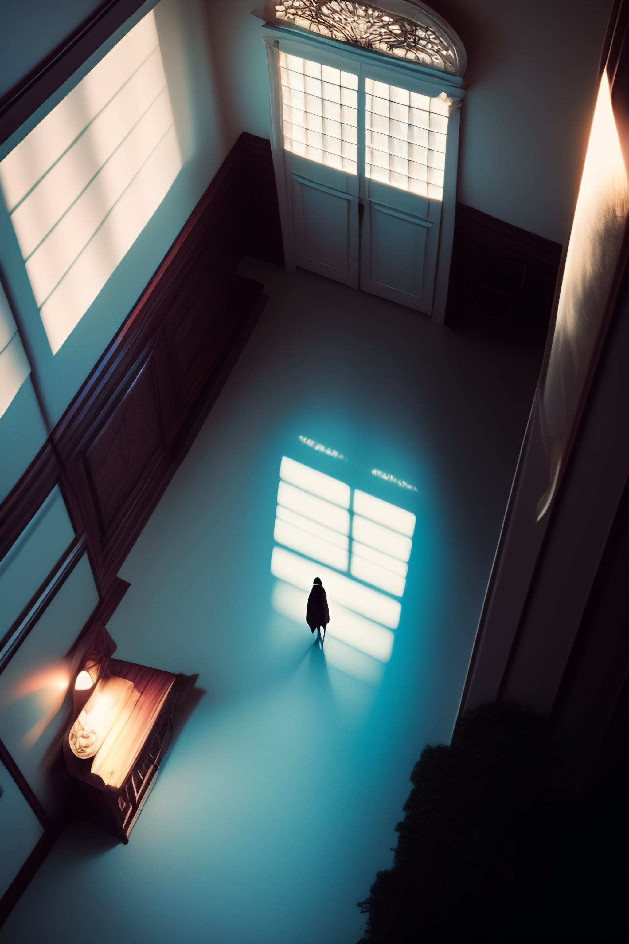 In the style of an anime sinestrea's shadow stretches out across the empty room, their figure captured in mid-stride as they pace back and forth. the small door stands in the background, its size only emphasized by sinestrea's tall stature. the gold powder glows softly in the dim light, its texture shimmering in the shadows. the angle of the photo is taken from above, giving the viewer a bird's eye view of the scene. in the style of ai art
