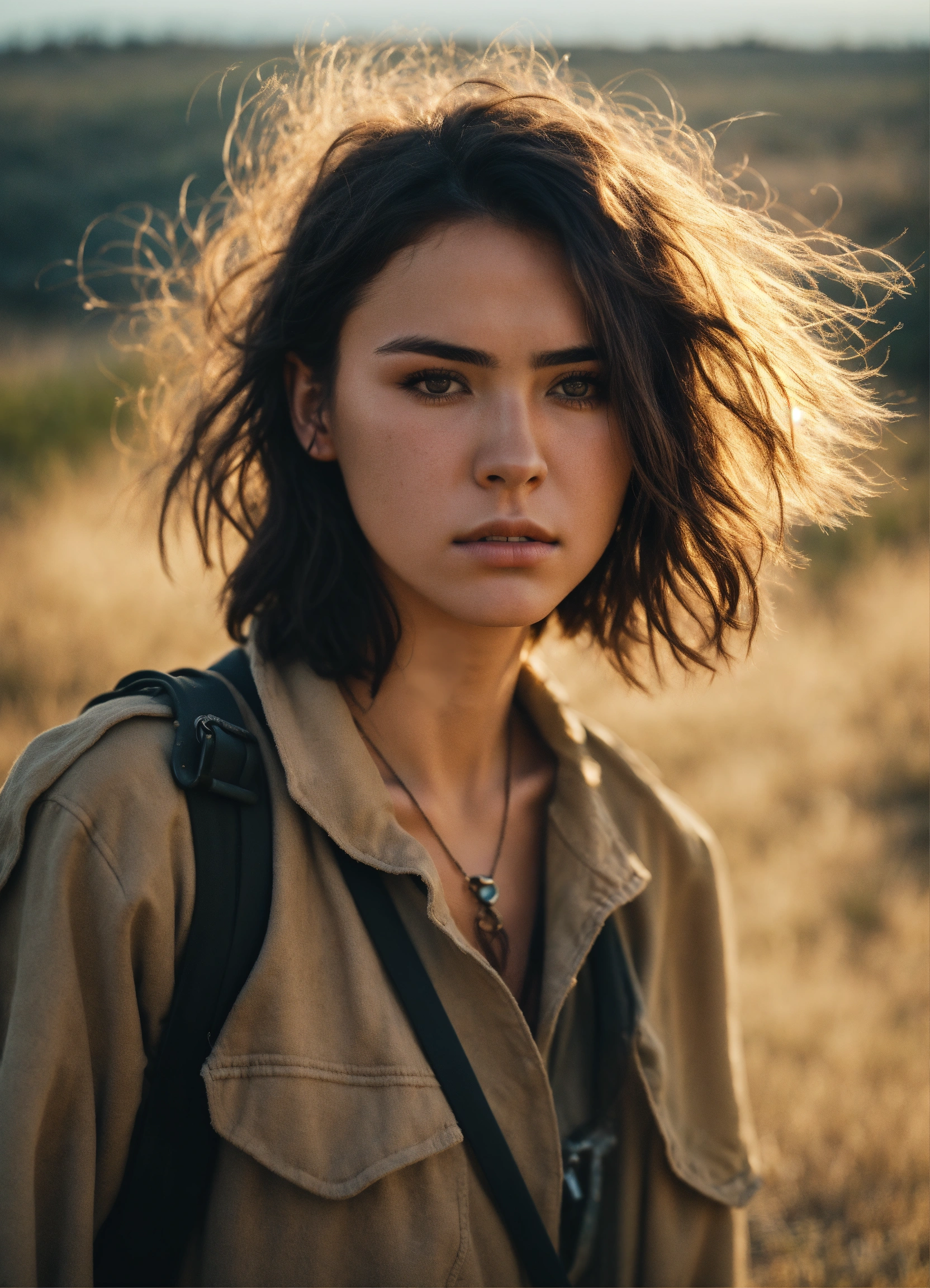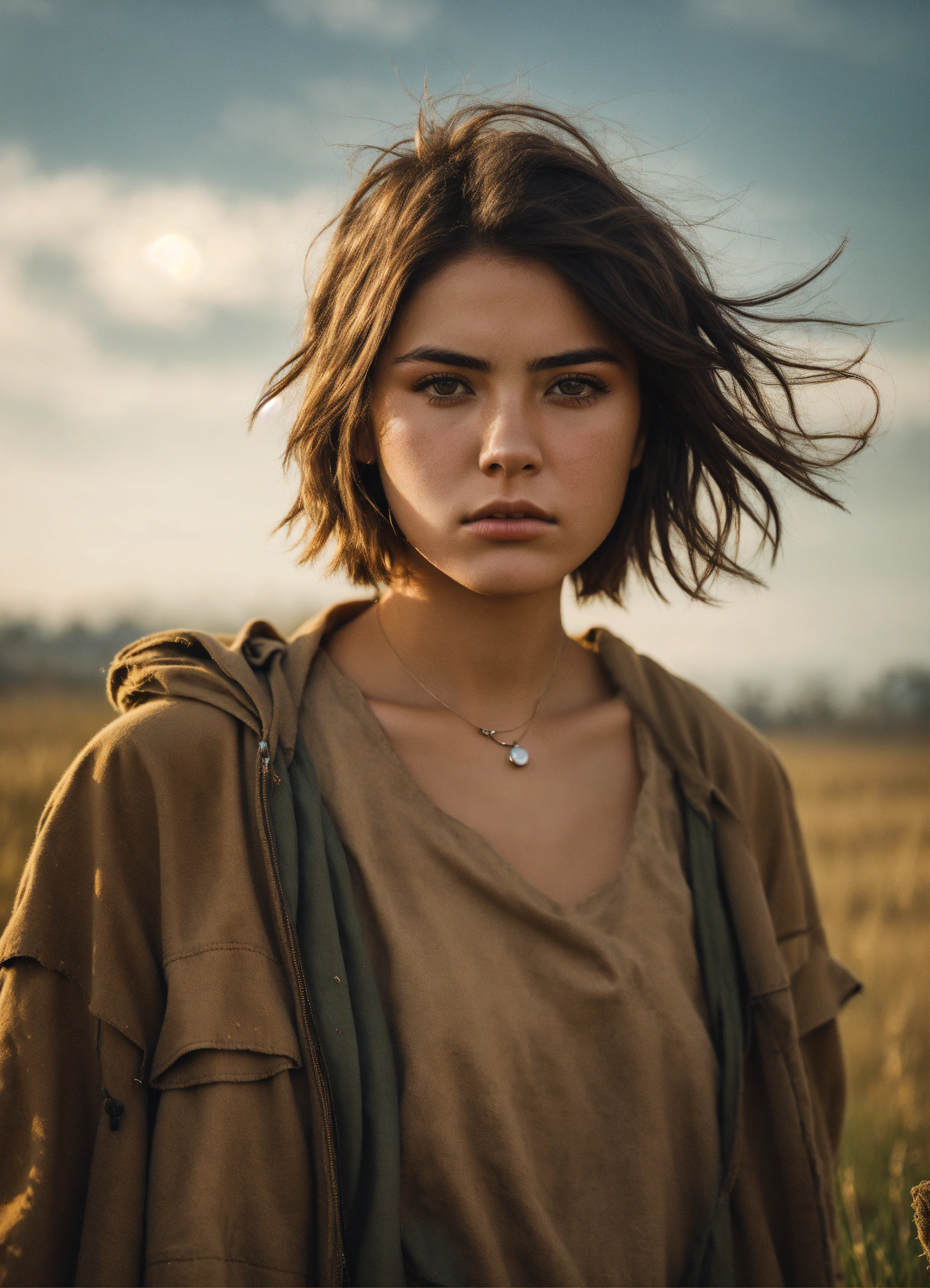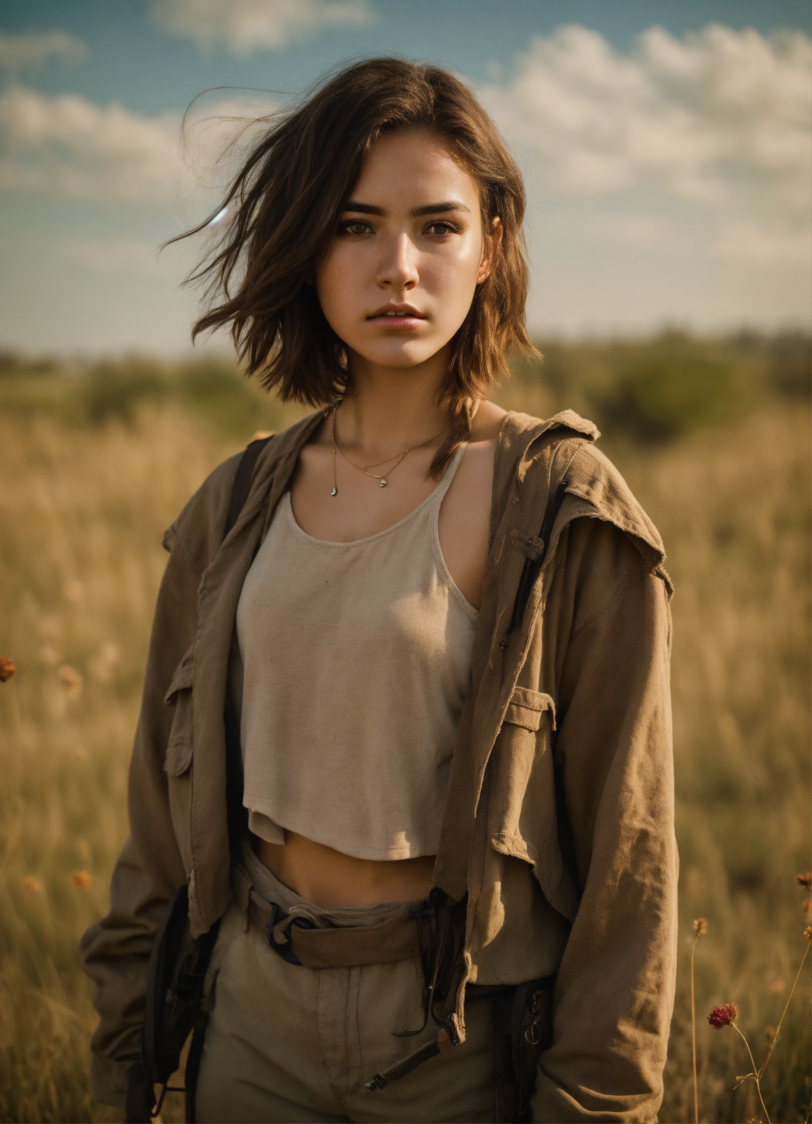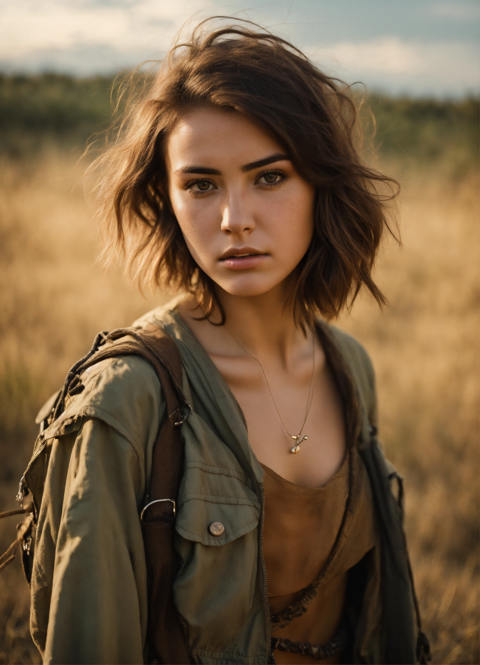 An ultra detailed photo of a 22 years old brunette girl, with mid-short loose hair, brown eyes, natural beauty, sad expression, warm skin tone, strong body, wearing post-apocalyptic desert clothes, in a sunny meadow, no jewelry, no makeup, dramatic illumination, 4k.