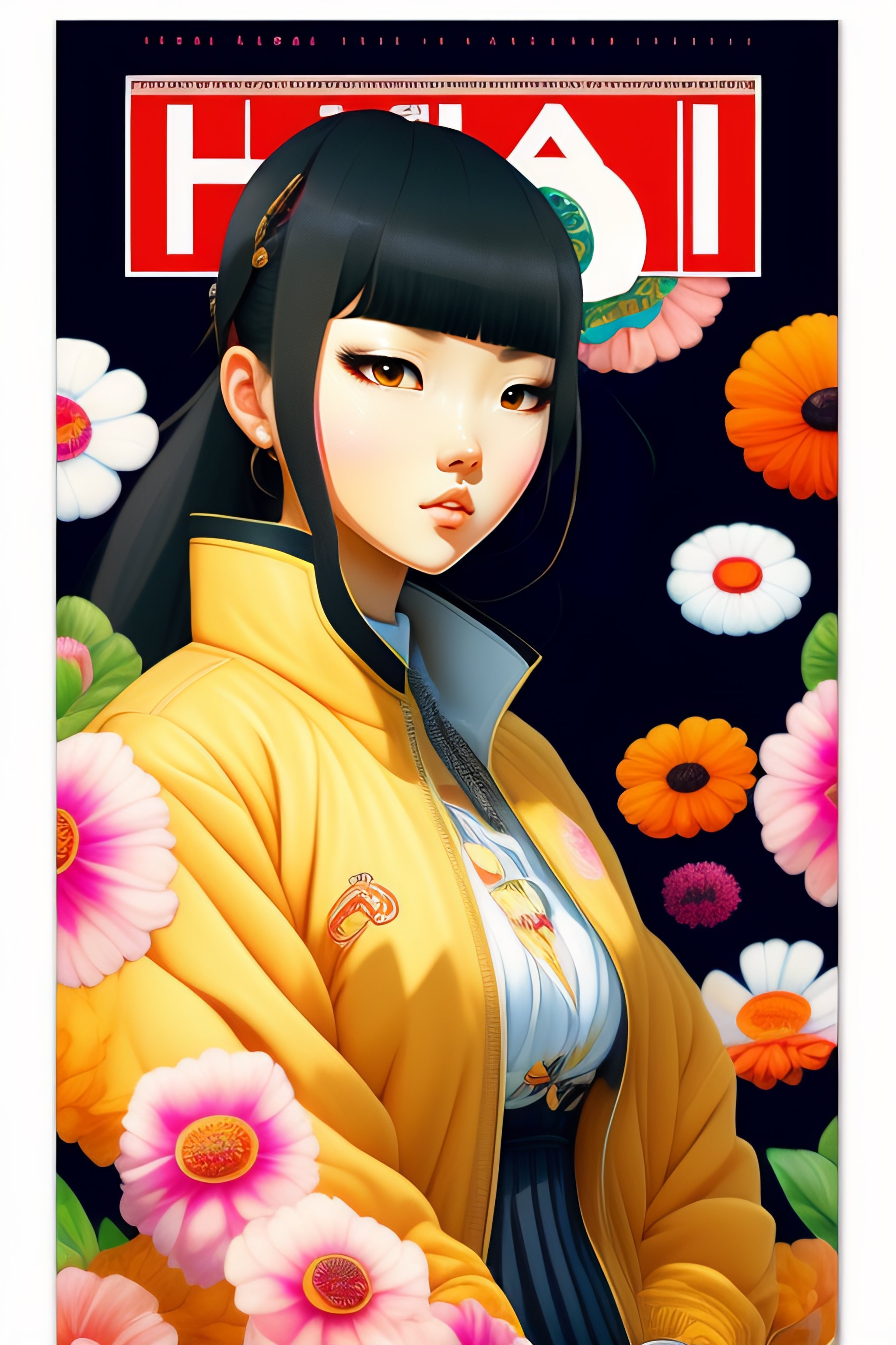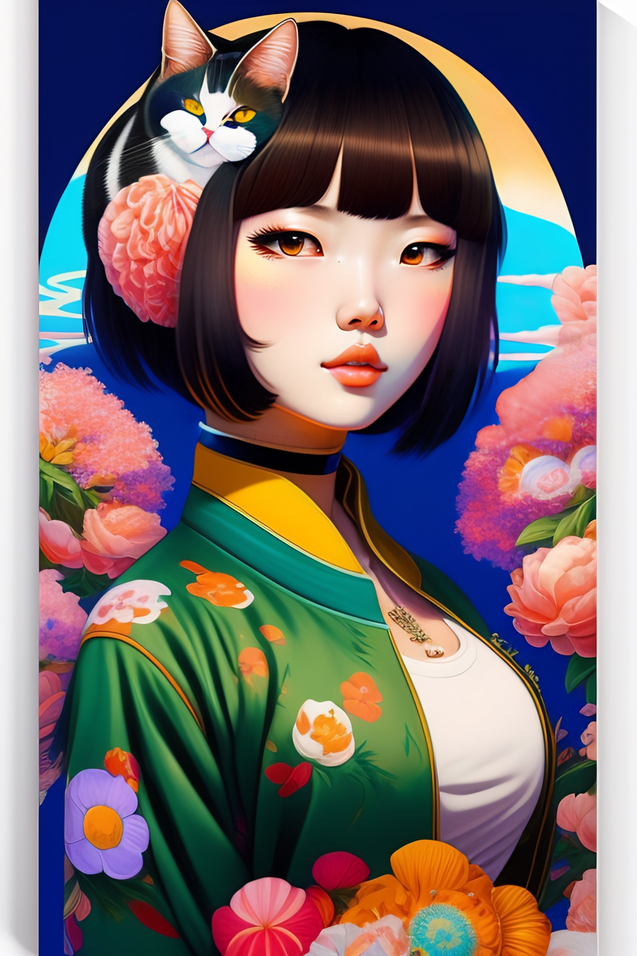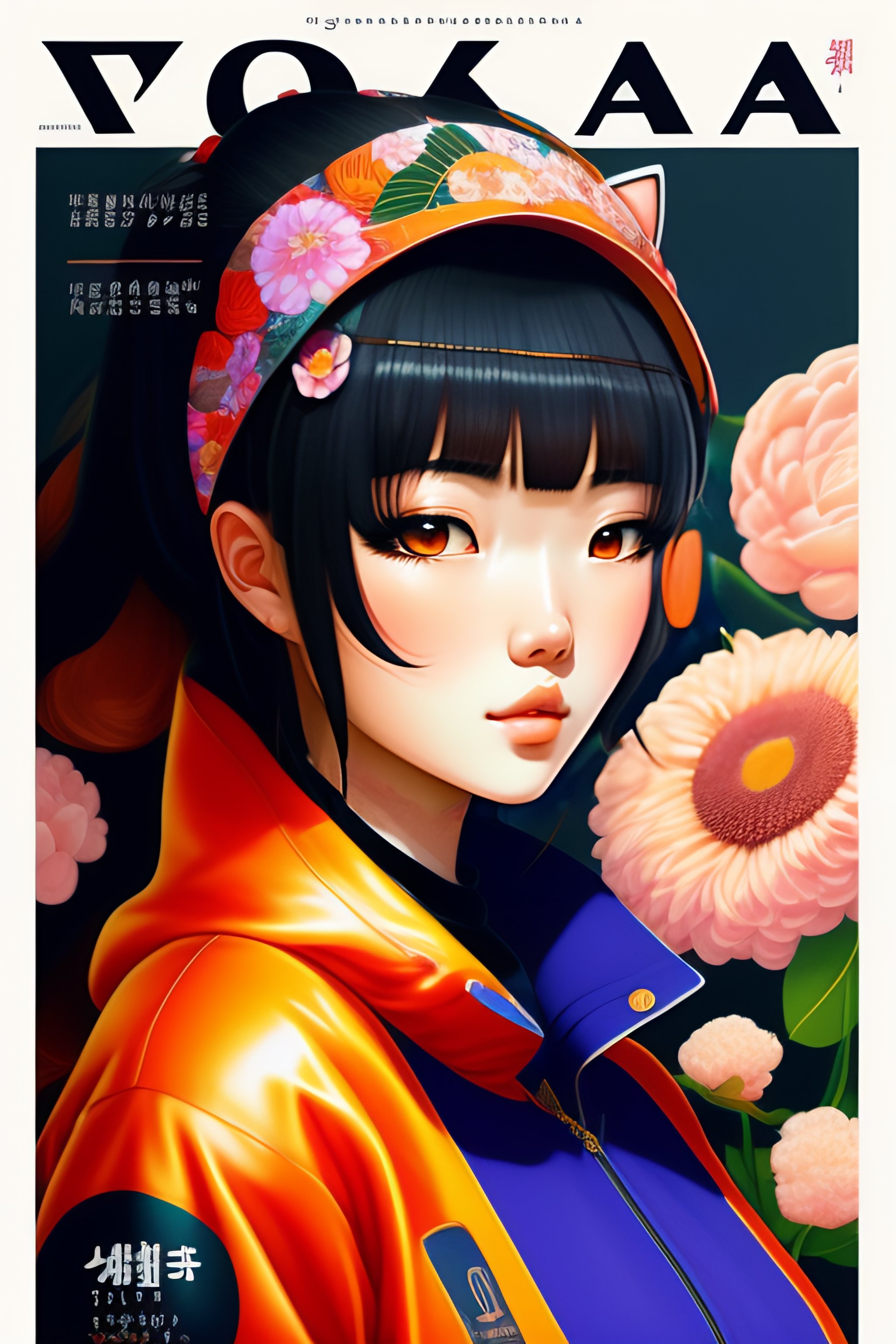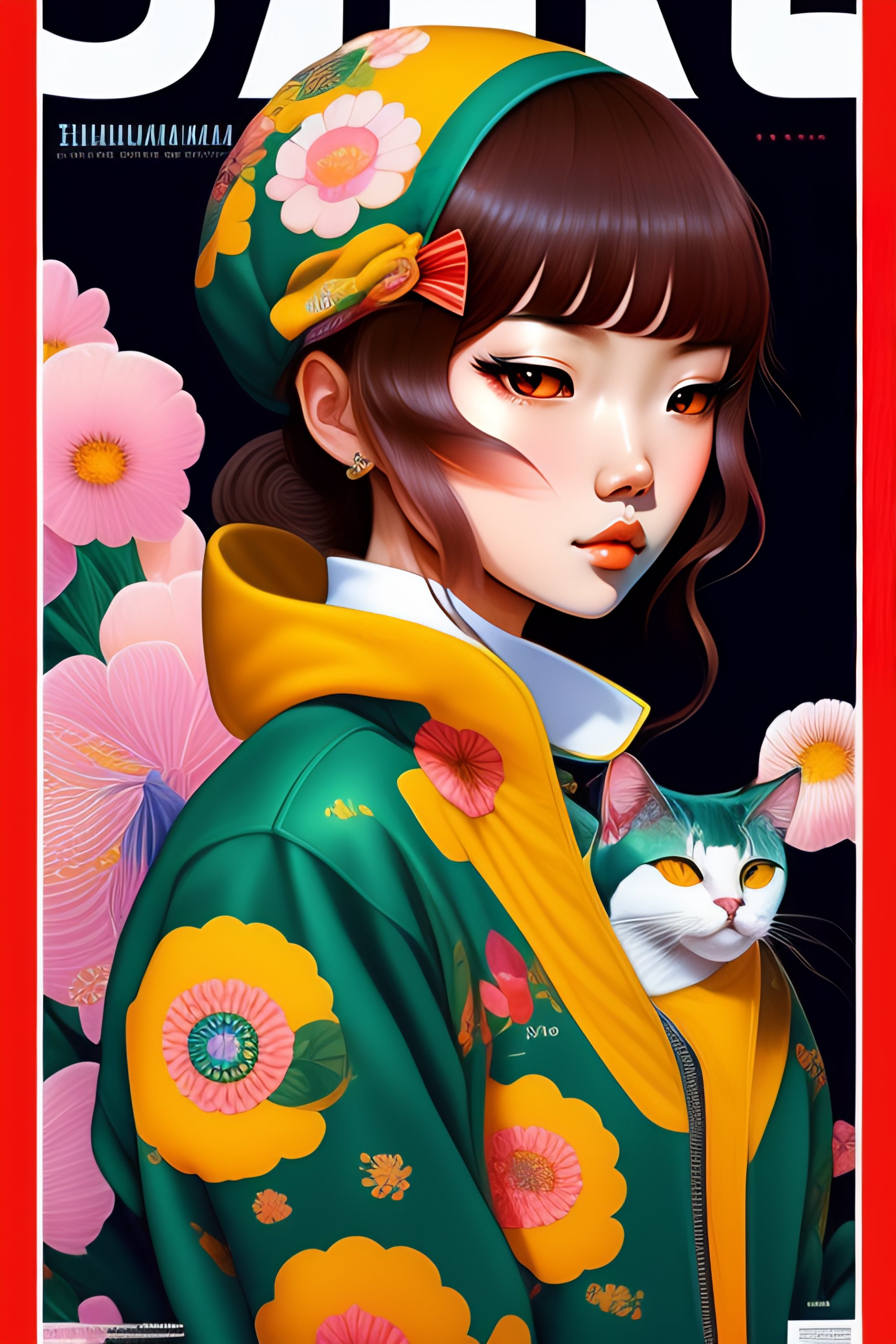 Magazine cover poster, upper portrait of anime girl with cat, ultra-detailed, cel shading, artistic, shibuya fashion, harajuku fashion, mucha, frida kahlo, vivid floral oversized sukajan bomber jacket, trends of pixiv, headline, logos labels, badges, graphic design, art by miyazaki hay takashi murakami oda eiichirō