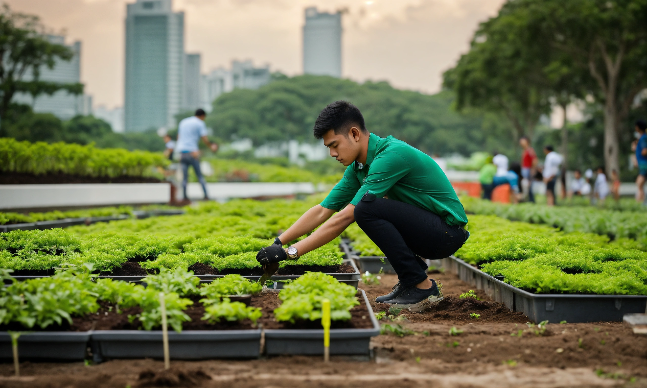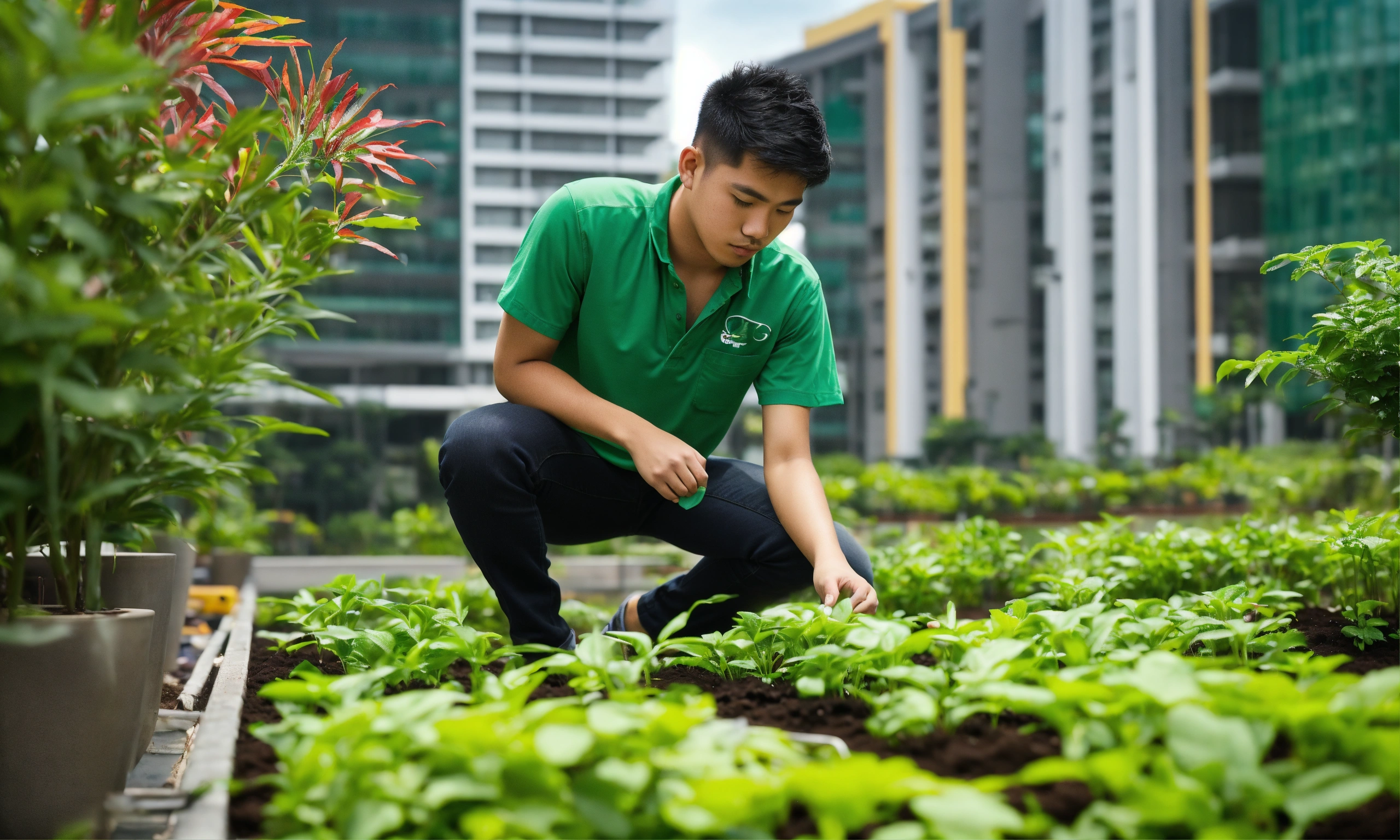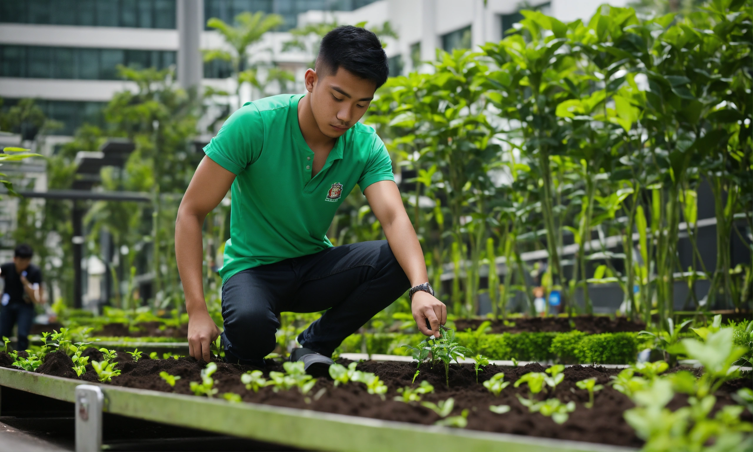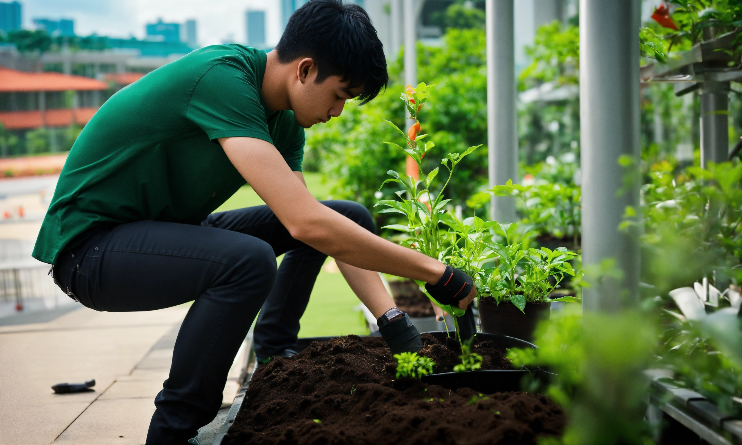 A 21 year old man, in a green shirt, black jeans. against the background ofsingapore management university as the background. he is leaning forward and planting plants.